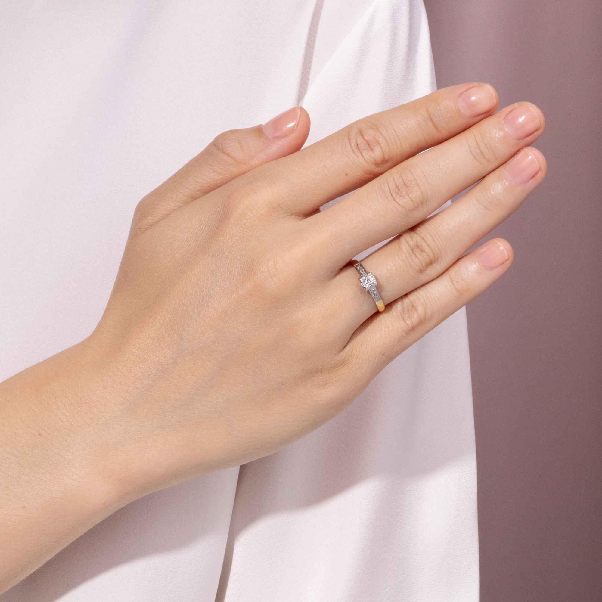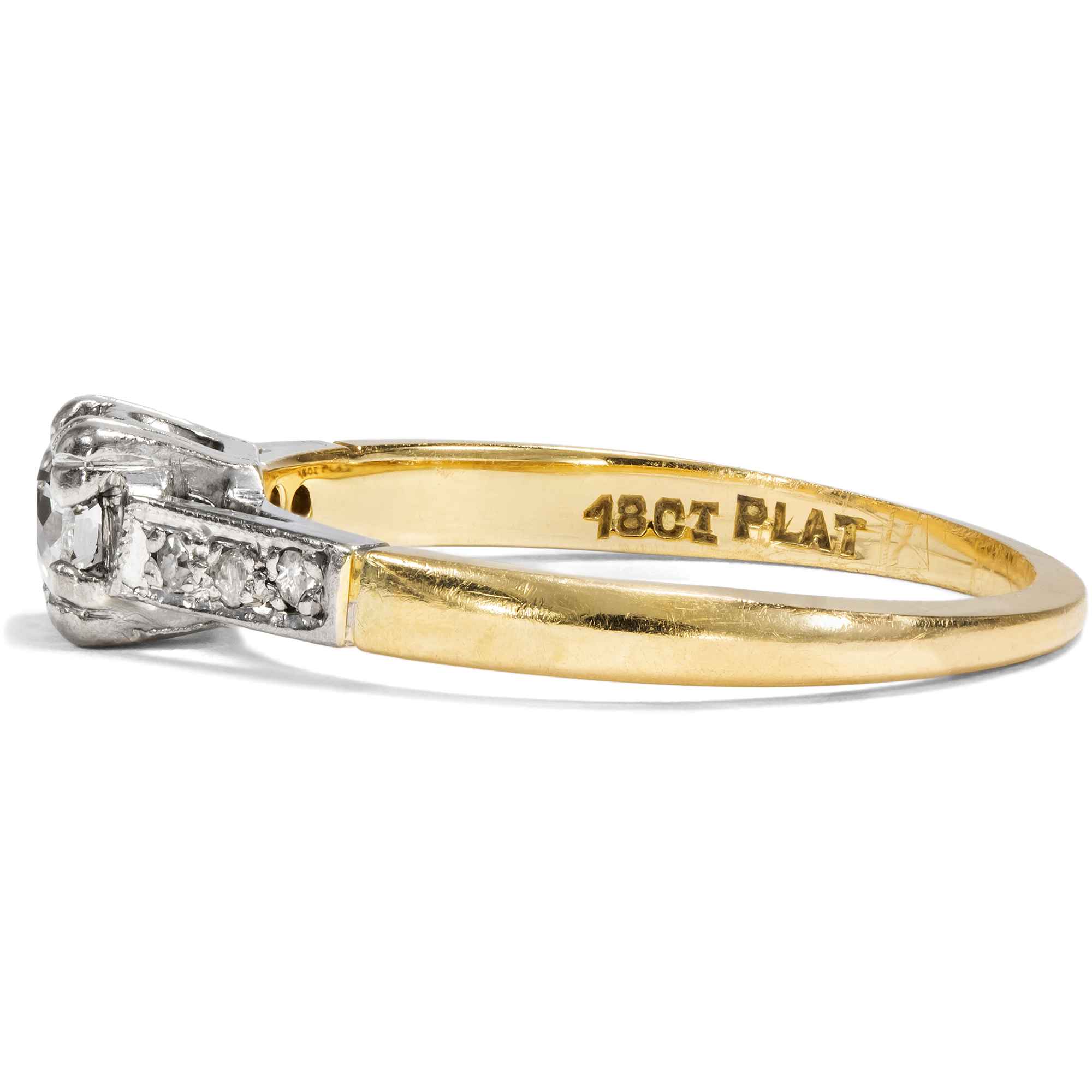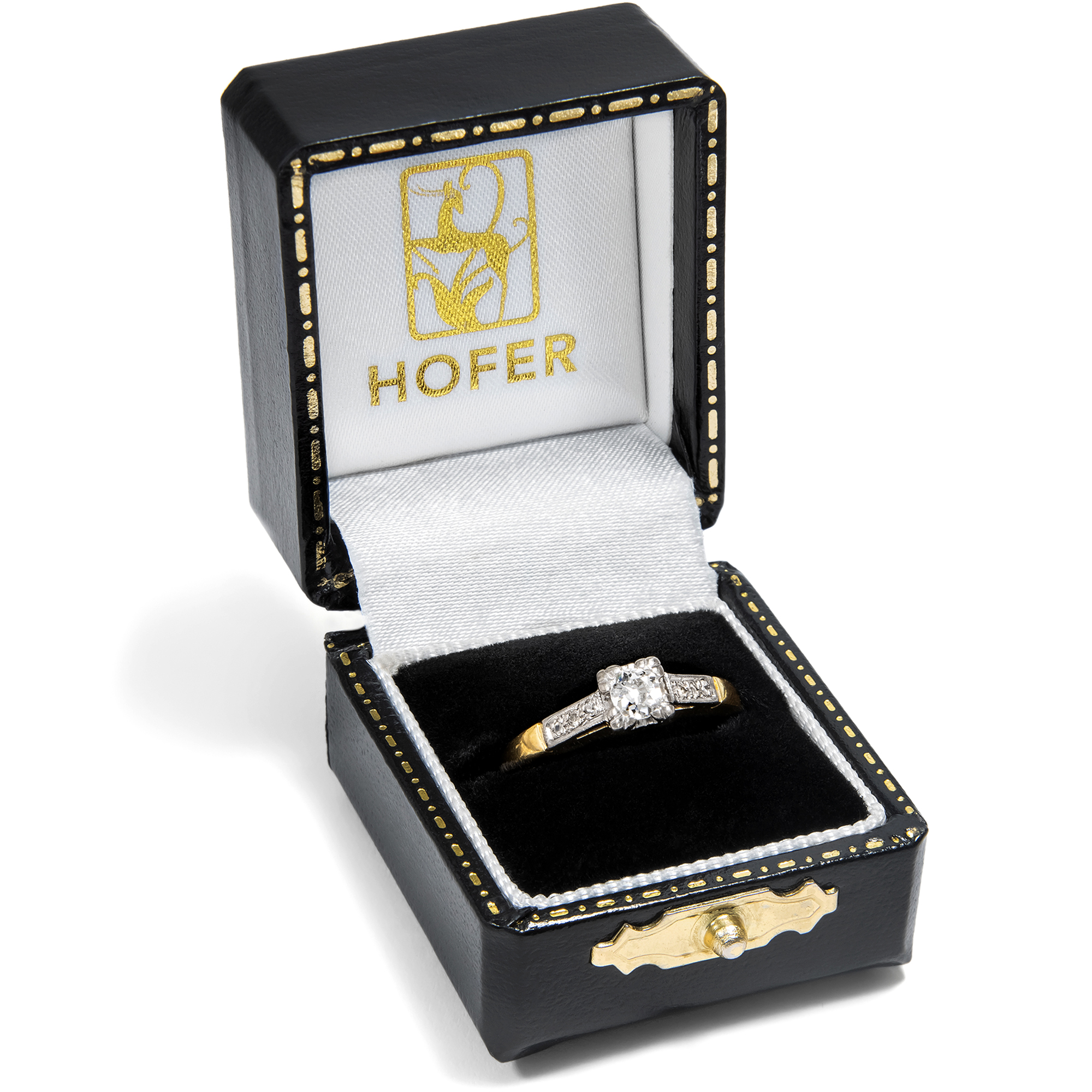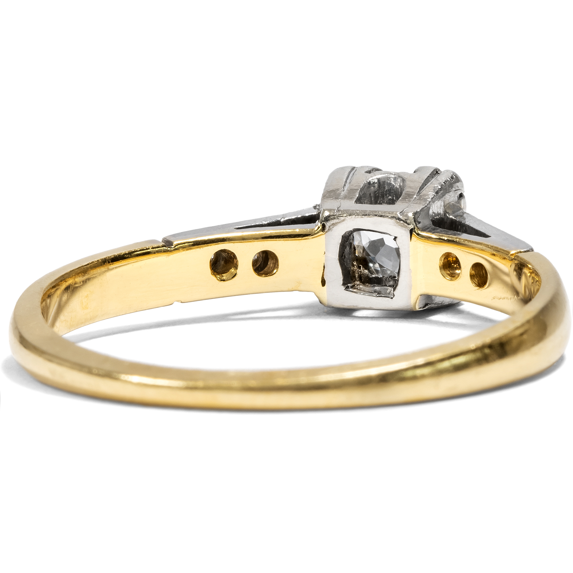 Kaum ein Schmuckstück hat eine so besondere Bedeutung wie ein Ring mit einem Diamanten. Als Zeichen immerwährender Liebe und Verbundenheit wird das härteste Mineral der Erde schon seit Jahrhunderten getragen. Sein weißes, strahlendes Funkeln ist zeitlos – und wird vermutlich auch in Zukunft nicht aus der Mode kommen. Hier nun liegt ein klassisch entworfener Solitärring vor. Der zentral eingelassene Diamant hat ein Gewicht von etwa 0,17 ct. Er ist im sog. „Old Mine Cut“ geschliffen, einer alten Form des Brillantschliffes, wie sie im frühen 19. Jahrhundert üblich war. Der Stein ist leicht kissenförmig, leuchtet weiß und zeigt nur sehr kleine Einschlüsse (H, vsi). Ein kräftiger Chaton hält den Diamanten an vier Eckpunkten. Sechs kleine Diamanten begleiten den Stein auf den sanft ansteigenden Ringschultern. Der Ring selbst ist aus Gelbgold gefertigt, während Schultern und Steinfassung aus Platin gearbeitet sind. Das Schmuckstück ist gut erhalten. Wir haben es in London entdeckt, und die englische Stempelfolge im Inneren der Ringschiene verrät, dass es auch in Großbritannien gefertigt wurde. Ein authentisches Schmuckstück aus der Zwischenkriegszeit in klassisch-eleganter Zurückhaltung.