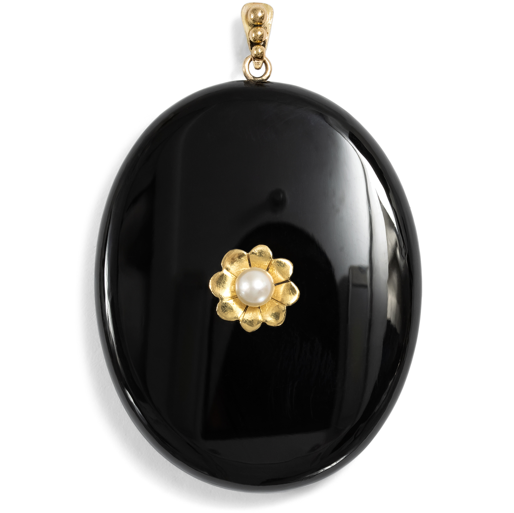 Die Trauerrituale des 19. Jahrhunderts unterlagen in Europa einer strengen Etikette. Ein wesentlicher Bestandteil war die Trauerkleidung, deren Tragen sich oft über viele Monate, nicht selten über ein ganzes Jahr erstreckte. In dieser Zeit blieb es insbesondere Damen gehobener Gesellschaftsschichten verwehrt, auf repräsentativen Schmuck zu verzichten. So entstand eine eigene Form des Schmucks, der sich den Anforderungen der Trauer unterordnete und zugleich dem Bedürfnis nach Zierde gerecht wurde. Materialien von zurückhaltender Farbigkeit wie Jet und Onyx gewannen dabei besondere Bedeutung. Der hier vorliegende Anhänger ist ein schönes Beispiel dieser Entwicklung. Ein tiefschwarzer Onyx wurde zu einem ovalen Schild geschliffen, dessen ruhige Fläche von einem bewusst gesetzten Akzent belebt wird. In der Mitte sitzt eine Perle, gefasst in einer blütenförmigen Goldmontierung. Auch die Rückseite zeigt eine sorgfältige Gestaltung. Ein Achat ist in den Onyx eingelassen, gehalten von einem dekorativen Element aus rötlichem Gold. Die schildartige Form und die Ausführung deuten auf eine Entstehung um 1870 hin. Das feine Schmuckstück kam aus Hamburg zu uns und bewahrt bis heute die stille Würde seiner ursprünglichen Bedeutung.