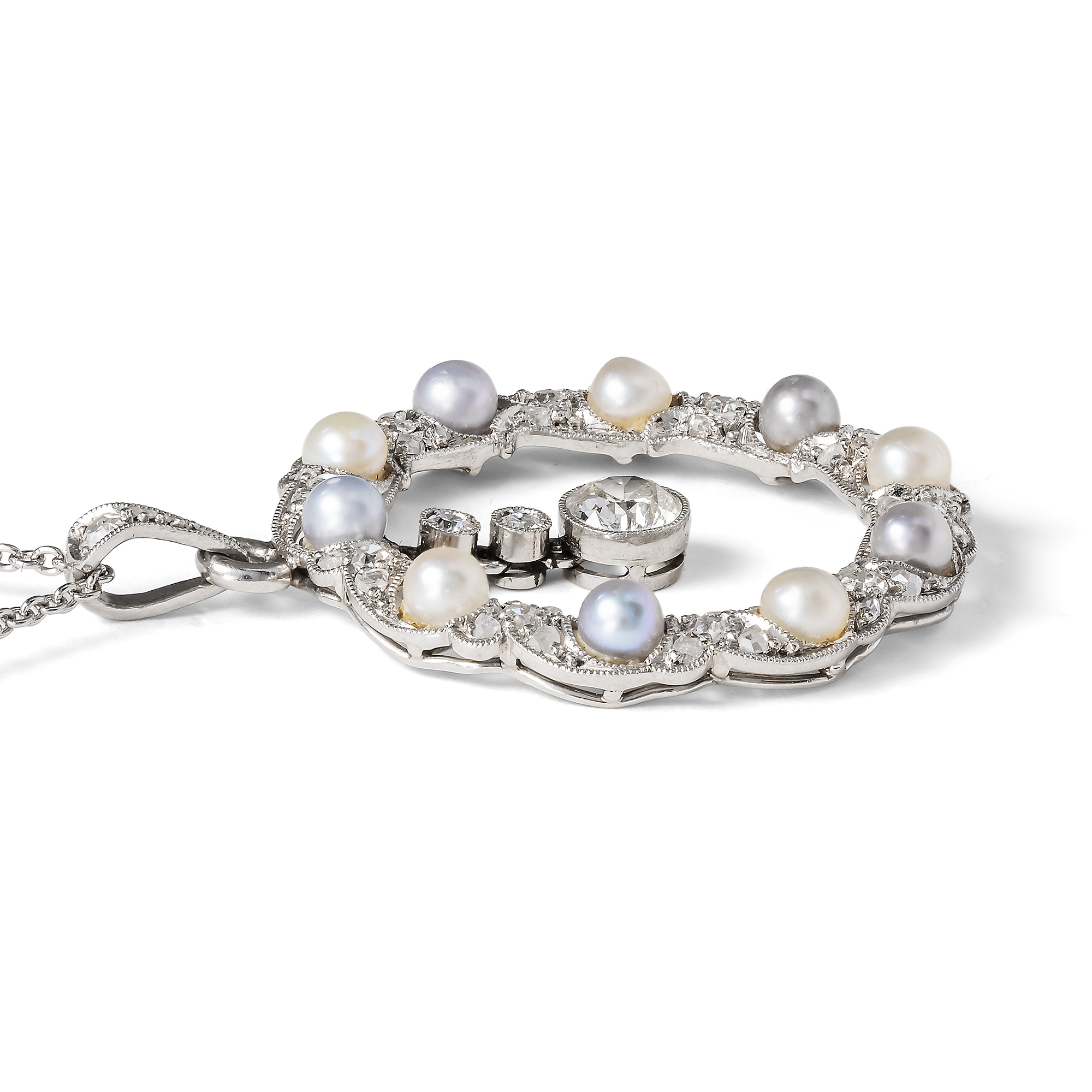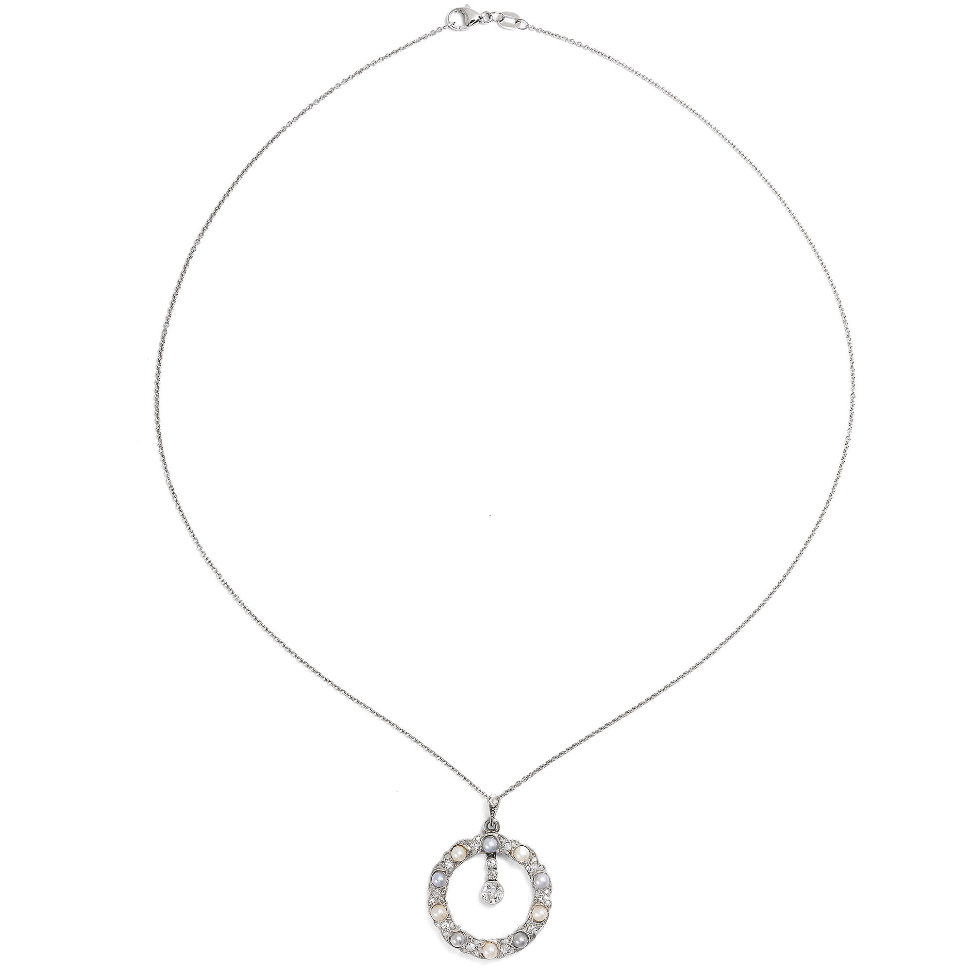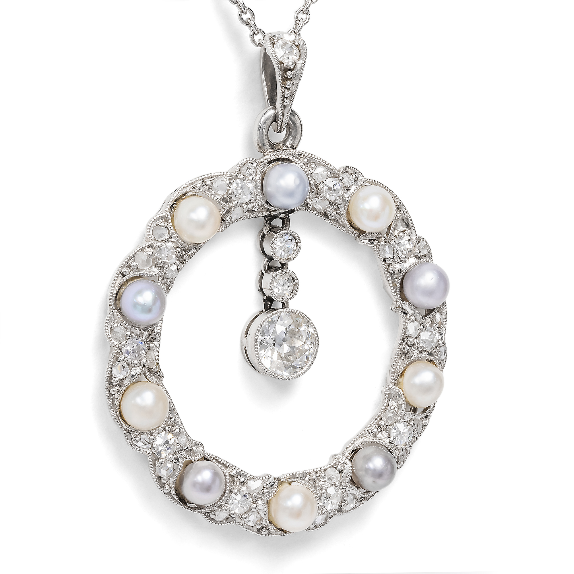 Die zarte Eleganz des „Garland Style“ ist bis heute der Inbegriff der Juwelenkunst der Belle Époque. Anlehnungen an Formen des Louis XVI belebten einen Neoklassizismus, der kleine, zarte Lorbeerranken ebenso schätzte wie minutiöse Festons und Verzierungen mit winzigen Millegriffes. Die Schmuckstücke in diesem Stil wurden von den Goldschmieden in Paris, London und Wien in kostbaren Materialen ausgeführt, reich besetzt mit Diamanten, gefasst in Silber oder Platin. Hierbei entstand ein kristalliner, kühler und darin ganz besonders eleganter Eindruck: Diese besonderen Juwelen strahlen meist ganz in weiß, überirdisch verführerisch, ein wenig weltentrückt und damit besonders luxuriös. Der hier vorliegende Anhänger zeigt sich als fein gewundener Kranz aus Platin, feinen Naturperlen sowie Diamanten im Altschliff und Rosenschliff. Dabei sind kleine, geschwungene Blattformen reich mit Diamanten ausgefasst und um insgesamt zehn kostbare Naturperlen gesetzt, die in einer herrlichen Farbpalette von cremigem Weiß bis zu fliederfarbenen Grautönen schimmern. In diese Komposition eingehängt sind drei einzeln gefasste Diamanten, die als funkelndes Pendel einen weiteren Blickpunkt bilden. Wir haben das Schmuckstück in der Eifel entdeckt und eine zarte Platinkette hinzugefügt.