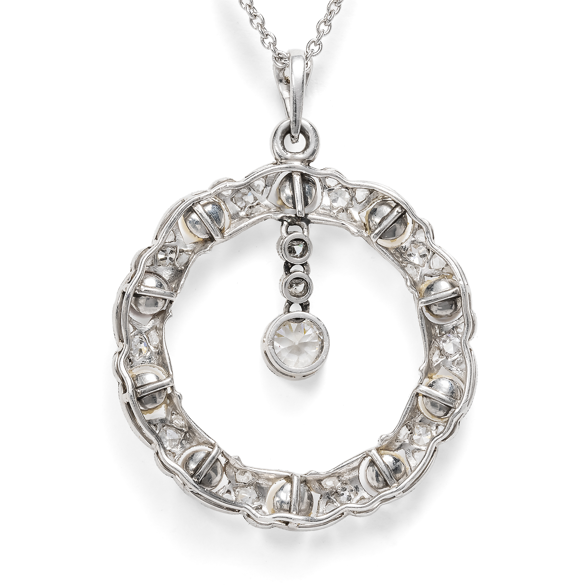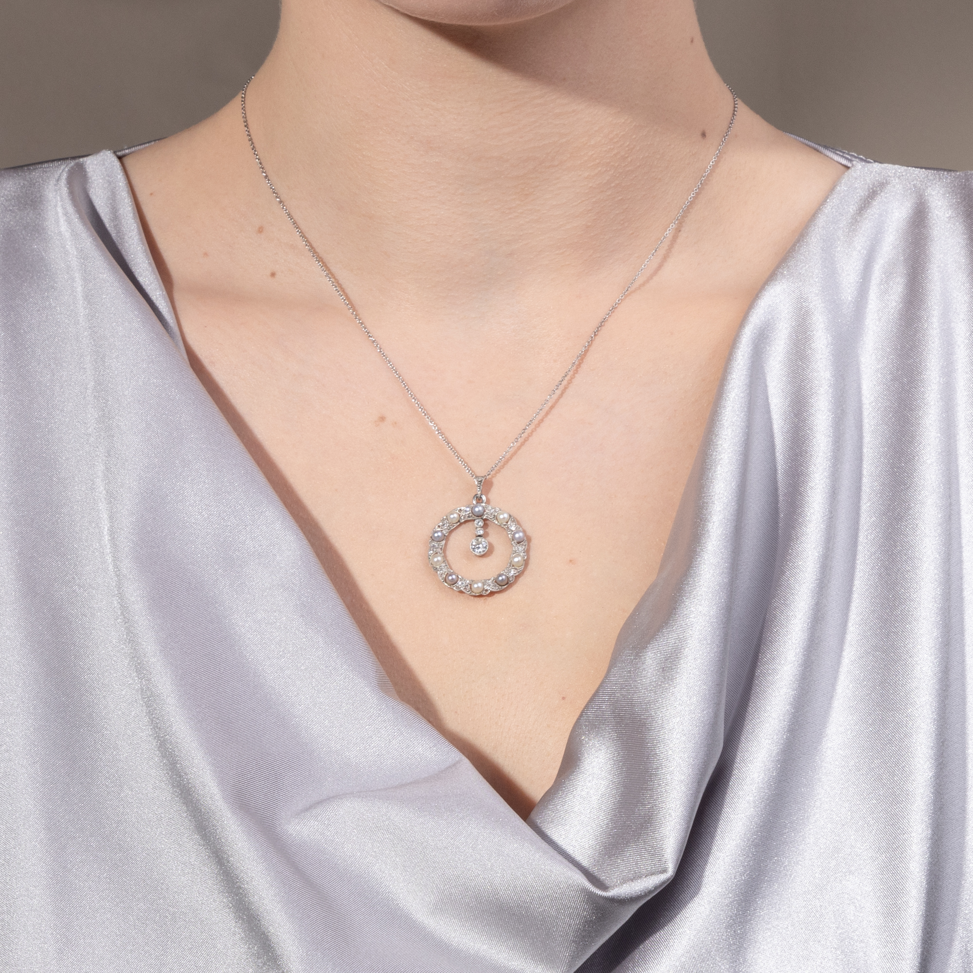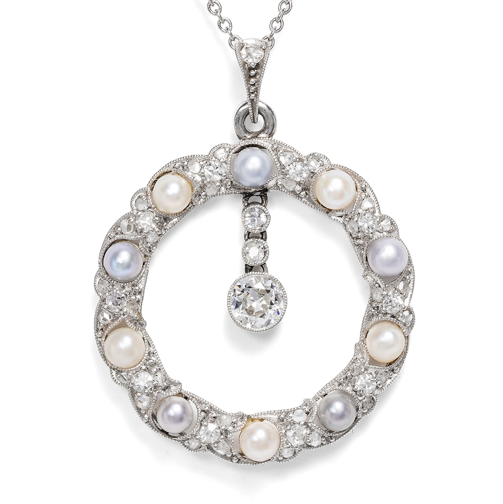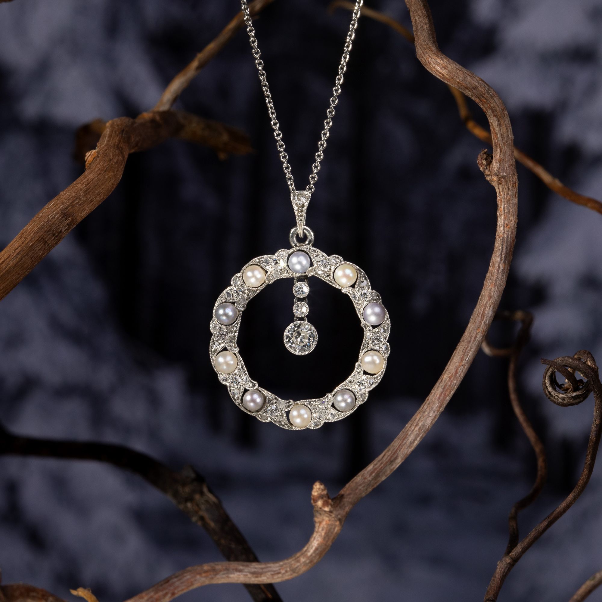 Die zarte Eleganz des „Garland Style“ ist bis heute der Inbegriff der Juwelenkunst der Belle Époque. Anlehnungen an Formen des Louis XVI belebten einen Neoklassizismus, der kleine, zarte Lorbeerranken ebenso schätzte wie minutiöse Festons und Verzierungen mit winzigen Millegriffes. Die Schmuckstücke in diesem Stil wurden von den Goldschmieden in Paris, London und Wien in kostbaren Materialen ausgeführt, reich besetzt mit Diamanten, gefasst in Silber oder Platin. Hierbei entstand ein kristalliner, kühler und darin ganz besonders eleganter Eindruck: Diese besonderen Juwelen strahlen meist ganz in weiß, überirdisch verführerisch, ein wenig weltentrückt und damit besonders luxuriös. Der hier vorliegende Anhänger zeigt sich als fein gewundener Kranz aus Platin, feinen Naturperlen sowie Diamanten im Altschliff und Rosenschliff. Dabei sind kleine, geschwungene Blattformen reich mit Diamanten ausgefasst und um insgesamt zehn kostbare Naturperlen gesetzt, die in einer herrlichen Farbpalette von cremigem Weiß bis zu fliederfarbenen Grautönen schimmern. In diese Komposition eingehängt sind drei einzeln gefasste Diamanten, die als funkelndes Pendel einen weiteren Blickpunkt bilden. Wir haben das Schmuckstück in der Eifel entdeckt und eine zarte Platinkette hinzugefügt.