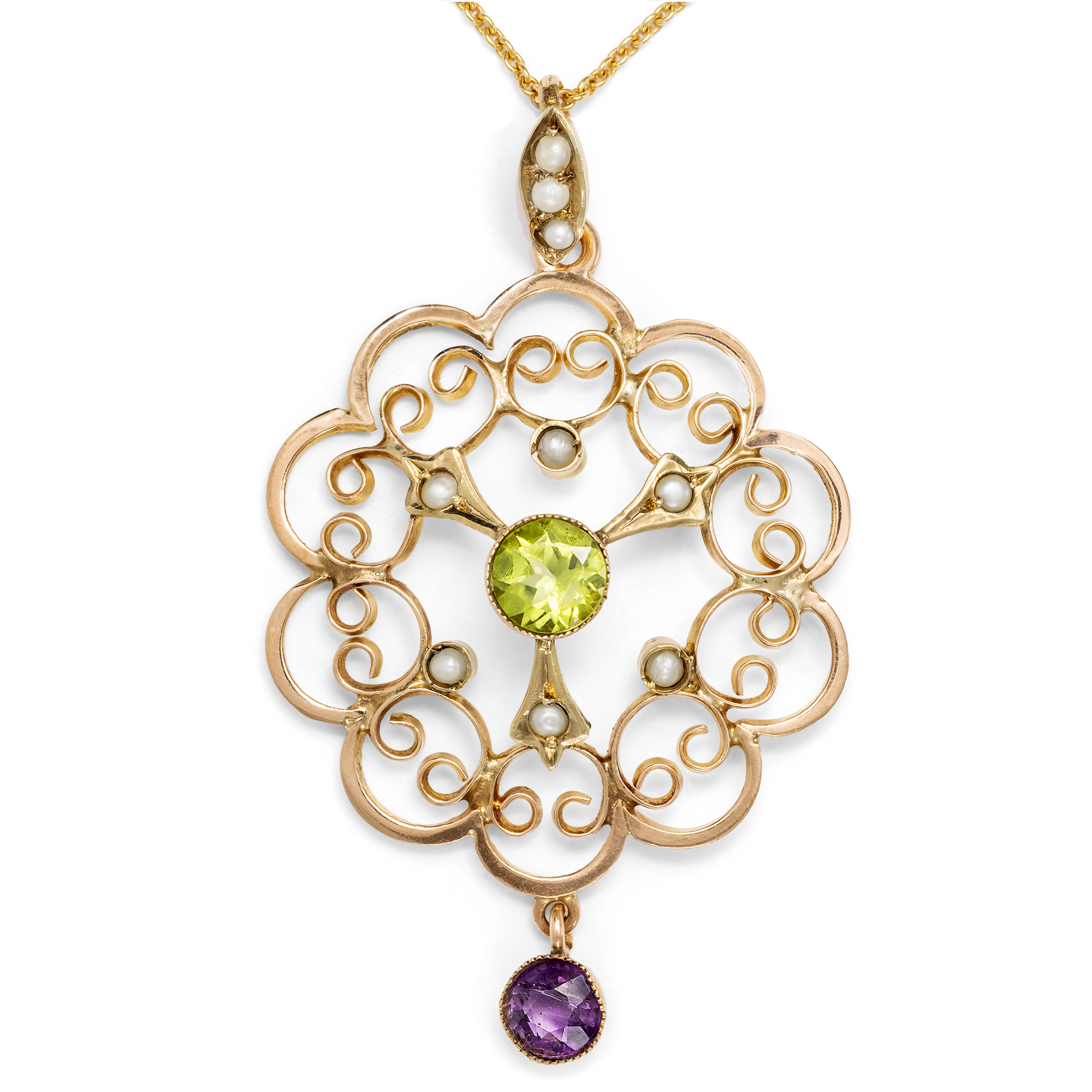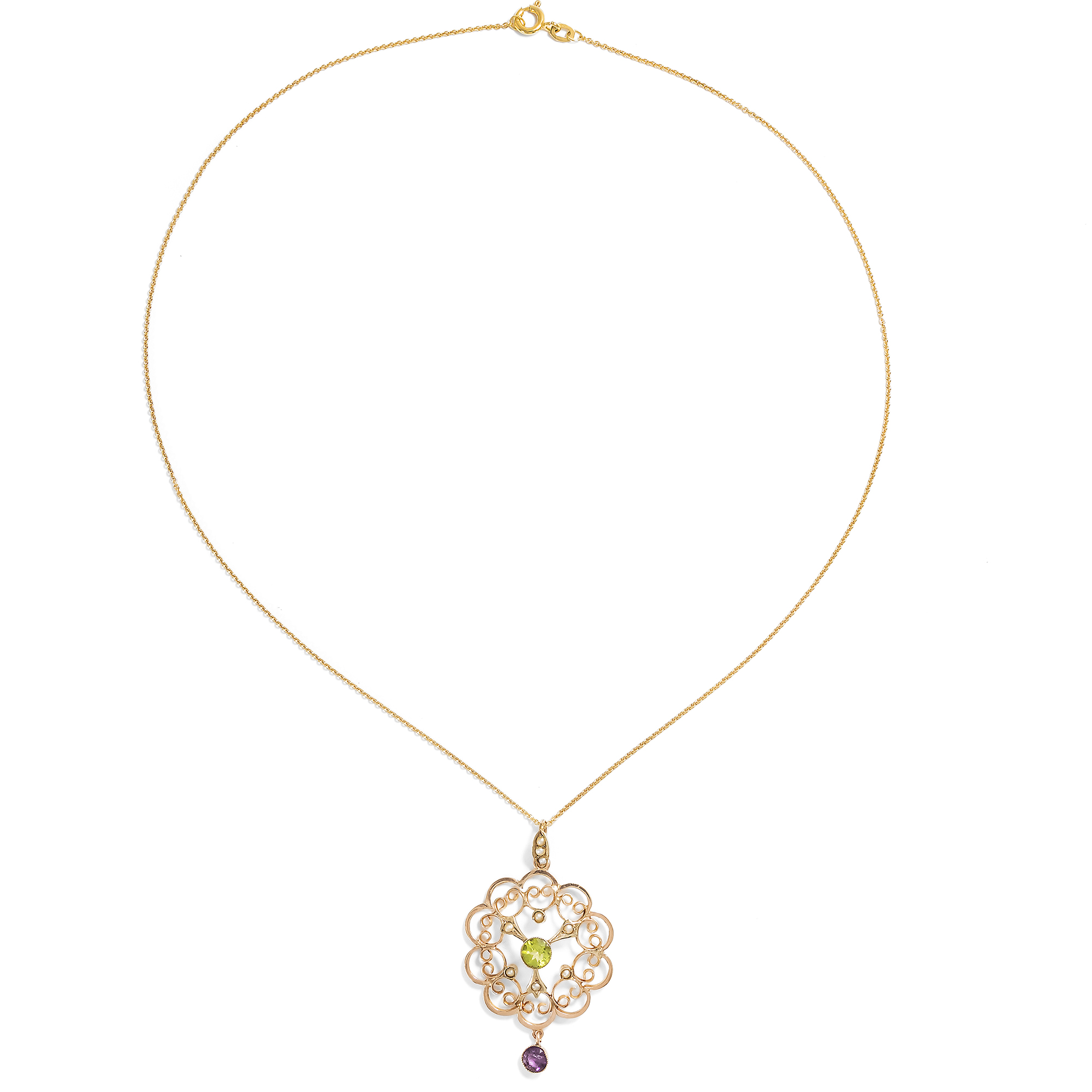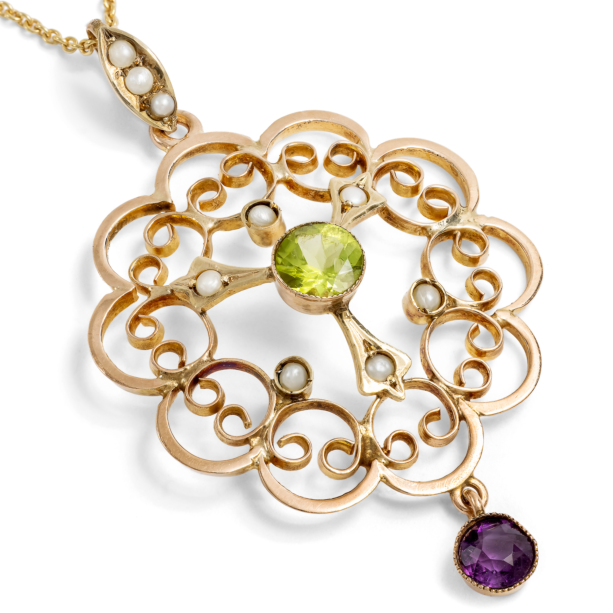 Die Gleichberechtigung von Mann und Frau vor dem Staat ist heute ein selbstverständliches Merkmal westlicher Kulturen – und doch war der Weg dorthin lang und voller Entbehrungen. Bis Frauen in Deutschland im Jahr 1919 erstmals an politischen Wahlen teilnehmen durften, waren unzählige Kämpfe geführt, Tränen vergossen und Opfer gebracht worden. Möglich wurde dieser Wandel nur, weil mutige Frauen sich zusammenschlossen, ihre Stimmen erhoben und unbeirrt gegen bestehende Ungerechtigkeiten antraten. Besonders die sogenannten Suffragetten (von engl./franz. suffrage = „Wahl“) prägten diesen Kampf. Als radikale Frauenrechtlerinnen in Großbritannien und den USA scheuten sie weder Störungen offizieller Veranstaltungen noch Hungerstreiks in der Öffentlichkeit, um auf ihre Sache aufmerksam zu machen. Ihr Mut, ihre Beharrlichkeit und ihre Entschlossenheit machten sie zu Symbolfiguren einer Bewegung, die die Welt verändern sollte. Ein sichtbares Zeichen ihrer Solidarität waren Schmuckstücke in den Farben Grün, Weiß und Violett. Auch der hier vorliegende Kettenanhänger trägt diese Symbolik: weiße Perlen, ein violetter Amethyst und ein grüner Peridot. Zusammengelesen ergibt sich aus den Anfangsbuchstaben der Farben (Green – White – Violet) die Botschaft: „Give Women Vote“ – „Gebt den Frauen das Wahlrecht“. Die Edelsteine besetzen einen symmetrischen, blütenartigen Entwurf aus warm schimmerndem Rotgold im Zeitgeschmack des frühen 20. Jahrhunderts. Ob der Peridot und der Amethyst schon immer Teil des Anhängers waren, oder ob sie in jüngerer Zeit in den Anhänger gesetzt wurden, um den ikonischen Farbklang zu bilden, ist nicht eindeutig festzustellen. Wahrscheinlich wurde zumindest Amethyst erneuert. Der Bezug zur Geschichte der Suffragetten wurde also erst in späterer Zeit hergestellt. Als Hommage an diese wichtige Zeit hat er uns gleichwohl sehr gut gefallen. Wir haben den historisch spannenden Anhänger in London entdeckt und um eine zarte Ankerkette aus Gold ergänzt.