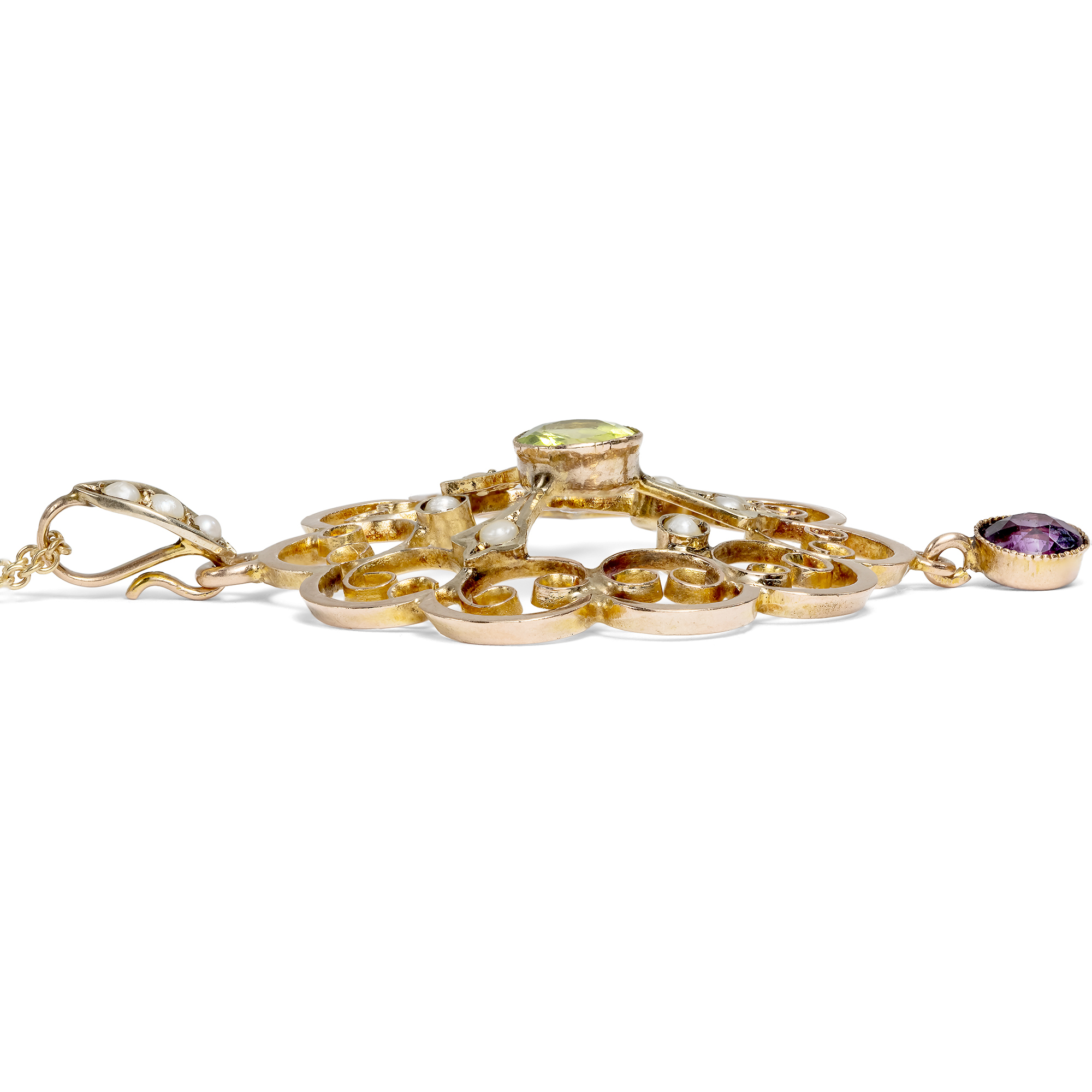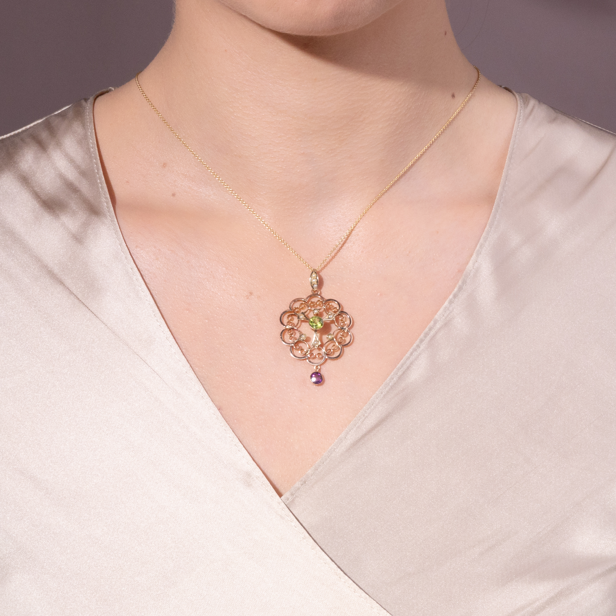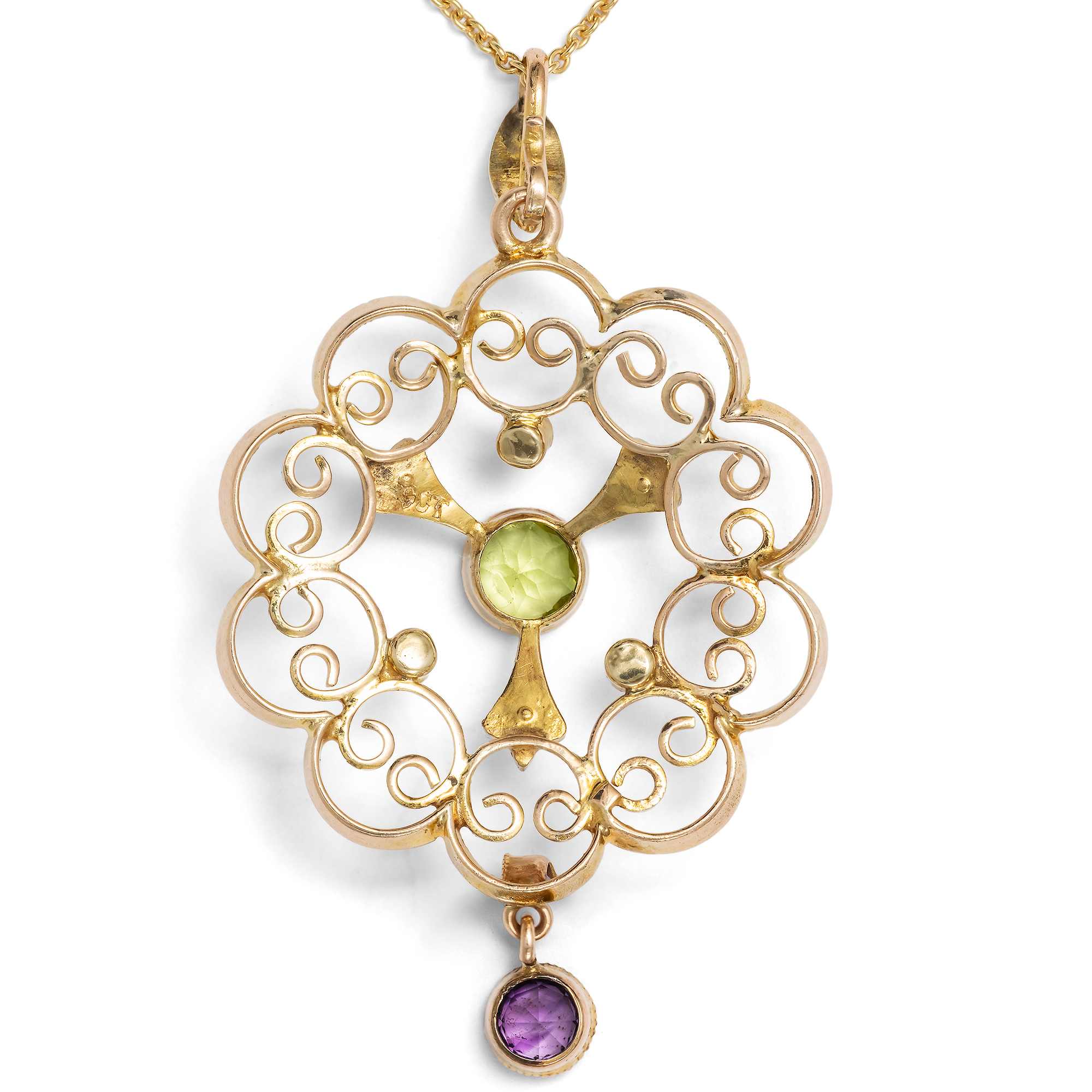Die Gleichberechtigung von Mann und Frau vor dem Staat ist heute ein selbstverständliches Merkmal westlicher Kulturen – und doch war der Weg dorthin lang und voller Entbehrungen. Bis Frauen in Deutschland im Jahr 1919 erstmals an politischen Wahlen teilnehmen durften, waren unzählige Kämpfe geführt, Tränen vergossen und Opfer gebracht worden. Möglich wurde dieser Wandel nur, weil mutige Frauen sich zusammenschlossen, ihre Stimmen erhoben und unbeirrt gegen bestehende Ungerechtigkeiten antraten. Besonders die sogenannten Suffragetten (von engl./franz. suffrage = „Wahl“) prägten diesen Kampf. Als radikale Frauenrechtlerinnen in Großbritannien und den USA scheuten sie weder Störungen offizieller Veranstaltungen noch Hungerstreiks in der Öffentlichkeit, um auf ihre Sache aufmerksam zu machen. Ihr Mut, ihre Beharrlichkeit und ihre Entschlossenheit machten sie zu Symbolfiguren einer Bewegung, die die Welt verändern sollte. Ein sichtbares Zeichen ihrer Solidarität waren Schmuckstücke in den Farben Grün, Weiß und Violett. Auch der hier vorliegende Kettenanhänger trägt diese Symbolik: weiße Perlen, ein violetter Amethyst und ein grüner Peridot. Zusammengelesen ergibt sich aus den Anfangsbuchstaben der Farben (Green – White – Violet) die Botschaft: „Give Women Vote“ – „Gebt den Frauen das Wahlrecht“. Die Edelsteine besetzen einen symmetrischen, blütenartigen Entwurf aus warm schimmerndem Rotgold im Zeitgeschmack des frühen 20. Jahrhunderts. Ob der Peridot und der Amethyst schon immer Teil des Anhängers waren, oder ob sie in jüngerer Zeit in den Anhänger gesetzt wurden, um den ikonischen Farbklang zu bilden, ist nicht eindeutig festzustellen. Wahrscheinlich wurde zumindest Amethyst erneuert. Der Bezug zur Geschichte der Suffragetten wurde also erst in späterer Zeit hergestellt. Als Hommage an diese wichtige Zeit hat er uns gleichwohl sehr gut gefallen. Wir haben den historisch spannenden Anhänger in London entdeckt und um eine zarte Ankerkette aus Gold ergänzt.