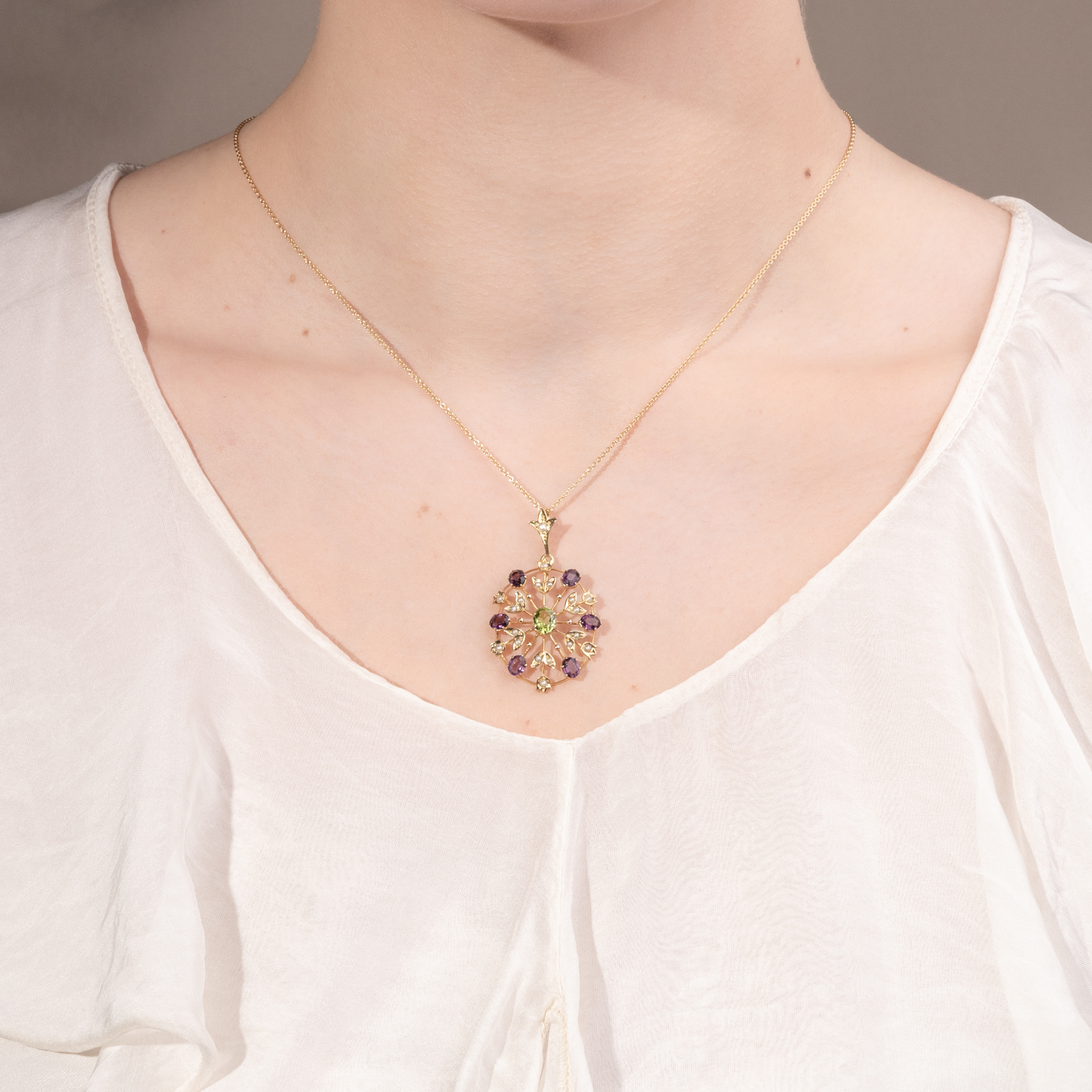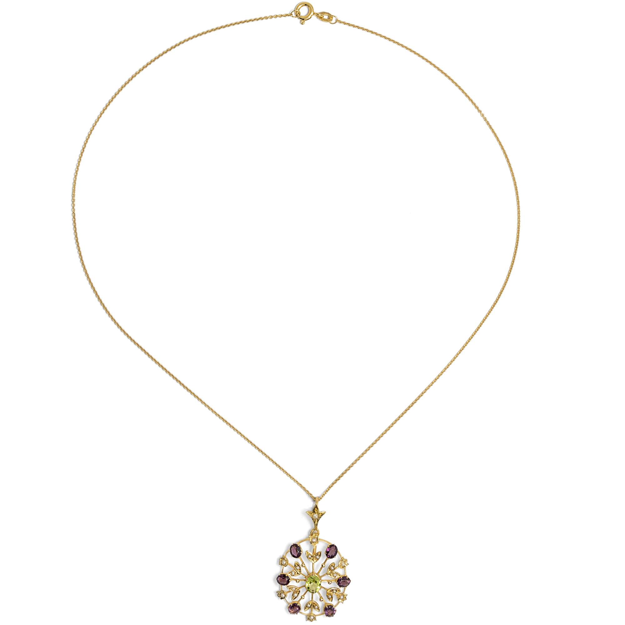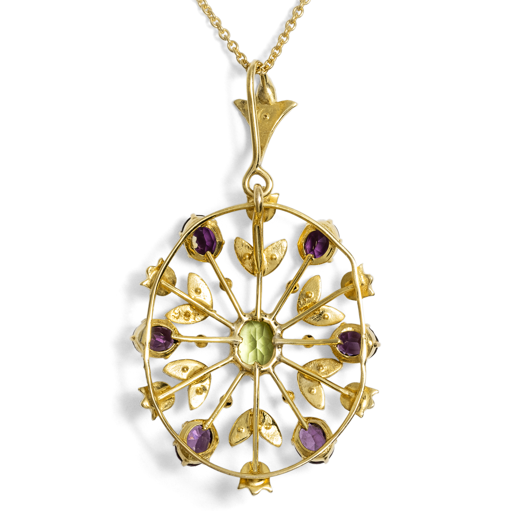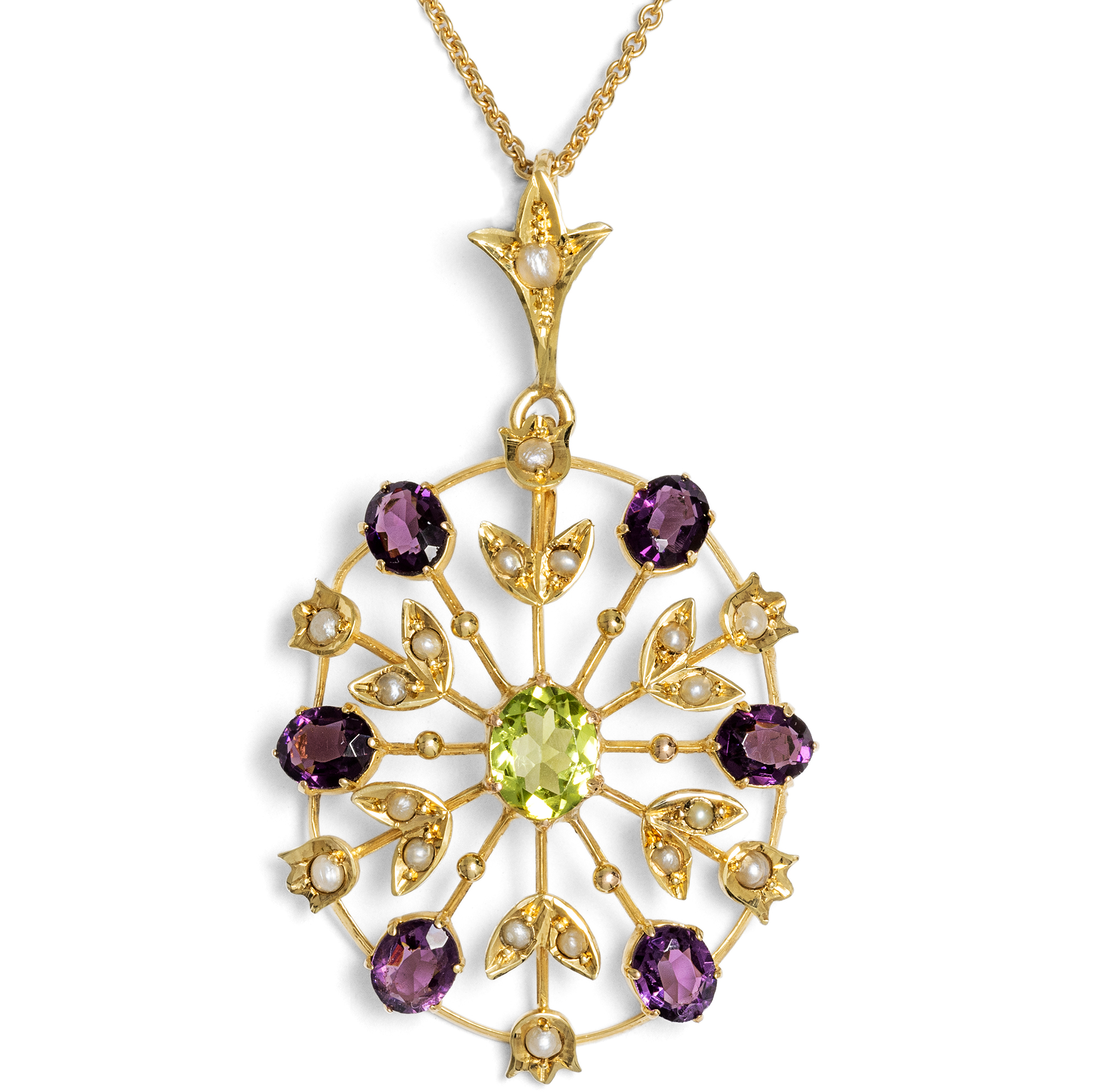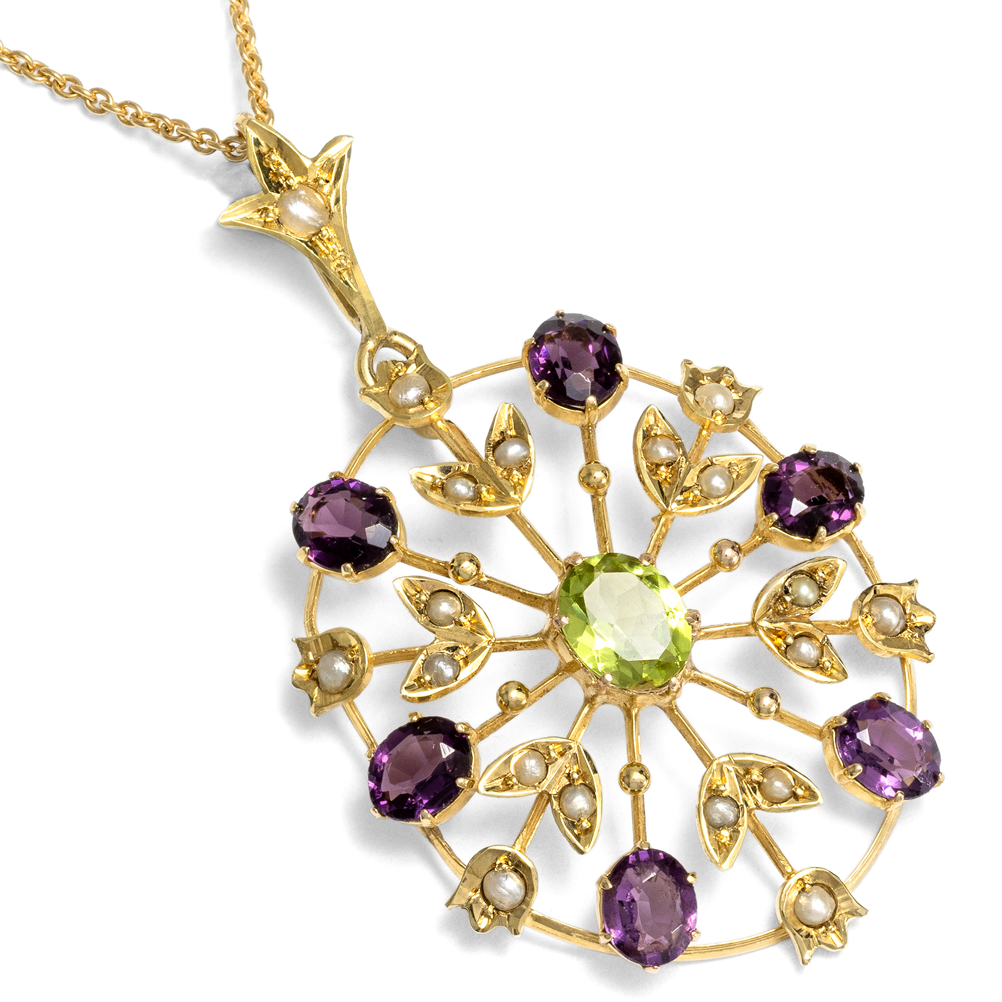 Als die Suffragetten in den frühen Jahren des 20. Jahrhunderts mehr Rechte für Frauen erkämpften, etablierte sich alsbald ein bestimmter Farbklang zu ihrer Erkennung: Grün, Weiß und Violett. Eine der führenden Figuren der Frauenbewegung, Emmeline Pethick-Lawrence, hatte diesen aus symbolischen Gründen vorgeschlagen. Sie schrieb 1908: „Purpur, wie jedermann weiß, ist eine königliche Farbe. Es steht für das königliche Blut, das in den Adern einer jeden Suffragette fließt, für den Instinkt der Freiheit und Würde; Weiß steht für die Reinheit im privaten und öffentlichen Leben; Grün ist die Farbe der Hoffnung und des Frühlings.“ Nur wenig später, im Jahre 1910, ließ der Union Labor Advocate – die Zeitschrift der National Women’s Trade Union League – verlauten, die Farben seien auch als Akronym zu verstehen. Nehme man die Anfangsbuchstaben der Farben Grün, Weiß und Violett, so könnten diese ebenfalls für „Give Women Vote“ stehen, gebt Frauen das Wahlrecht – das, wofür die Suffragetten kämpften. Auch dies trug weiter zur Popularisierung des Farbklanges bei. Frauen trugen als Erkennungszeichen Schleifen in diesen Farben, Kleidung oder Schärpen, aber auch kostbaren Schmuck. Britische Schmuckfirmen wie Child & Child, Mappin & Webb, aber auch das berühmte Warenhaus Liberty verkauften in den Anfangsjahren des 20. Jahrhunderts verschiedenste Schmuckstücke in den Farben der Suffragetten. Im Fall des hier vorliegenden Anhängers finden sich weiße Perlen, ein grüner Peridot und violettes Glas – genau die Farben also, welche zur Entstehungszeit des Anhängers als die Farben der Suffragetten galten. Die ovale Form des Anhängers, gebildet aus delikaten Linien und gefüllt mit Lorbeerblättchen, entspricht der Mode um 1910. Der genaue Blick mit der Lupe verrät, dass der Peridot nicht immer schon Teil des Anhängers war. Vermutlich war der Anhänger ursprünglich ganz mit violetten Glasteinen besetzt. Erst in jüngerer Zeit wurde der Farbklang des Anhängers also geändert, um dem ikonischen Dreiklang zu entsprechen. Der Bezug zur Geschichte der Suffragetten wurde also erst in späterer Zeit hergestellt. Als Hommage an diese wichtige Zeit hat er uns gleichwohl sehr gut gefallen. Wir haben den historisch spannenden Anhänger in London entdeckt und um eine zarte Ankerkette aus Gold ergänzt.