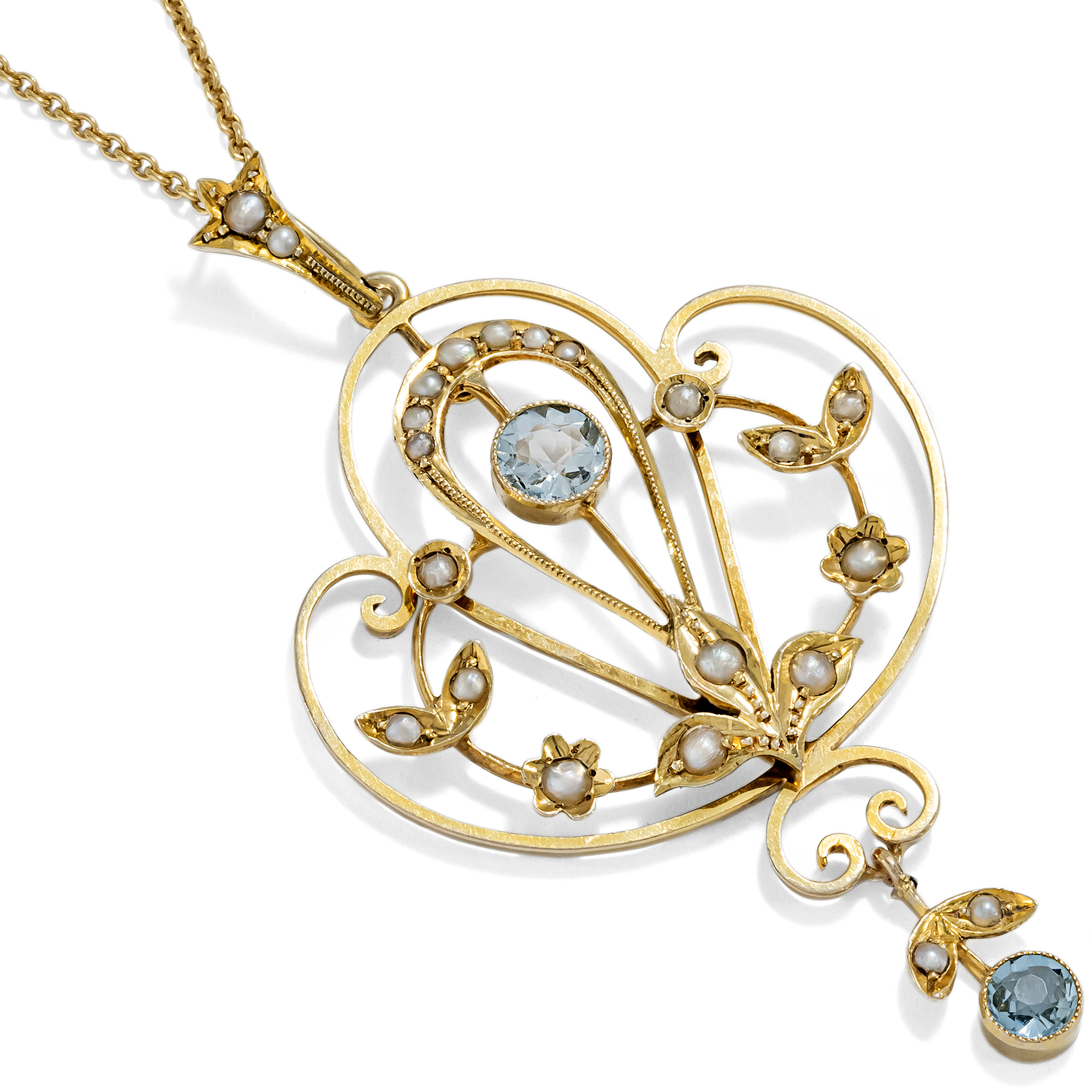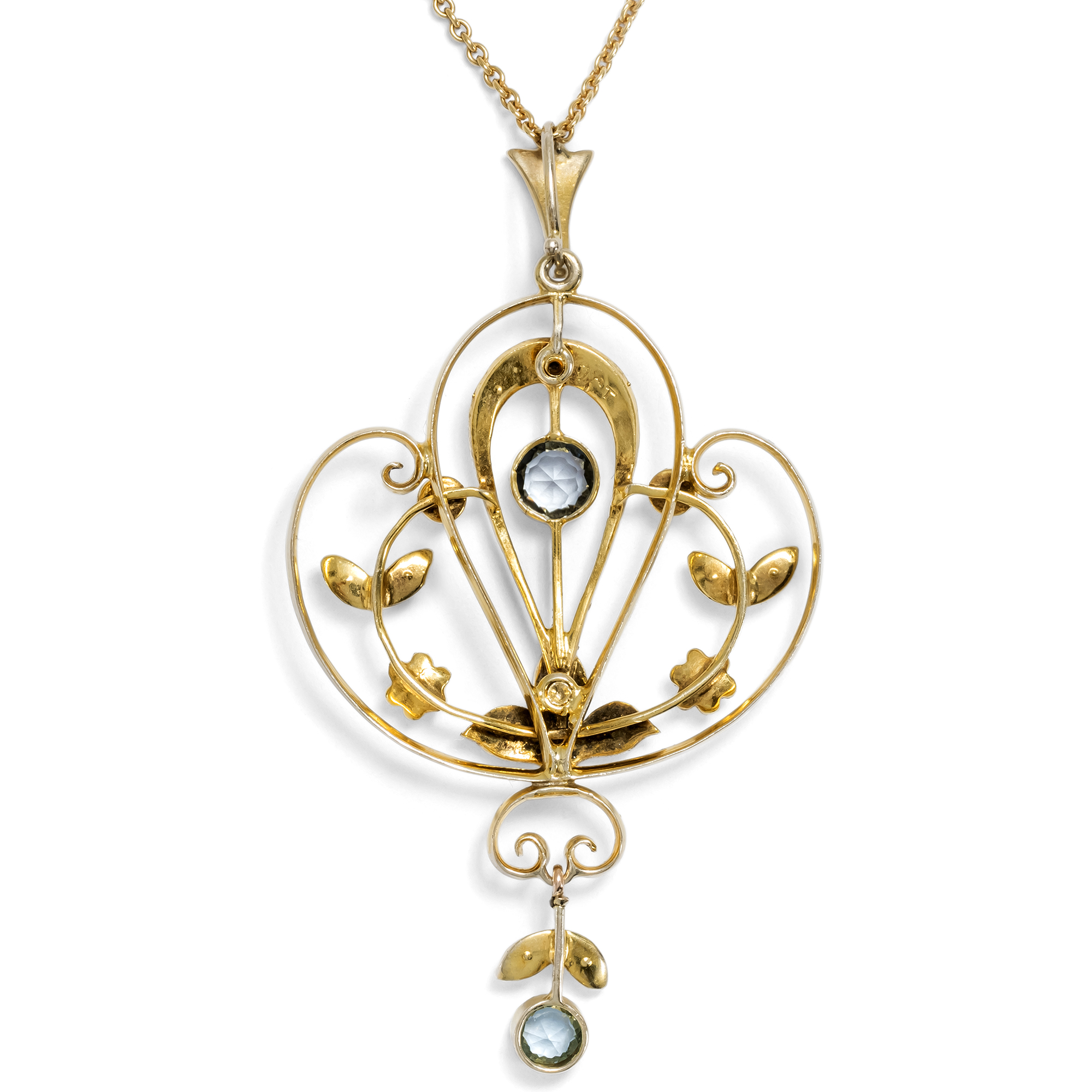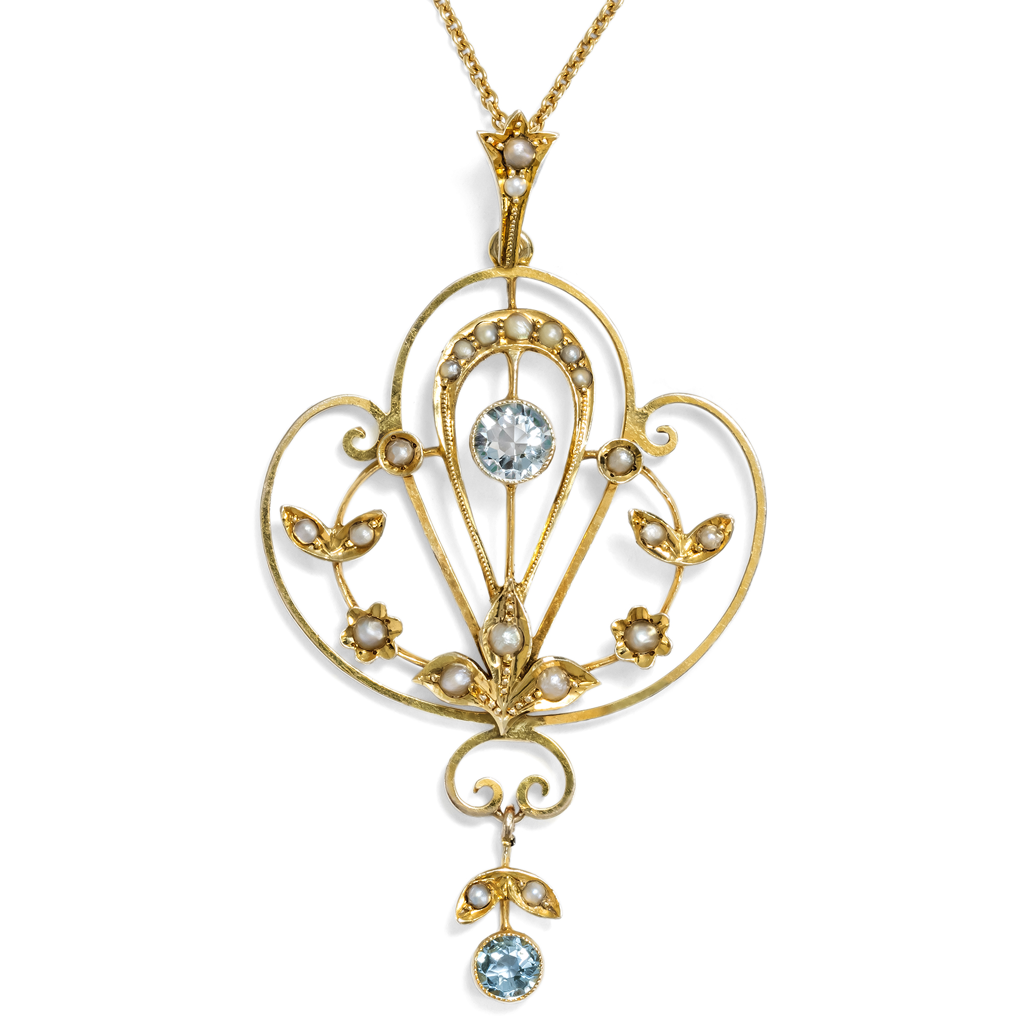 Leichtigkeit war das Ideal der Belle Époque, jener Zeit vor dem Ausbruch des ersten Weltkrieges. Nicht mehr nur der Adel feierte glänzende Feste. Auch das Bürgertum, durch die Industrialisierung zu Reichtum und Ansehen gelangt, wollte an den Sonnenseiten des Lebens teilhaben. Rauschende Bälle, schäumende Champagnerkelche und elegante Salons prägen das Bild jener Zeit. Tagsüber – zum Lunch, zum Nachmittagstee oder zum Besuch bei der Modistin – trug die Dame des frühen 20. Jahrhunderts Goldschmuck in feinen, zarten Formen, besetzt mit Perlen oder den damals noch unter die sogenannten Halbedelsteine gezählten Aquamarinen, Amethysten oder Peridoten. Solch ein Stück liegt auch hier vor. Elegante Schwünge, die an hauchzarte Ranken erinnern, sind zu einem abstrakten Ornament komponiert worden. Kleine, mit Saatperlen besetzte Blätter beleben das Ornament und rahmen zwei blassblaue Aquamarine, die brillant funkeln. Wir haben das feine Schmuckstück in London entdeckt und es um eine zarte Goldkette ergänzt. Es ist zu Beginn des 20. Jahrhunderts in Großbritannien entstanden.