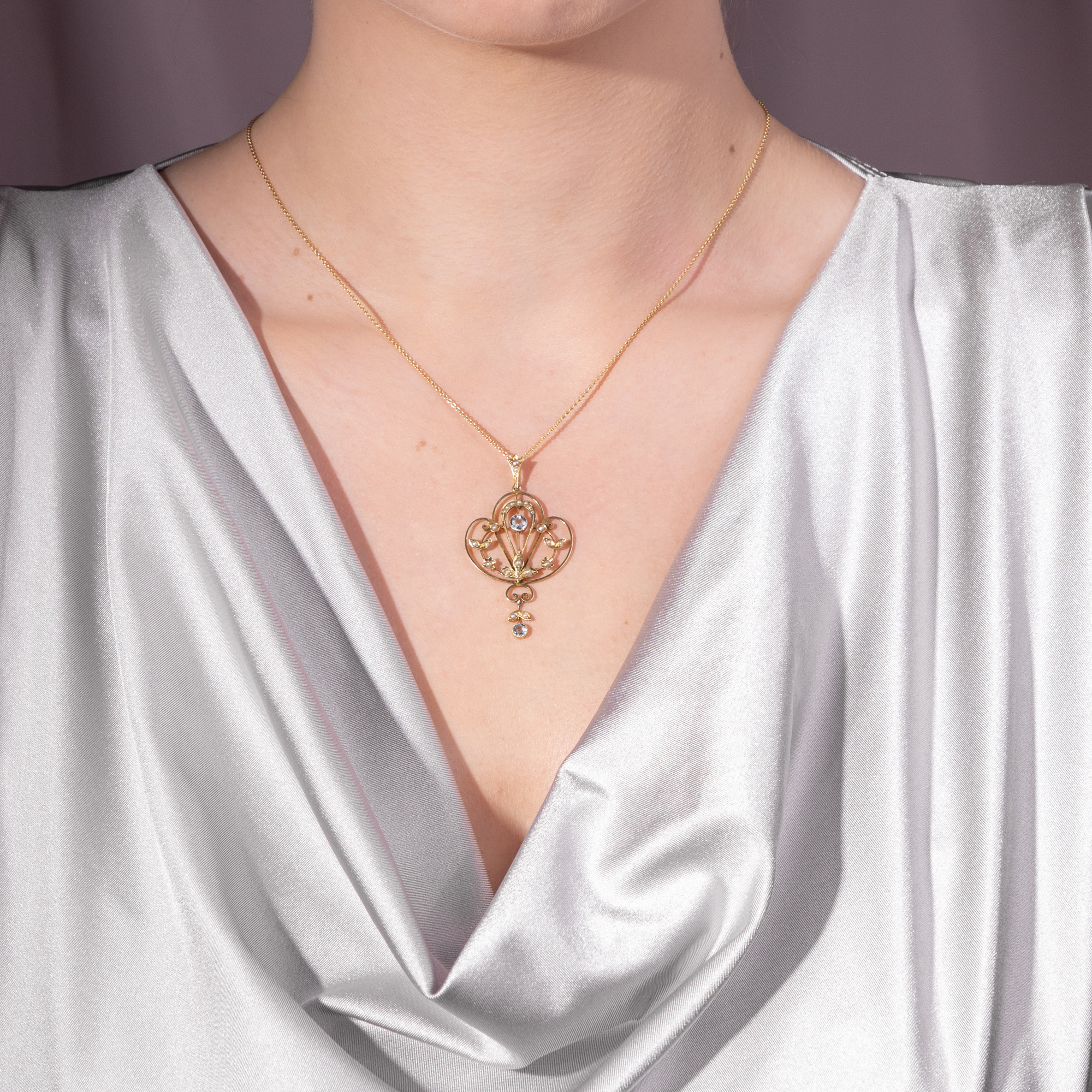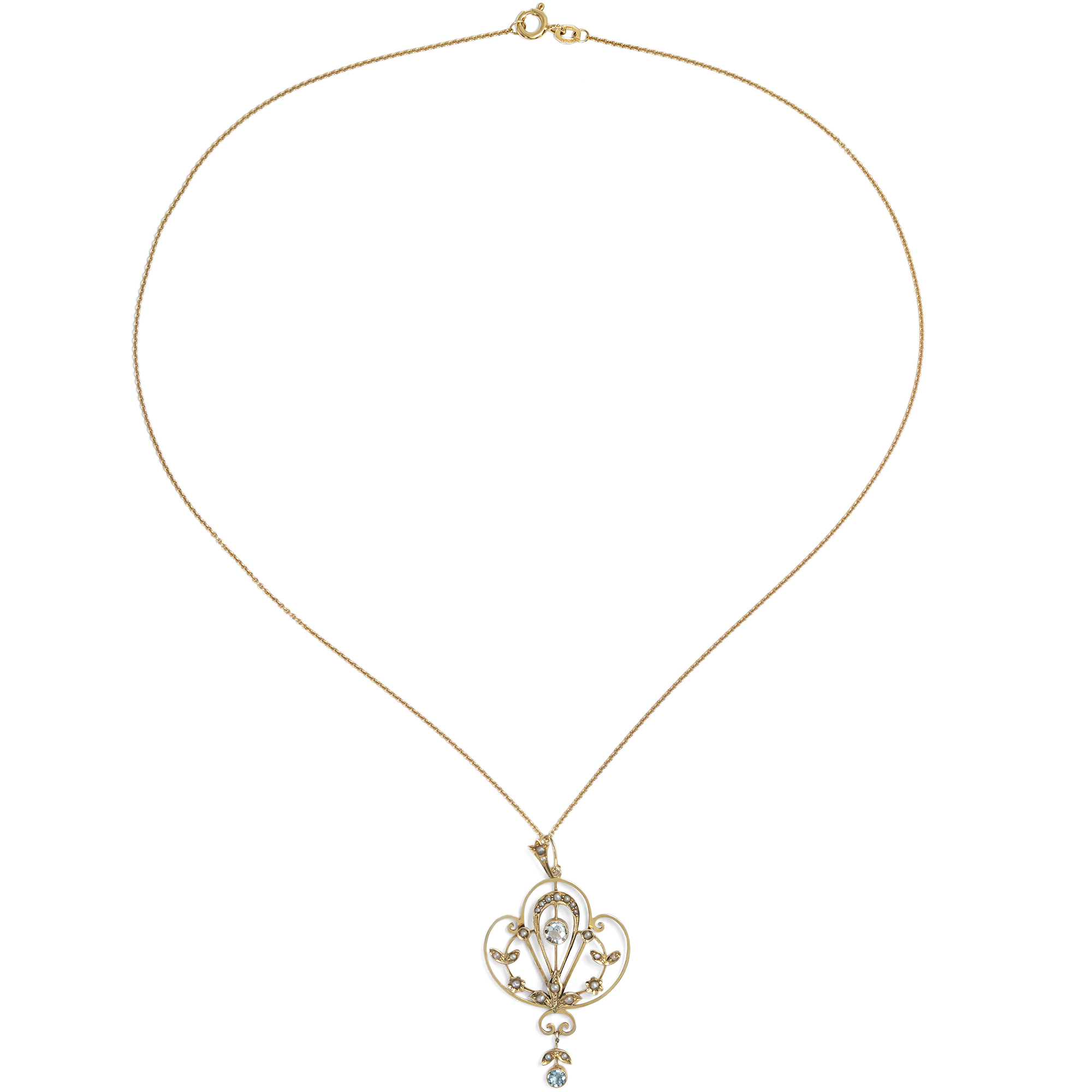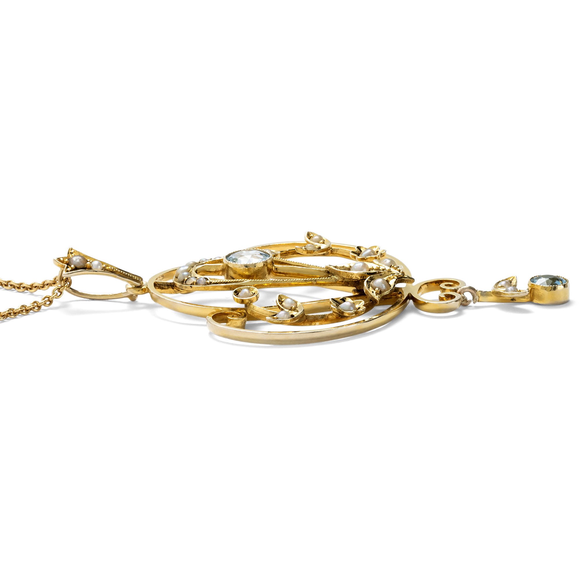 Leichtigkeit war das Ideal der Belle Époque, jener Zeit vor dem Ausbruch des ersten Weltkrieges. Nicht mehr nur der Adel feierte glänzende Feste. Auch das Bürgertum, durch die Industrialisierung zu Reichtum und Ansehen gelangt, wollte an den Sonnenseiten des Lebens teilhaben. Rauschende Bälle, schäumende Champagnerkelche und elegante Salons prägen das Bild jener Zeit. Tagsüber – zum Lunch, zum Nachmittagstee oder zum Besuch bei der Modistin – trug die Dame des frühen 20. Jahrhunderts Goldschmuck in feinen, zarten Formen, besetzt mit Perlen oder den damals noch unter die sogenannten Halbedelsteine gezählten Aquamarinen, Amethysten oder Peridoten. Solch ein Stück liegt auch hier vor. Elegante Schwünge, die an hauchzarte Ranken erinnern, sind zu einem abstrakten Ornament komponiert worden. Kleine, mit Saatperlen besetzte Blätter beleben das Ornament und rahmen zwei blassblaue Aquamarine, die brillant funkeln. Wir haben das feine Schmuckstück in London entdeckt und es um eine zarte Goldkette ergänzt. Es ist zu Beginn des 20. Jahrhunderts in Großbritannien entstanden.