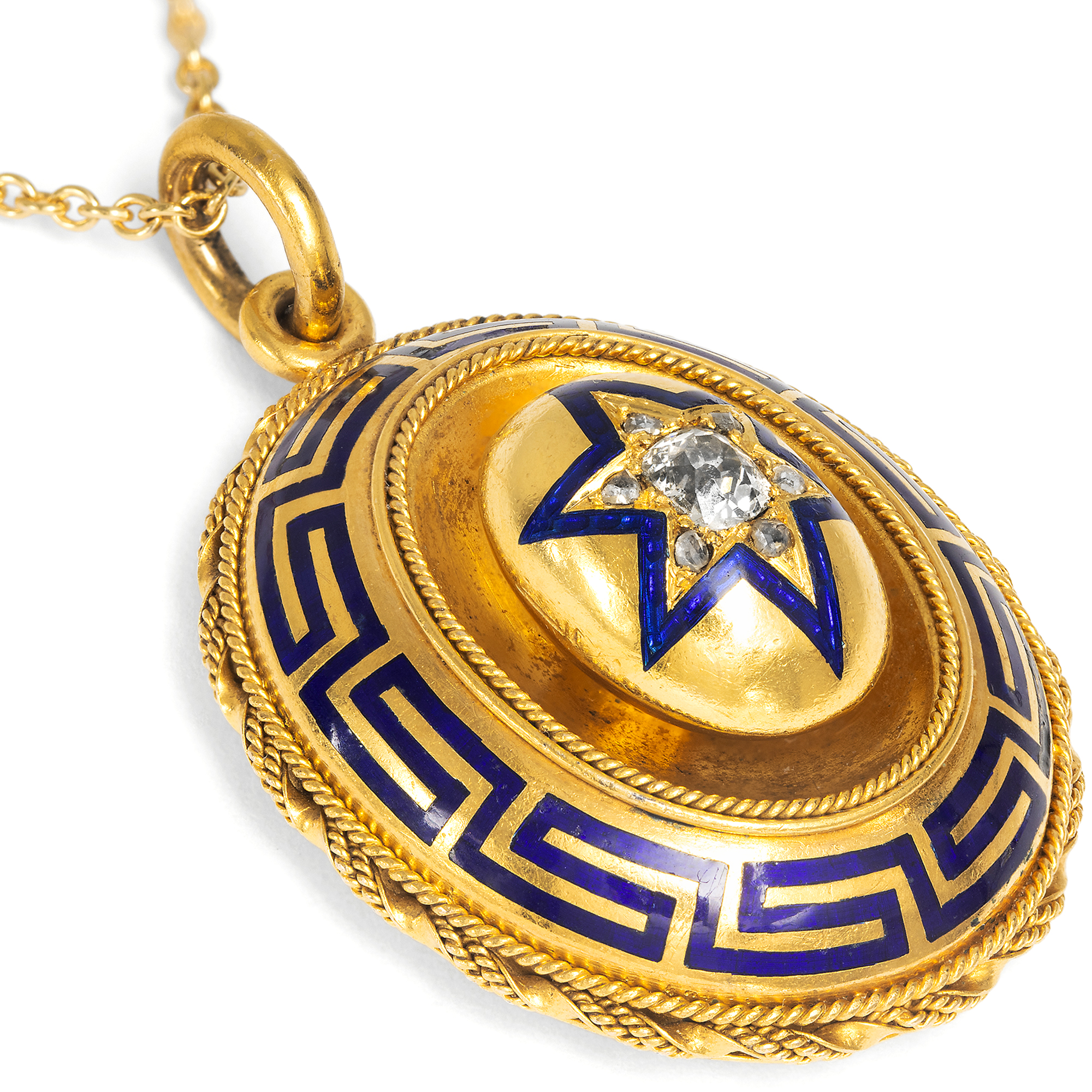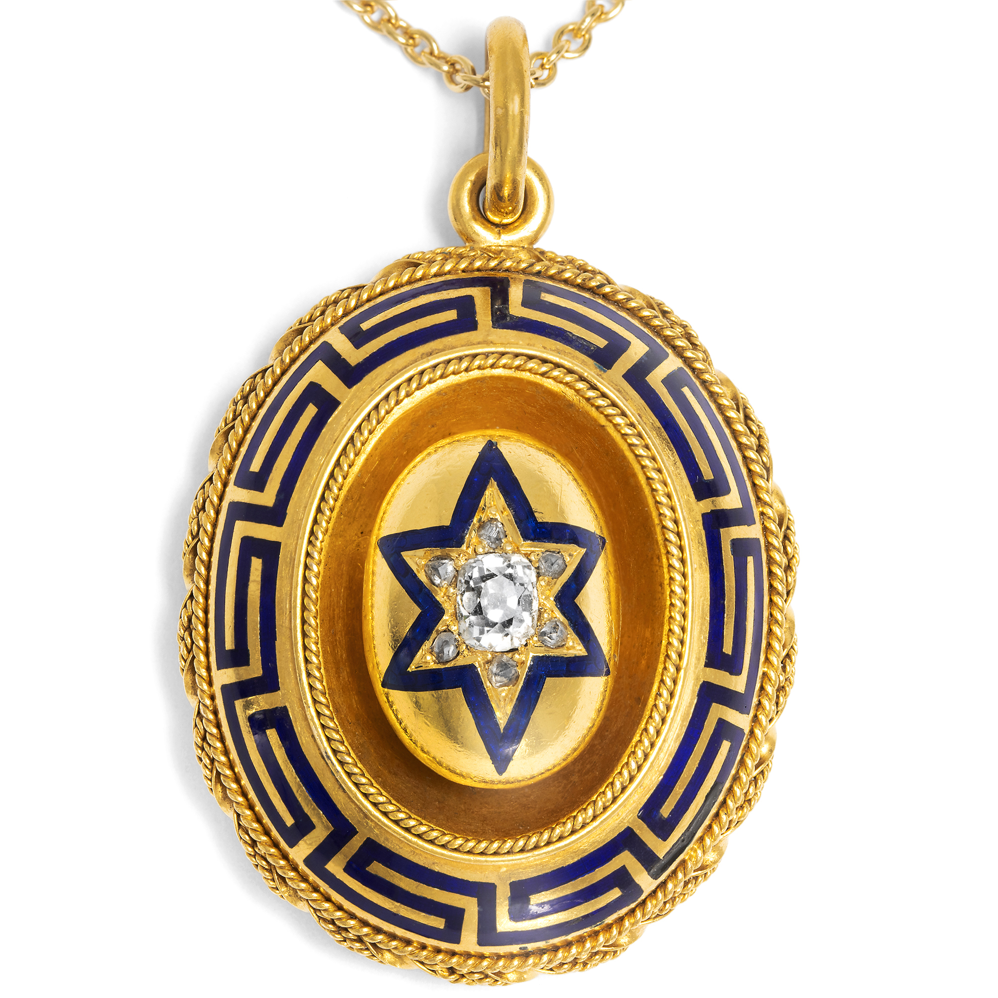 Reich und golden schimmert der hier vorliegende Anhänger, prachtvoll, doch auch wärmend und tröstend zugleich. Er ist als ovales Schild entworfen. In seiner Mitte sitzt, durch eine konkave Schale vom Rest des Entwurfs getrennt, ein gewölbtes Zierelement. Es ist mit einem Stern aus blauem Email und glitzernden Diamanten verziert. Ein großer ovaler Diamant im sog. „Old Mine Cut“ besetzt die Mitte des Entwurfes. Kleinere Diamanten im Rosenschliff bilden die Strahlen des Sterns. Den äußeren Rahmen des Anhängers bildet ein Mäander aus blauem Email und applizierten Goldkordeln. Schmuckstücke in der Form von gewölbten Schilden waren in den 1860er und 1870er Jahren eine große Mode. Nach den eher naturalistischen Entwürfen der ersten Jahrhunderthälfte wurden die Formen nun eher abstrakt. Man liebte große, schimmernde Flächen aus warm glänzendem Gold, das durch eine zusätzliche Auflage aus Feingold – das sog. „bloom finish“ – besonders satt leuchtete. Eine beliebte Ergänzung hierzu waren grafische Linien. Sie galten in den 1860er und frühen 1870er Jahren als besonders modisch und belebten auch einfarbige Kleider mit schwarzen Streifen, Borten oder Mäander-Dekoren, die selbst aus heutiger Sicht noch verblüffend modern wirken, vgl. Met Costume Collection 1981.149.1a, b. Der hier vorliegende Anhänger entstammt dieser Zeit und kombiniert das Gelbgold mit dunkelblauem Email und Diamanten. Zeittypisch ist auch die Rückseite des Anhängers, denn hier verbirgt sich ein Medaillonfach, in dem persönliche Erinnerungsstücke aufbewahrt werden können – Erinnerungen an eine Person, über welcher der funkelnde Stern die Erinnerung wachhält. Wir haben das wohlerhaltene Schmuckstück in London entdeckt und um eine passende Goldkette ergänzt. So kann es sofort um den Hals getragen werden. Zu den Anhängern und Broschen der Jahre um 1870 vgl. u.a. David Bennet und Daniela Mascetti: Understanding Jewellery, Woodbridge 2010, S. 168f.