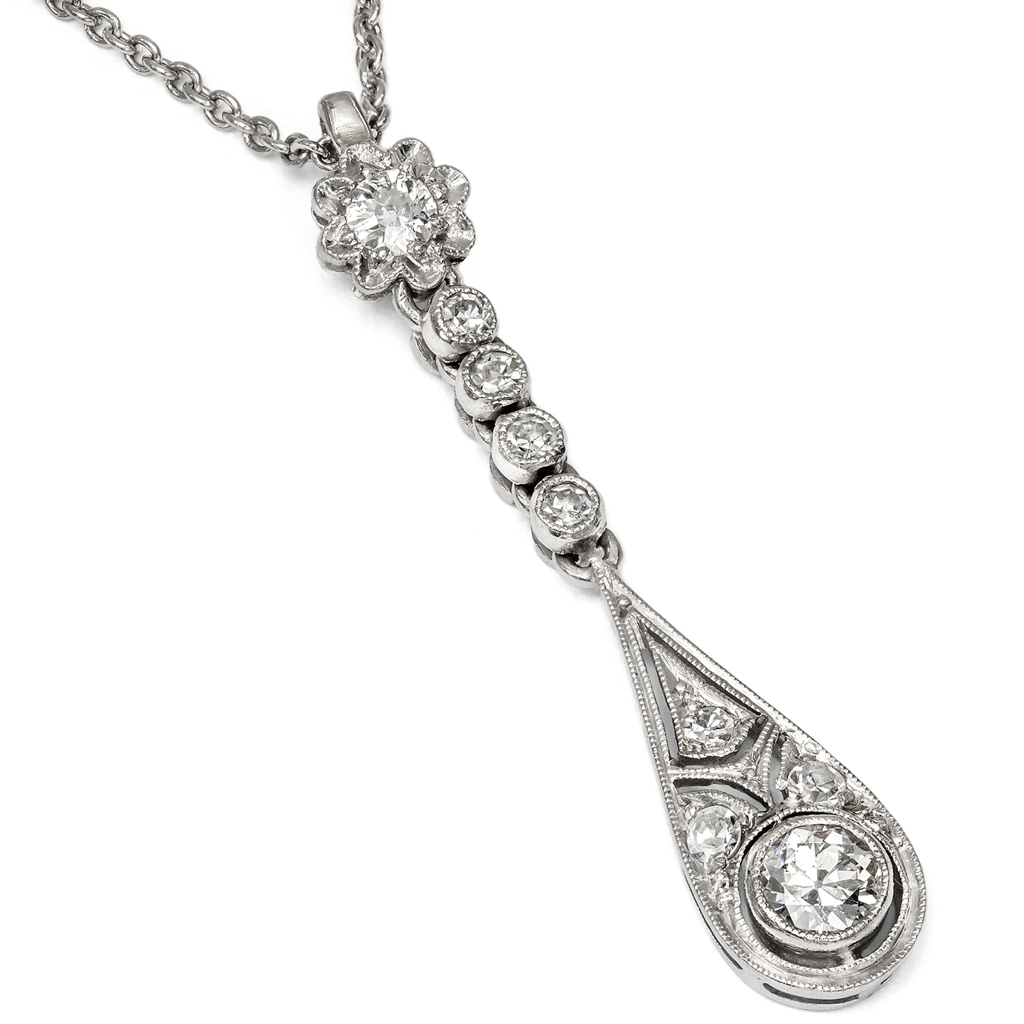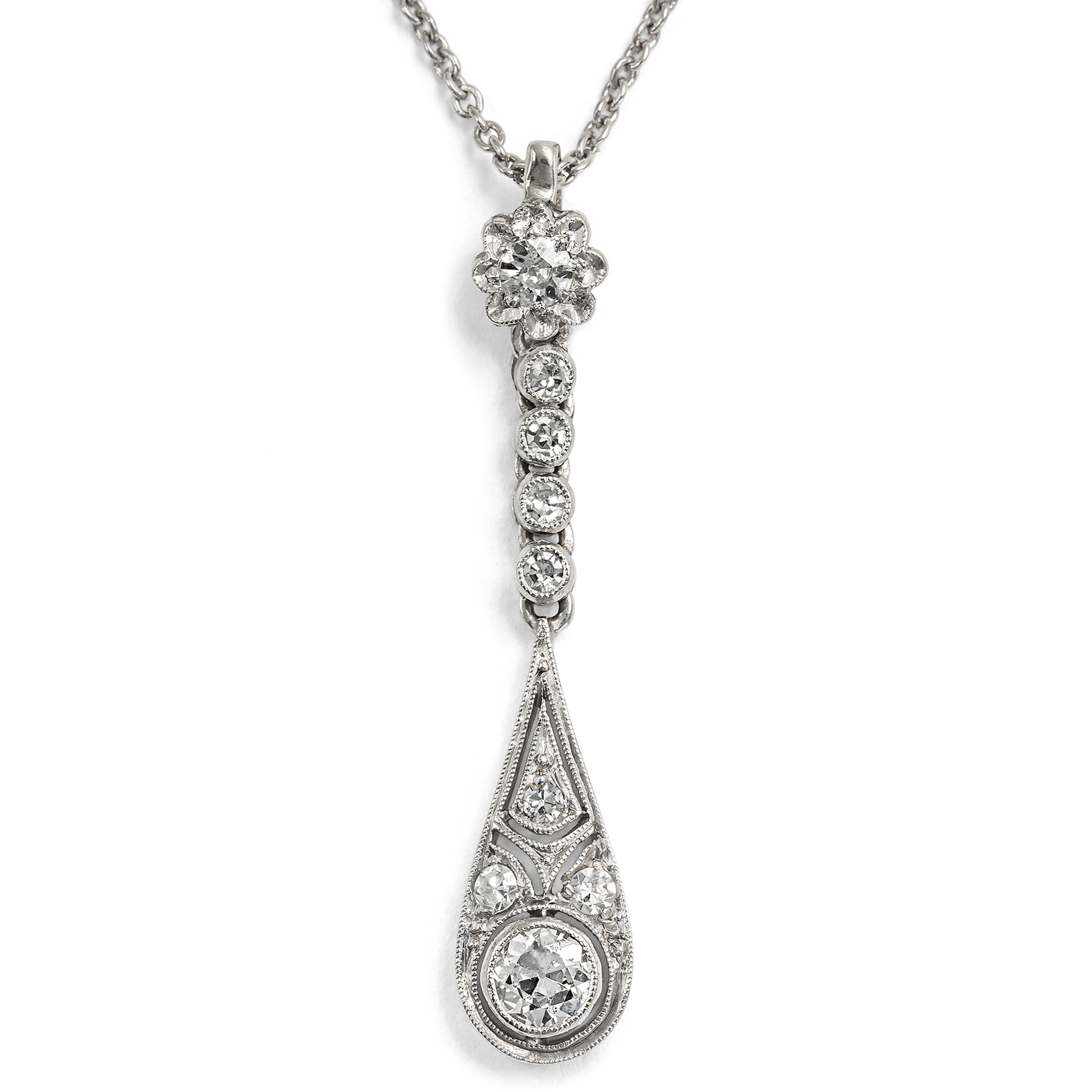 Die Glanzjahre des Art Déco fielen in eine bewegte Zeit voller Widersprüche. Nach der Katastrophe des Ersten Weltkrieges und dem Chaos der Inflation begann erst zum Ende der 1920er-Jahre eine Phase des wirtschaftlichen Aufschwungs. Mehr und mehr brachen sich optimistischer Fortschrittsglaube und Lebenslust Bahn. Der Schmuck jener Jahre ließ die historischen Vorbilder hinter sich und begeistert bis heute durch seine verblüffende Modernität, Eleganz und die nie wieder erreichte Perfektion der Verarbeitung. Mustergültig zeigt der vorliegende Anhänger die Qualitäten dieser Zeit. Dass Schmuckstücks in Form eines sich weitenden Tropfens ist aus Platin gefertigt. In der Mitte funkelt ein Diamant im Altschliff von etwa 0,20 ct Gewicht. Feine Sägearbeiten und Millegriffes lösen die Formen in ein Spiel aus weißem Licht und dunklen Schatten auf. Eine Reihe weiterer Diamanten und eine kleine Blüte aus Diamant leiten nach oben zur zarten Ankerkette aus Platin über. Wir datieren den Anhänger auf die Jahre um 1930. Die moderne Kette aus Platin macht das Schmuckstück sofort tragbar.