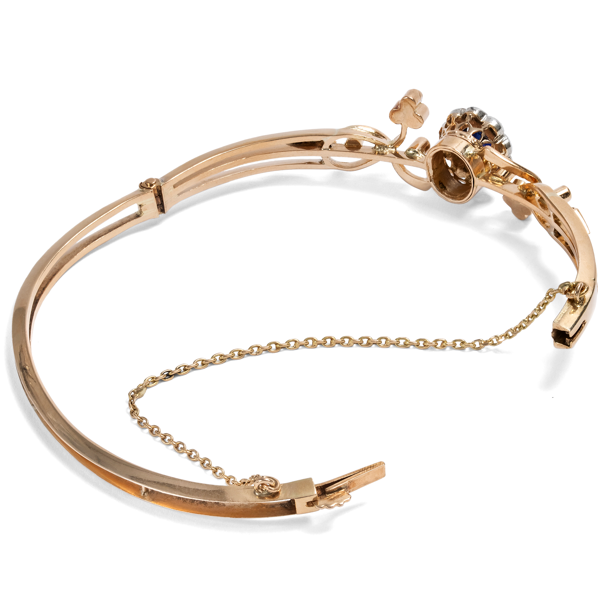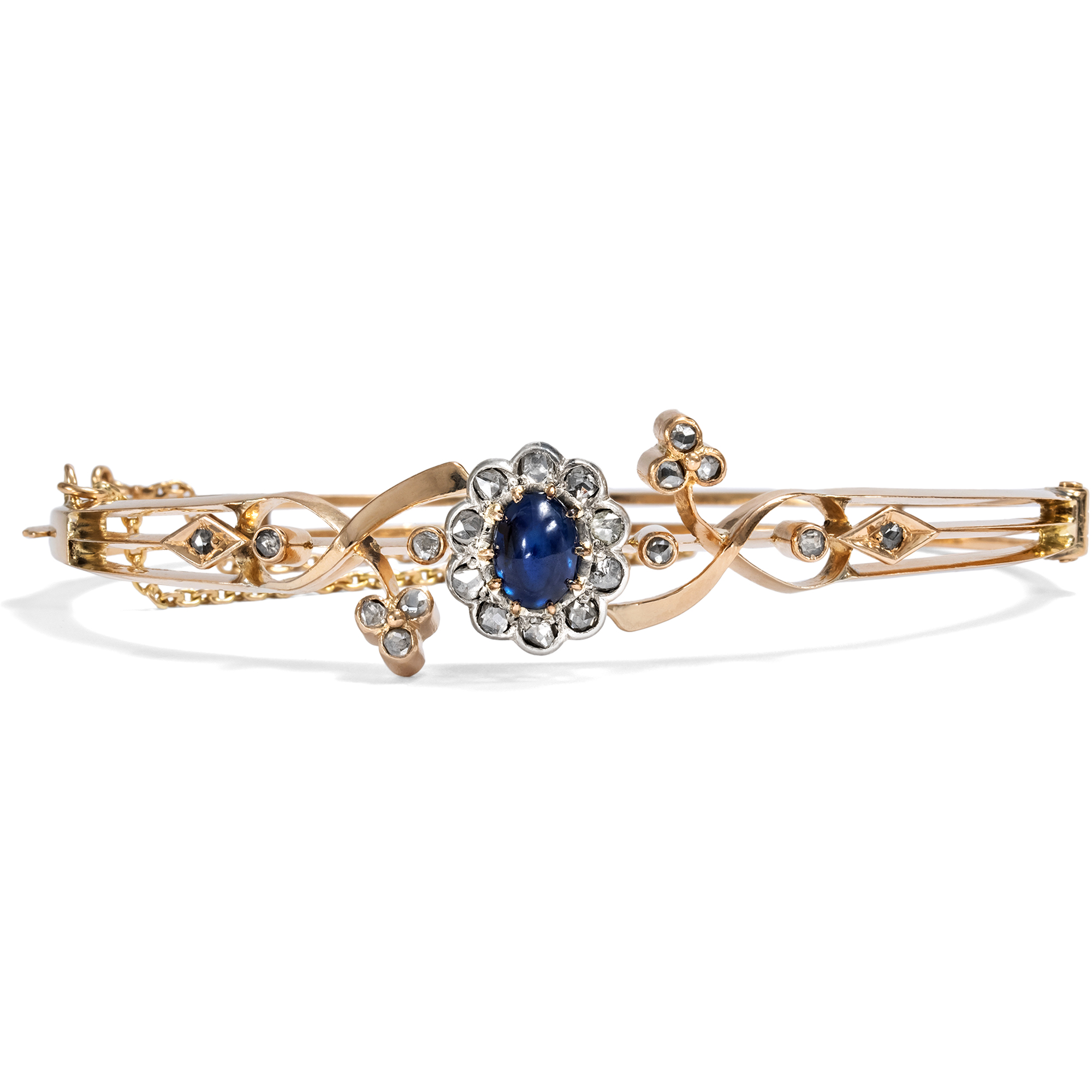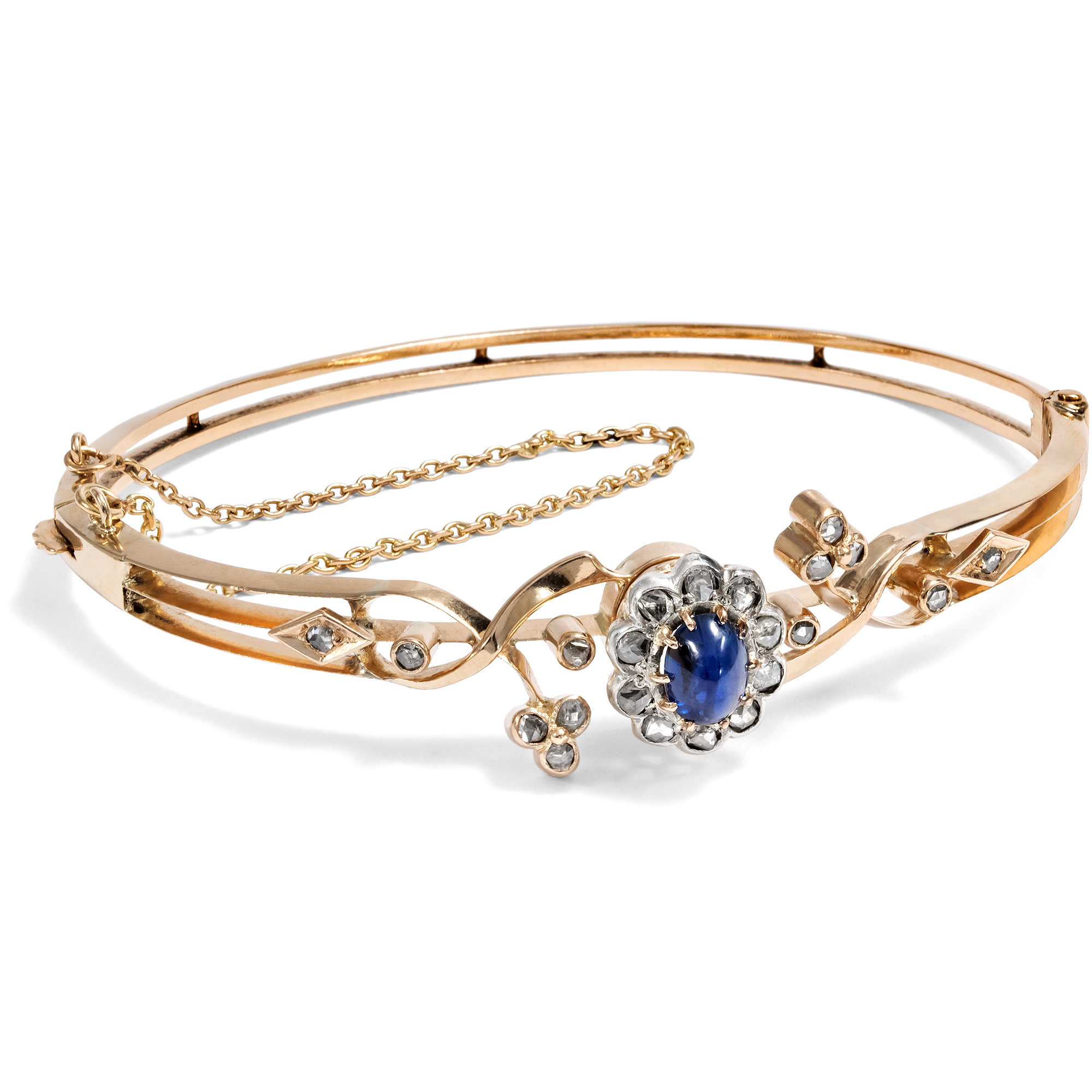 Fein detaillierte, warm glänzende Goldarmreife waren im späten 19. Jahrhundert eine besondere Mode. Da die ausladenden, weichen Kleider der Damen hier zugleich einen guten Schutz für die teilweise sehr aufwendig gearbeiteten Stücke boten, konnten sich auch feinste Ornamentideen verwirklichen lassen. Bei der Gestaltung dieser Stücke - wie im Bereich der Mode allgemein - wechselten sich die Formen das 19. Jahrhundert hindurch in immer schnellerer Folge ab. Nacheinander wurden zunächst die unterschiedlichsten Stile der Vergangenheit wiederbelebt, von der Gotik und der Renaissance bis hin zur Antike. Zum Ende des Jahrhunderts lösten sich die Goldschmiede allmählich von den historischen Formen und eine neue Inspirationsquelle trat zunehmend in den Vordergrund, die Natur und das Reich der Pflanzen. Auch unser Armreif zeigt diese vegetabile Formensprache, die schließlich im Jugendstil münden sollte. Der Reif ist aus 14-karätigem Gold gefertigt und aus schmalen sogenannten Messerstegen aufgebaut. In seiner Mitte weitet sich der Entwurf und mündet in zarten Schwüngen und Blättchen, die mit glitzernden Diamantrosen besetzt sind. Sie rahmen den eigentlichen Höhepunkt des exquisiten Schmuckstücks, einen bezaubernden Saphir von schöner blauer Farbe. Der Edelstein ist zu einem ovalen Cabochon geschliffen und wird durch eine Entourage aus elf Diamantrosen in Silberfassungen wunderbar zur Geltung gebracht. Der in den Jahren um 1890 entstandene Reif ist sehr schön erhalten und fand aus Amsterdam zu uns.