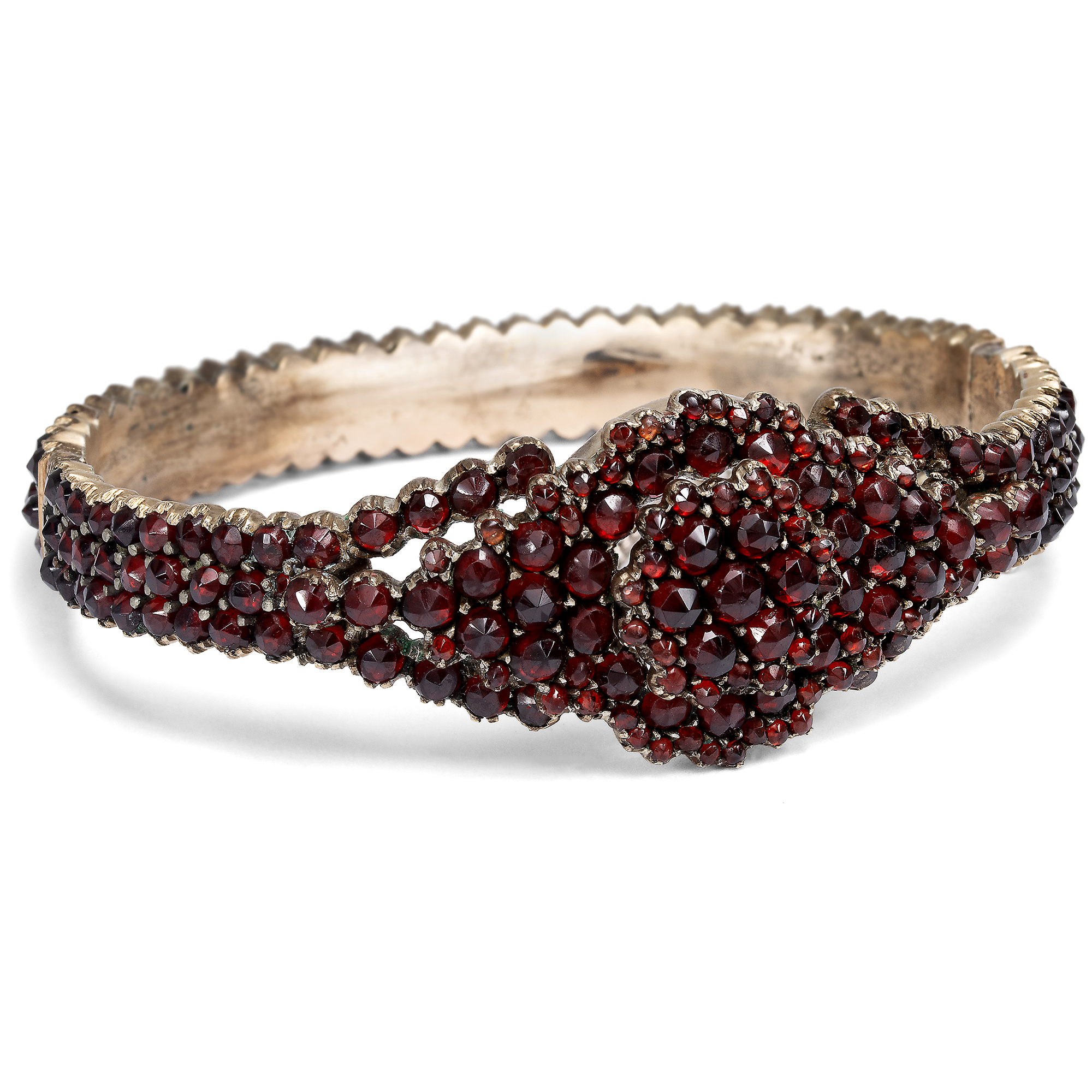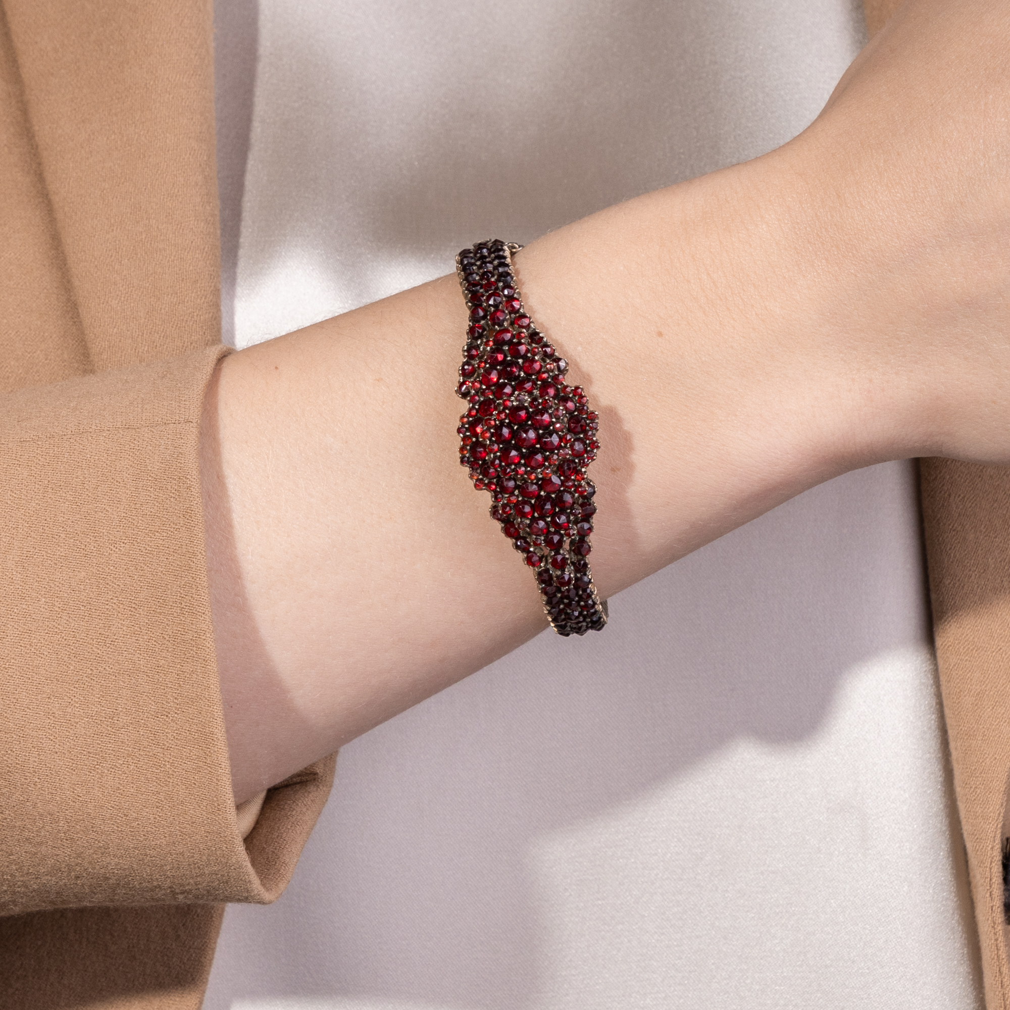 Seit Jahrhunderten schon werden die verführerisch rotglühenden Granate zu Schmuck ganz unterschiedlicher Art verarbeitet. Die Form des Granatschmucks, die wir heute am ehesten mit diesem Stein verbinden – Sterne, Blüten und andere Formen, dicht an dicht besetzt mit unzähligen Granaten – entwickelte sich Mitte des 19. Jahrhunderts und wurde schnell zum Publikumsliebling. Der hier vorliegende Granatarmreif des ausgehenden 19. Jahrhunderts ist ein typisches Beispiel dieser Art Granatschmuck. Die Oberfläche des Reifs ist vollständig mit funkelnden, tiefroten Granaten besetzt. Zur Oberseite hin weitet sich der Entwurf und trägt ein zweistufiges, rautenförmiges Zierelement. Die Steine stammen aus den klassischen Fundgebieten Böhmens und zeichnen sich durch ihre außergewöhnlich satte, warme Farbintensität aus. Zeittypisch sind die Steine in Tombak gefasst, das sich auf der Schauseite vollkommen zurücknimmt. Da die Granate auf kleine Folien aus Silber gesetzt sind, reflektieren die Steine das einfallende Licht in besonders intensiver Weise. Nichts lenkt von den Edelsteinen ab, und so entsteht ein prachtvolles Band aus roten Reflexen. Zu uns kam der Reif hier in Berlin.