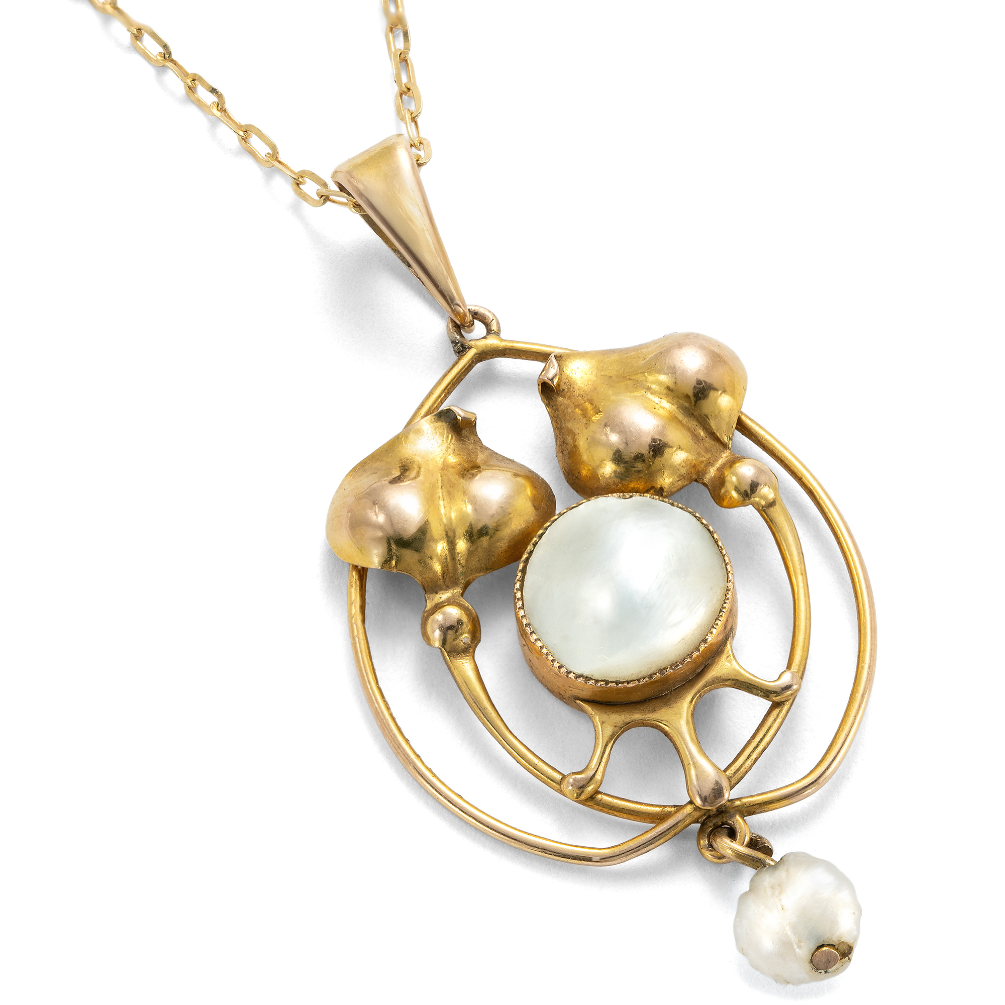 Wie jedes Land zeigte auch Großbritannien in den Jahren um 1900 seine eigene Ausprägung des Jugendstil, die Strömung der Arts & Crafts. Wie die Präraffaeliten in der Malerei, so wollten sich wenig später auch die Kunsthandwerker des viktorianischen Englands von den stetig wiederholten Motiven und Ornamenten der letzten Jahrzehnte abwenden und diese durch Innovation überwinden. Im Gegensatz beispielsweise zu französischen Jugendstil-Entwürfen der Zeit zeichneten sich die Kreationen der Arts & Crafts durch vereinfachte, abstrahierte Formen aus. Da viele moderne Entwürfe vom Kaufhaus Liberty vertrieben wurden, spricht man auch vom „Liberty Style“. Einer der wichtigsten Entwerfer war Archibald Knox, an dessen Entwürfe auch dieser Anhänger stark erinnert. Insbesondere die beiden Blätter am oberen Ende des Entwurfs nutzte Knox häufig; im englischen Sprachraum wird das Motiv „stylised honesty“ genannt, das stilisierte herzförmige Blatt des Ausdauernden Silberblattes (Lunaria rediviva). Eine schimmernde Perlschale und eine kleine Naturperle von barocker Form runden den Entwurf ab. Wir konnten das schöne Schmuckstück in London entdecken und haben es um eine zarte Goldkette ergänzt.