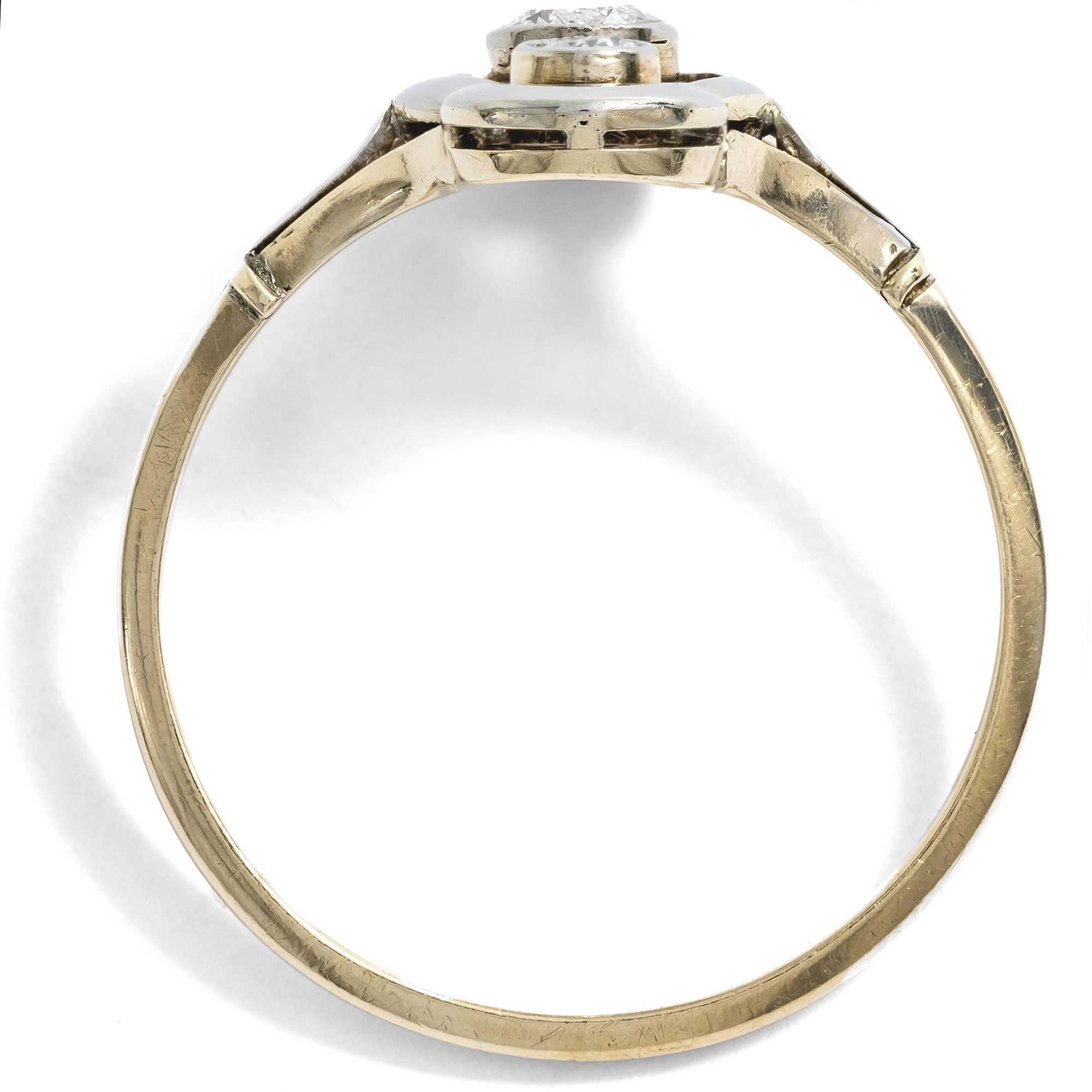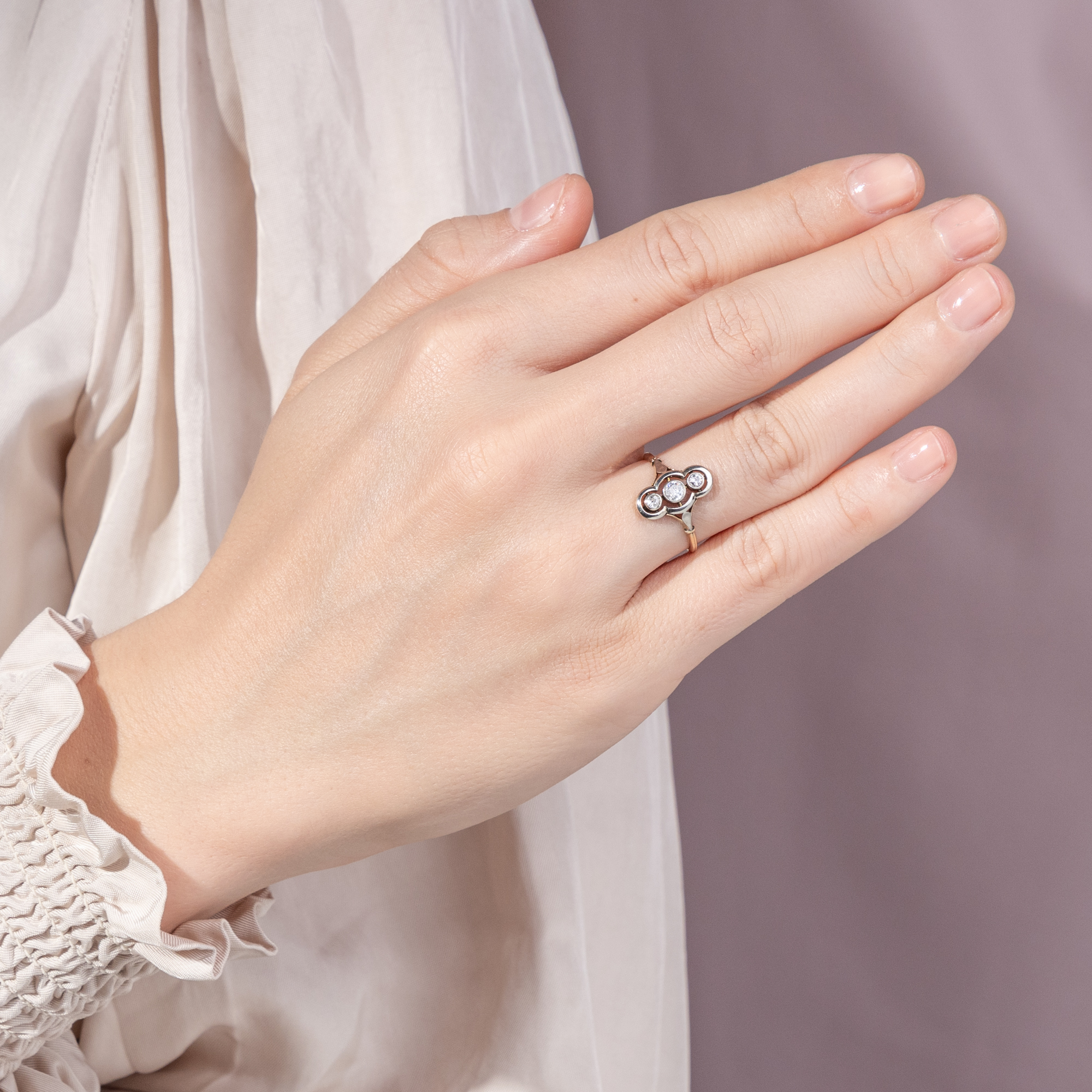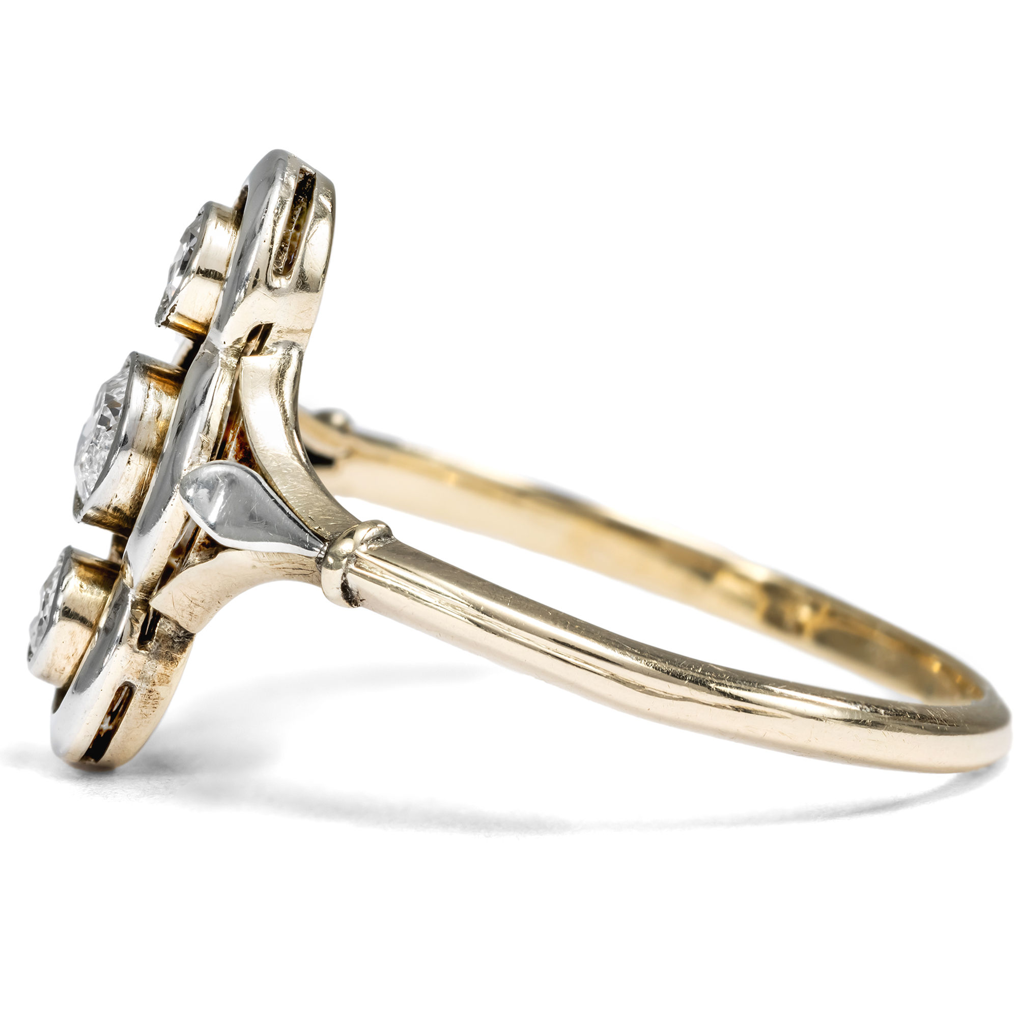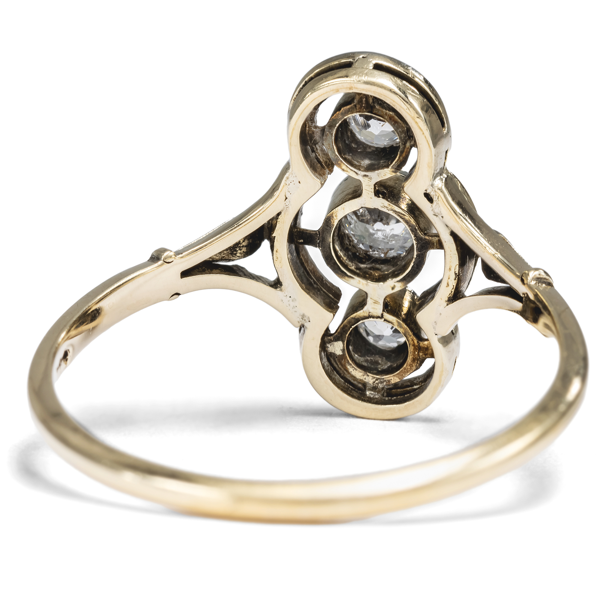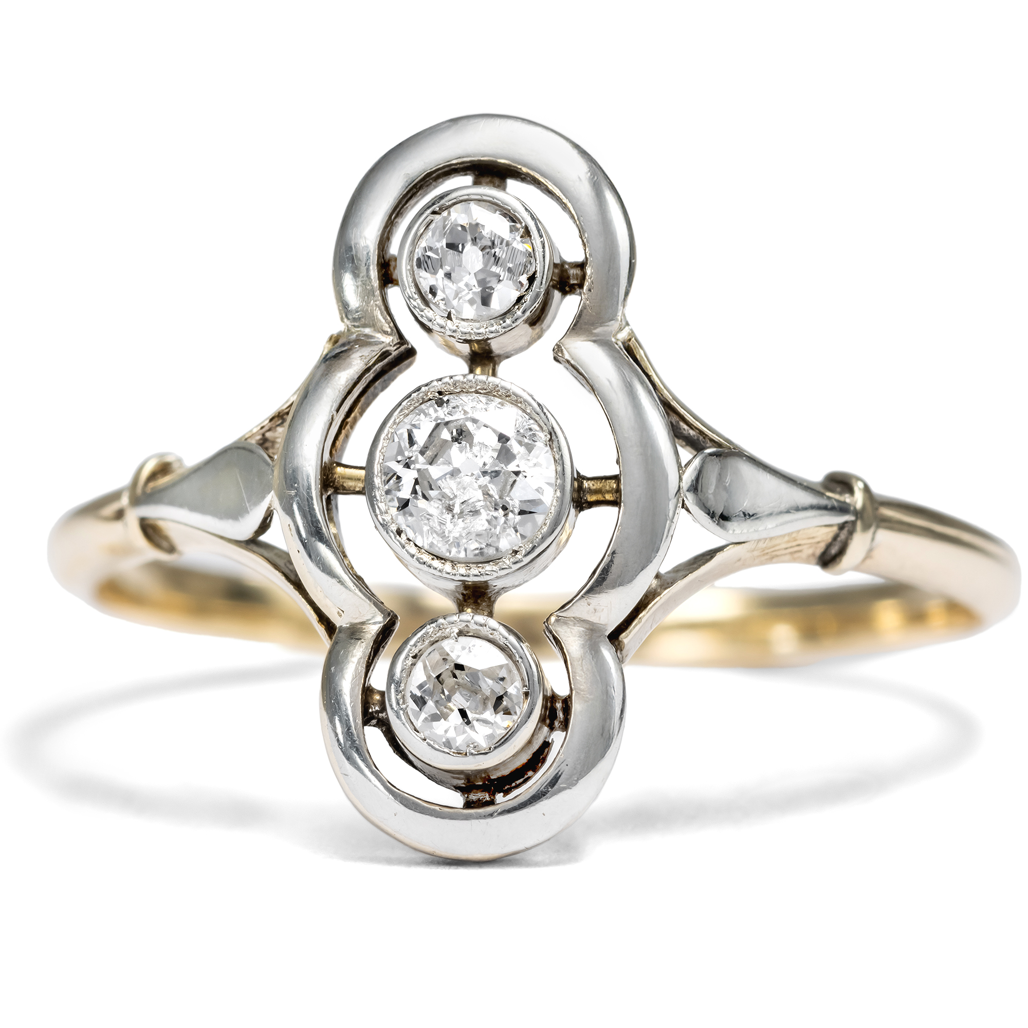 Ringe wie dieser wurden zu Beginn des 20. Jahrhunderts auch Dinner Ring genannt, da die Dame zum Dinner ihre Handschuhe auszog und die reich geschmückten Hände präsentieren konnte. Im erst recht kürzlich eingeführten elektrischen Licht konnten Diamanten und Edelsteine blitzen wie niemals zuvor, und neue Verarbeitungstechniken erlaubten es, sie in feines Platin zu fassen. Im Falle des vorliegenden Rings sind es drei Altschliff-Brillanten, die längs zum Finger angeordnet den Entwurf dominieren. Die Edelsteine werden von millegriffesverzierten Zargen gehalten und scheinen in ihren Schattenfugen zu schweben. Um sie herum läuft eine polierte Rahmung. Der Ringkopf ist mit einer Decke aus hellem Platin belegt, das besonders schön mit dem schimmernden Besatz harmoniert, während Unterbau und seine zarte Schiene hingegen aus 14-karätigem Gelbgold geschmiedet sind. Der um 1910 in Deutschland entstandene Ring ist ein Schmuckstück der späten Belle Époque, das bis heute die Eleganz jener Epoche transportiert. Zu uns kam der Ring aus München.