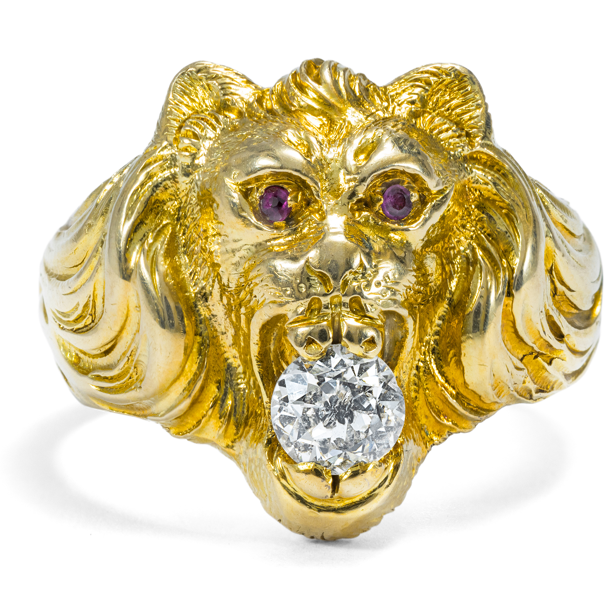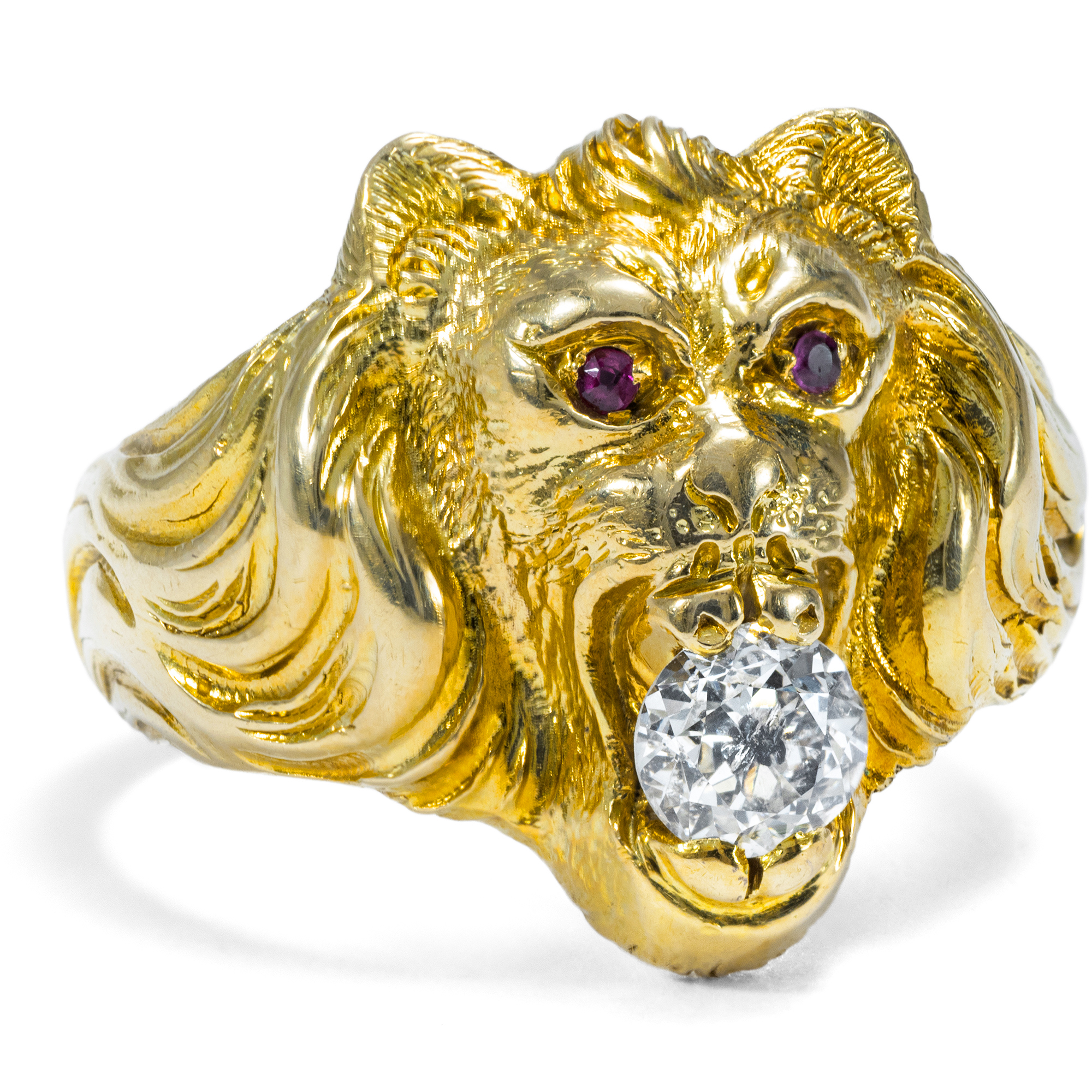 Schmuck mit der Darstellung von Löwen ziert und beschützt die Menschen schon seit vielen tausend Jahren. Bereits die frühesten Kulturen schufen sich Schmuck mit dem Abbild des Königs der Tiere: Seine Anwesenheit am Körper sollte behüten und gleichzeitig Kraft geben, im alten Ägypten ebenso wie in Griechenland, in Asien wie im europäischen Mittelalter. Der hier vorliegende Ring aus Gold nutzt dieses alte Motiv und setzt es in wunderbarer Weise um. Wir sehen einen Löwen in frontaler Ansicht mit Augen aus Rubin. Sein Maul hält einen großen Diamanten im Altschliff von etwa 0,45 ct Gewicht. Es scheint beinahe, als würde der König der Edelsteine selbst dem Löwen eine gewisse Form der Verehrung abnötigen. Der Ring kam hier in Berlin zu uns. Er ist in den Jahren um 1900 ursprünglich als Herrenring entstanden. Vgl. mit vielen schönen Beispielen von Ringen mit dem Löwenmotiv u.a. Diana Scarisbrick: Rings. Jewelry of Power, Love and Loyality, London 2007, S. 51-54.