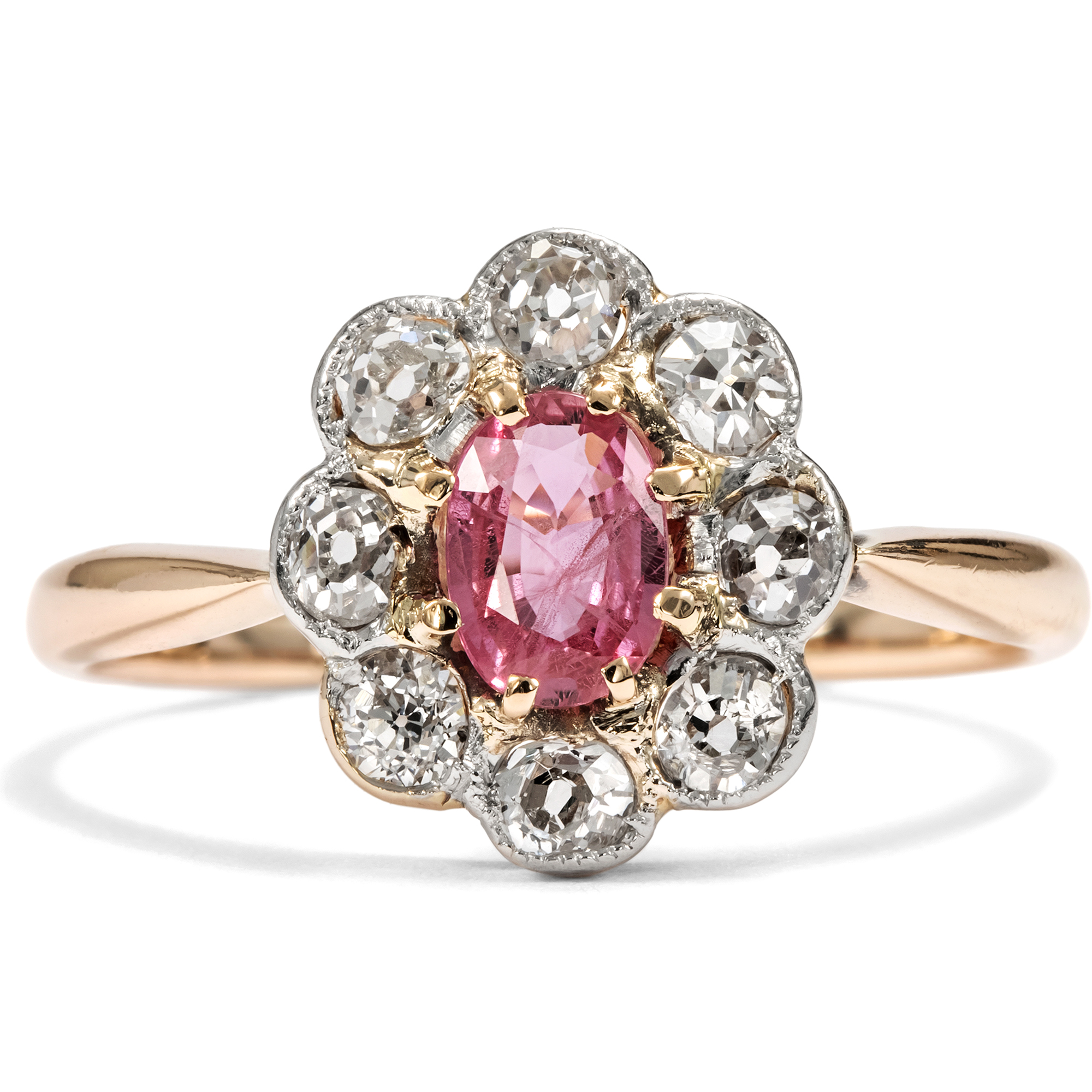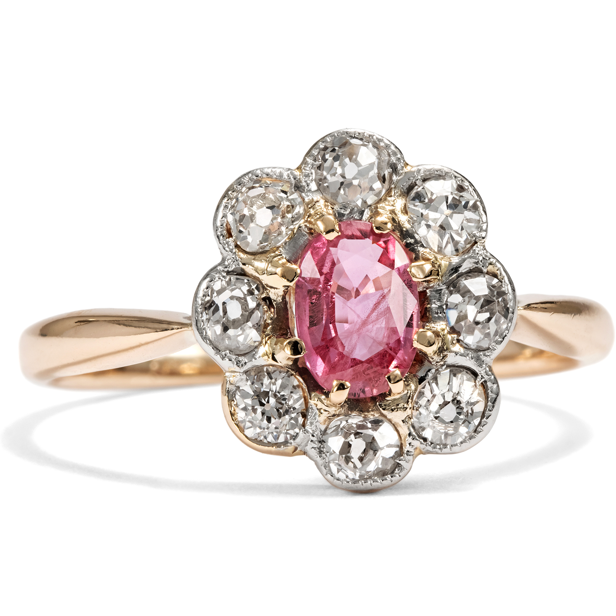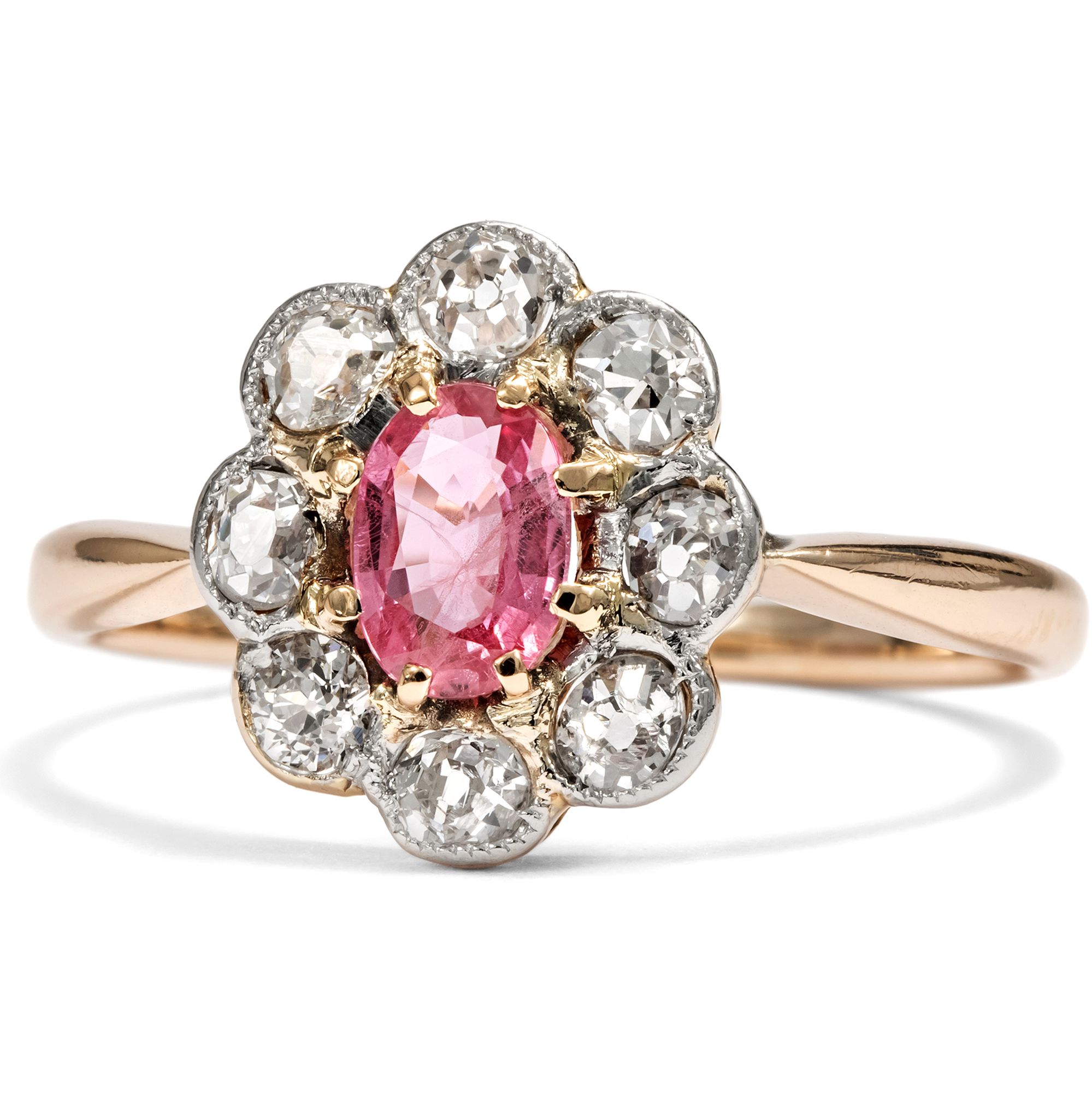 Wenn man an Saphire denkt, hat man zunächst blaue Edelsteine im Sinn. Doch ist die Farbpalette, die echte Saphire zu bieten haben, weitaus größer: Je nach Lagerstätte und den bei der Entstehung der Steine beteiligten Elementen können Saphire in beinahe allen Farben des Regenbogens vorkommen. Acht weiße Altschliffbrillanten umgeben hier einen Saphir in ausgesprochen seltener Farbe. Es handelt sich bei dem oval facettierten Edelstein um einen sogenannten „Padparadscha“. Padparadschas wurden hauptsächlich auf der Insel Sri Lanka gefunden. Der Name für diese Varietät des Saphirs leitet sich von der singhalesischen Bezeichnung für Lotusblüte ab und bezeichnet Steine, die in ihrer Farbe den Blüten dieser seltenen Blumen gleichen. Sie lässt sich als eine Mischung aus Orange und Pink beschreiben und wird manchmal mit dem warmen Funkeln eines Sonnenuntergangs verglichen. Der Saphir im hier vorliegenden Ring ist kräftig rosa mit leichtem Einschlag ins Pfirsichfarbene. Wir haben ihn in den antiken Ring einfassen lassen, der seinen originalen Mittelstein verloren hatte. Der Saphir wird begleitet von einem unabhängigen Gutachten aus Kanada. Der strahlend schöne Saphir und die Diamanten sind alle à jour gefasst und können so ihr harmonisches Farbspiel voll entfalten. Eine schlichte Schiene aus Roségold vervollständigt das schöne Schmuckstück der Belle Époque, das wir in Paris entdeckt und mit nach Berlin gebracht haben.