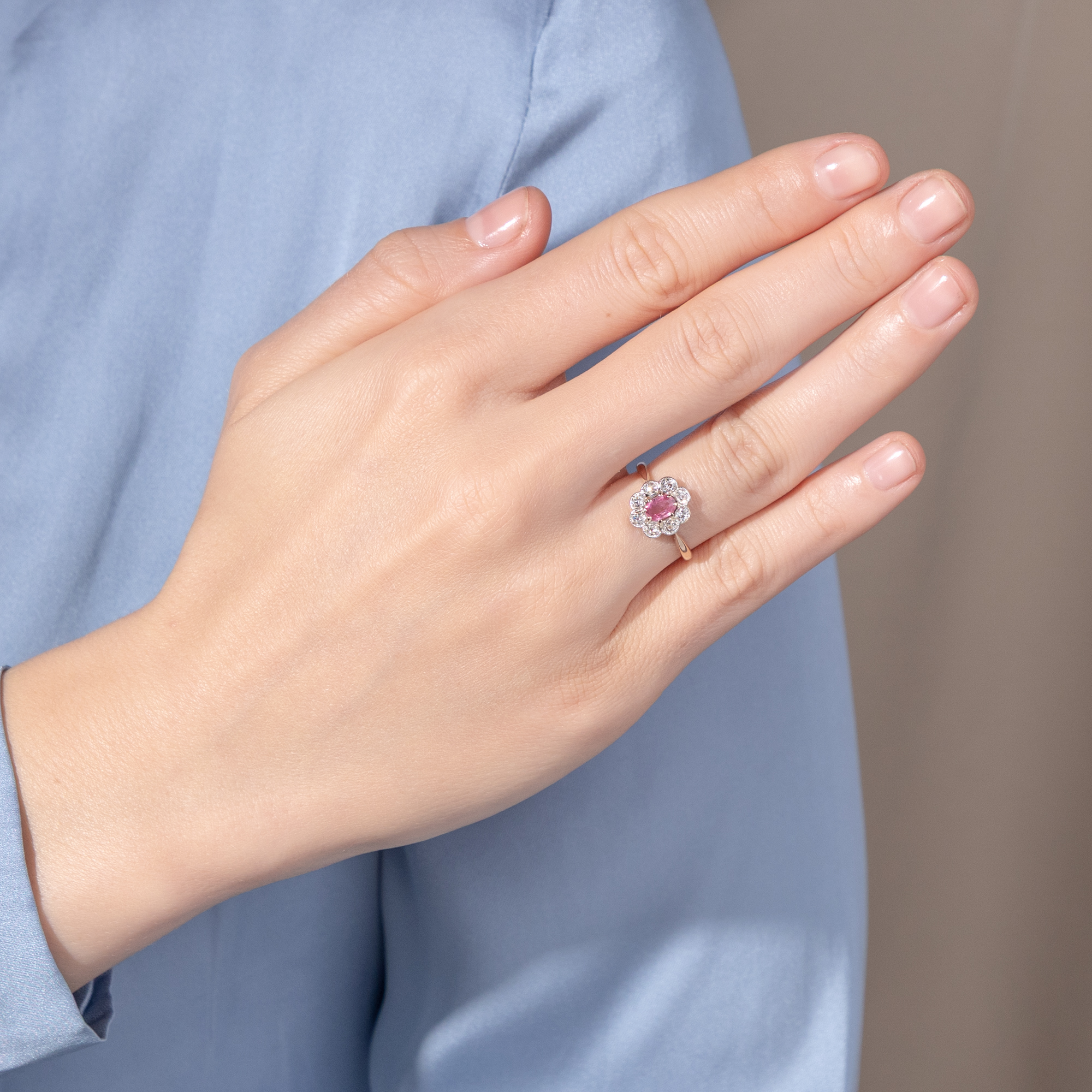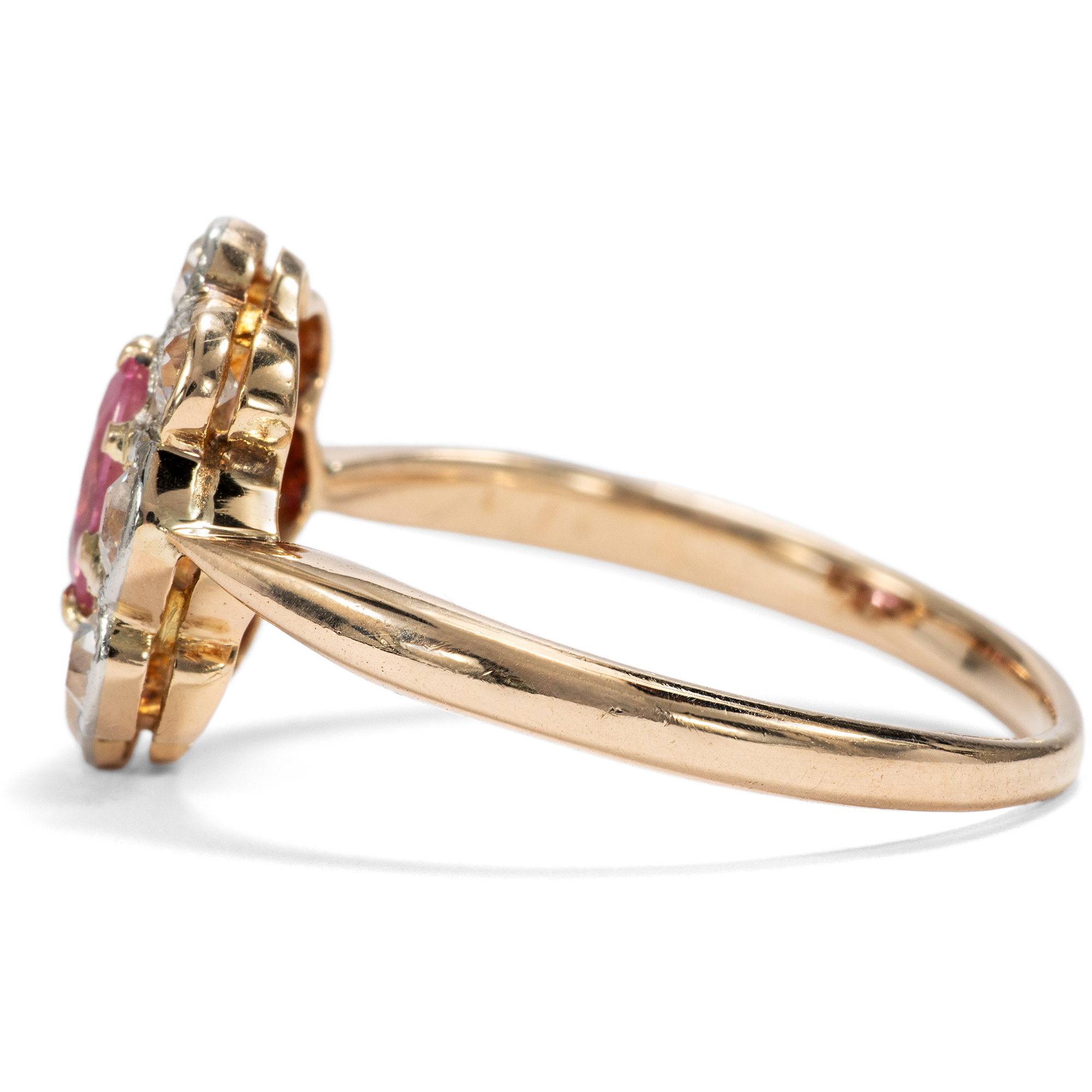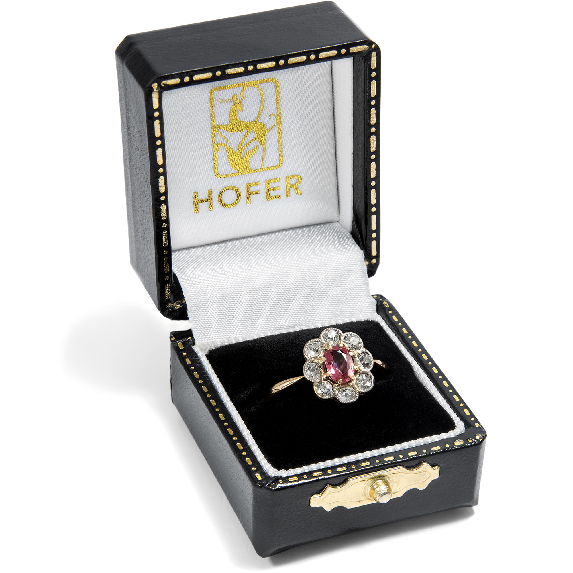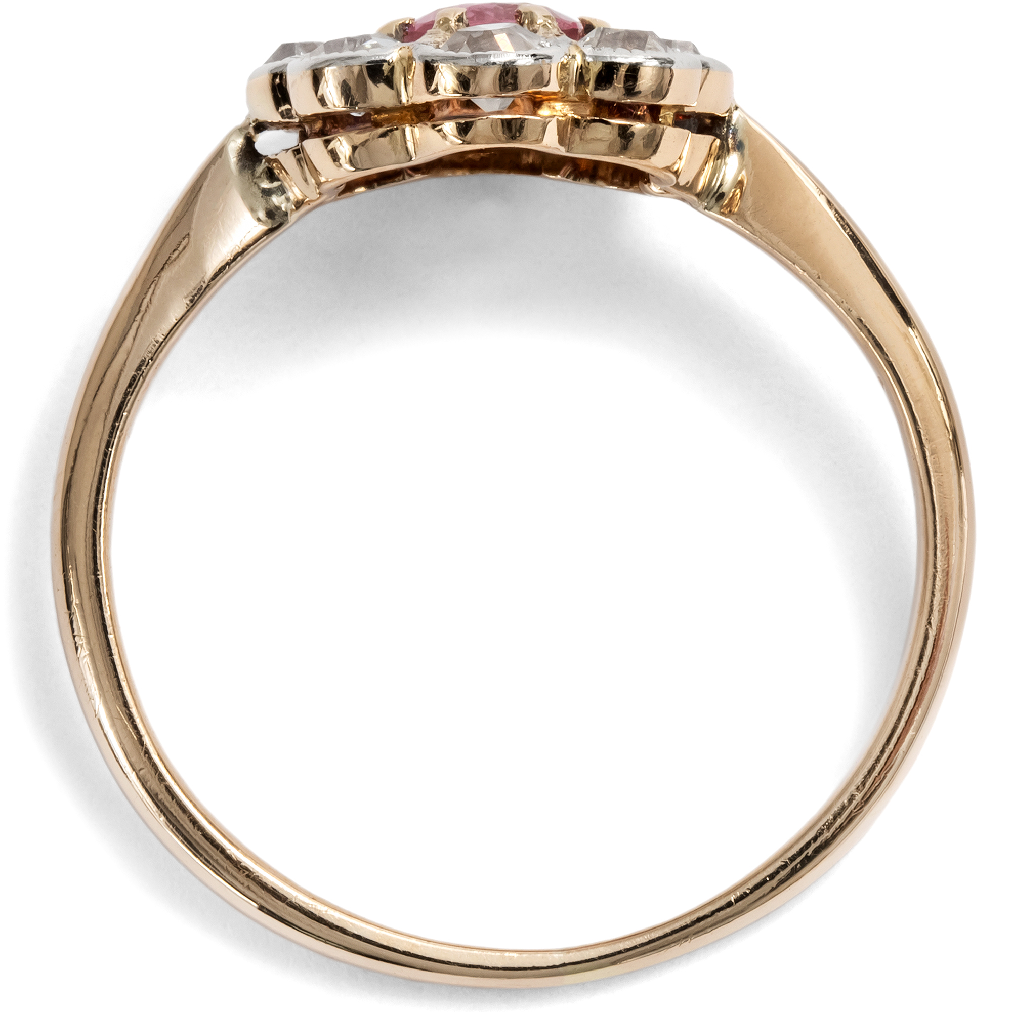 Wenn man an Saphire denkt, hat man zunächst blaue Edelsteine im Sinn. Doch ist die Farbpalette, die echte Saphire zu bieten haben, weitaus größer: Je nach Lagerstätte und den bei der Entstehung der Steine beteiligten Elementen können Saphire in beinahe allen Farben des Regenbogens vorkommen. Acht weiße Altschliffbrillanten umgeben hier einen Saphir in ausgesprochen seltener Farbe. Es handelt sich bei dem oval facettierten Edelstein um einen sogenannten „Padparadscha“. Padparadschas wurden hauptsächlich auf der Insel Sri Lanka gefunden. Der Name für diese Varietät des Saphirs leitet sich von der singhalesischen Bezeichnung für Lotusblüte ab und bezeichnet Steine, die in ihrer Farbe den Blüten dieser seltenen Blumen gleichen. Sie lässt sich als eine Mischung aus Orange und Pink beschreiben und wird manchmal mit dem warmen Funkeln eines Sonnenuntergangs verglichen. Der Saphir im hier vorliegenden Ring ist kräftig rosa mit leichtem Einschlag ins Pfirsichfarbene. Wir haben ihn in den antiken Ring einfassen lassen, der seinen originalen Mittelstein verloren hatte. Der Saphir wird begleitet von einem unabhängigen Gutachten aus Kanada. Der strahlend schöne Saphir und die Diamanten sind alle à jour gefasst und können so ihr harmonisches Farbspiel voll entfalten. Eine schlichte Schiene aus Roségold vervollständigt das schöne Schmuckstück der Belle Époque, das wir in Paris entdeckt und mit nach Berlin gebracht haben.
