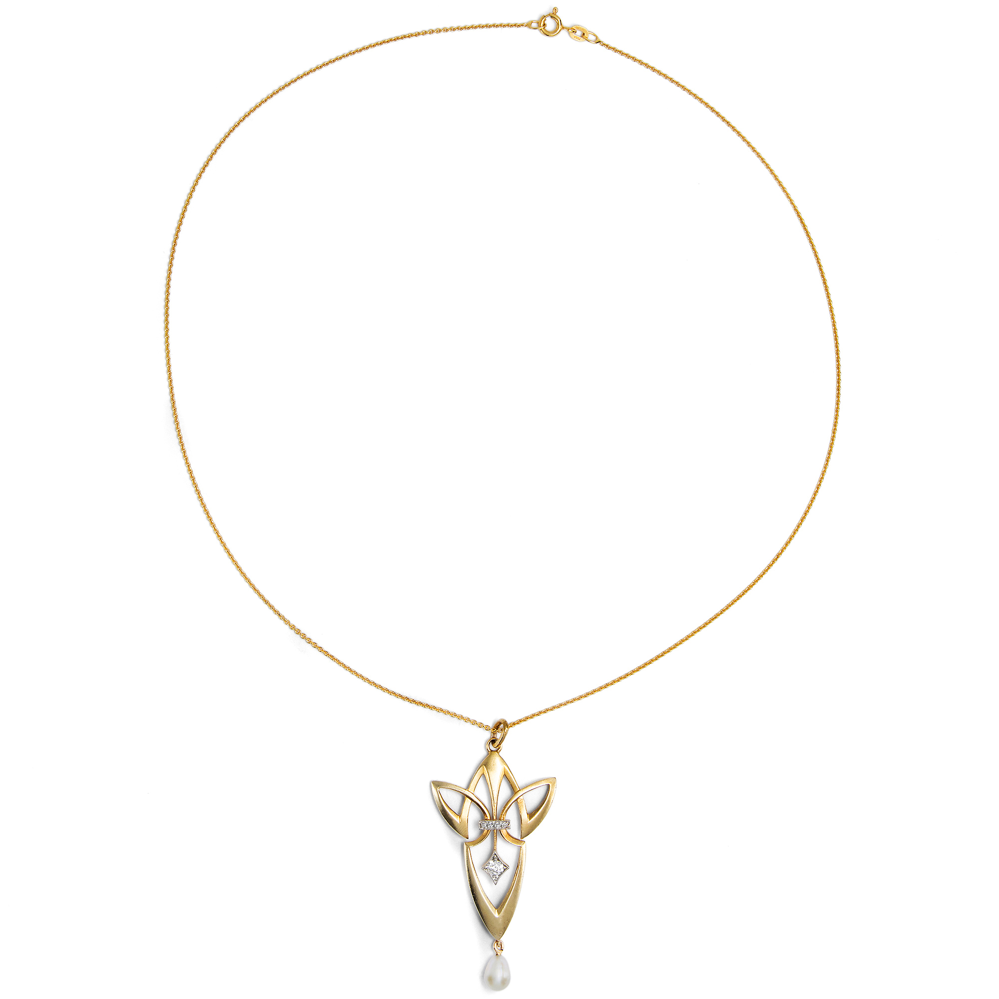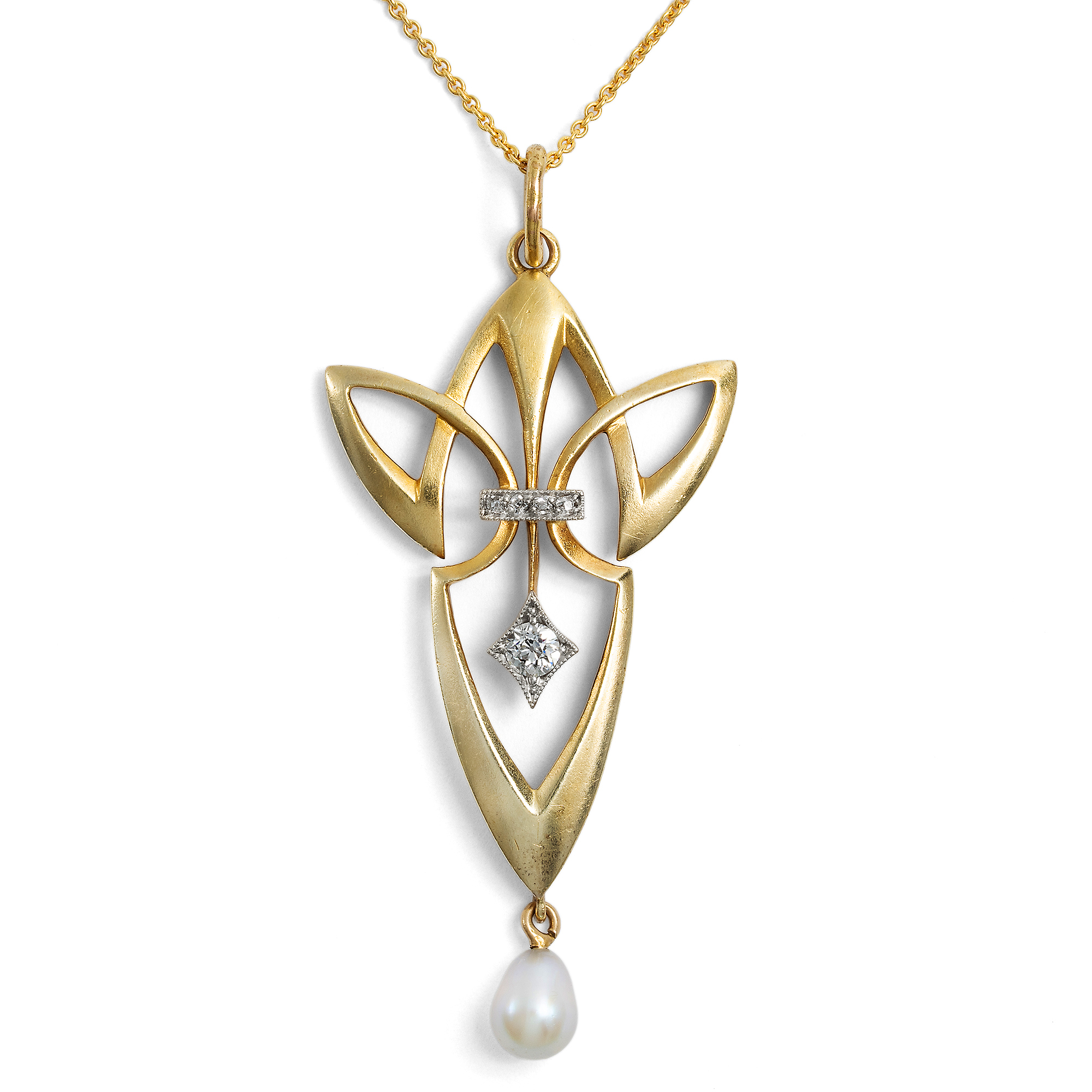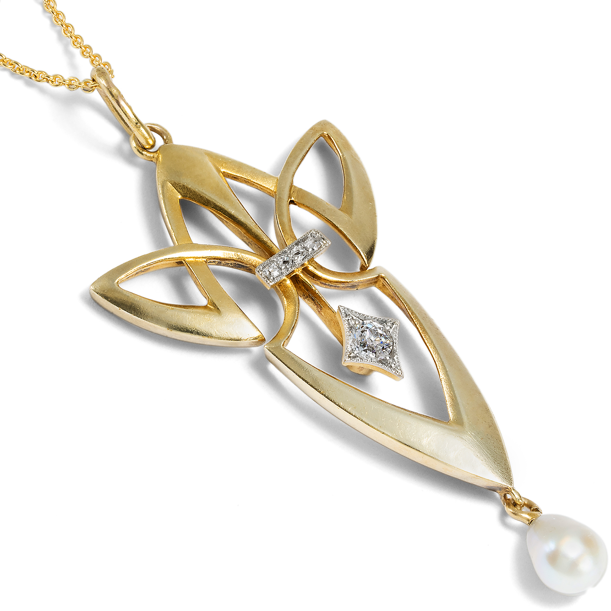 Die zweite Hälfte des 19. Jahrhunderts hatte so einige Veränderung eingeläutet: Die Industrialisierung hatte auch den Schmucksektor ergriffen, neue Edelsteinfunde belebten den Markt, und das Bürgertum erstarkte finanziell. Im Zusammenspiel dieser Faktoren bildete sich auch eine neue Schmuckkultur heraus. Anstelle von Anfertigungen auf Bestellung produzierten Schmuckmanufakturen jährlich neue Kollektionen, brachten sogar Bestellkataloge heraus – denn sie konnten sicher sein, dass die neuen Modelle regen Absatz finden würden. Um 1900 stand diese Entwicklung auf einem vorläufigen Höhepunkt. Im deutschen Pforzheim waren viele Manufakturen ansässig, die moderne, mitunter auch künstlerisch anspruchsvolle Entwürfe anboten. Eine dieser Firmen war Zerrenner, die auf der Pariser Weltausstellung von 1900 – wo Schmuck im Jugendstil erstmals einem breiten Publikum vorgestellt wurde – eine Silbermedaille erhielt. Anders als viele andere Manufakturen produzierte Zerrenner echten Goldschmuck mit Diamanten und Perlen, war also im höherpreisigen Sektor angesiedelt. Auch der künstlerische Anspruch der Entwürfe wurde in zeitgenössischen Fachmagazinen lobend erwähnt. Dieser Anhänger stammt aus der Pforzheimer Firma und veranschaulicht die auf Linien basierende, geometrische Spielart des Jugendstil, wie sie in Deutschland in den Jahren um 1905 langsam die floralen Formen zu verdrängen begann. In der gestalterischen Zurückhaltung des Anhängers entfaltet die moderne Linienführung ihre volle Wirkung. Er ist aus Gold gefertigt, welches durch das sog. Bloom Finish eine samtig-matte Oberfläche erhielt. Eine unten abgehängte Perle ist keine bloße Zier, sondern vervollständigt die Balance der Komposition. Ebenso sind die durch Platin abgehobenen Diamantfassungen geometrisch gestaltet und verleihen dem Entwurf weitere Komplexität. Wir konnten den sehr gut erhaltenen Anhänger hier in Berlin entdecken und haben ihn um eine passende Goldkette vervollständigt.