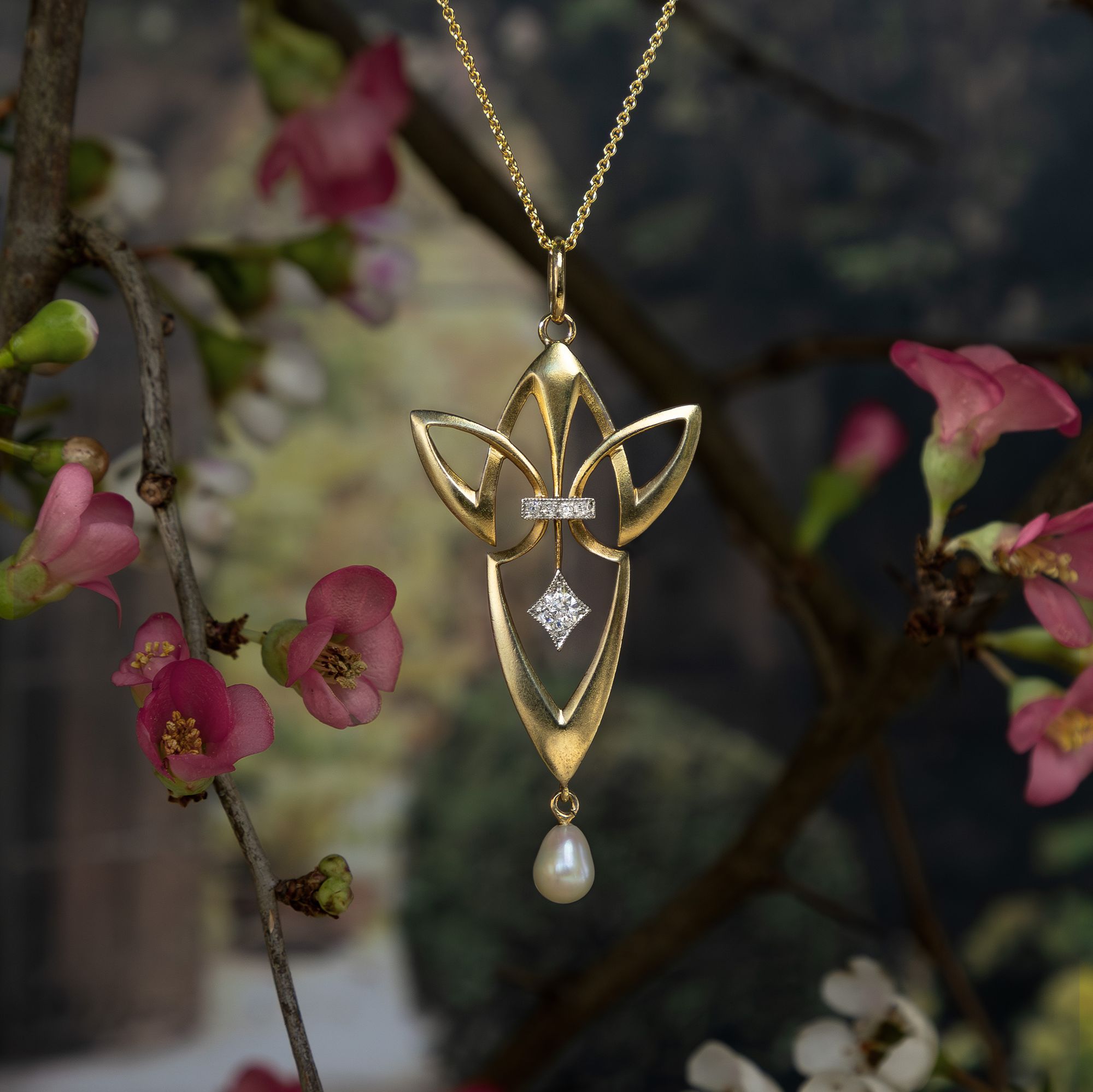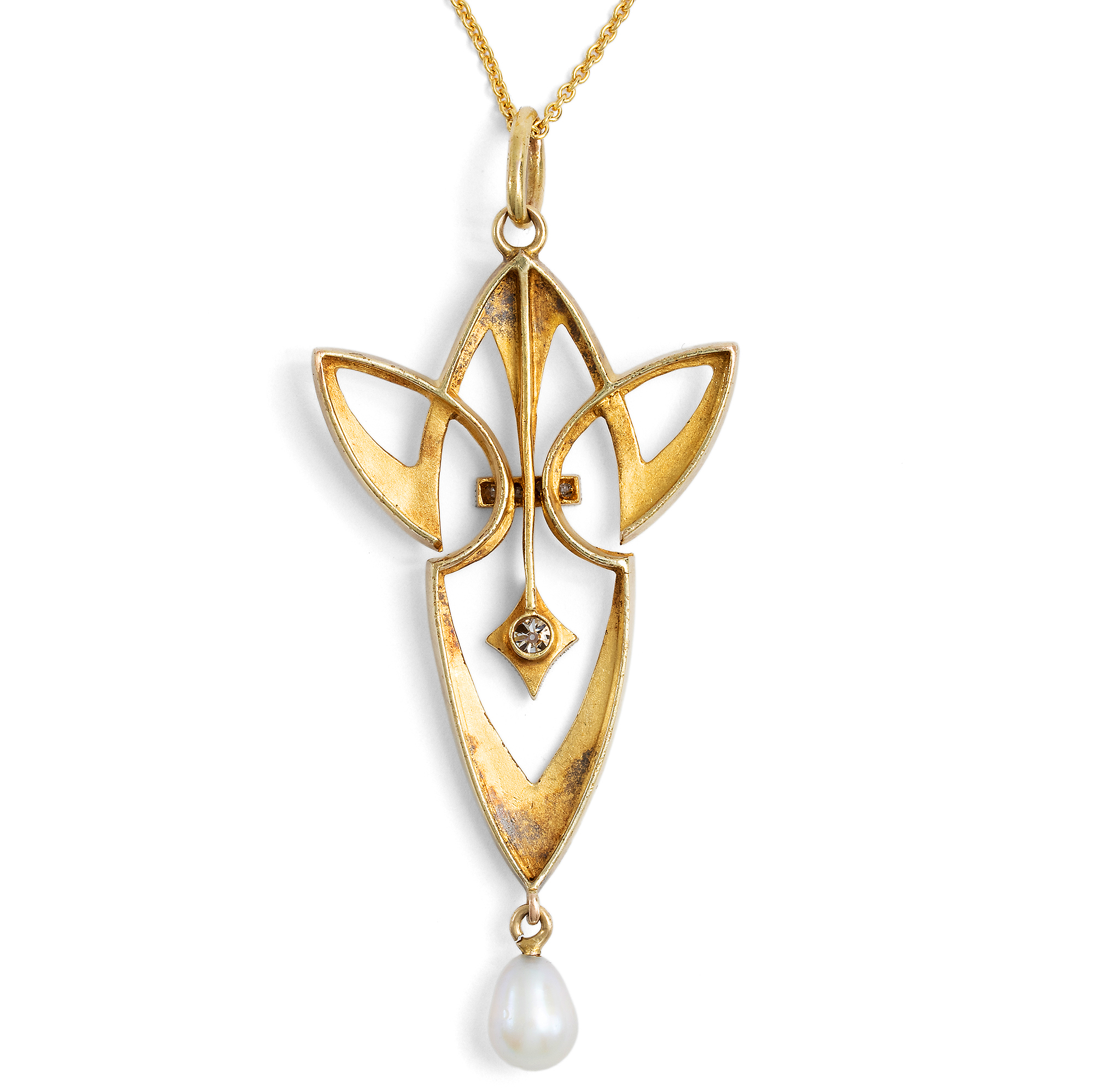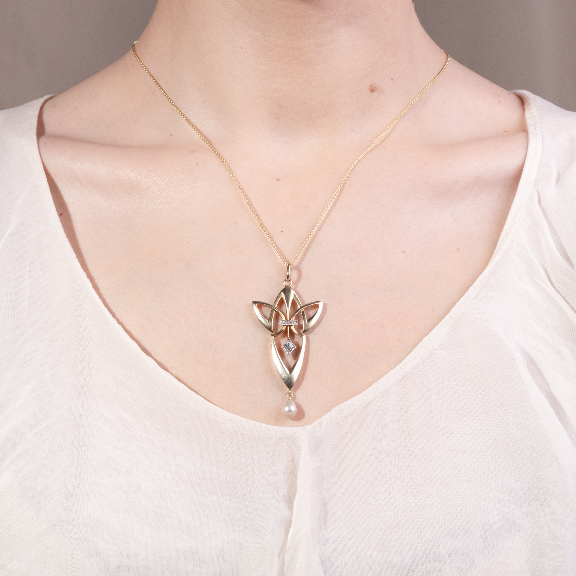 Die zweite Hälfte des 19. Jahrhunderts hatte so einige Veränderung eingeläutet: Die Industrialisierung hatte auch den Schmucksektor ergriffen, neue Edelsteinfunde belebten den Markt, und das Bürgertum erstarkte finanziell. Im Zusammenspiel dieser Faktoren bildete sich auch eine neue Schmuckkultur heraus. Anstelle von Anfertigungen auf Bestellung produzierten Schmuckmanufakturen jährlich neue Kollektionen, brachten sogar Bestellkataloge heraus – denn sie konnten sicher sein, dass die neuen Modelle regen Absatz finden würden. Um 1900 stand diese Entwicklung auf einem vorläufigen Höhepunkt. Im deutschen Pforzheim waren viele Manufakturen ansässig, die moderne, mitunter auch künstlerisch anspruchsvolle Entwürfe anboten. Eine dieser Firmen war Zerrenner, die auf der Pariser Weltausstellung von 1900 – wo Schmuck im Jugendstil erstmals einem breiten Publikum vorgestellt wurde – eine Silbermedaille erhielt. Anders als viele andere Manufakturen produzierte Zerrenner echten Goldschmuck mit Diamanten und Perlen, war also im höherpreisigen Sektor angesiedelt. Auch der künstlerische Anspruch der Entwürfe wurde in zeitgenössischen Fachmagazinen lobend erwähnt. Dieser Anhänger stammt aus der Pforzheimer Firma und veranschaulicht die auf Linien basierende, geometrische Spielart des Jugendstil, wie sie in Deutschland in den Jahren um 1905 langsam die floralen Formen zu verdrängen begann. In der gestalterischen Zurückhaltung des Anhängers entfaltet die moderne Linienführung ihre volle Wirkung. Er ist aus Gold gefertigt, welches durch das sog. Bloom Finish eine samtig-matte Oberfläche erhielt. Eine unten abgehängte Perle ist keine bloße Zier, sondern vervollständigt die Balance der Komposition. Ebenso sind die durch Platin abgehobenen Diamantfassungen geometrisch gestaltet und verleihen dem Entwurf weitere Komplexität. Wir konnten den sehr gut erhaltenen Anhänger hier in Berlin entdecken und haben ihn um eine passende Goldkette vervollständigt.