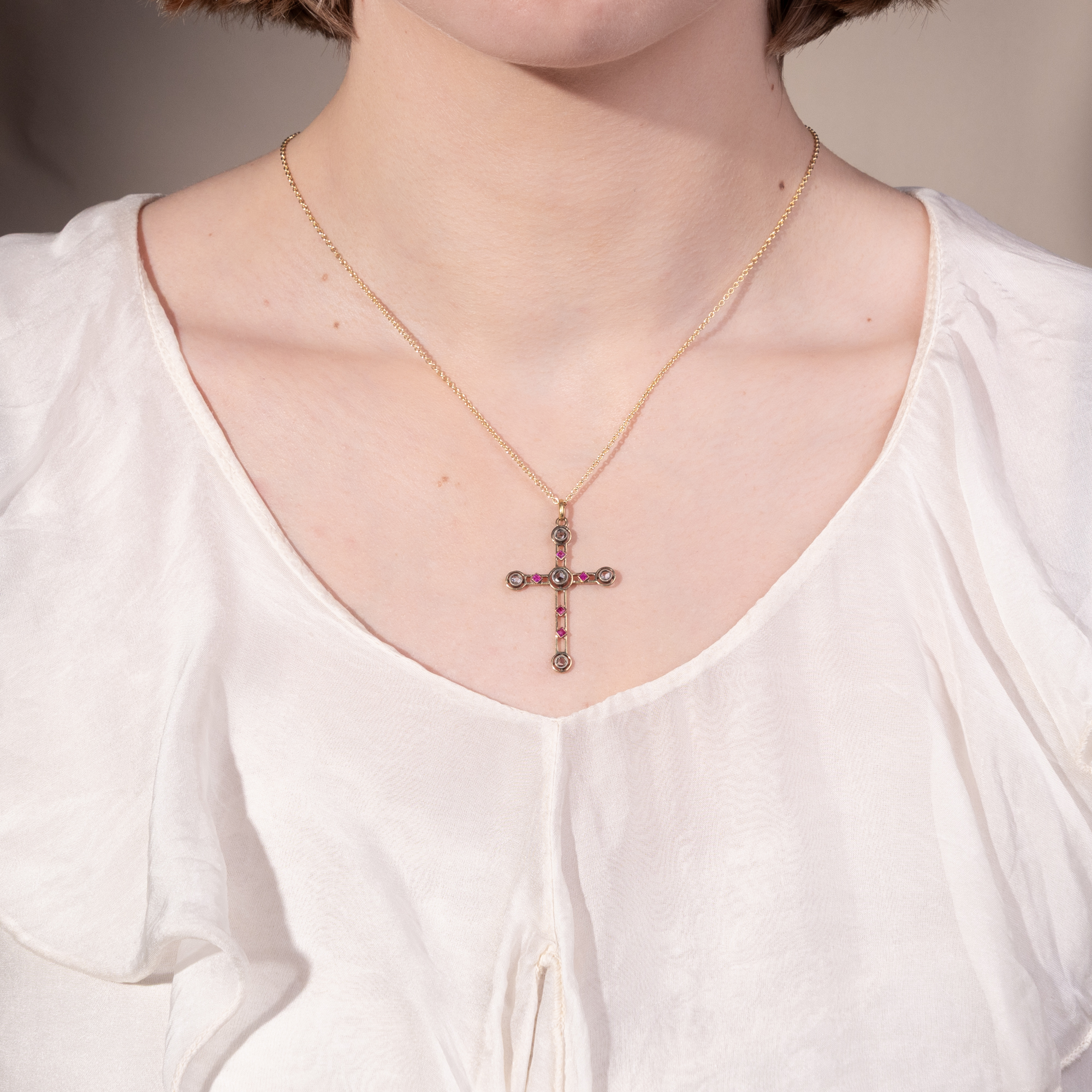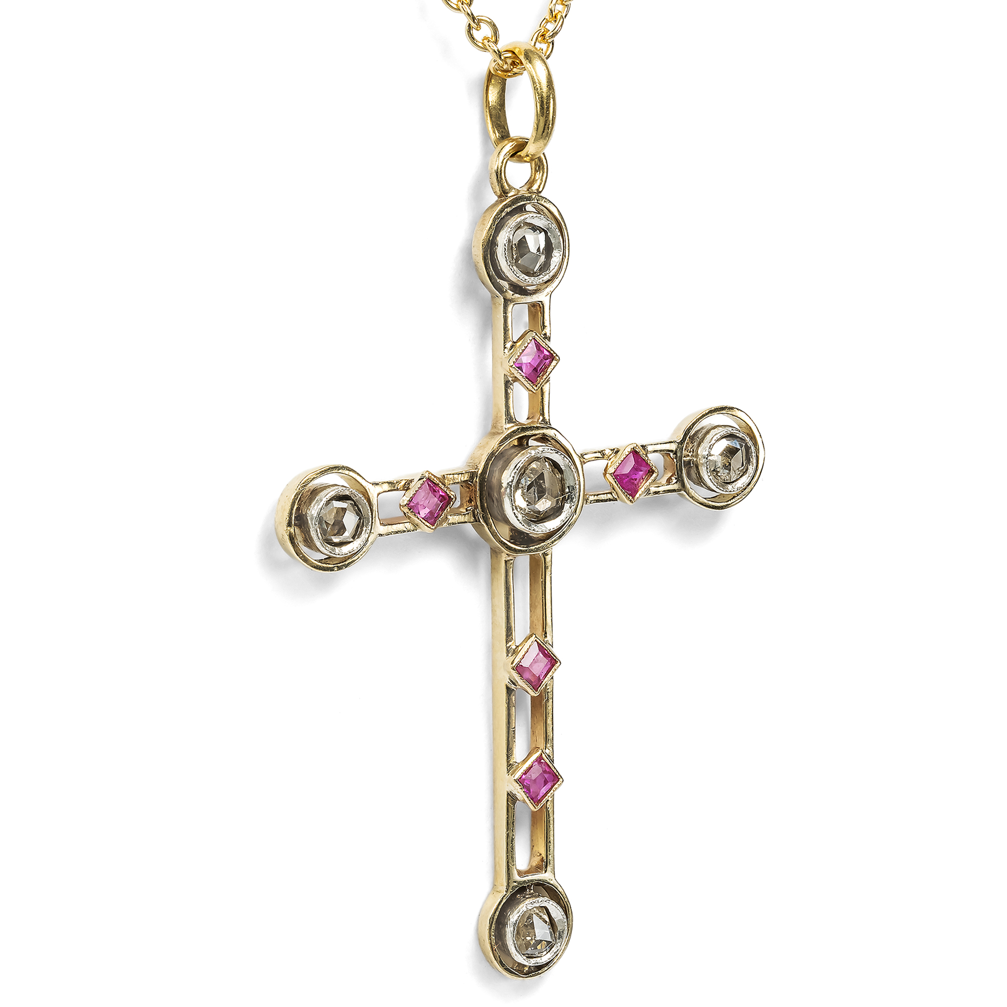 Das Kreuz blieb in der westlichen Schmuckgeschichte als Form eine stete Konstante: Ob als prachtvoll ausgestattetes Exemplar mit Rubinen und Diamanten im Rokoko, von einer Hofdame am Samtband getragen – oder ob in den vielfachen Varianten des bürgerlichen Schmucks des 19. Jahrhunderts. An die wechselnden Geschmäcker angeglichen, war der Kreuz-Anhänger oftmals Bekenntnis zum Glauben und zur Mode zugleich. Selbst im avantgardistischen Art Déco der 1920er Jahre entstanden Exemplare, die dieser graphischen, geometrischen Formensprache huldigten. Das vorliegende Kreuz nun zeigt sich dem Stil der Jahre um 1910 verpflichtet. Die Mode zu Anfang des 20. Jahrhunderts verlangte luftige Entwürfe und so zeigt sich auch unser Schmuckstück in zart durchbrochener Form. Es besteht aus feinen sogenannten Messerstegen aus hochkarätigem Gold, die ein klassisches Lateinerkreuz ausbilden. Rote Rubine besetzen seine Oberfläche, während im Schnittpunkt und an den Enden der Kreuzarme feine Diamantrosen glitzern. Wir haben das kostbare Kreuz um eine feine Goldkette ergänzt. Wir haben es hier in Berlin entdeckt, doch wäre es stilistisch in jeder europäischen Metropole willkommen gewesen. Ein Kreuz, das man sicherlich gern trägt!