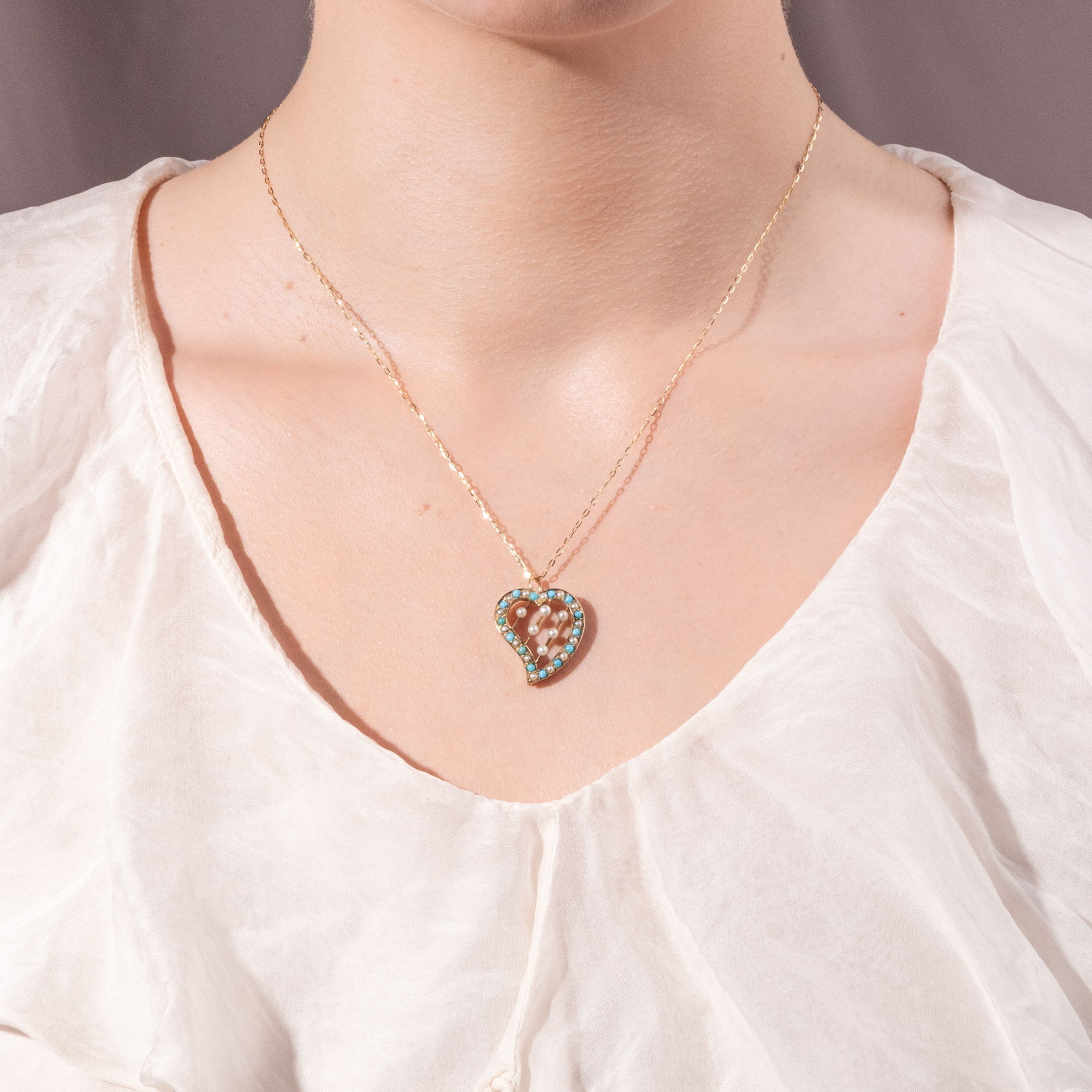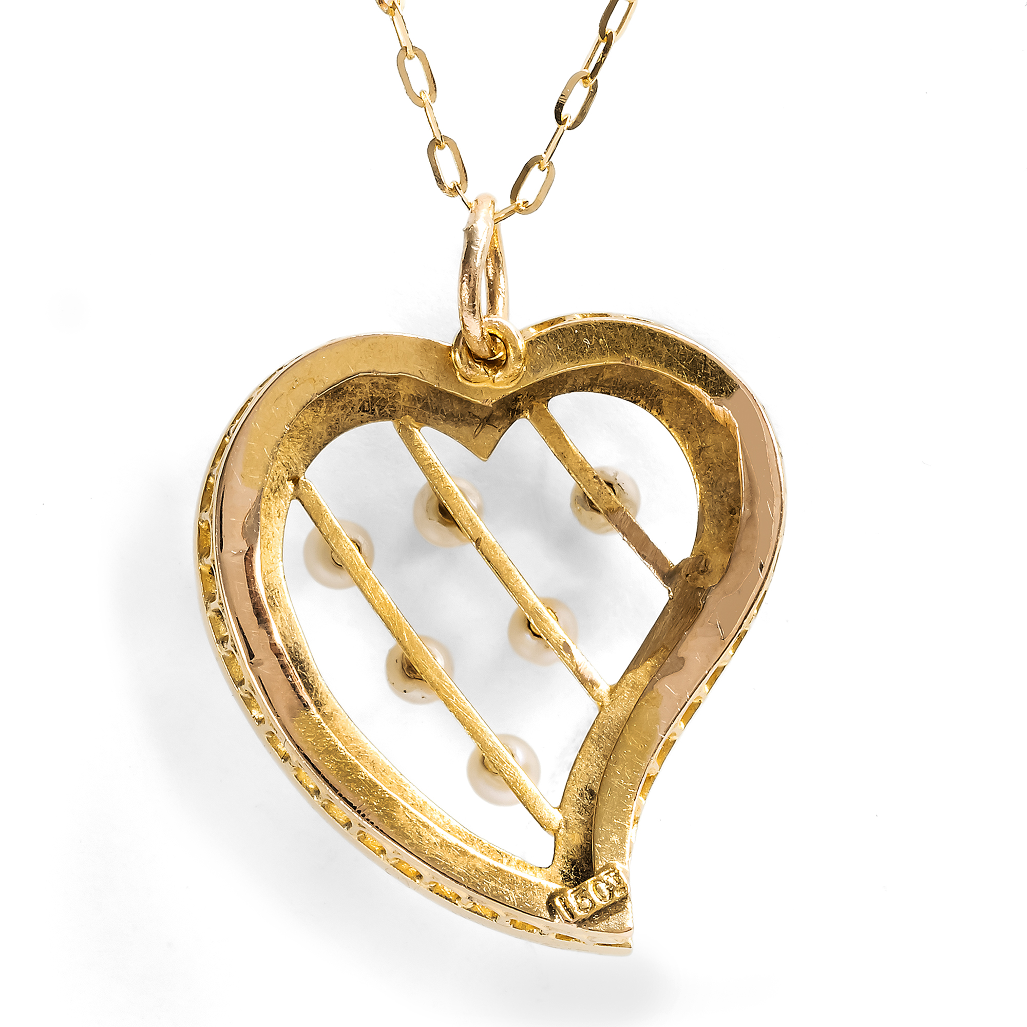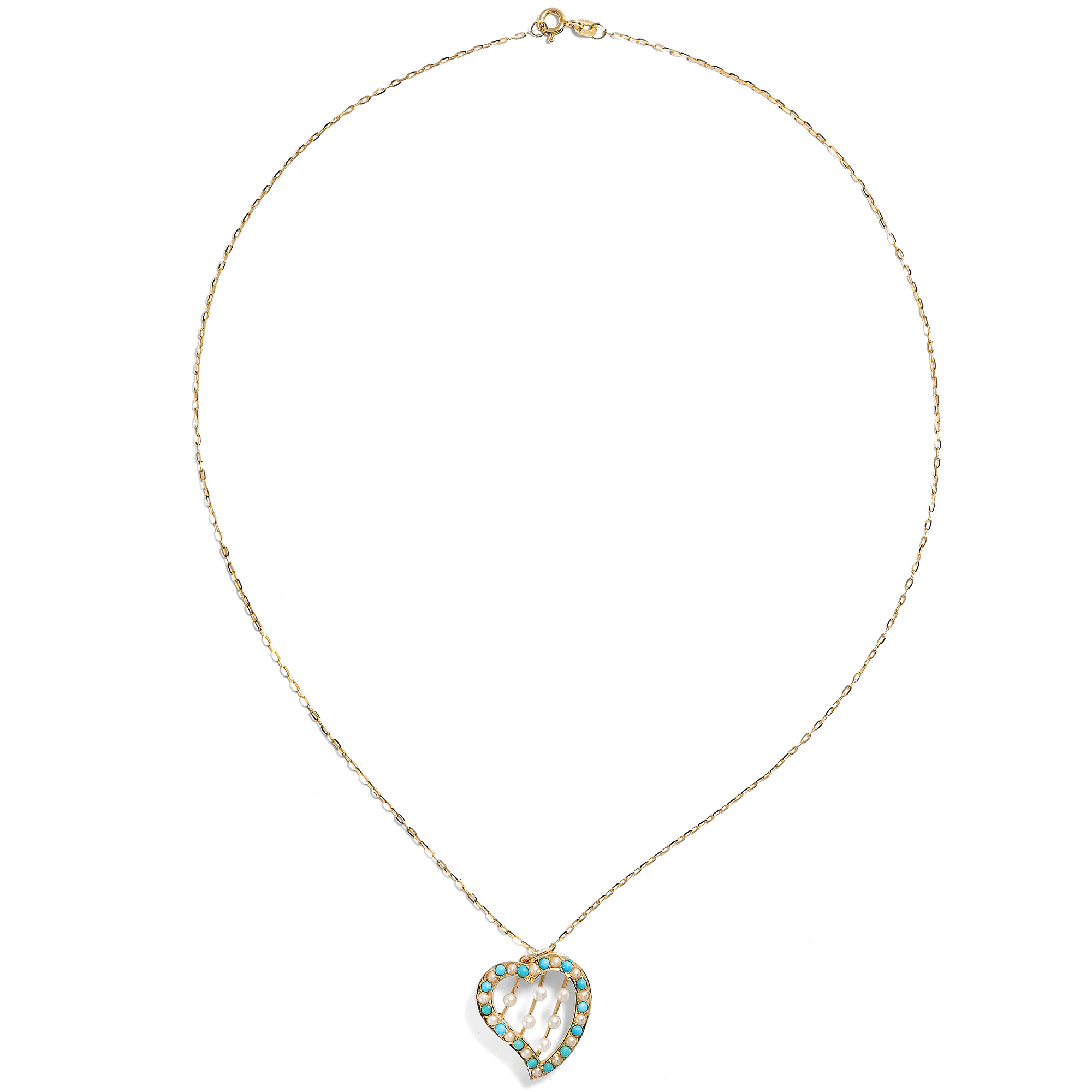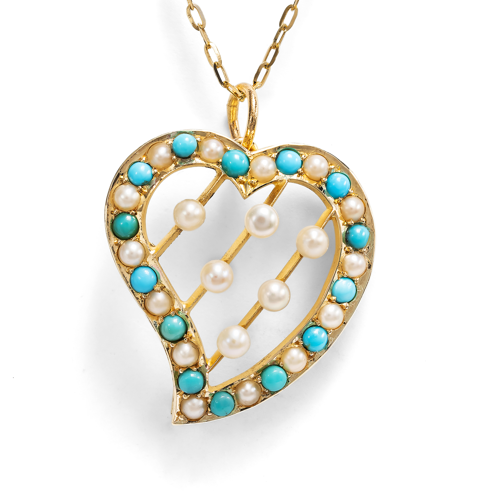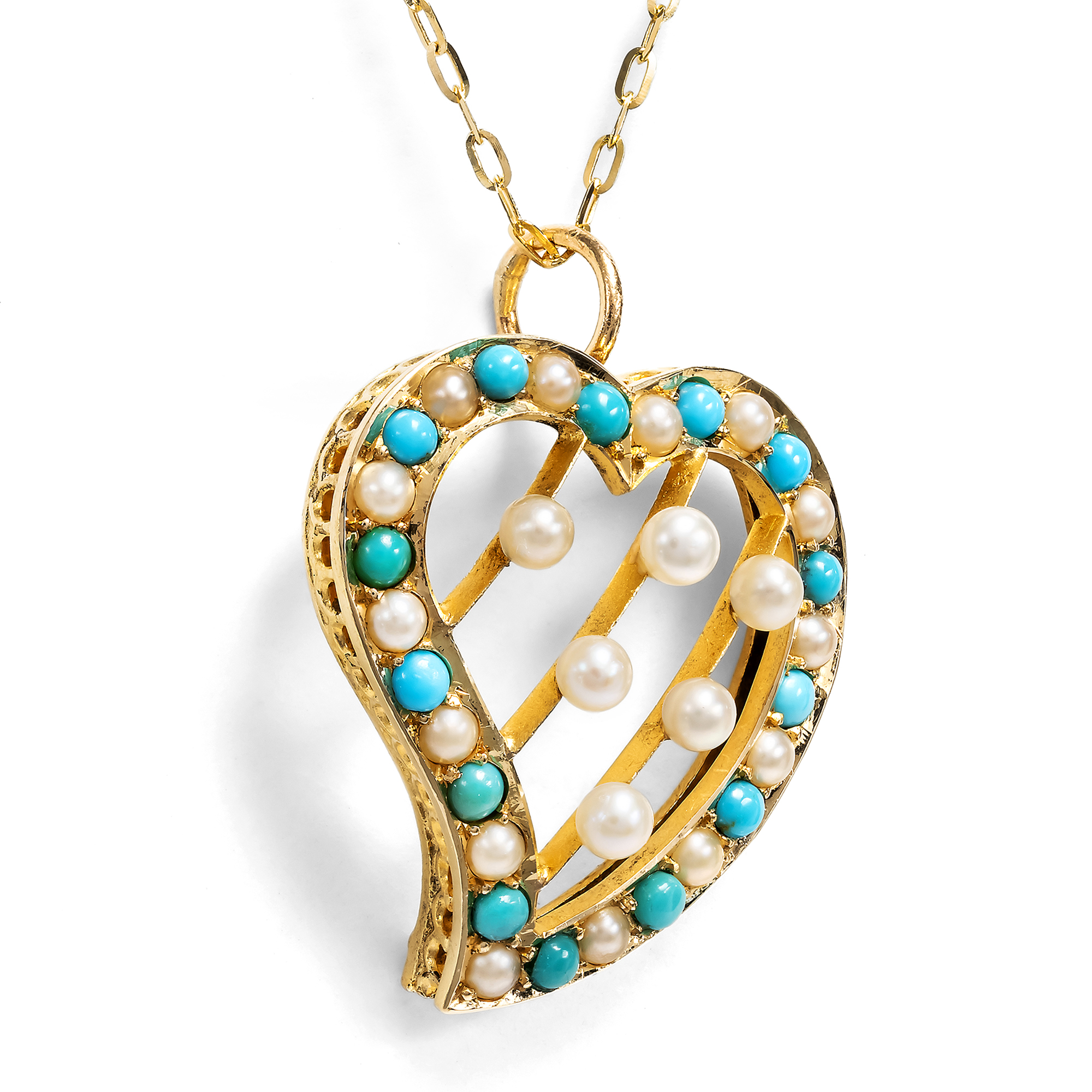 Als Liebesgabe erfreut sich Schmuck schon seit Jahrtausenden hoher Beliebtheit. In allen Gegenden entwickelten sich dabei eigene Schmucktypen und -bedeutungen. Der vorliegende Anhänger zeigt mit dem Herz das wohl offensichtlichste der romantischen Symbole – auf eine traditionelle Art und Weise, die sich von Schottland aus über den Kontinent verbreitete. Das Herz mit seiner zur Seite geschwungenen Spitze ist ein sog. „witch’s heart“, ein Hexenherz, auch „Luckenbooth“ genannt. Diese Herzform wurde im 17. Jahrhundert in Schottland an Babydecken geheftet, um die Kinder vor dem bösen Blick zu schützen. Seit dem 18. Jahrhundert hingegen wird es als Liebesgabe verwendet: Während ein Herz anzeigt, dass die schenkende Person vom Empfänger des Schmuckstücks „verzaubert“ wurde, zeigen zwei Herzen eine romantische Bindung wie eine Verlobung oder Ehe an. Unser Anhänger entstand im späten 19. Jahrhundert in Großbritannien, wie die Stempelung auf der Rückseite beweist. Er ist aus 15-karätigem Gold gefertigt und zeigt einen Besatz aus Türkisen und Perlen. Beide Materialien verstärken die romantische Aussage des Schmuckstücks. Der Türkis nimmt mit seiner himmelblauen Farbe die Symbolik des Vergissmeinnichts an, während die Perle als Sinnbild der Liebesgöttin Venus gilt. Der Anhänger, der aus London zu uns fand, ist sehr gut erhalten. Wir haben ihn um eine passende Goldkette ergänzt, so dass er sofort um den Hals getragen werden kann.