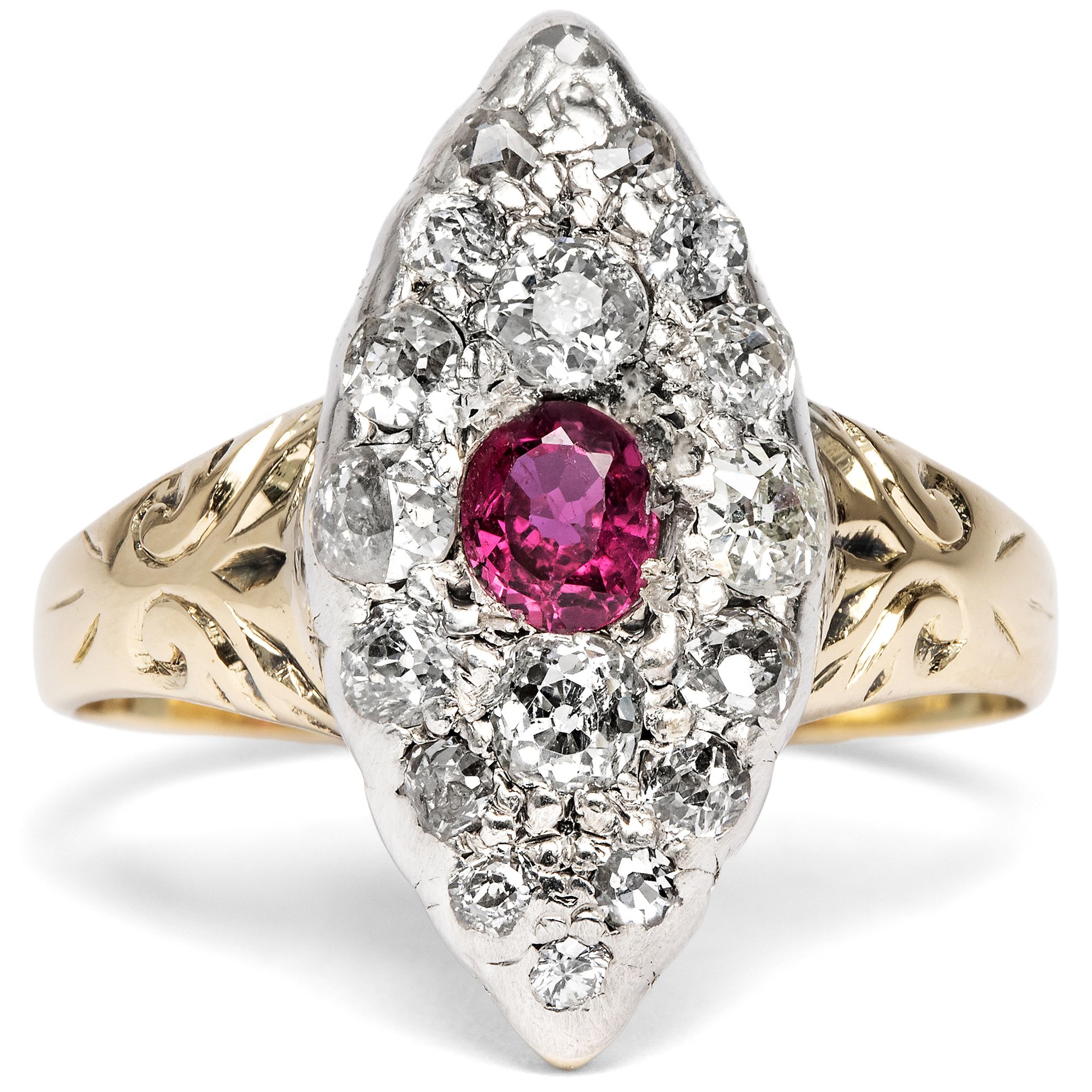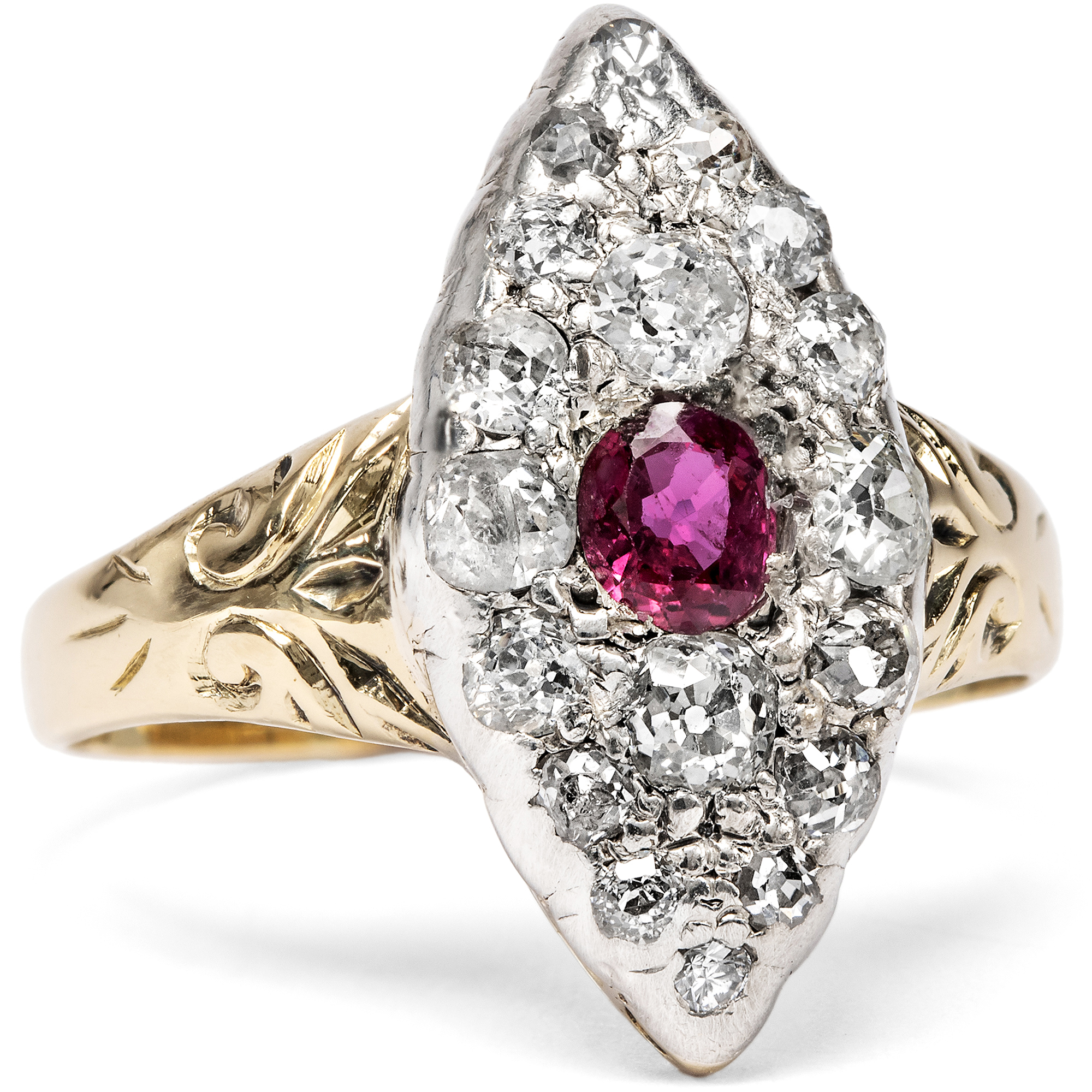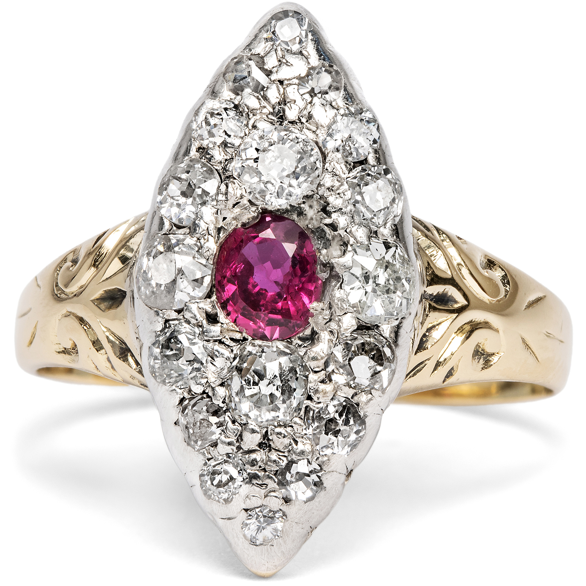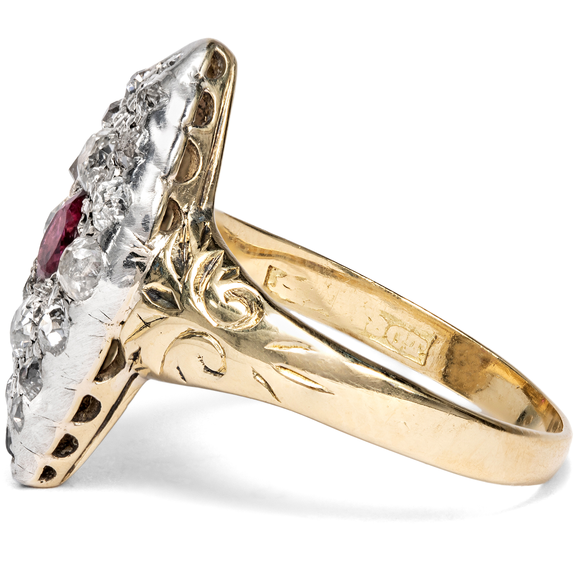 Antiker „Marquise“-Ring mit Rubin & Diamanten in Gold & Silber, Birmingham um 1890