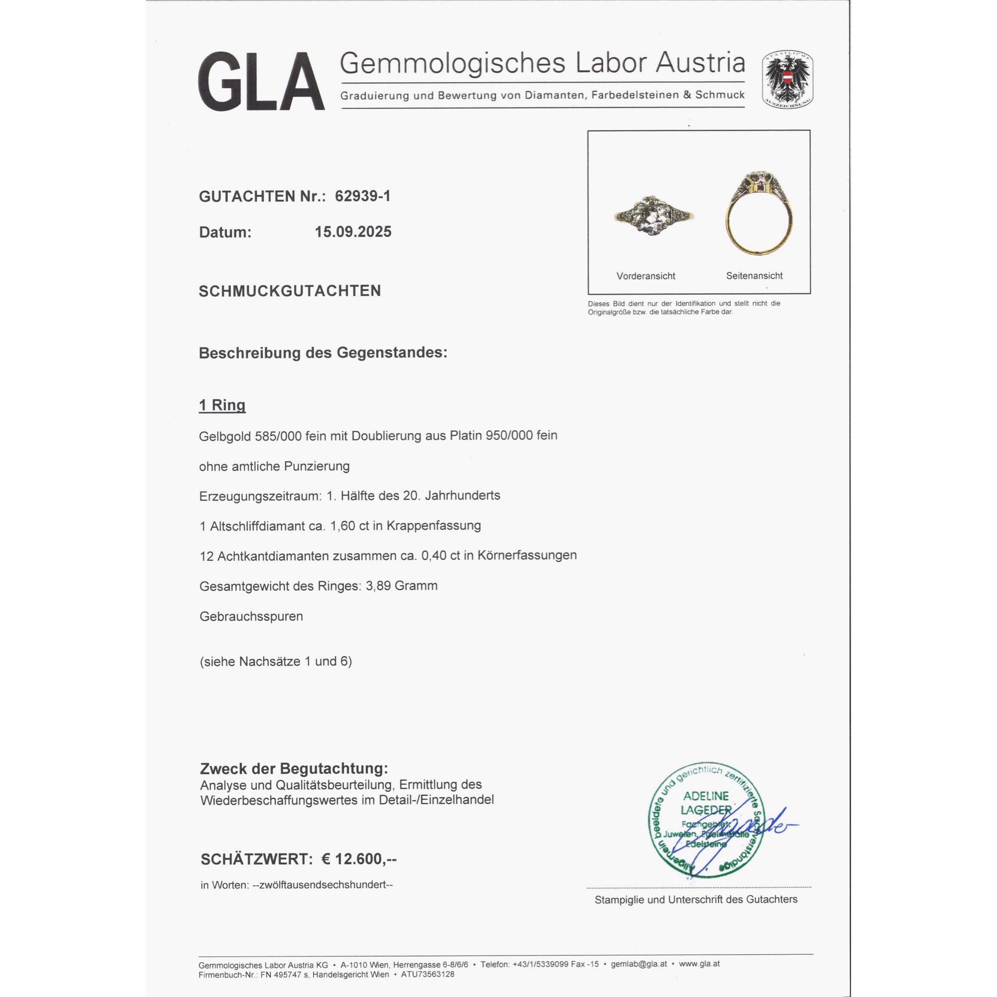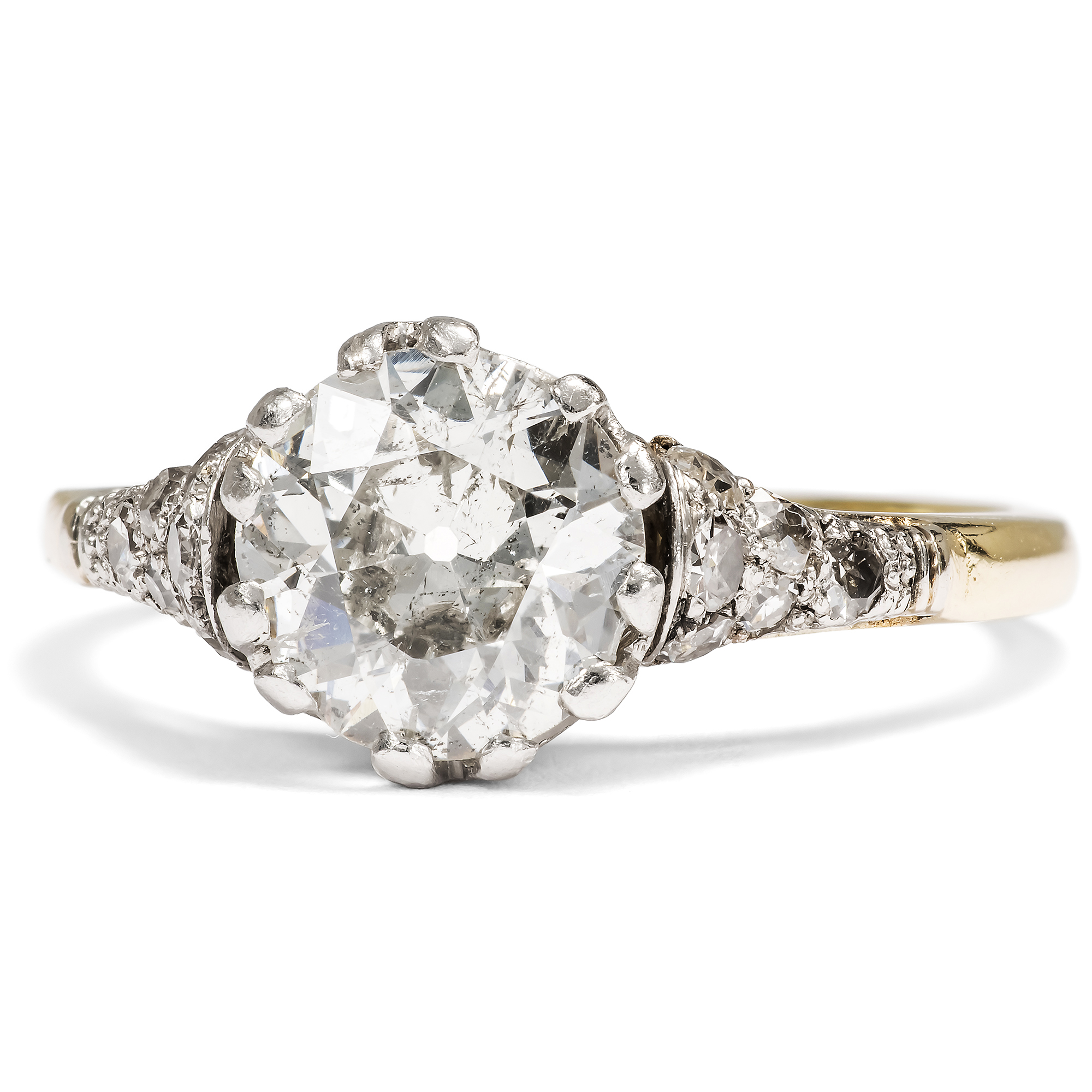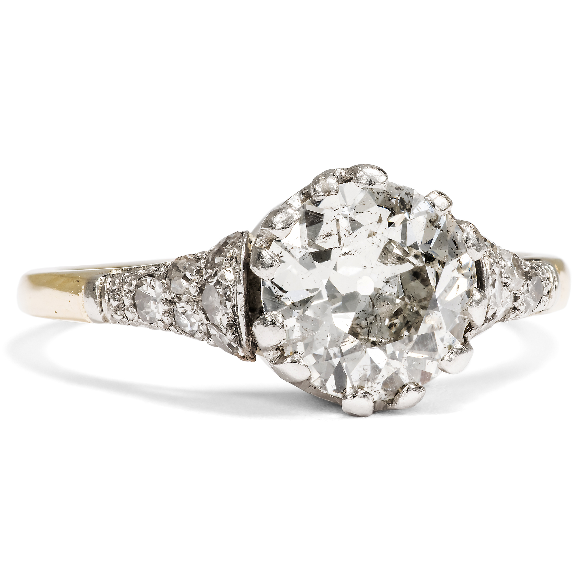 Ein alter Diamant ist stets ein Unikat, denn kein Stein ist wie der andere. Jeder Schliff, jede Farbtönung und jedes Einschlussbild verleihen ihm seinen eigenen Charakter und machen ihn zu einem einzigartigen, individuellen Geschenk. Der große Diamant in dem hier vorliegenden Ring ist im runden Altschliff geschliffen, der im englischen Sprachraum als „Old European Cut“ bezeichnet wird. Er zeigt eine sanfte Lichtbrechung und handangelegte Facetten, die ihm eine besondere Lebendigkeit verleihen. Der Stein hat ein Gewicht von etwa 1,60 Karat und weist kleine natürliche Einschlüsse auf, die sich wie zarte Fähnchen im Inneren verteilen. Gefasst ist der große Diamant in einen fein gearbeiteten Ring aus Gold und Platin. Die kunstvoll durchbrochene Krappenfassung hebt den Stein elegant hervor. Zwölf kleinere Diamanten begleiten den zentralen Stein in Pavéefassungen auf den Ringschultern. Besonders reizvoll ist das Zusammenspiel des Platins mit der weißen Farbe des historischen Diamanten, wodurch der Ring einen ausdrucksstarken Glanz erhält. Als der Ring in der Epoche des Art Déco entstand – wir denken, in den Jahren um 1930 herum – war der große Diamant bereits eine Generation alt. Sein Schliffbild und seine Proportionen entsprechen dem Stil um 1900. Tatsächlich wurden im Art Déco ältere Diamanten oft in neue Fassungen integriert, da sich die Schmuckmode stark verändert hatte. Ein Familienerbstück wurde so zu einem neuen, der aktuellen Mode entsprechenden Schmuckstück. Der Ring eignet sich wunderbar auch als Verlobungsring. Geliefert wird er mit einem detaillierten Gutachten aus Wien.