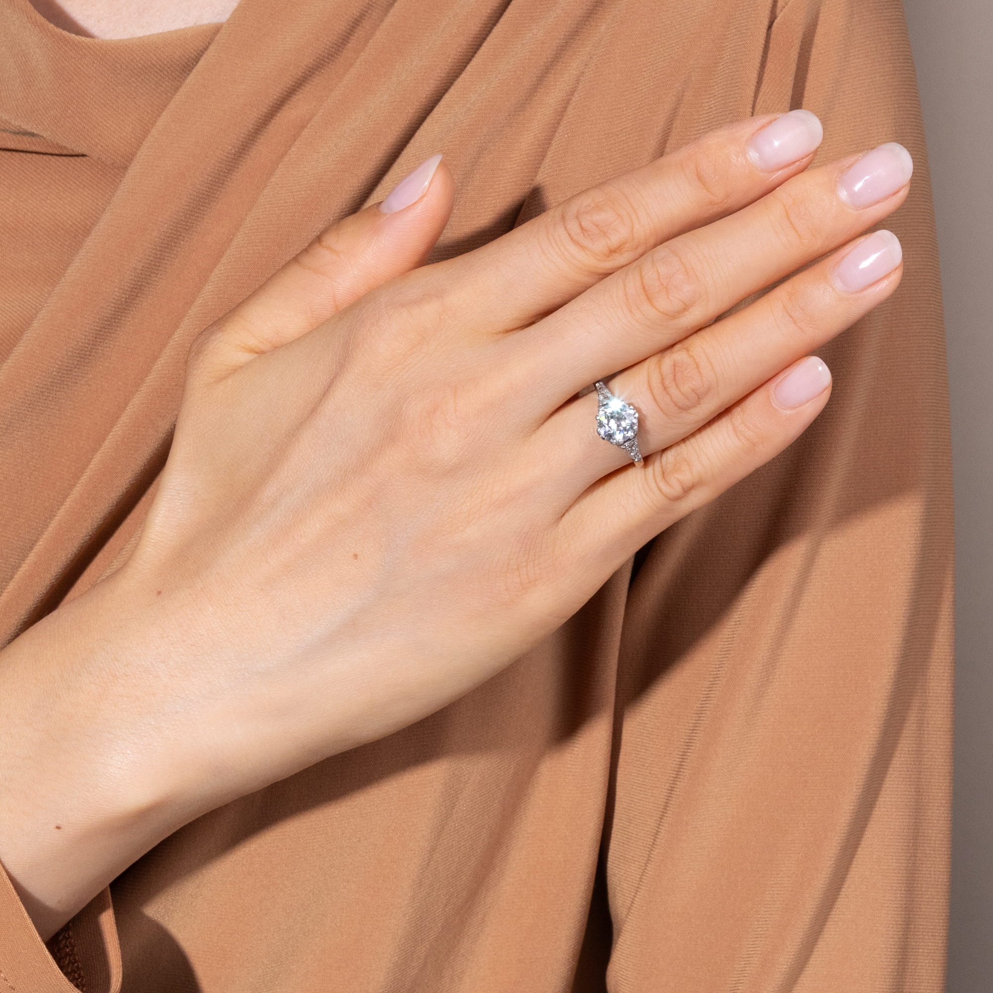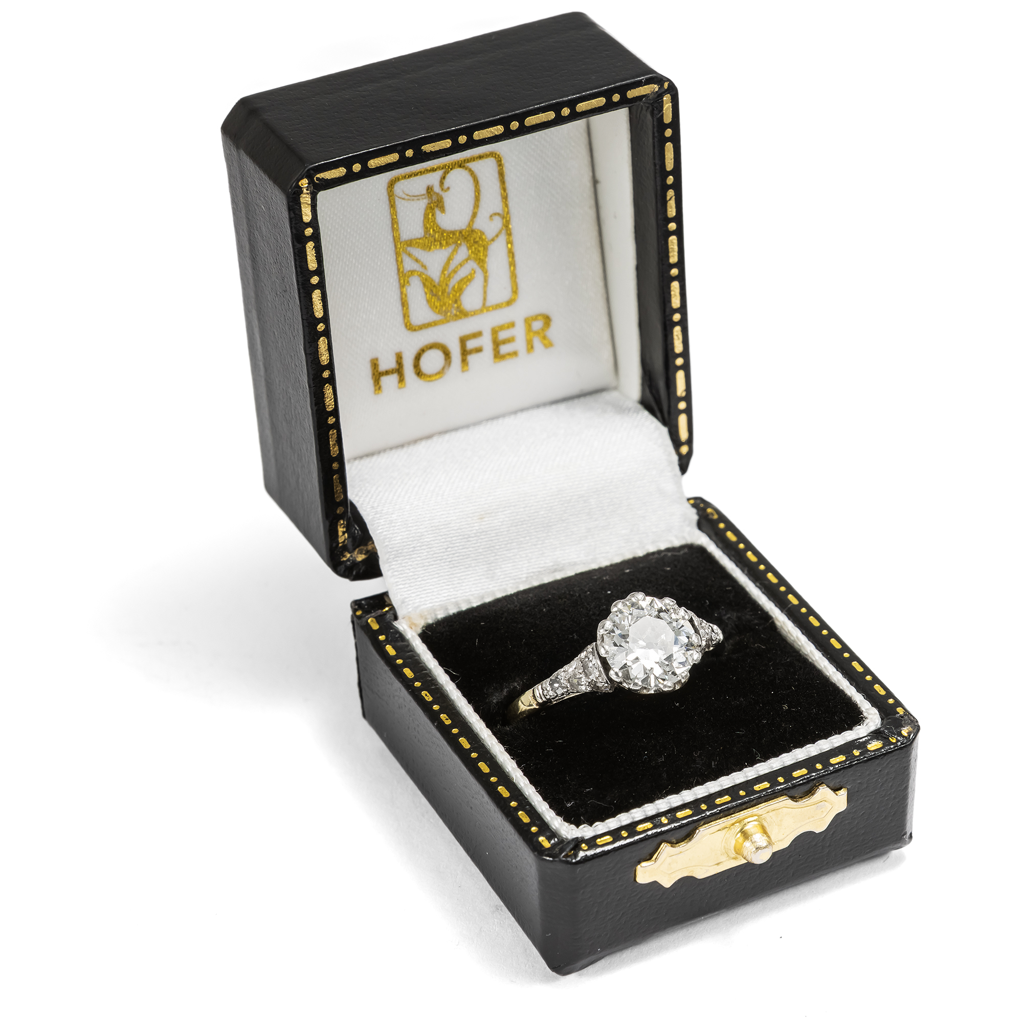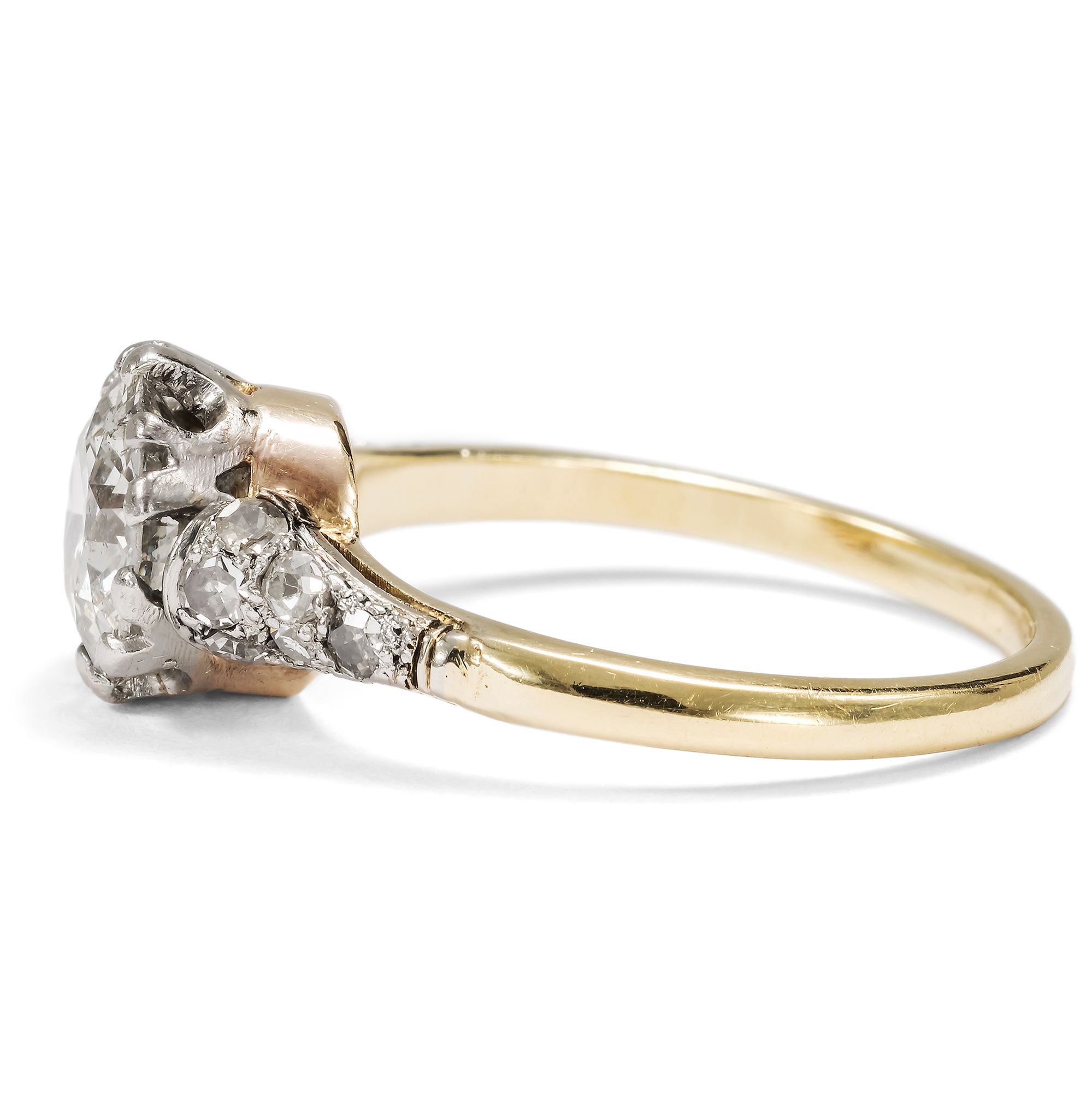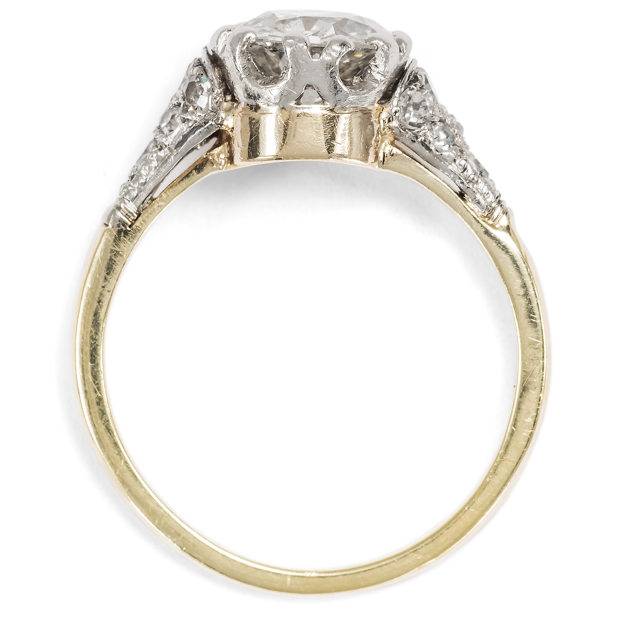 Ein alter Diamant ist stets ein Unikat, denn kein Stein ist wie der andere. Jeder Schliff, jede Farbtönung und jedes Einschlussbild verleihen ihm seinen eigenen Charakter und machen ihn zu einem einzigartigen, individuellen Geschenk. Der große Diamant in dem hier vorliegenden Ring ist im runden Altschliff geschliffen, der im englischen Sprachraum als „Old European Cut“ bezeichnet wird. Er zeigt eine sanfte Lichtbrechung und handangelegte Facetten, die ihm eine besondere Lebendigkeit verleihen. Der Stein hat ein Gewicht von etwa 1,60 Karat und weist kleine natürliche Einschlüsse auf, die sich wie zarte Fähnchen im Inneren verteilen. Gefasst ist der große Diamant in einen fein gearbeiteten Ring aus Gold und Platin. Die kunstvoll durchbrochene Krappenfassung hebt den Stein elegant hervor. Zwölf kleinere Diamanten begleiten den zentralen Stein in Pavéefassungen auf den Ringschultern. Besonders reizvoll ist das Zusammenspiel des Platins mit der weißen Farbe des historischen Diamanten, wodurch der Ring einen ausdrucksstarken Glanz erhält. Als der Ring in der Epoche des Art Déco entstand – wir denken, in den Jahren um 1930 herum – war der große Diamant bereits eine Generation alt. Sein Schliffbild und seine Proportionen entsprechen dem Stil um 1900. Tatsächlich wurden im Art Déco ältere Diamanten oft in neue Fassungen integriert, da sich die Schmuckmode stark verändert hatte. Ein Familienerbstück wurde so zu einem neuen, der aktuellen Mode entsprechenden Schmuckstück. Der Ring eignet sich wunderbar auch als Verlobungsring. Geliefert wird er mit einem detaillierten Gutachten aus Wien.