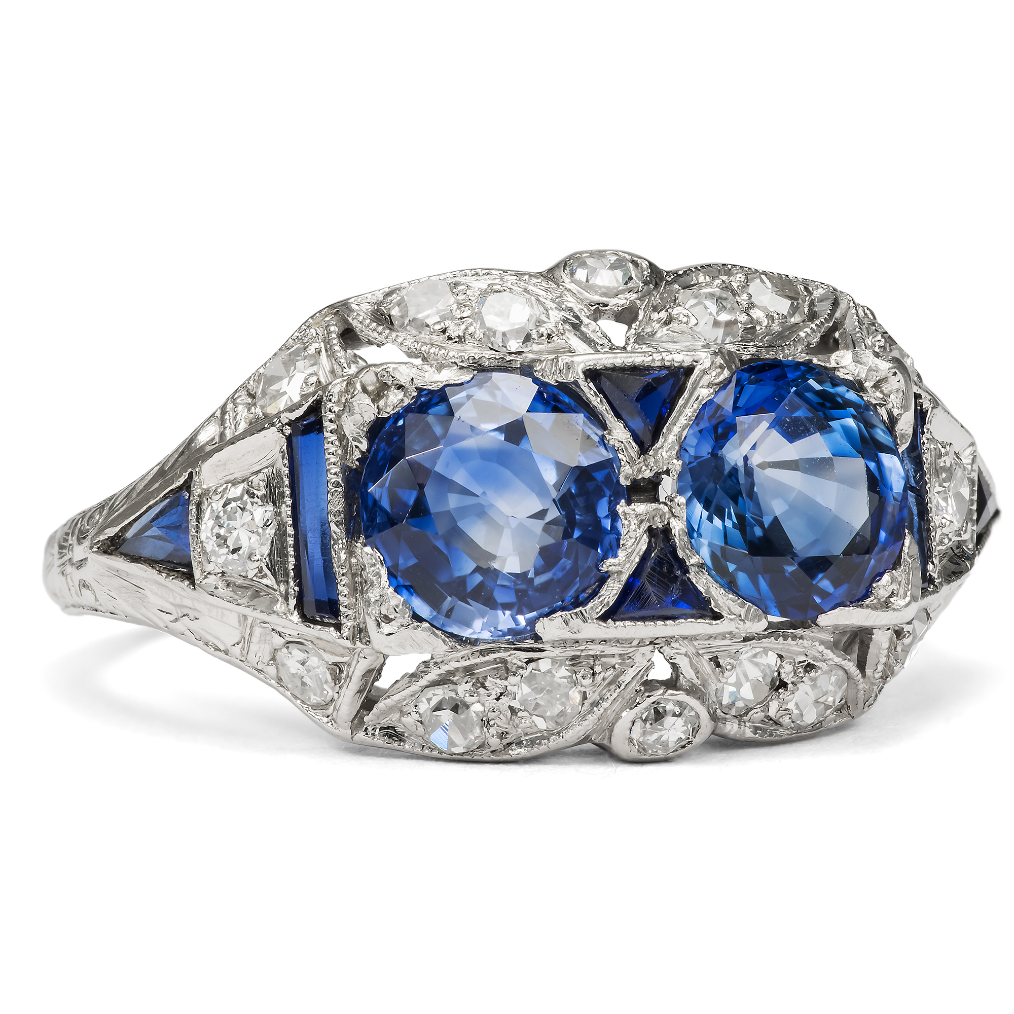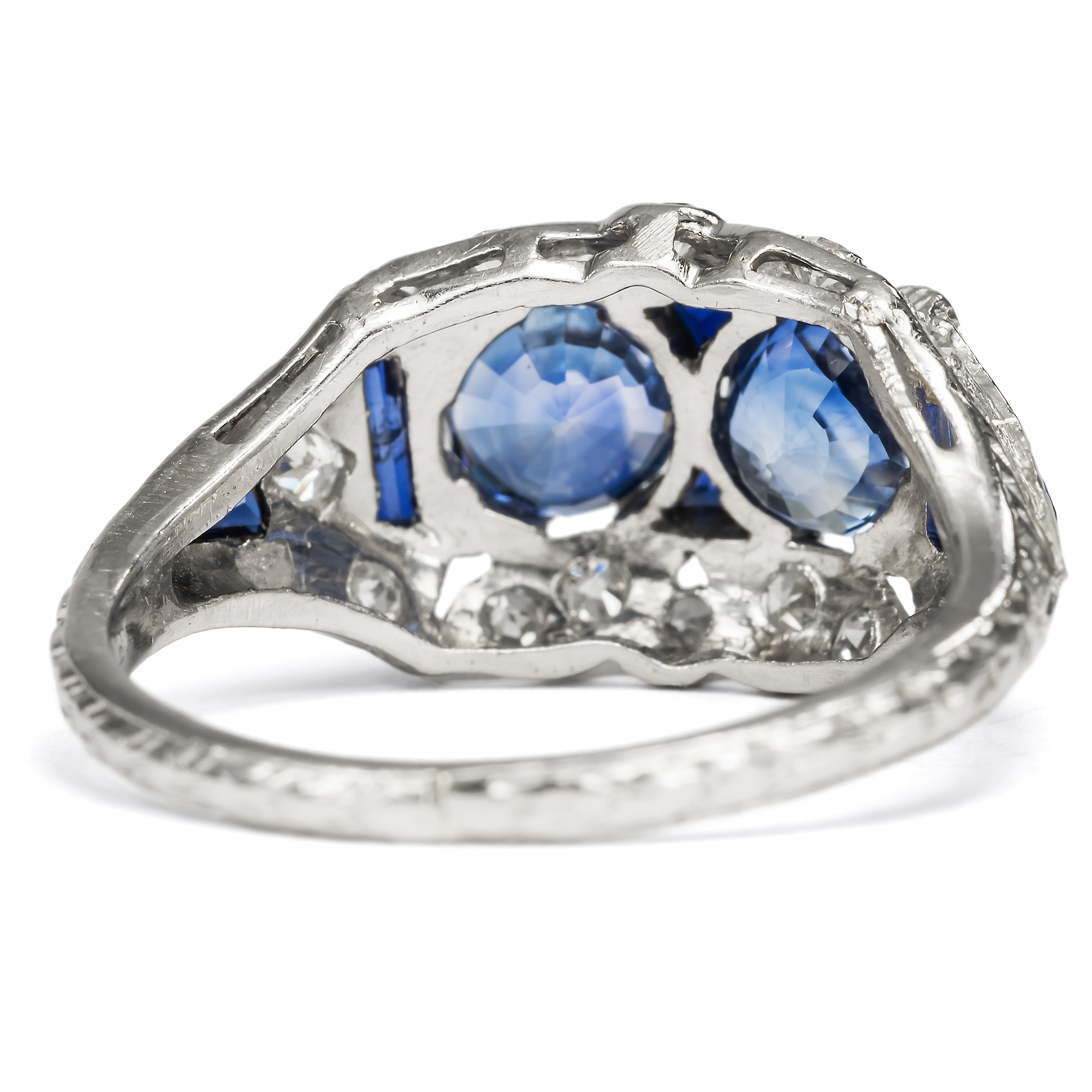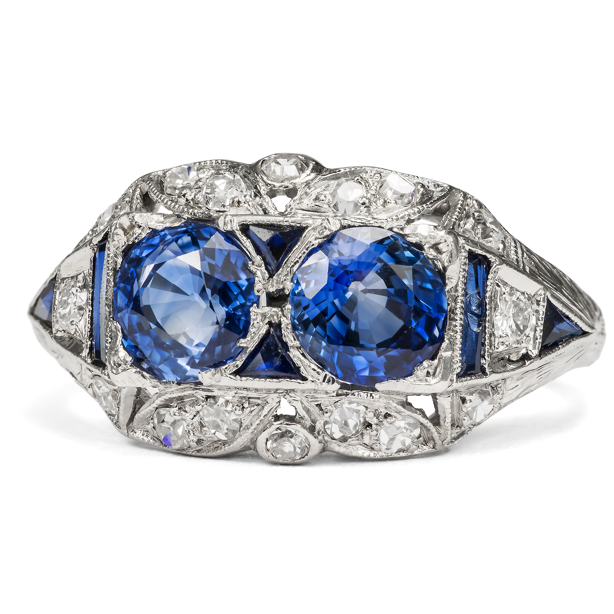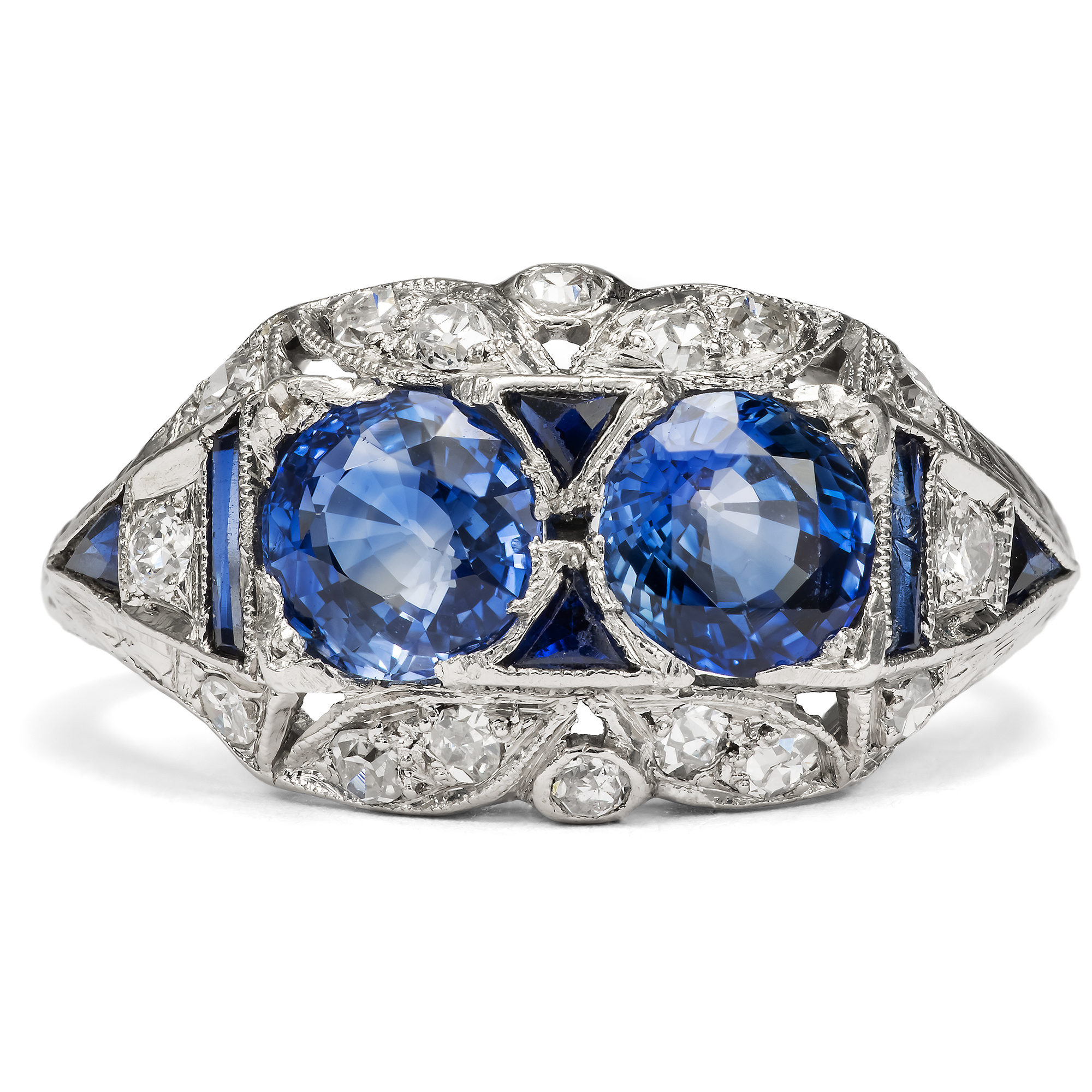 Einer der berühmtesten Herkunftsorte für blaue Saphire ist die Insel Ceylon, die erst 1972 in Sri Lanka umbenannt wurde. Die Insel liegt südöstlich des indischen Subkontinents inmitten des Indischen Ozeans. Ceylon gilt als das älteste Abbaugebiet für diese kostbaren Edelsteine, und zeitgenössischen Berichten zufolge wurden die Saphire Ceylons bereits in der klassischen Antike von Griechen und Römern in Schmuckstücke gefasst. Selbst König Salomon soll mit eben jenen Saphiren aus der Umgebung von Ratnapura, was auf Singhalesisch „Stadt der Edelsteine“ bedeutet, um die sagenumwobene Königin von Saba geworben haben. Der hier vorliegende, exquisite Ring des Art Déco präsentiert gleich zwei Saphire aus Ceylon als Höhepunkte seines Entwurfes. Die qualitätvollen, mittelblauen Saphire zeichnen sich durch ihre intensive Farbigkeit aus, die – im Gegensatz zu vielen anderen Saphiren, die sehr dunkel oder beinahe tintig wirken – tatsächlich strahlend blau leuchtet. Die Steine sind zudem sehr rein und transparent. Sie wiegen zusammen ca. 1,60 ct. Die Ceylonsaphire sind in Platin gefasst und werden von kleinen Diamanten sowie eckig geschliffenen, synthetischen Saphiren begleitet. Sie setzen funkelnde und effektvolle Akzente; die Materialien zusammen ergeben einen eleganten Farbakkord aus Blau und Weiß. Wir haben den Ring in Wien entdeckt. Er ist ausweislich seiner kraftvollen, geometrischen Formensprache und Verarbeitung in den 1920er Jahren entstanden. Ein unabhängiges Gutachten aus Wien begleitet den Ring.