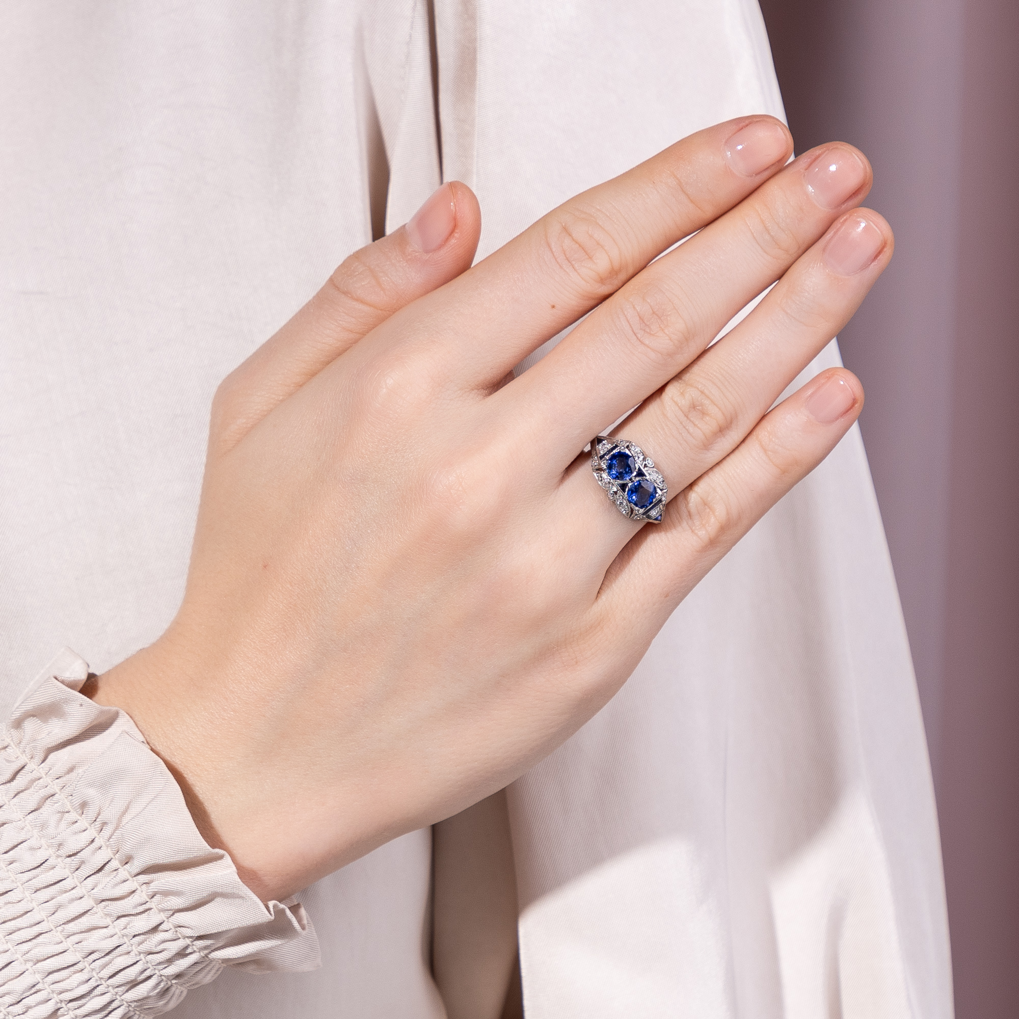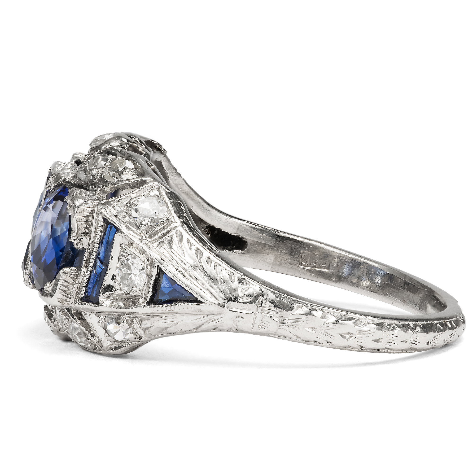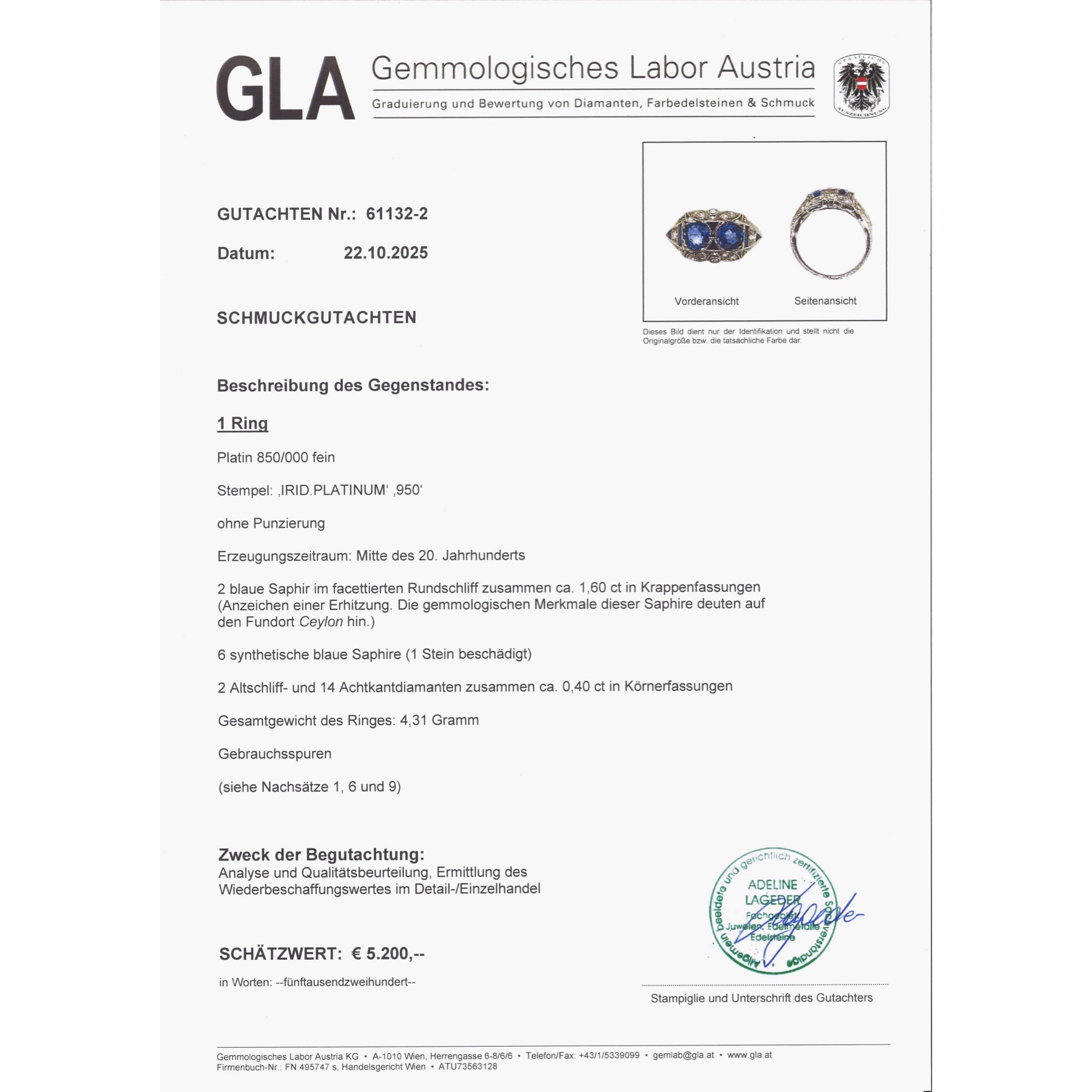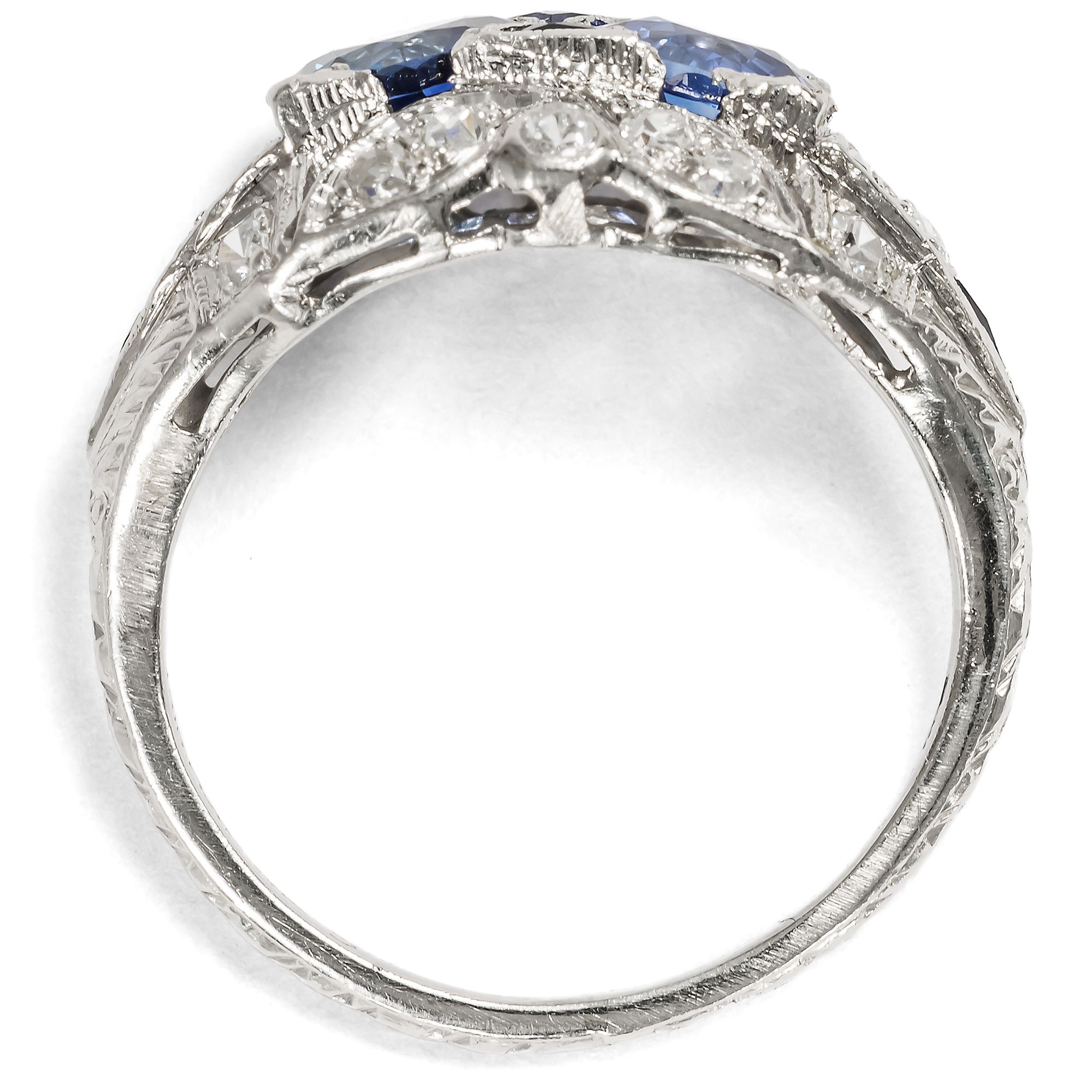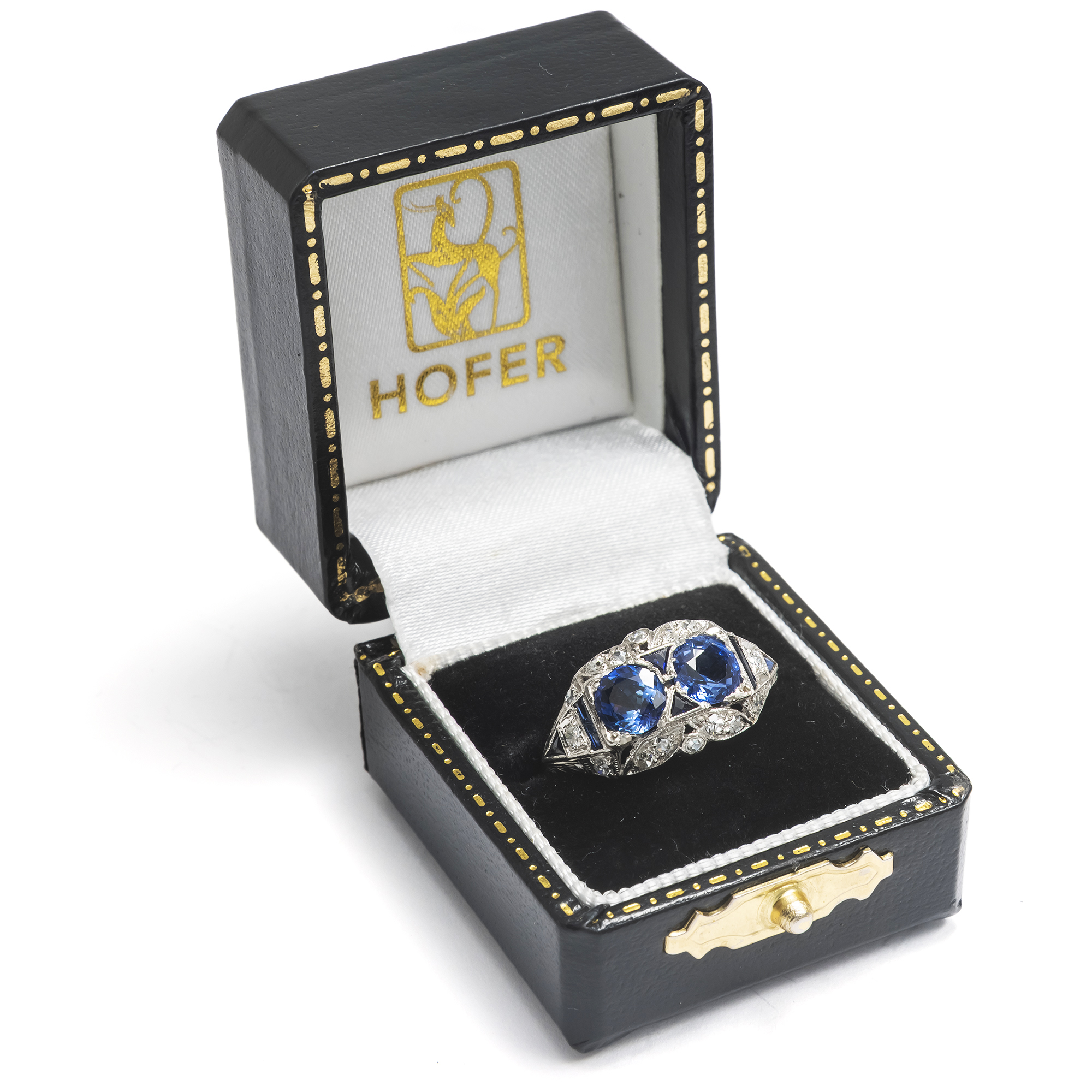 Einer der berühmtesten Herkunftsorte für blaue Saphire ist die Insel Ceylon, die erst 1972 in Sri Lanka umbenannt wurde. Die Insel liegt südöstlich des indischen Subkontinents inmitten des Indischen Ozeans. Ceylon gilt als das älteste Abbaugebiet für diese kostbaren Edelsteine, und zeitgenössischen Berichten zufolge wurden die Saphire Ceylons bereits in der klassischen Antike von Griechen und Römern in Schmuckstücke gefasst. Selbst König Salomon soll mit eben jenen Saphiren aus der Umgebung von Ratnapura, was auf Singhalesisch „Stadt der Edelsteine“ bedeutet, um die sagenumwobene Königin von Saba geworben haben. Der hier vorliegende, exquisite Ring des Art Déco präsentiert gleich zwei Saphire aus Ceylon als Höhepunkte seines Entwurfes. Die qualitätvollen, mittelblauen Saphire zeichnen sich durch ihre intensive Farbigkeit aus, die – im Gegensatz zu vielen anderen Saphiren, die sehr dunkel oder beinahe tintig wirken – tatsächlich strahlend blau leuchtet. Die Steine sind zudem sehr rein und transparent. Sie wiegen zusammen ca. 1,60 ct. Die Ceylonsaphire sind in Platin gefasst und werden von kleinen Diamanten sowie eckig geschliffenen, synthetischen Saphiren begleitet. Sie setzen funkelnde und effektvolle Akzente; die Materialien zusammen ergeben einen eleganten Farbakkord aus Blau und Weiß. Wir haben den Ring in Wien entdeckt. Er ist ausweislich seiner kraftvollen, geometrischen Formensprache und Verarbeitung in den 1920er Jahren entstanden. Ein unabhängiges Gutachten aus Wien begleitet den Ring.
