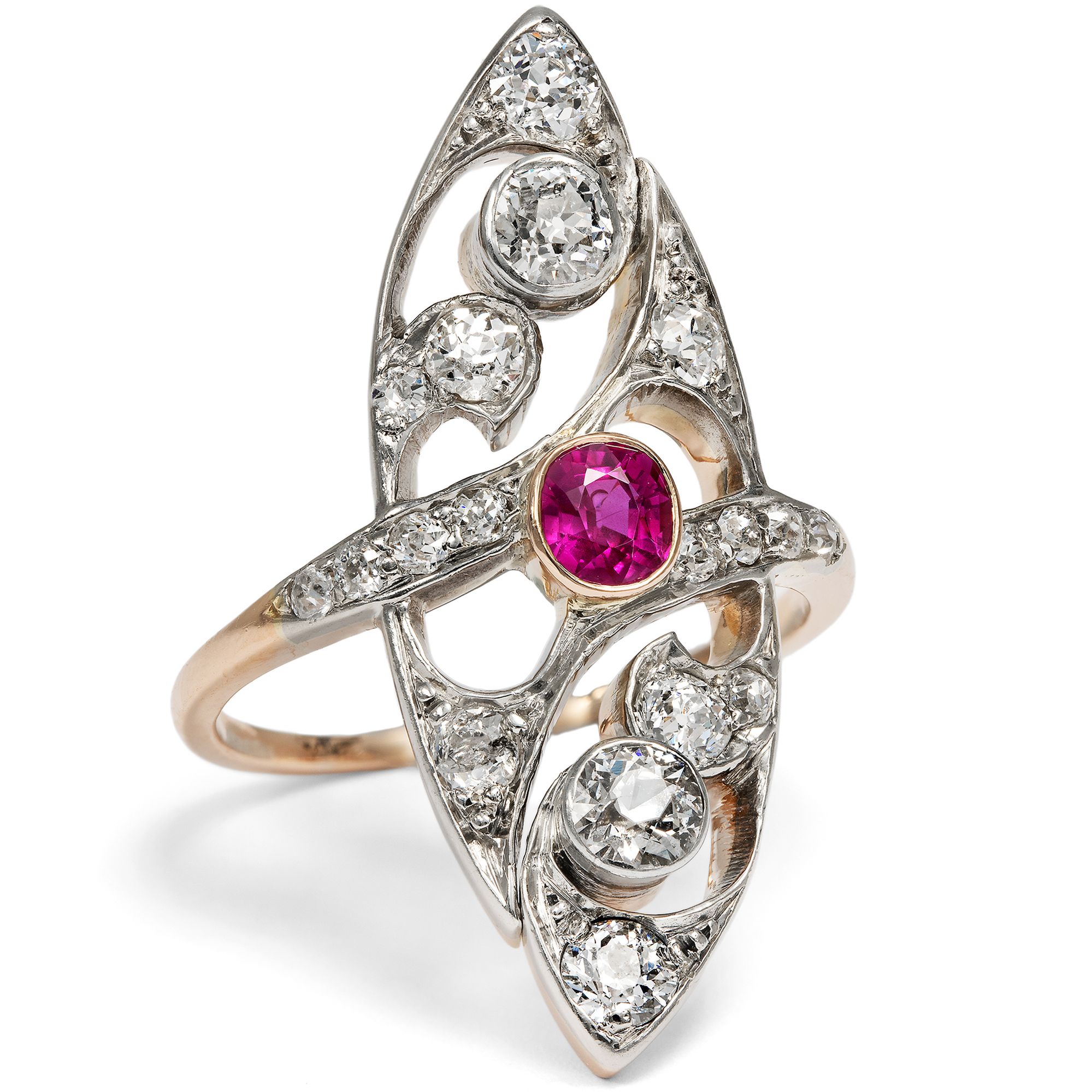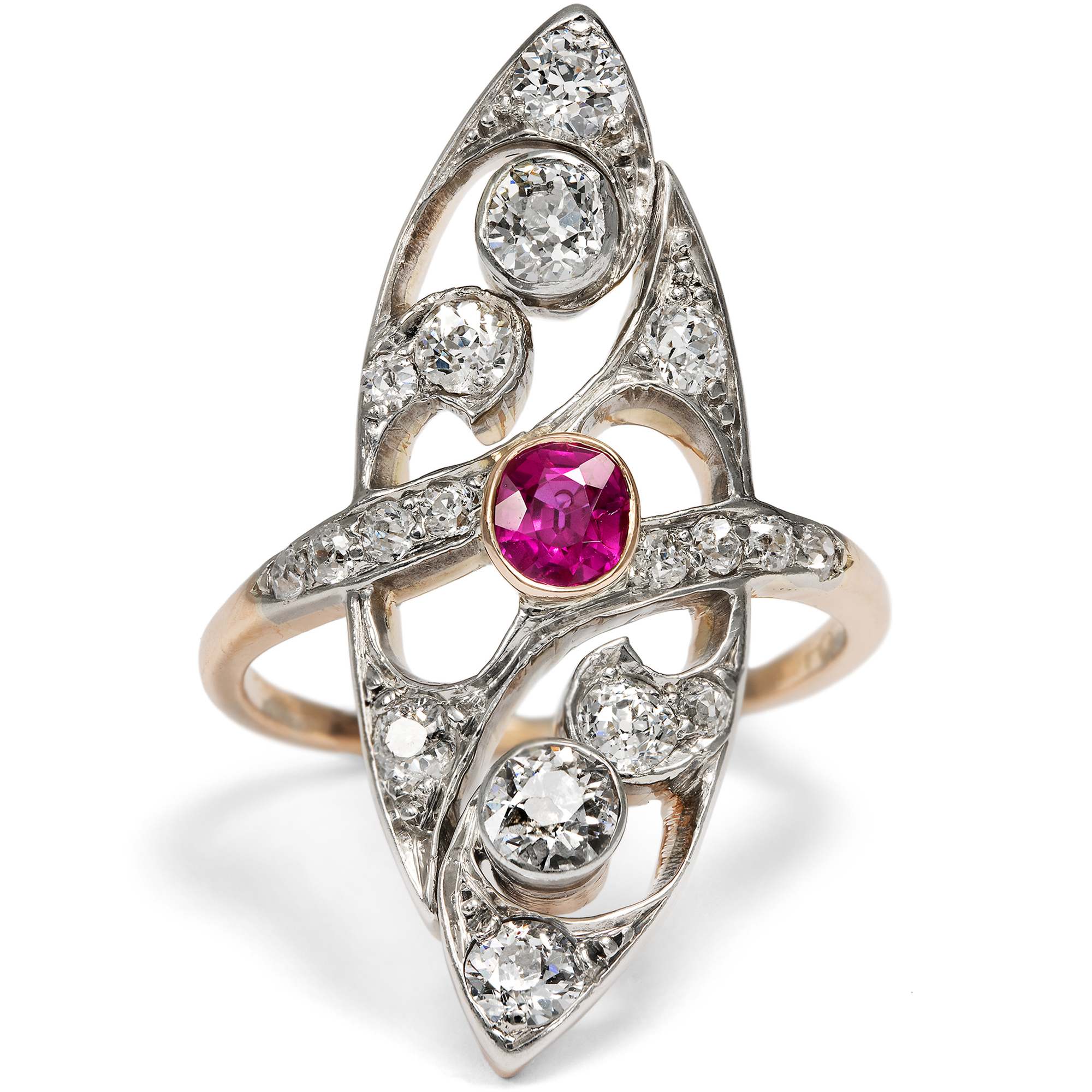 Leichtigkeit war das Ideal der Belle Époque, jener Zeit zwischen dem späten 19. Jahrhundert und dem Ausbruch des ersten Weltkrieges. Nicht mehr nur der Adel feierte glänzende Feste. Auch das Bürgertum, durch die Industrialisierung zu Reichtum und Ansehen gelangt, wollte an den Sonnenseiten des Lebens teilhaben. Rauschende Bälle, schäumende Champagnerkelche und elegante Salons prägen das Bild jener Zeit. Dieses Gefühl der Lebenslust und Leichtigkeit sollte sich auch in Schmuck und Mode widerspiegeln: Reicher Diamantschmuck war das Ideal, und im neuen elektrischen Licht glitzerte er auch nachts wie niemals zuvor. Doch der schwere Schmuck des späten 19. Jahrhunderts verschwand nun. Immer feiner, geradezu ätherisch wurden die Entwürfe. Ihre Kostbarkeit sollte sich in der stetigen Verfeinerung der Goldschmiedekunst ausdrücken. Diesem Ideal entsprechend ist auch der hier vorliegende Ring gearbeitet. Der klassische Typus des Marquise-Ringes erhält hier durch die durchbrochene Komposition aus elegant geschwungenen Jugendstil-Linien eine neue Leichtigkeit. Den Mittelpunkt bildet ein natürlicher Rubin aus Burma von pink-roter Farbe. Der Stein ist unbehandelt und nicht erhitzt: Ein wirkliches kleines Juwel! Ein Karat Diamanten im historischen Altschliff besetzt die gesamte beim Tragen sichtbare Oberfläche, die mit hellem Silber belegt ist. Der Ring entstand zu Beginn des 20. Jahrhunderts und kam laut Stempelung einmal in den Niederlanden in den Handel. Wir haben das wohlerhaltene Stück in Düsseldorf entdeckt.