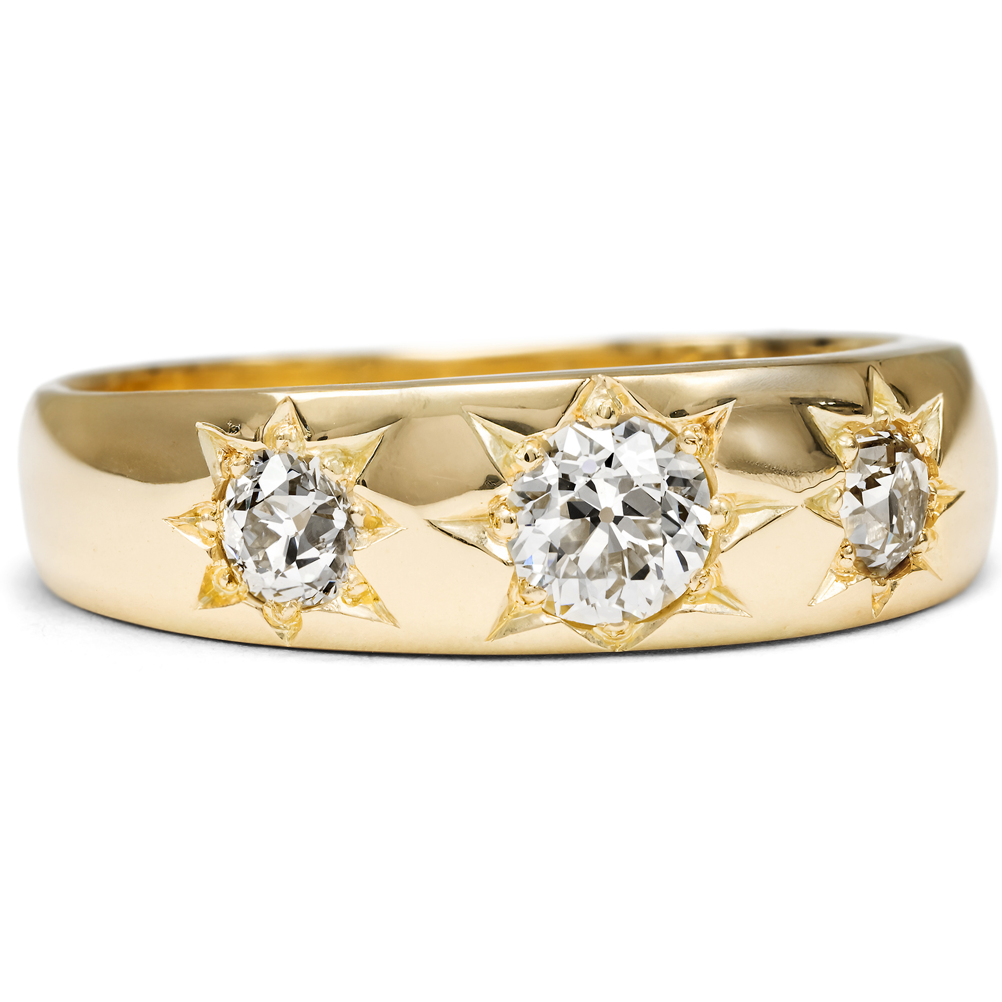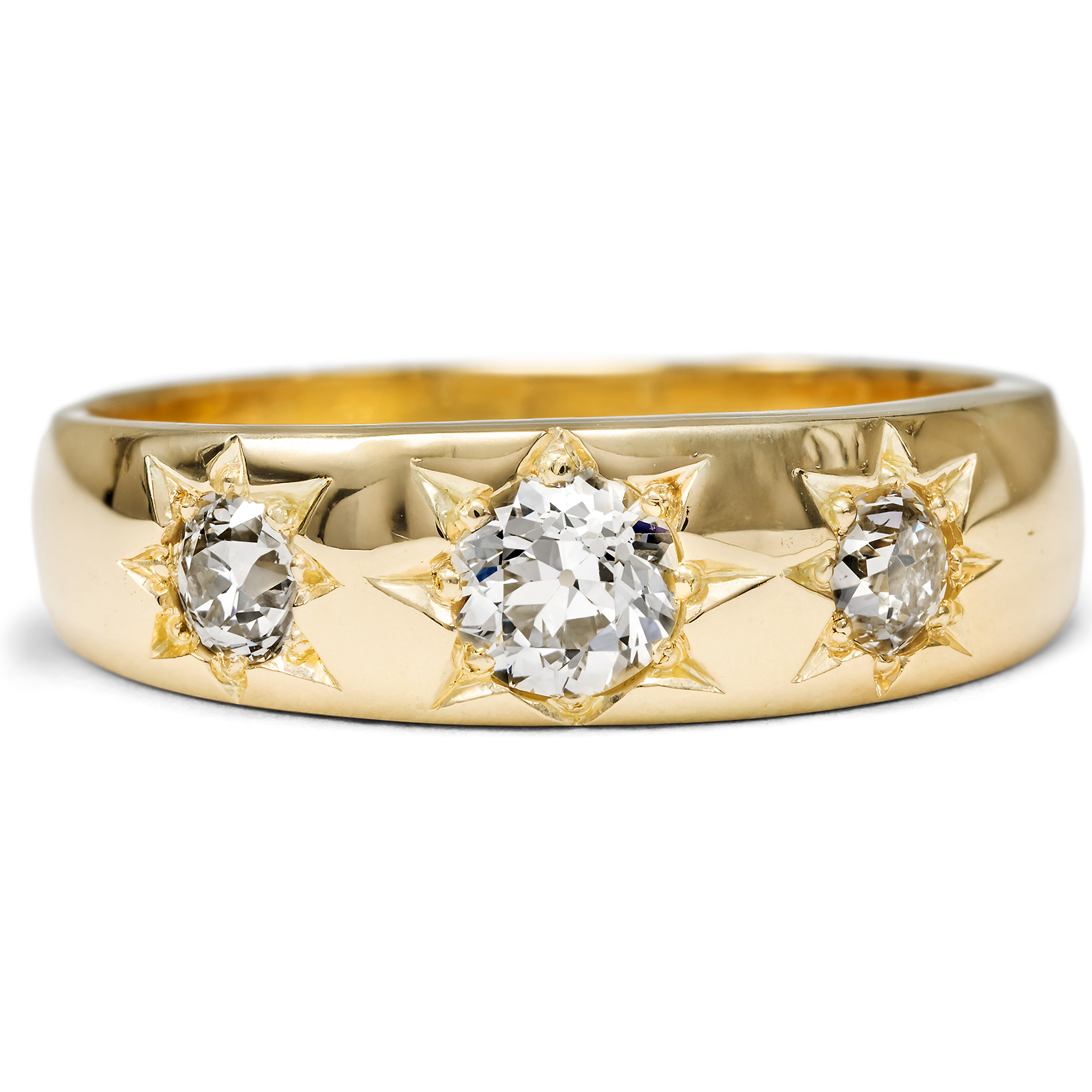 In den 1870er Jahren kam in Großbritannien eine neue Art und Weise auf, Edelsteine zu fassen. Sie nannte sich ursprünglich „gypsy setting“ (heute meist „flush mount setting“) und zeichnete sich dadurch aus, dass sie keiner Krappen oder Zargen bedurfte. Stattdessen wurden die Steine oder Perlen vertieft eingelassen, sodass sie plan mit dem Gold lagen. Sternenartig schnitt der Goldschmied dann kleine Kanäle rund um den Stein, um aus den hieraus resultierenden Spänen kleine Körnungen zu formen, welche die eigentliche Fassung darstellten. Da die so entstehende Fassung nirgends hängen bleiben konnte, trug sie sich besonders unproblematisch und wurde schnell zu einer großen Mode. Im vorliegenden Ring sehen wir ein Beispiel für einen solchen Ring aus dem ausgehenden 19. Jahrhundert. In dem sich nach oben ausweitenden Bandring aus warm glänzendem Gelbgold sind drei funkelnde Diamanten im Altschliff in schöne Sternfassungen eingelassen. Ihr Schliff, die im späten 19. Jahrhundert übliche Form des Diamantschliffs, ließ dem Stein etwas mehr Individualität und wurde mehr als der moderne Brillant von der Ausgangsform des gefundenen Kristalls geleitet. Die drei Diamanten wiegen zusammen rund 0,68 ct und sind von guter Qualität. Ihre Farbe ist Feines Weiß (Top Wesselton, G) – Weiß (Wesselton, H), und sie zeigen nur sehr kleine bis kleine Einschlüsse (VS bis SI). Ihre Brillanz ist etwas weicher als bei modernen Steinen. Wir haben den Ring hier in Berlin entdeckt. Da er seiner Punzierung zufolge auch in Deutschland entstanden ist, zeigt dies, wie schnell sich die neue Mode in ganz Europa verbreitete.