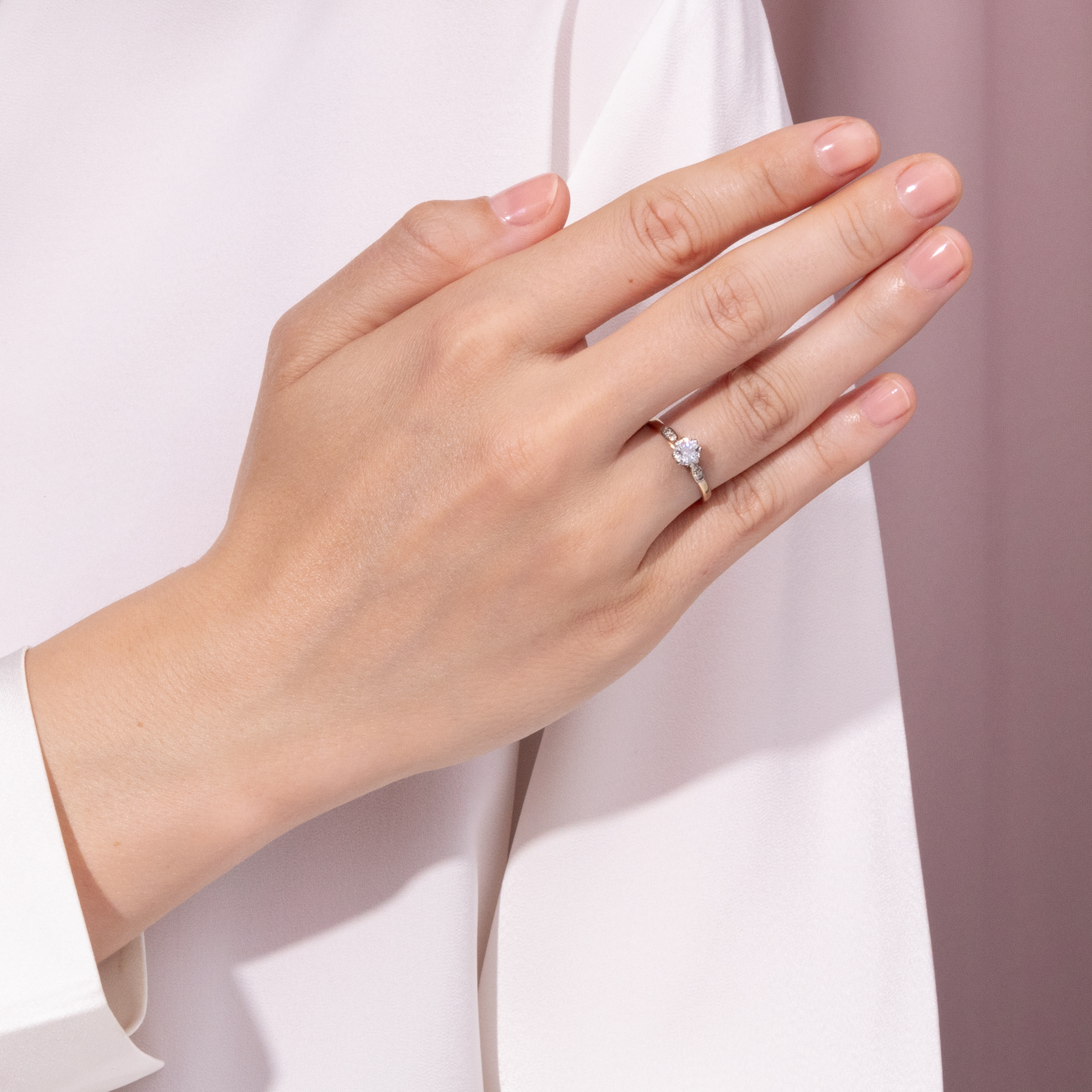 Weißjuwelen, also Schmuckstücke in weißer Farbigkeit, feiern das Licht. Die Neuerung der elektrischen Glühlampe ließ am Ende des 19. Jahrhunderts die Nacht zum Tage werden. Folglich konnte nun auch der Schmuck am Abend strahlen wie nie zuvor. Der hier vorliegende Ring aus den Jahren um 1920 ist ein Schmuckstück, das in seiner weißen Farbigkeit dieser Mode voll und ganz entspricht. Der Ring ist schlicht und elegant, wobei die beim Tragen sichtbaren Teile aus Platin bestehen. Die schmale, schlichte Ringschiene aus 18-karätigem Gold trägt zwischen leicht eingeschnürten Schultern eine feine Krönchenfassung mit dem zentralen Diamanten. Es ist ein Halbkaräter im Altschliff, der in der Mitte des Ringes leuchtet und aller Wahrscheinlichkeit nach als Verlobungsring entstanden ist. Vier weitere kleine Diamanten begleiten den weißen Diamanten, der ein bewegtes, natürliches Einschlussbild zeigt. Aufgrund der besonderen Schliffform des Diamanten, der als alter Brillantschliff zeitlich dem modernen Brillantschliff vorausgeht, und der Wahl von Platin und Gelbgold für den Ring selbst, können wir das Schmuckstück in die Jahre um 1920 datieren. Entstanden ist der Ring in England, entdeckt haben wir ihn in London.