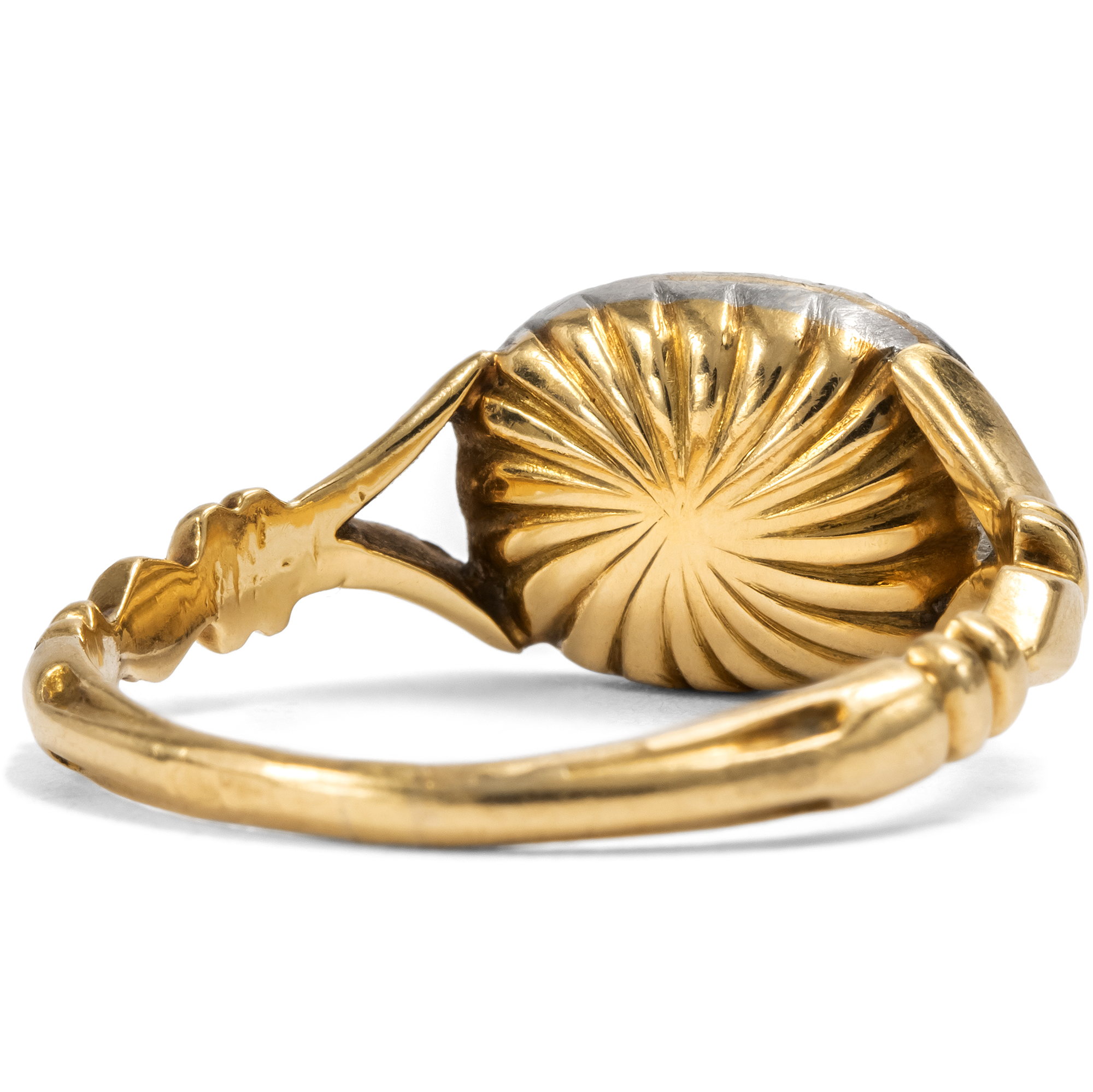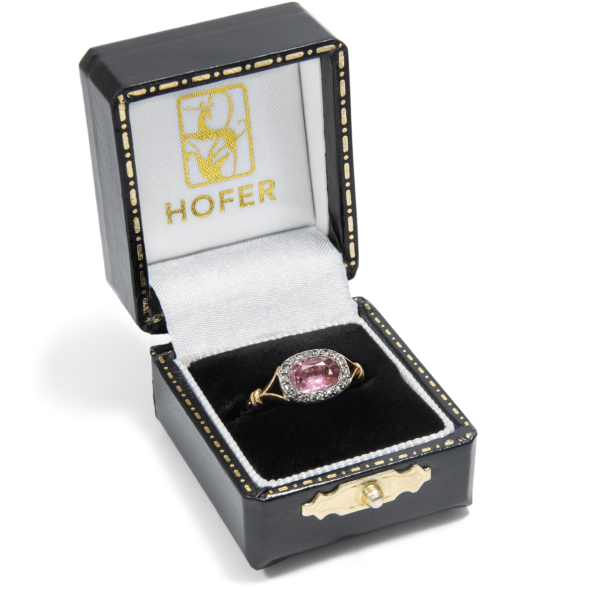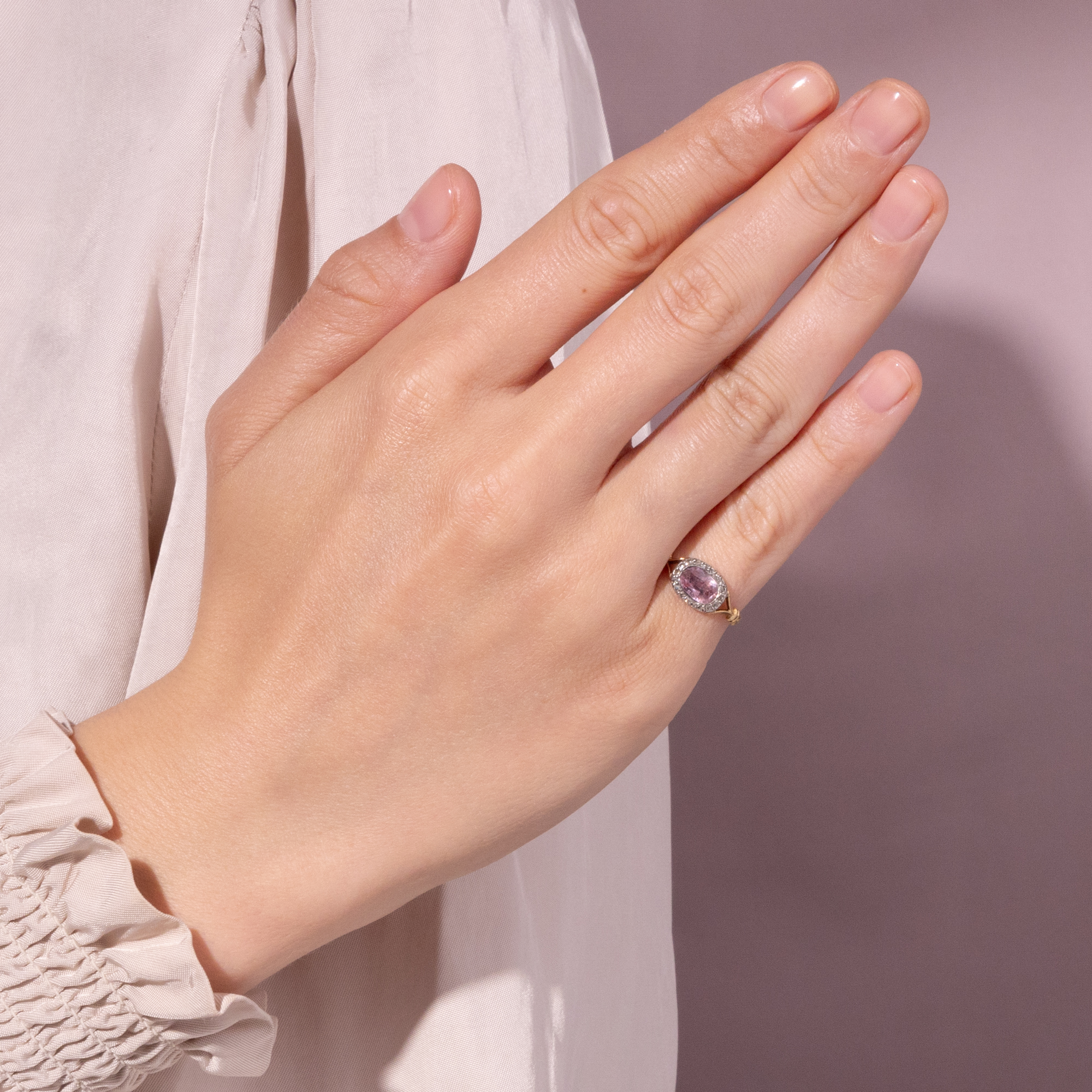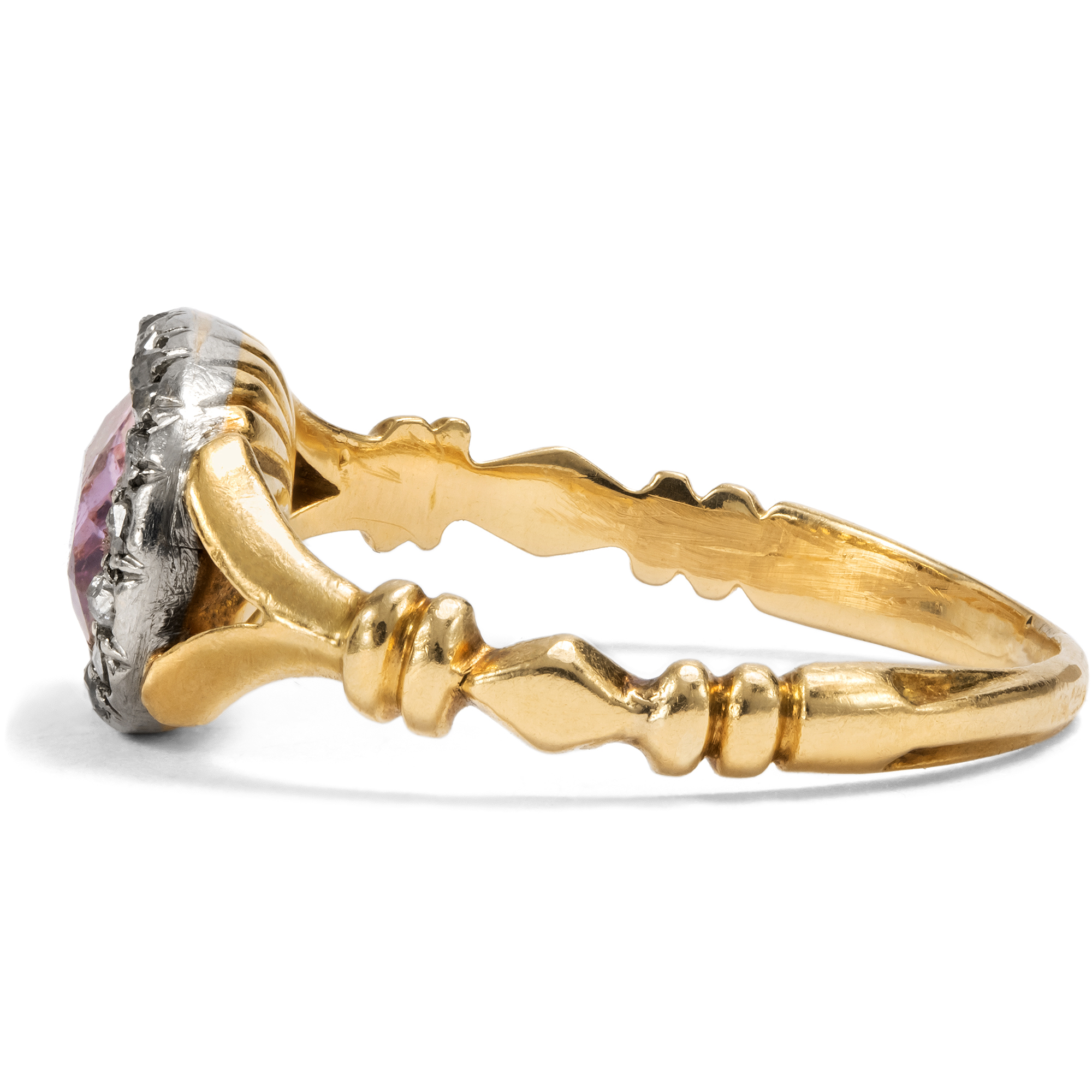Der vorliegende Ring mutet an wie ein Schmuckstück der eleganten und farbenfrohen Jahre um 1820, als die Strenge der napoleonischen Zeit einer überbordenden Fülle an bunten Steinen wich, unter denen insbesondere der Topas einen Liebling darstellte. Entstanden ist der Ring jedoch etwa drei Generationen später, wie seine Verarbeitung zeigt. Zu dieser Zeit sammelte man die Schmuckstücke aus der Generation der Urgroßmütter: „There is a great demand for old jewellery up to 1820“, ließ ein Juwelier aus der noblen Londoner Bond Street 1912 verlauten. Wirkliche antike Stücke standen ebenso im Kurs wie neue, nach alten Vorbildern geschaffene. Dieser Ring fängt die Nostalgie jener Zeit wunderbar ein. Der Topas in einem zarten Ton von Puderrosa ist in eine geschlossene Fassung gesetzt und wird von einem Kranz aus kleinen Diamantrosen umgeben, die ihn dezent, doch effektvoll rahmen. Anders aber als bei den Ringen der Jahre um 1820, die aus Silber auf Gold gefertigt wurden, sind die Diamanten hier bereits in Platin gefasst. Auch die horizontale Ausrichtung der Edelsteine ist eine bewusste Anlehnung an die Fingerringe aus der Generation der Urgroßmütter, ebenso die gespaltenen Ringschultern, die harmonisch zur Schiene überleiten. Wir haben das wunderschöne und ungewöhnliche Schmuckstück in Portugal entdeckt. Zuvor wurde es nach Frankreich importiert, wie seine Stempel zeigen. [Anon:] The Fashion for Platinum, The Morning Leader, 23. Oktober 1912, S. 8.