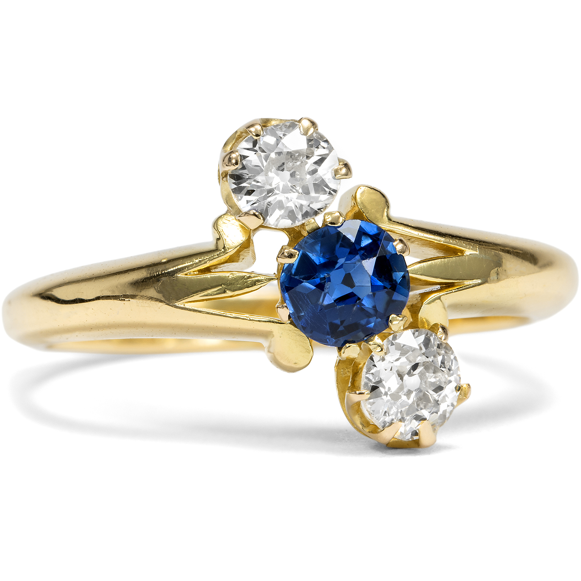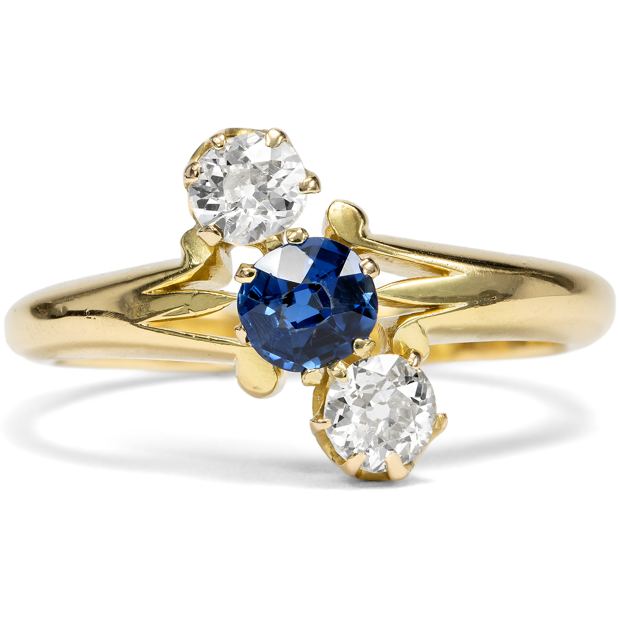 Der vorliegende Ring stammt aus den späten Regierungsjahren von Queen Victoria und zeigt die für diese Epoche charakteristische Gestaltung. Er besteht aus hochkarätigem Gelbgold und ist mit einem natürlichen blauen Saphir besetzt. Seitlich flankieren ihn zwei Diamanten im Altschliff mit einem Gesamtgewicht von etwa 0,40 Karat. Die Steine sind in einer Reihe schräg zum Finger angeordnet und werden von dreigeteilten Schultern mit randlichen Volumen gehalten. Der Entwurf folgt dem Konzept des sogenannten „Trilogie“-Rings, bei dem drei Edelsteine Vergangenheit, Gegenwart und Zukunft symbolisieren. Der zentrale Stein steht im traditionellen Verständnis für den gegenwärtigen Moment. Auch die Auswahl der Edelsteine erfolgt symbolischen Überlegungen. Diamanten gelten seit jeher als Symbol für Beständigkeit, während der Saphir häufig mit treuer Zuneigung in Verbindung gebracht wird. Die Punzierung an der Innenseite der Ringschiene weist den Hersteller aus: die Manufaktur Samuel Usher in Birmingham. Der dort verwendete Jahresbuchstabe, ein gotisches „u“, datiert die Erstprüfung und Stempelung des Rings auf das Jahr 1894. Die flache Bauweise und die zurückhaltende Art der Fassungen lassen den Ring auch heute noch erstaunlich modern wirken.