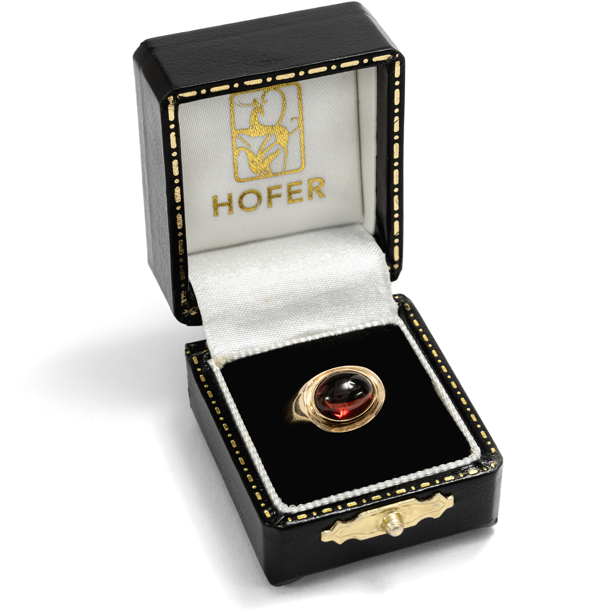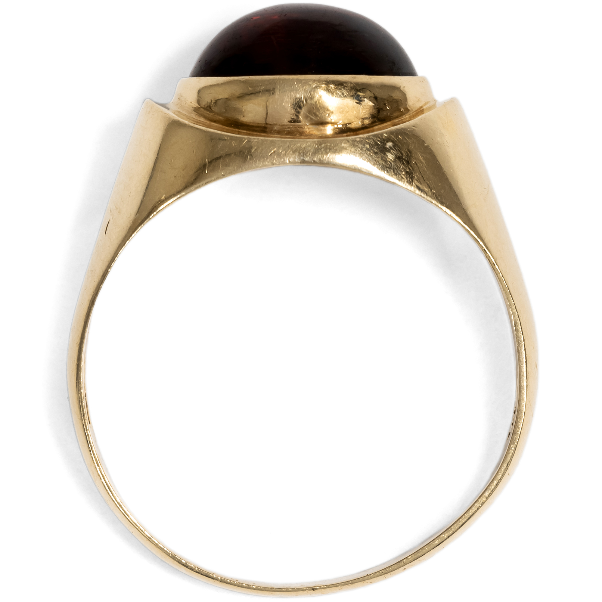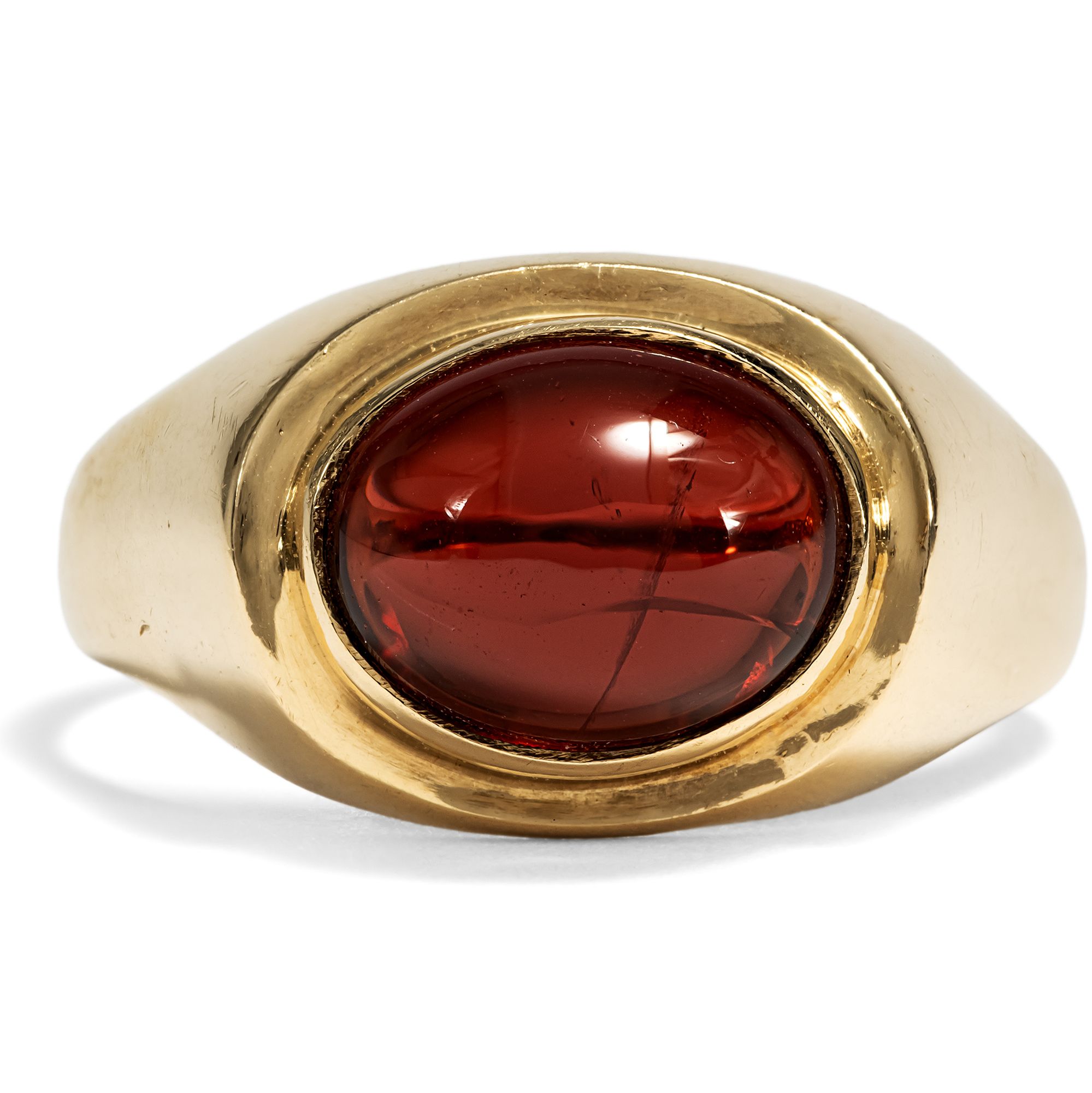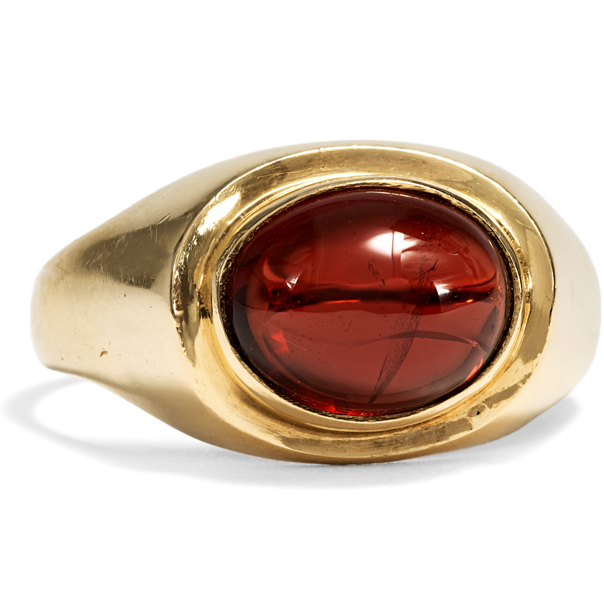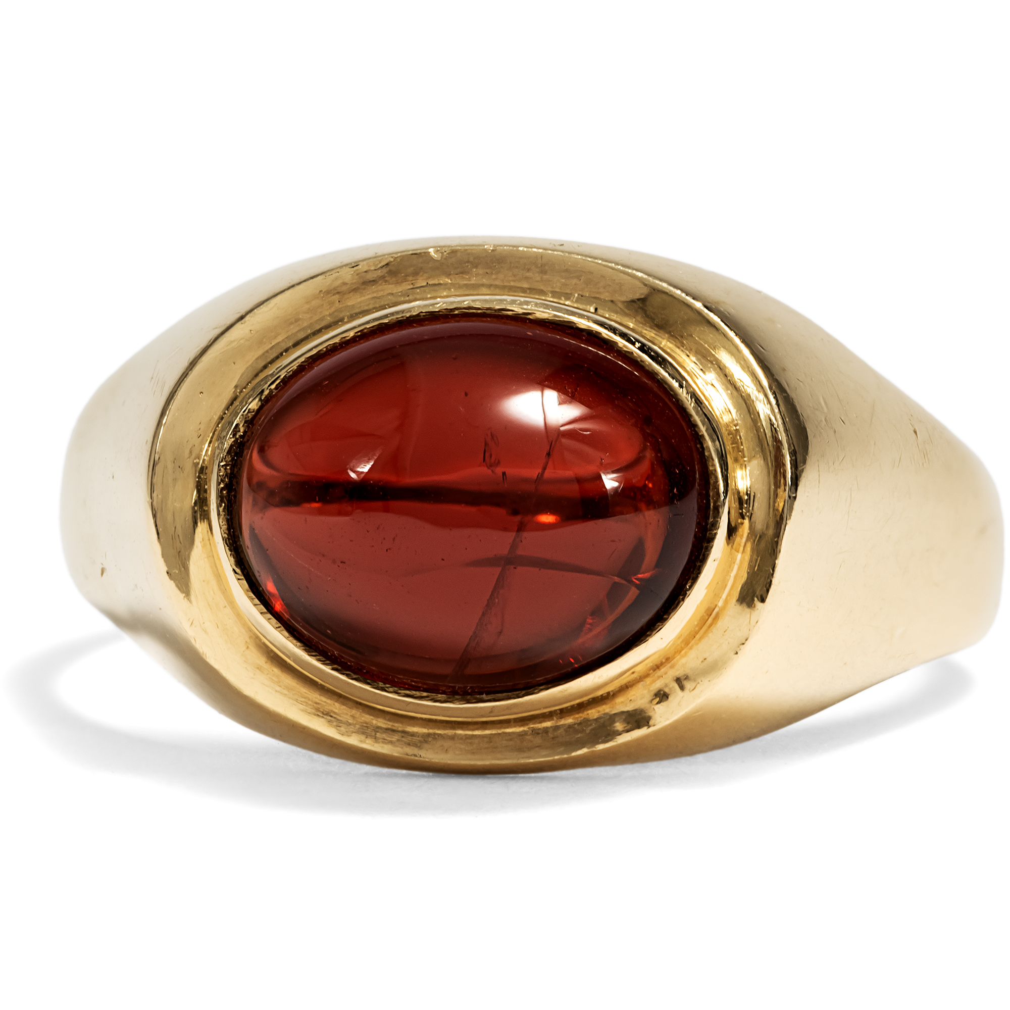 „Der Dandy kultiviert seine Kleidung, sein Auftreten, auch Witz und Bonmot. Die originelle, aber jederzeit passende, elegante Kleidung zum Sport (Zeitvertreib), kombiniert mit den formvollendeten Manieren eines Gentlemans, wird zum Lebenszweck erhoben.“ So beschreibt die Wikipedia jene wohlangezogenen Herren, die ab und an noch heute auf den Straßen der Metropolen zu sehen sind. Und natürlich gehört zu guter Garderobe auch immer ein schönes Schmuckstück. Da die meisten Schmuckstücke ja der Damenwelt vorbehalten sind – häufig zum Leidwesen derjenigen Herren, die es mögen, wenn es glänzt und funkelt – freuen wir uns ganz besonders, hier einen Ring vorstellen zu können, der nicht nur von Damen, sondern auch von Herren getragen werden kann. Wobei dies die Damenwelt nicht ausschließt. Es ist ein Unisex-Ring! Der breite Ring hält einen wundervollen Granat von tiefroter Farbe in warm leuchtendem Gold. Seine Formensprache ist effektvoll reduziert und wirkt dadurch geradezu modern. Seine Verarbeitung und die Details verraten jedoch, dass er um die vorletzte Jahrhundertwende entstanden ist. Der Ring wurde deutlich verkleinert, wohl um eine Damenhand zu schmücken. Er kann jedoch problemlos wieder erweitert werden. Er ist sehr gut erhalten und ein stilvolles Accessoire.