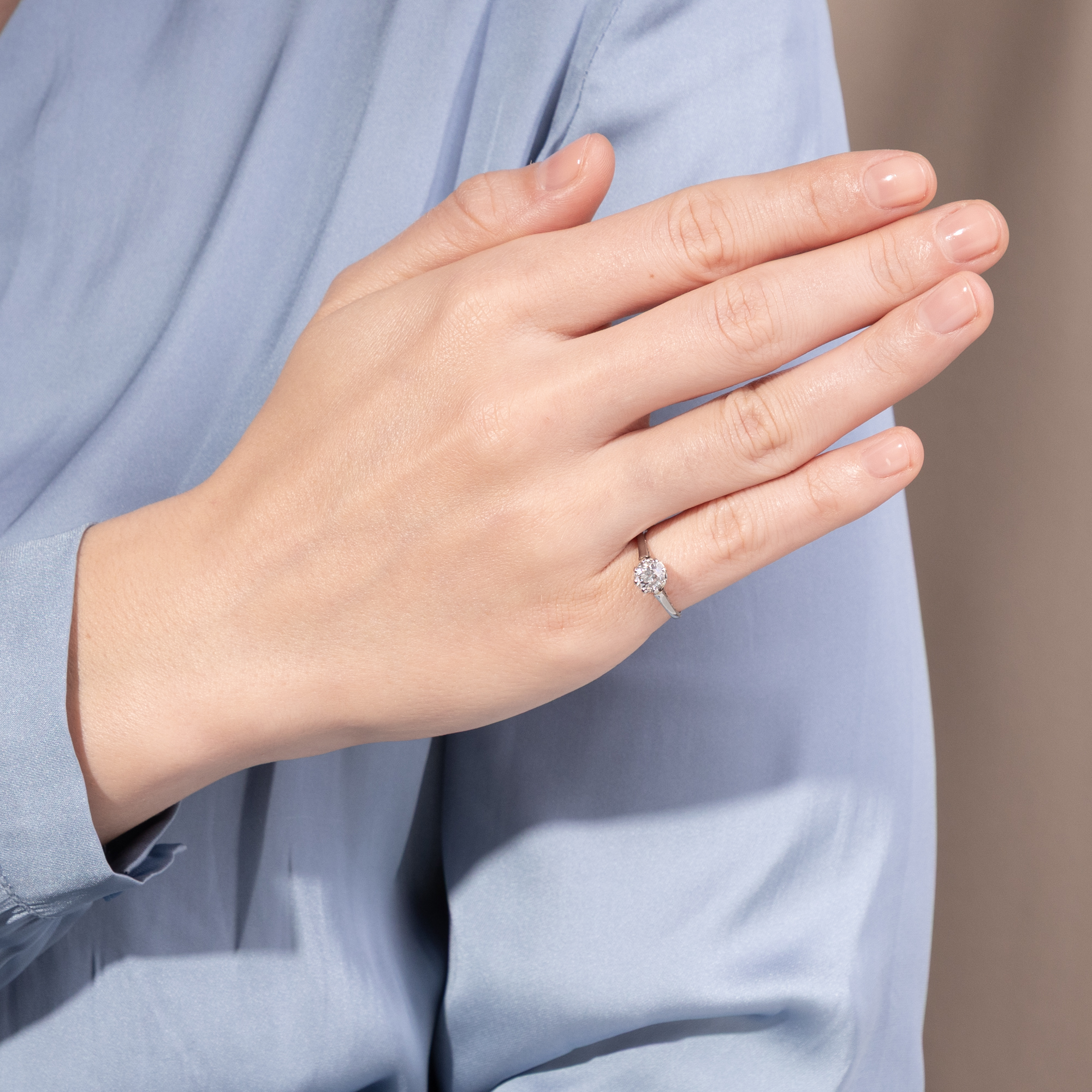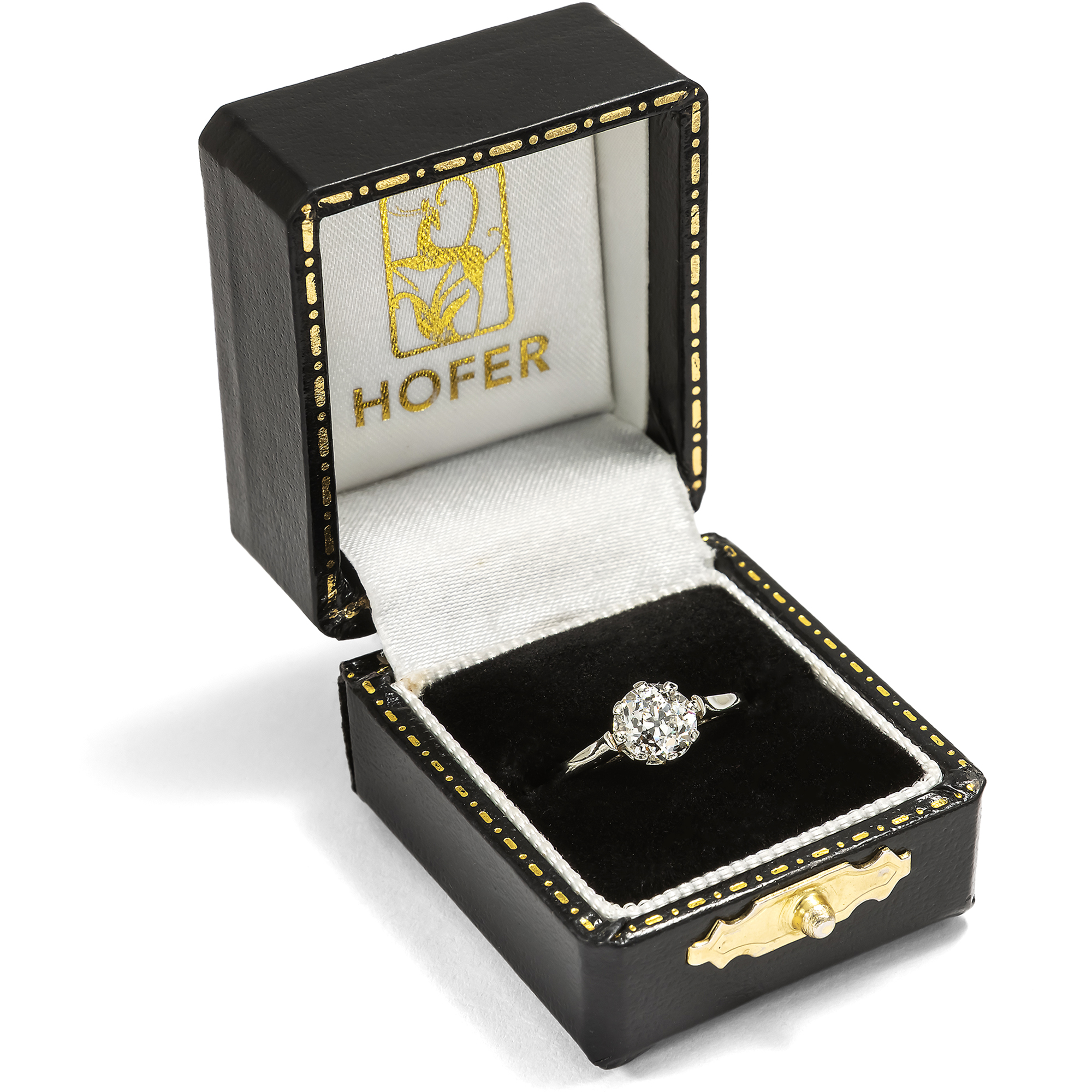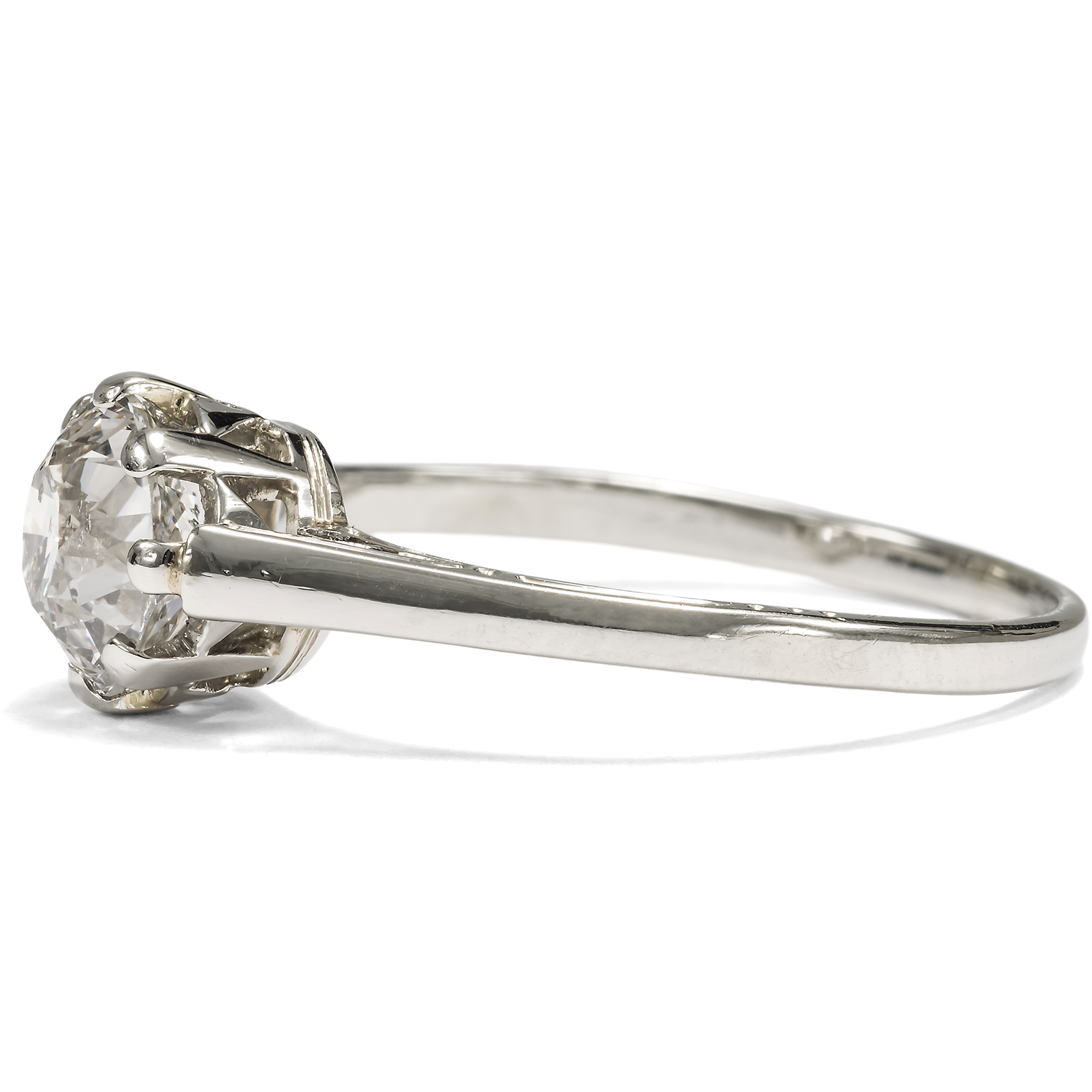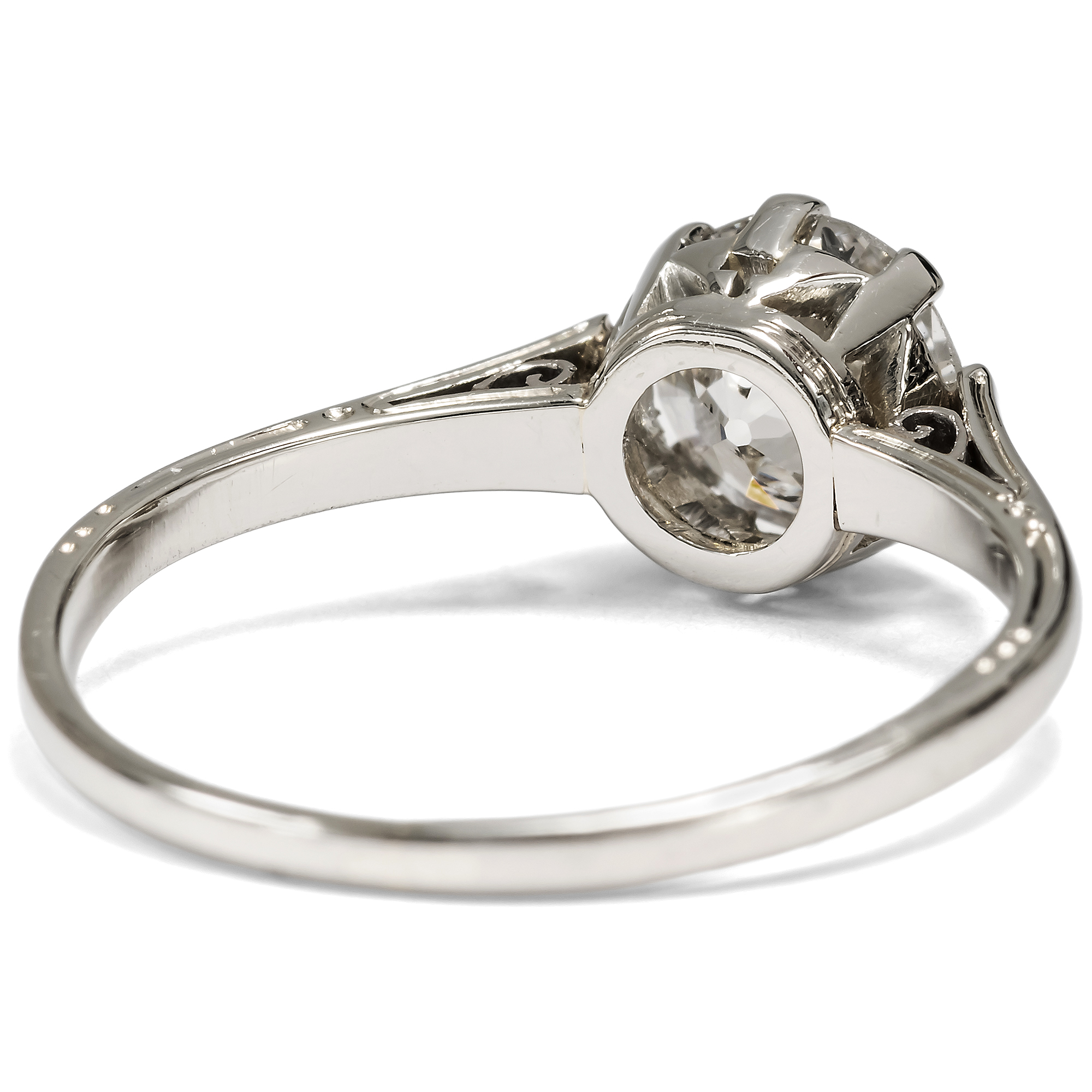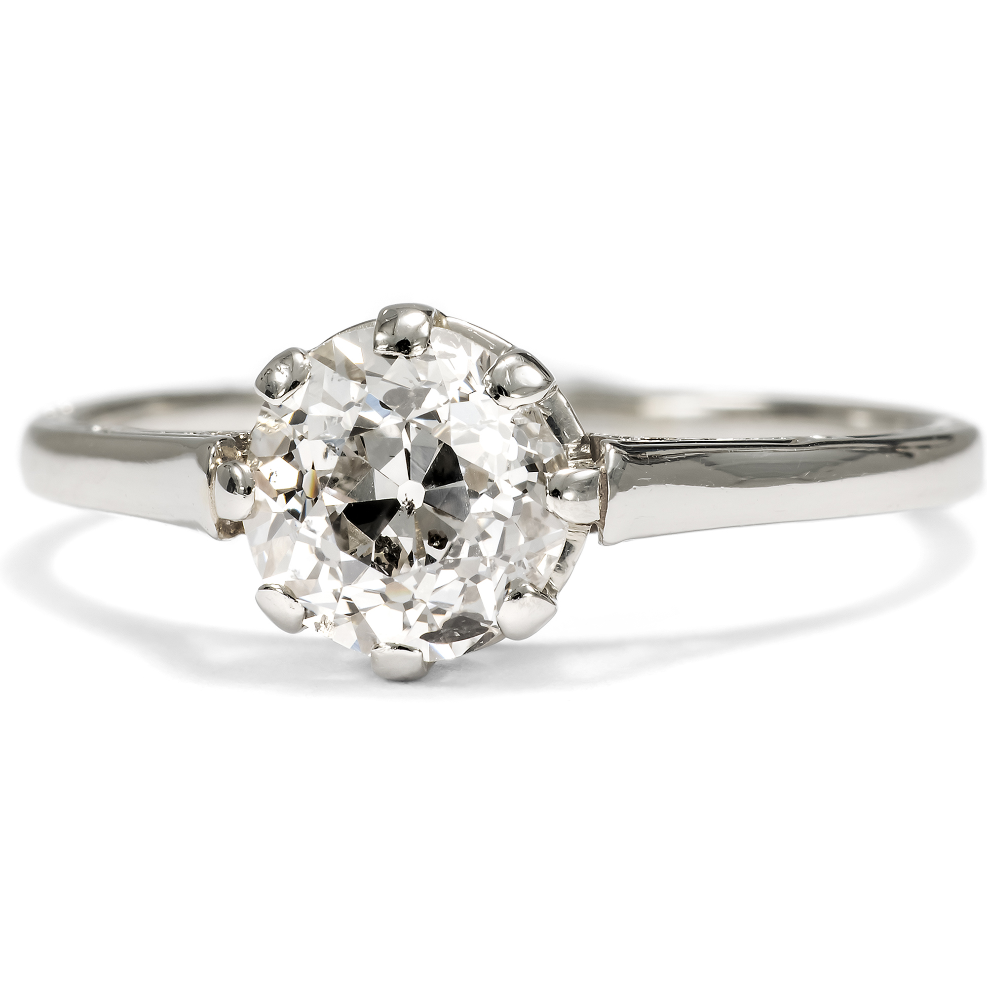 Schon seit dem späten Mittelalter ist der Brauch bezeugt, zur Verlobung einen Diamantring zu überreichen. Allerdings war dieser härteste aller Edelsteine stets eine ausgesprochene Kostbarkeit und beinahe ausschließliches Privileg des Adels. Erst nachdem im späten 19. Jahrhundert ergiebige Vorkommen in Südafrika entdeckt worden waren, konnten sich auch breitere Bevölkerungsschichten Diamantschmuck leisten. Der klassische Solitärring, also ein Ring mit nur einem Diamanten in schlichter Krappenfassung, soll auf einen Entwurf des berühmten Juweliers Tiffany & Co. aus dem Jahr 1886 zurückgehen. Bis heute ist diese Form des Rings Inbegriff des Verlobungsrings geblieben. Denn in ihm bündelt sich die gesamte Zeichenhaftigkeit, die man von einem Schmuckstück erwarten kann, dem ein Versprechen zugrunde liegt. Ein solcher Solitärring ist auch das vorliegende Schmuckstück aus der Zeit um 1925, das einen Diamanten in einer luftigen Krappenfassung hält. Der funkelnde Diamant im Altschliff, dem sog. „Old European Cut“, hat ein Gewicht von sehr genau 1,00 Karat. Die Fassung besteht aus Weißgold, und aufgrund der individuellen Proportionen des Diamanten nehmen wir an, dass der Stein bereits im späten 19. Jahrhundert geschliffen wurde – und etwa zwei Generationen später für diesen Ring ausgewählt wurde. Der Ring selbst ist von Hand gefertigt und schauseitig schlicht und zurückhaltend gestaltet. Seine Seitenpartien allerdings sind fein graviert und im Bereich der Ringschultern durchbrochen, ohne dass die Aufmerksamkeit vom schönen Diamanten abgelenkt wird. Der romantische Ring eignet sich ganz wunderbar als Verlobungsring. Er fand hier in Berlin zu uns.