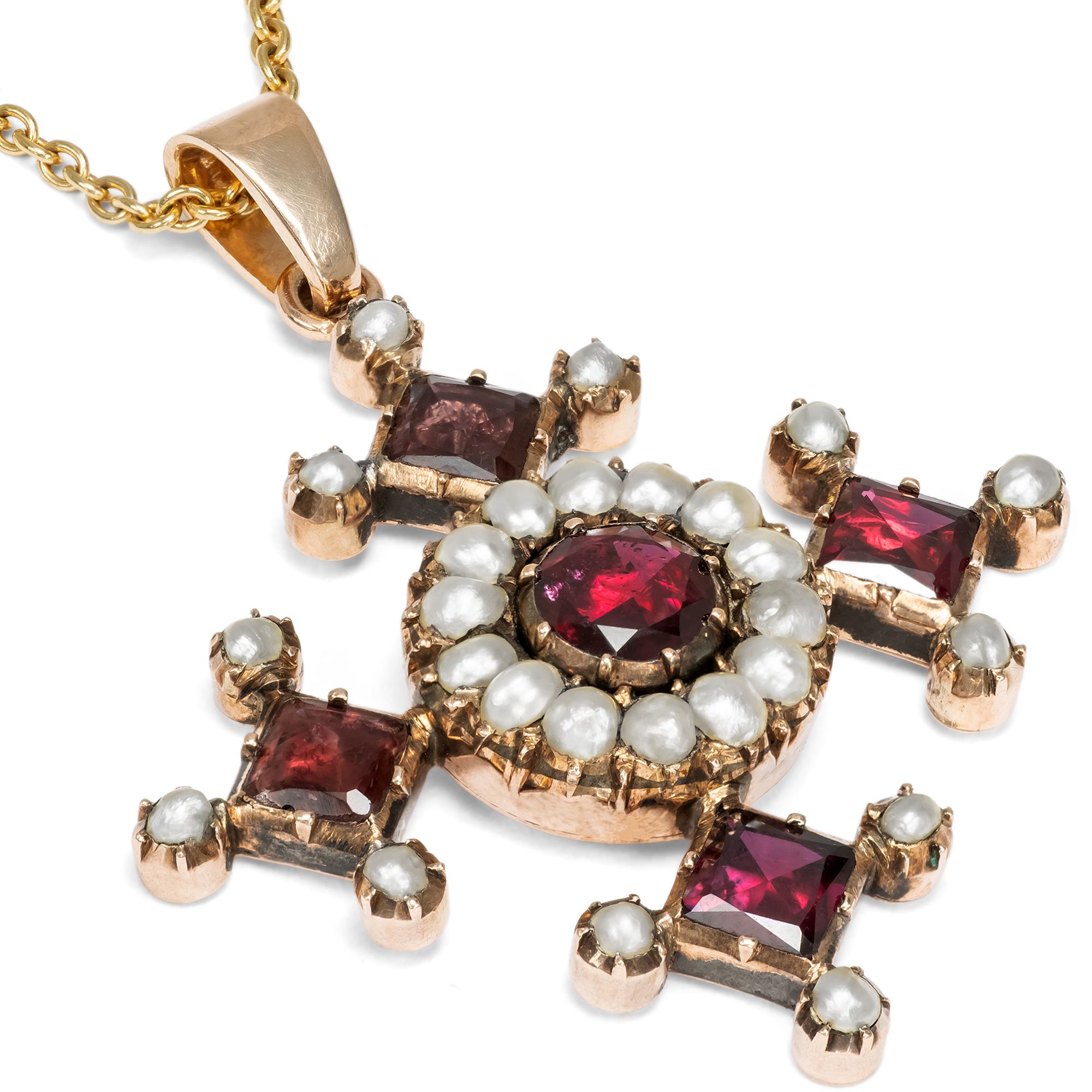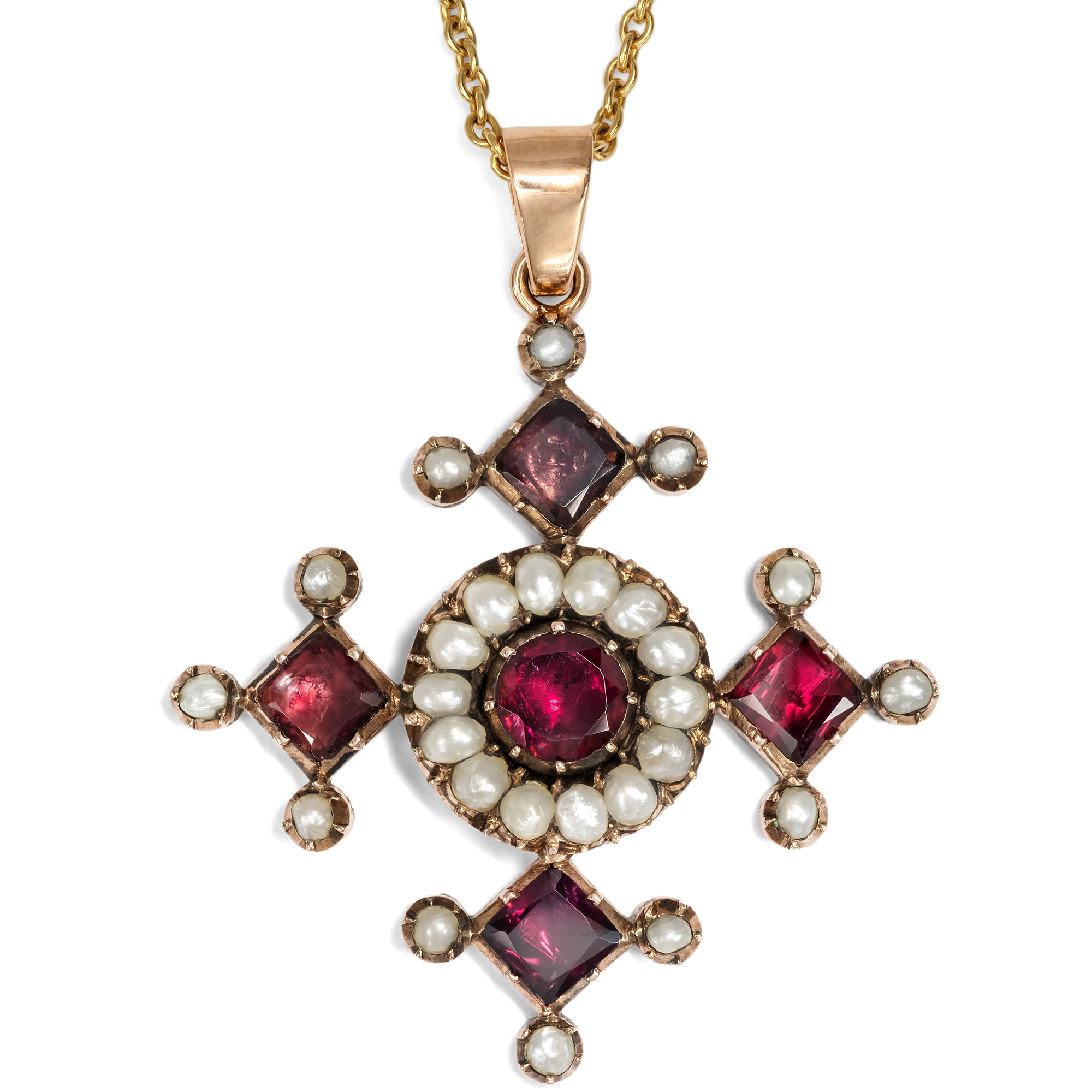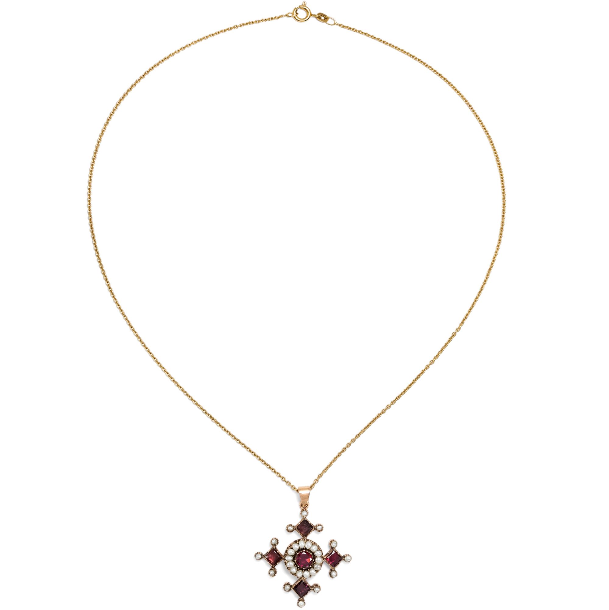 Anhänger in Kreuzform waren im späten 18. und frühen 19. Jahrhundert im Schmuckkästchen beinahe jeder Dame zu finden. Neben dem offensichtlichen Bekenntnis zum christlichen Glauben waren sie zugleich Modestatements, denn es gab sie in allen nur erdenklichen Ausführungen: Von schlichten Silberkreuzen bis hin zu kostbaren Kreuzen aus Diamant folgten sie nicht nur dem persönlichen Budget, sondern ebenfalls den Launen der Mode. In den Jahrzehnten nach 1800 waren in ganz Europa dabei besonders Kreuze mit flach geschliffenen, roten Granaten aus Indien modern, deren Arme ebenso hoch wie breit sind und sich nach außen verbreitern. Im Bereich des Schmucks finden sich zahlreiche Anhänger in genau dieser Form besonders in Großbritannien, wie sich beim Blick z. B. in Ginny Reddington Dawes / Olivia Collings: Georgian Jewellery 1714-1830, Woodbridge 2007, S. 20, zeigt; auf den Vorsatzpapieren findet sich dabei unten ein Granatcollier abgebildet, dessen zentraler Kreuzanhänger dem hier vorliegenden Kreuz zum Verwechseln ähnlich ist und belegt, dass auch unser Stück in den Jahren um 1820 entstanden ist. Vermutlich war auch unser Kreuz einmal Bestandteil eines größeren Ensembles. Der Anhänger präsentiert dabei fünf schöne Granate in Kombination mit natürlichen Perlen. Die Edelsteine sind zeittypisch vor bunt angemalte Silberfolien gesetzt, die ihre Farbe intensivieren. Wir haben das Kreuz in London entdeckt und um eine passende Goldkette ergänzt, so dass es sofort um den Hals getragen werden kann.