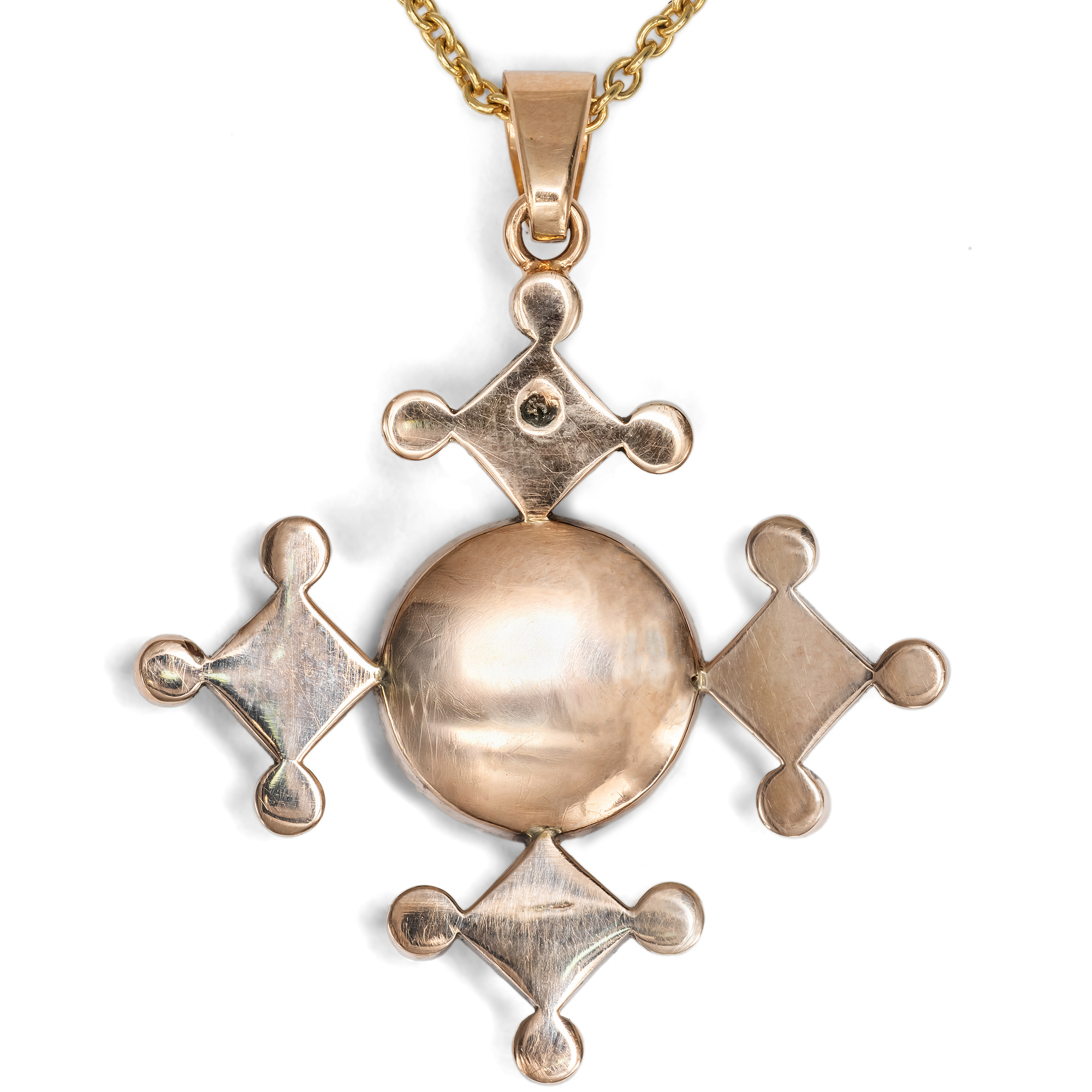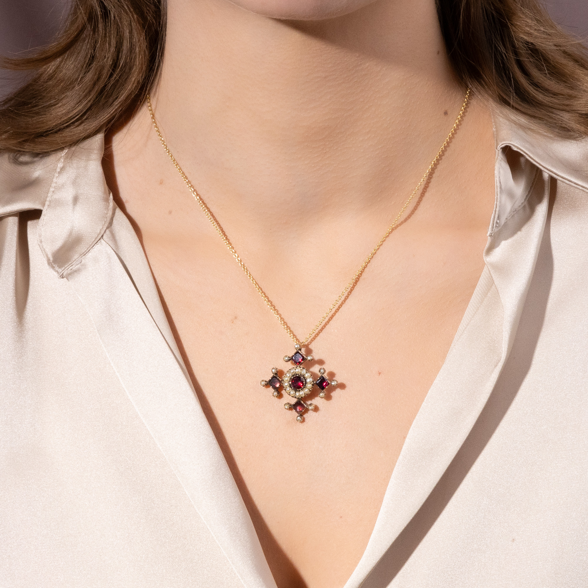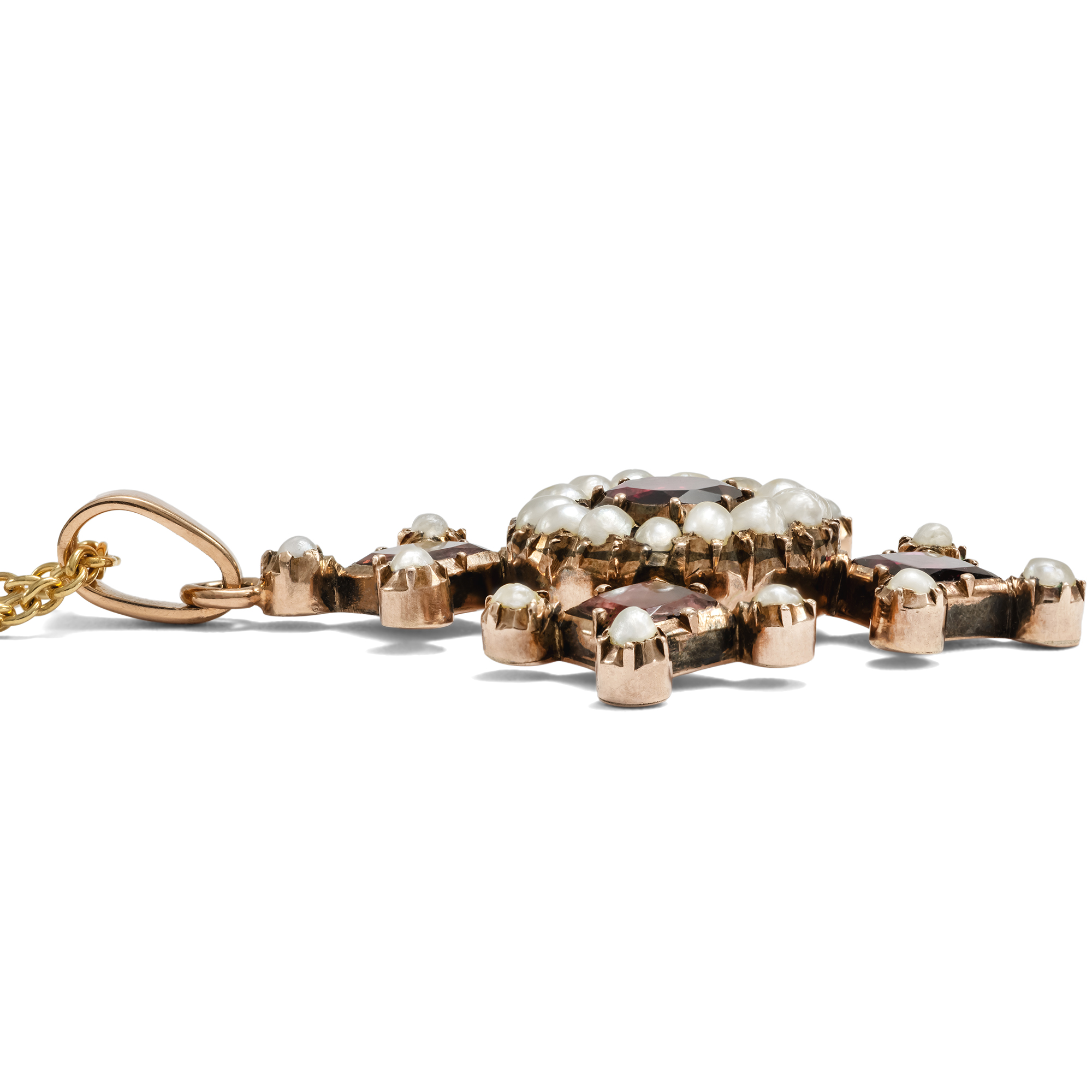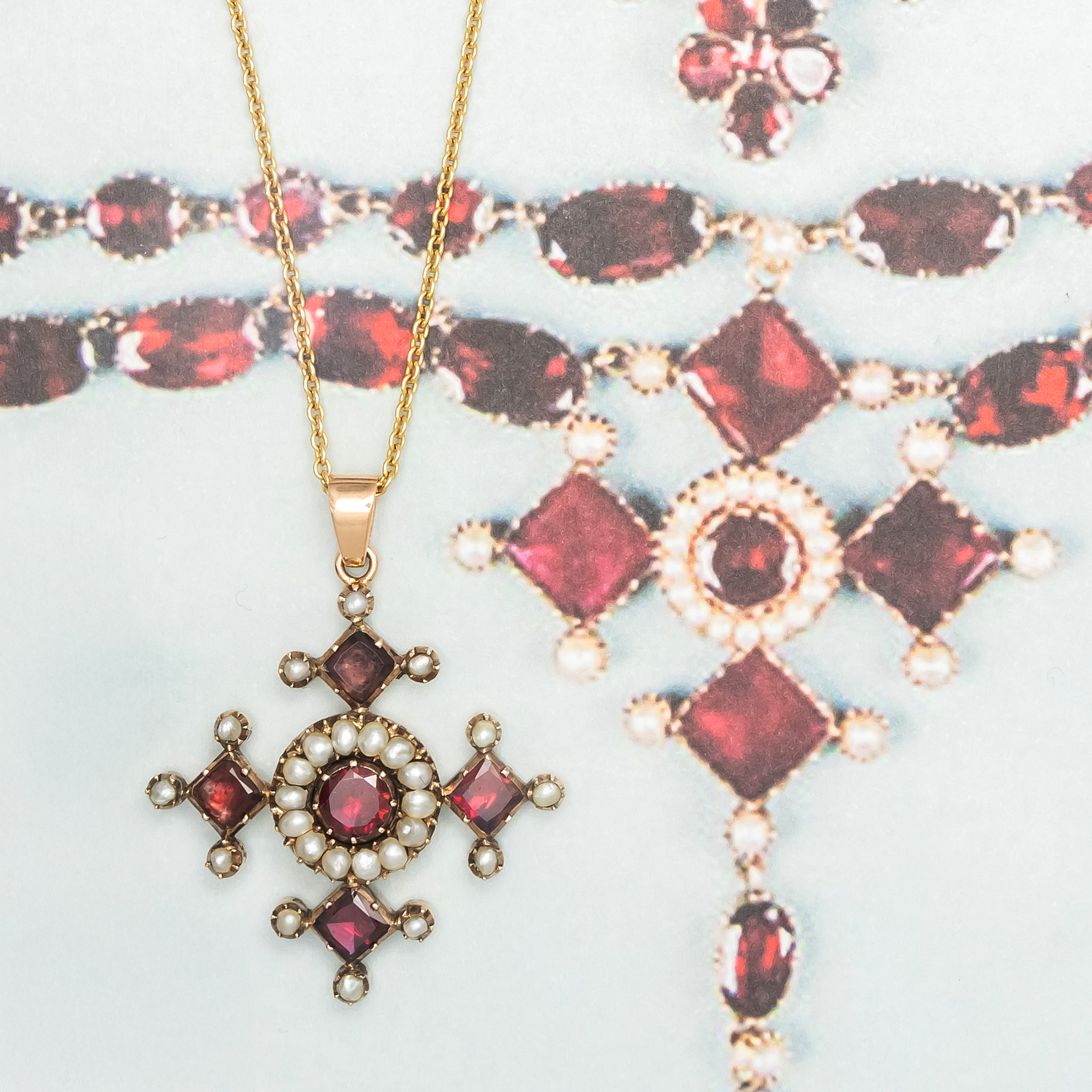 Anhänger in Kreuzform waren im späten 18. und frühen 19. Jahrhundert im Schmuckkästchen beinahe jeder Dame zu finden. Neben dem offensichtlichen Bekenntnis zum christlichen Glauben waren sie zugleich Modestatements, denn es gab sie in allen nur erdenklichen Ausführungen: Von schlichten Silberkreuzen bis hin zu kostbaren Kreuzen aus Diamant folgten sie nicht nur dem persönlichen Budget, sondern ebenfalls den Launen der Mode. In den Jahrzehnten nach 1800 waren in ganz Europa dabei besonders Kreuze mit flach geschliffenen, roten Granaten aus Indien modern, deren Arme ebenso hoch wie breit sind und sich nach außen verbreitern. Im Bereich des Schmucks finden sich zahlreiche Anhänger in genau dieser Form besonders in Großbritannien, wie sich beim Blick z. B. in Ginny Reddington Dawes / Olivia Collings: Georgian Jewellery 1714-1830, Woodbridge 2007, S. 20, zeigt; auf den Vorsatzpapieren findet sich dabei unten ein Granatcollier abgebildet, dessen zentraler Kreuzanhänger dem hier vorliegenden Kreuz zum Verwechseln ähnlich ist und belegt, dass auch unser Stück in den Jahren um 1820 entstanden ist. Vermutlich war auch unser Kreuz einmal Bestandteil eines größeren Ensembles. Der Anhänger präsentiert dabei fünf schöne Granate in Kombination mit natürlichen Perlen. Die Edelsteine sind zeittypisch vor bunt angemalte Silberfolien gesetzt, die ihre Farbe intensivieren. Wir haben das Kreuz in London entdeckt und um eine passende Goldkette ergänzt, so dass es sofort um den Hals getragen werden kann.