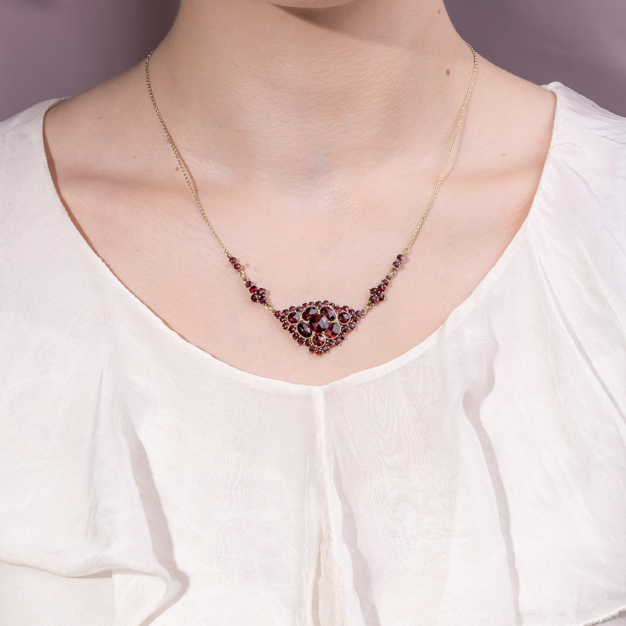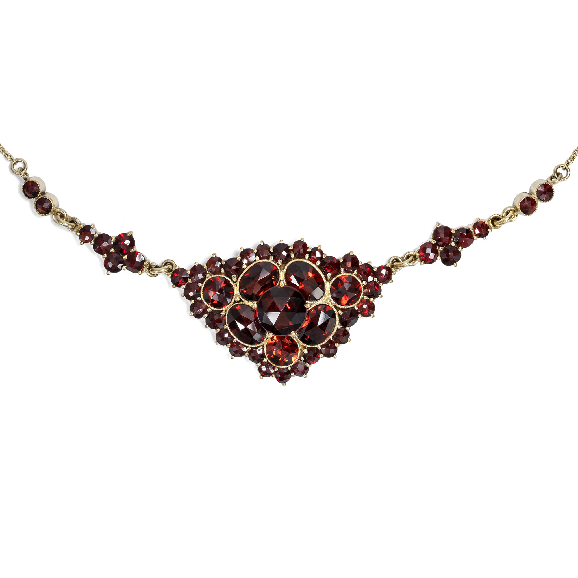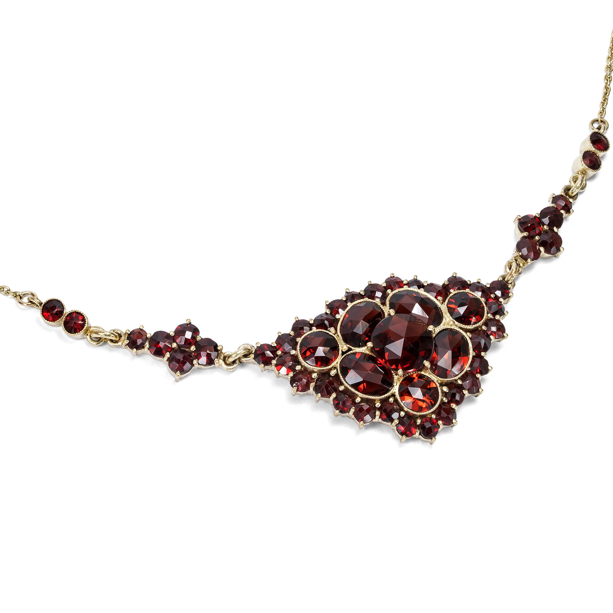 Der Granat wird seit frühesten Zeiten als Schmuckstein geliebt. Im Mittelalter waren dunkelrote Granate unter dem Begriff „Karfunkelsteine“ bekannt. Der Ursprung dieses Wortes ist lateinisch: Carfunculus bedeutet soviel wie kleine, funkelnde oder rotglühende Kohle und bezeichnet den rot schimmernden Granat, der besonders im Sonnenlicht seine tiefe Farbe entfaltet. Am meisten verwendet wurden im 19. Jahrhundert die dunkelroten Pyrop-Granate, die wir auch in dem hier vorgestellten Schmuckstück wiederfinden. Diese Edelsteine erfreuen mit tiefer und satter Farbe. Das Collier der Jahre um 1940 zeigt ein mittig an einer zarten Ankerkette ein großes Zierelemente mit einem blütenförmigen Arrangement aus Granaten. Gefasst sind die Karfunkelsteine in sogenanntem „Norm-Metall“, einer heute ungebräuchlichen Legierung mit einem Goldanteil von 250/000, so dass man hier auch von „Viertelgold" spricht. Dieses niedrigkarätige Gold war besonders vor dem zweiten Weltkrieg häufig bei Granatschmuck zu finden, weshalb es auch „Granatengold“ genannt wurde. Aufgrund eines rückseitigen deutschen Stempels, der sog. „Laurinmarke“, können wir das Collier in die Jahre zwischen 1936 und 1945 datieren. Das Collier ist sehr gut erhalten und fand hier in Berlin zu uns. Da der Granat als Schmuckstein relativ unempfindlich ist, kann einmal erworbener Granatschmuck Begleiter für ein ganzes Leben sein.