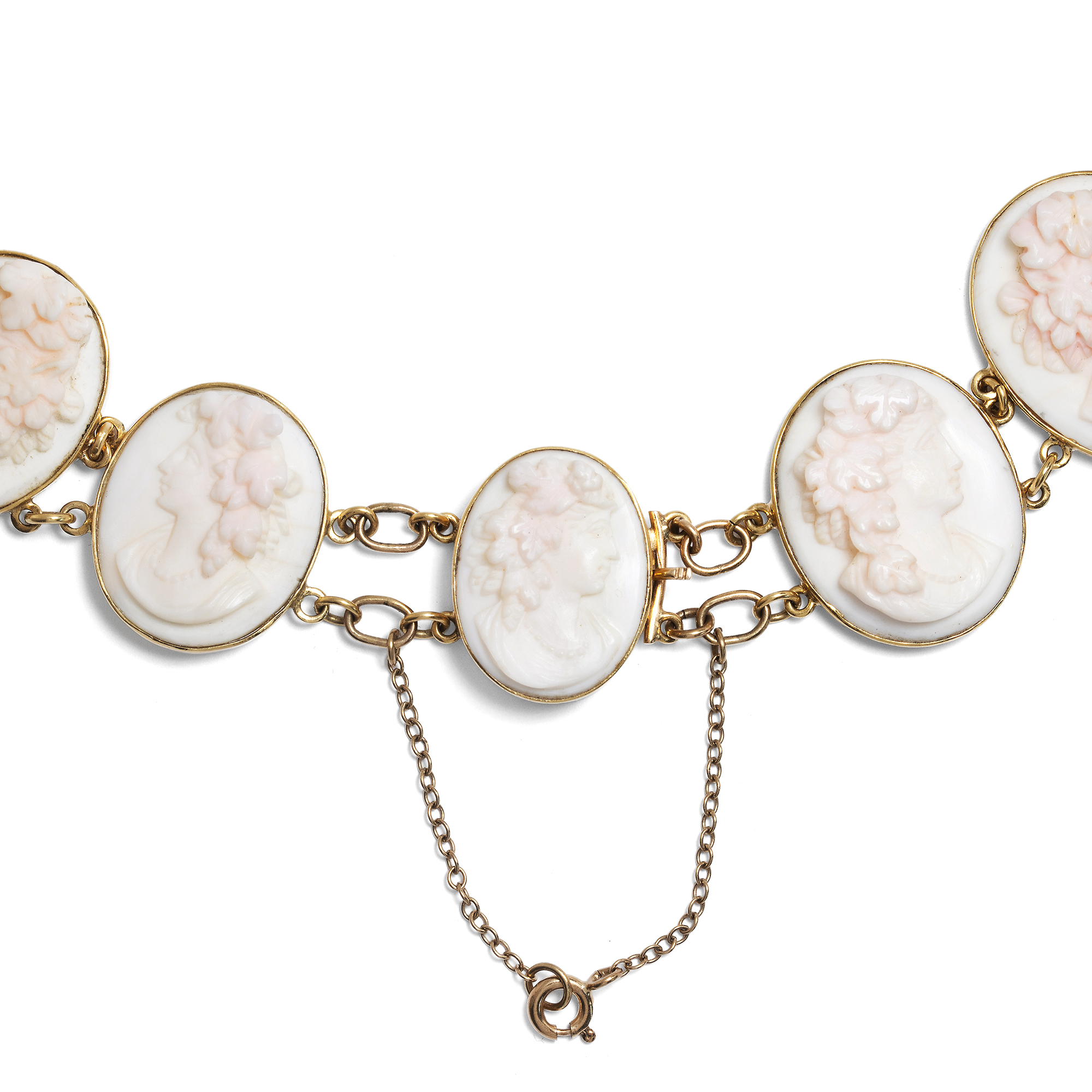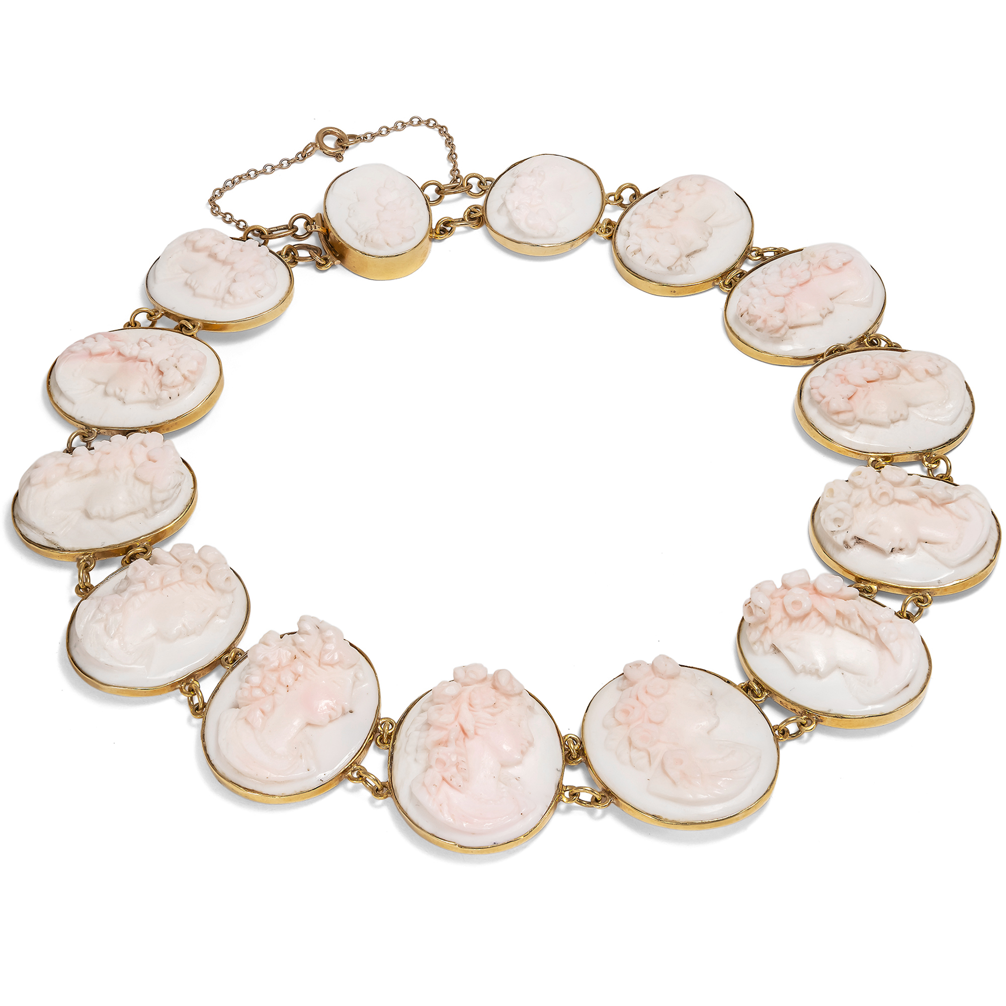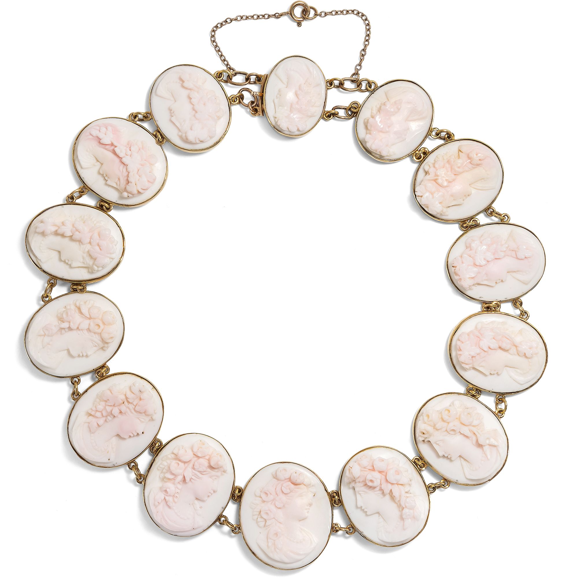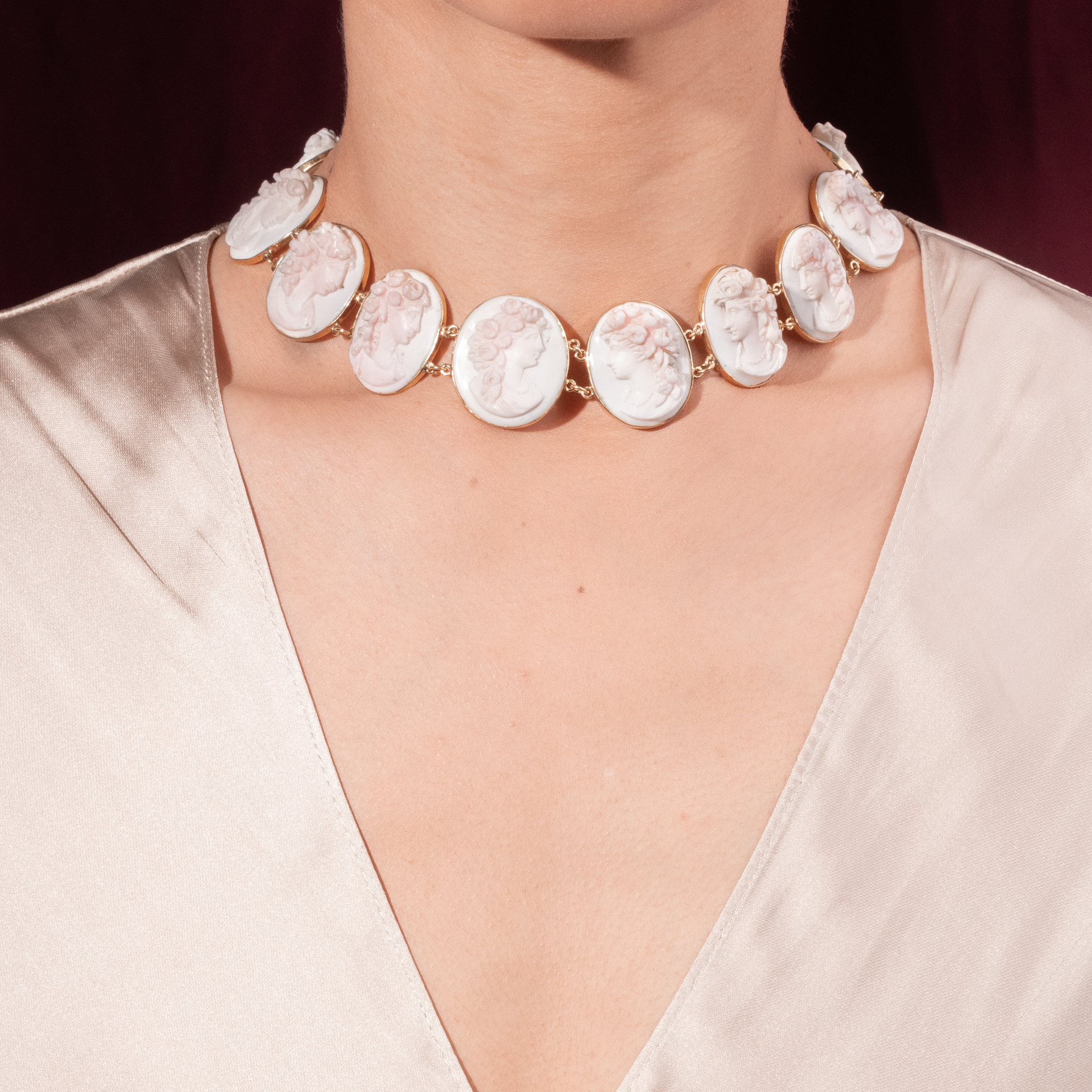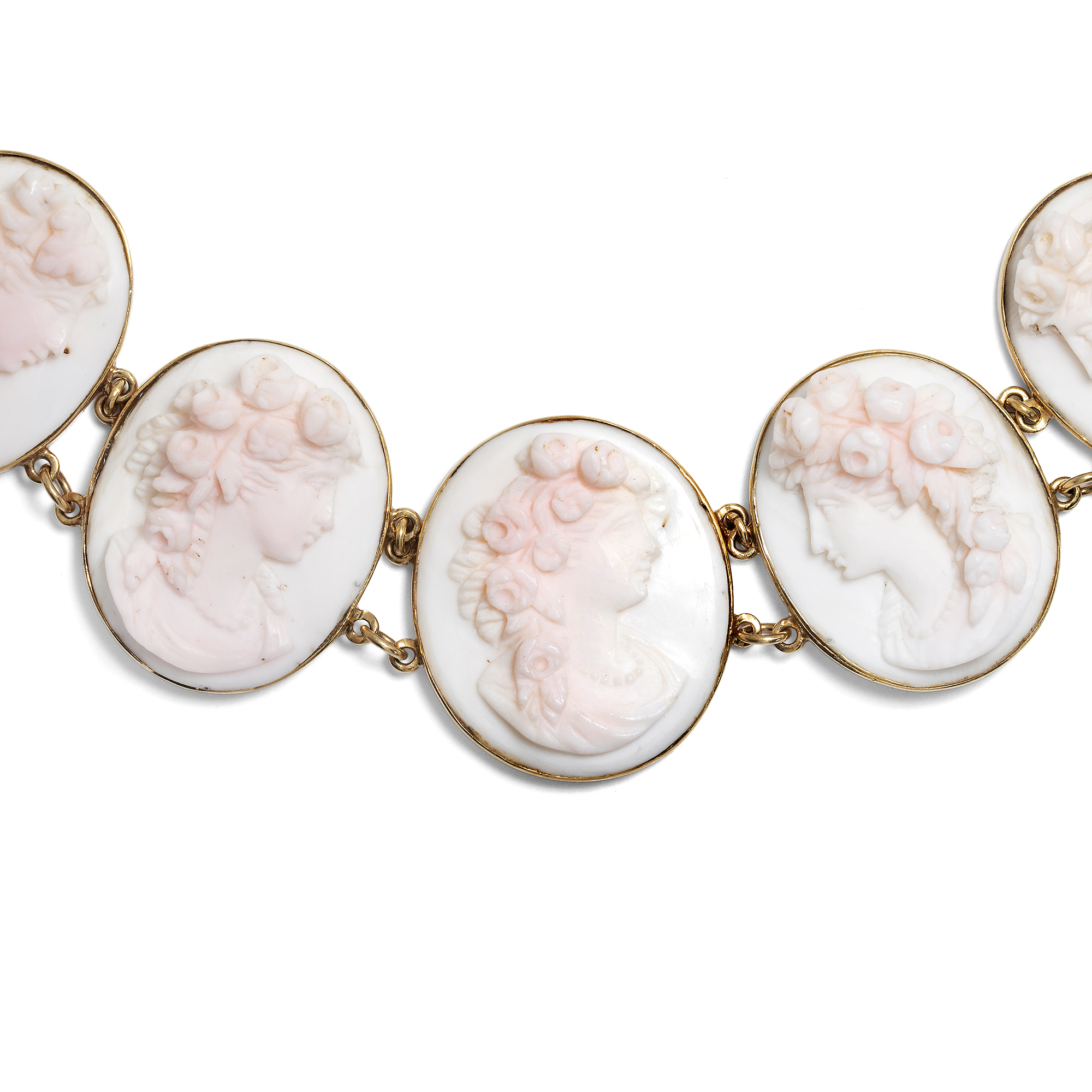 Vierzehn perlengeschmückte Frauen sind hier als Gemmen verewigt. Einige von ihnen tragen üppige Rosen im Haar, andere Weinlaub. Es sind idealisierte Darstellungen der Frühlingsgöttin Flora mit ihrem Attribut des Rosenschmucks sowie weinlaubbekränzte Bacchantinnen aus dem Gefolge des Weingottes Bacchus, die sich hier, von schlichten Goldfassungen gehalten, zu einem prachtvollen Collier aufreihen. Ungewöhnlich und besonders schön ist die Ausführung der Gemmen in rosafarbener Conch-Schale. Die im Ursprung karibische Conch-Schnecke wurde für Gemmen deutlich seltener verwendet als die Rote Helmschnecke oder auch die rote Koralle aus dem Mittelmeer. Conch-Schale wurde von den fernen westindischen Inseln importiert und dann in Italien zu Gemmen verarbeitet. Hier wurden die Schnitzereien dann entweder von Touristen auf der Grand Tour erworben, oder aber exportiert und von europäischen Juwelieren als Schmuck gefasst. Eine Conch-Parure derselben Zeit findet sich beispielsweise im British Museum . Die Höhen der detailreichen Darstellungen erzeugen ein reiches Licht- und Schattenspiel und geben ihnen eine erstaunliche Tiefe. Das wunderbar erhaltene Schmuckstück ist in den Jahren um 1870 entstanden, nur wenige Jahre nachdem Conch-Schalen erstmals nach Europa eingeführt und zu Schmuck verarbeitet worden waren. Mit seinen antikisierenden Darstellungen und Motiven fügt es sich in die Mode jener Jahre, die historische Zitate in Schmuck- und Kleiderentwürfen schätzte.