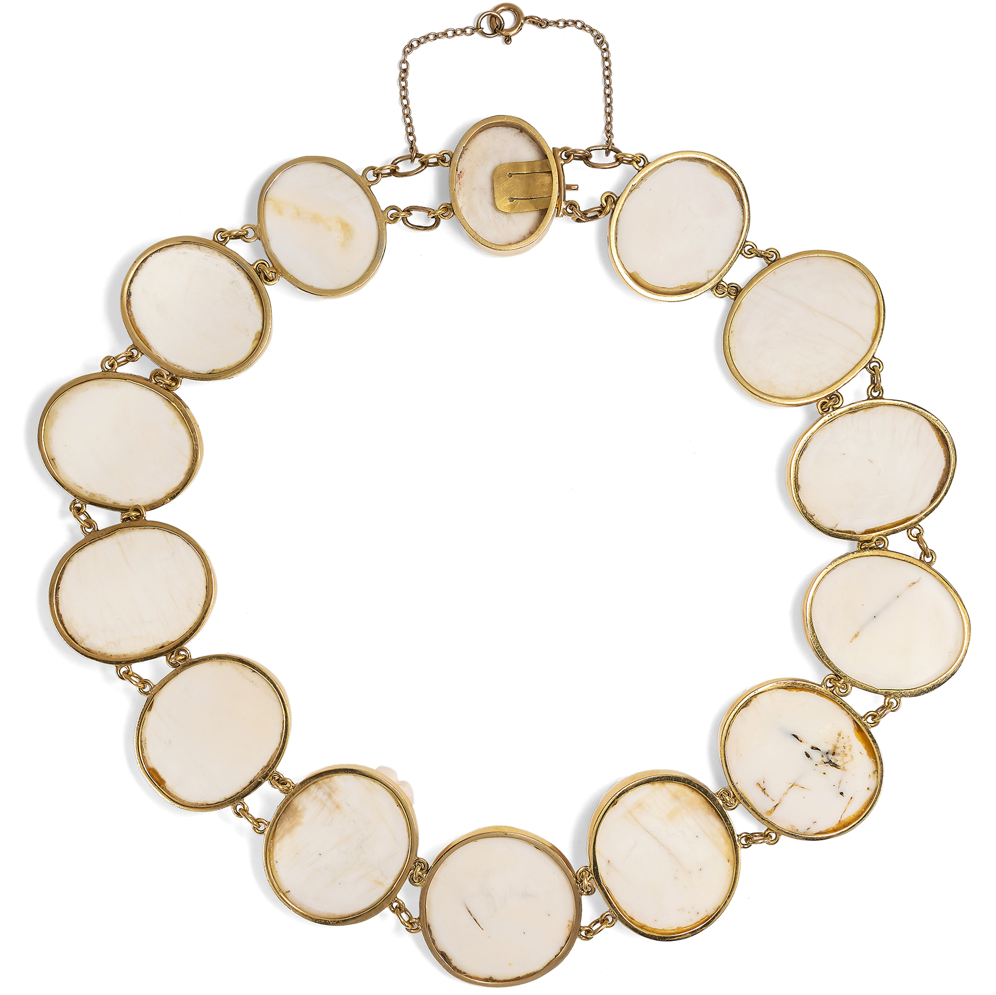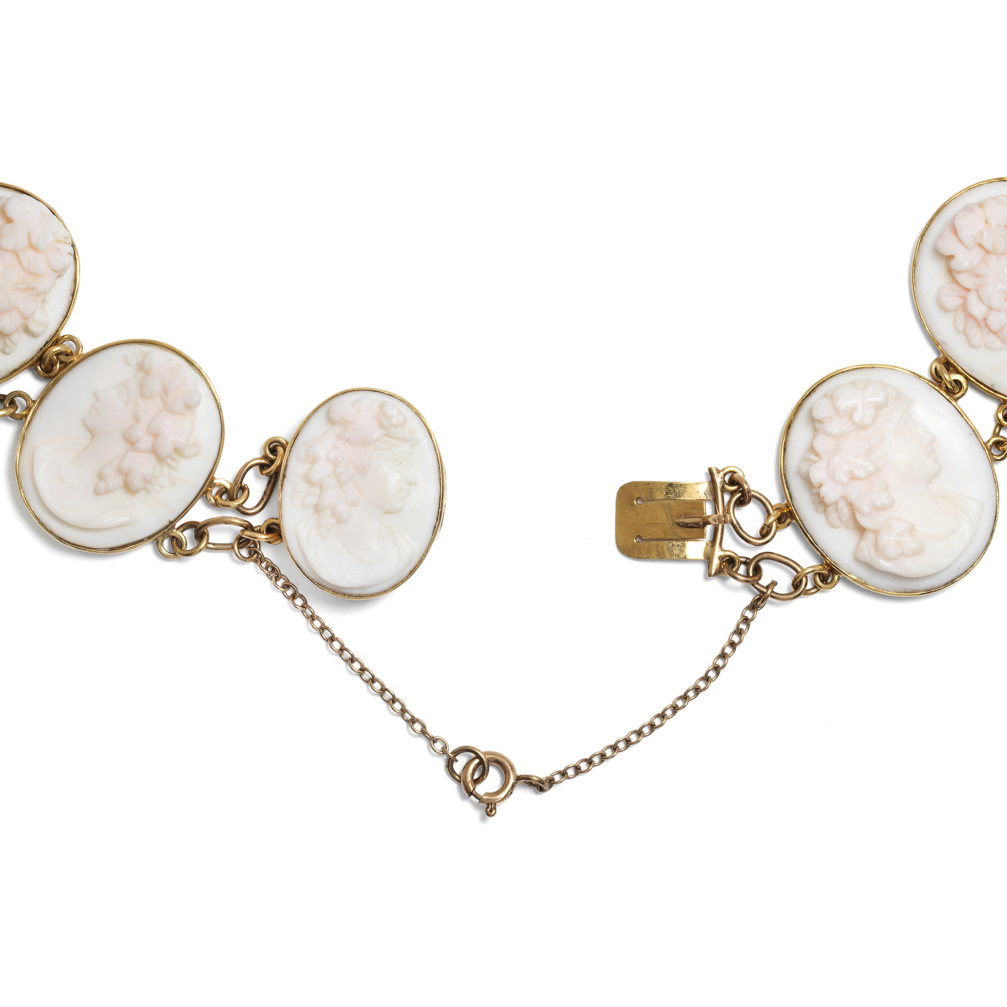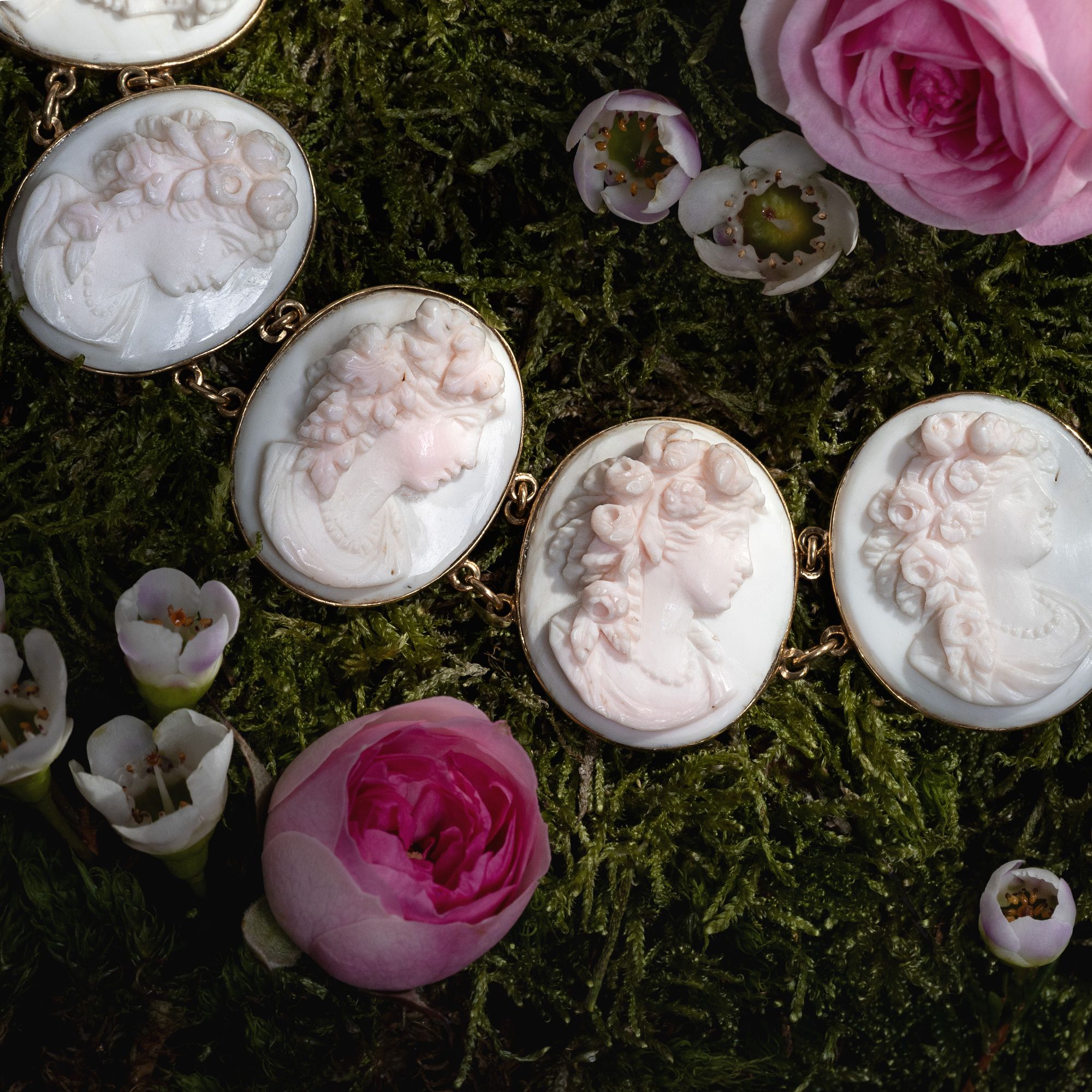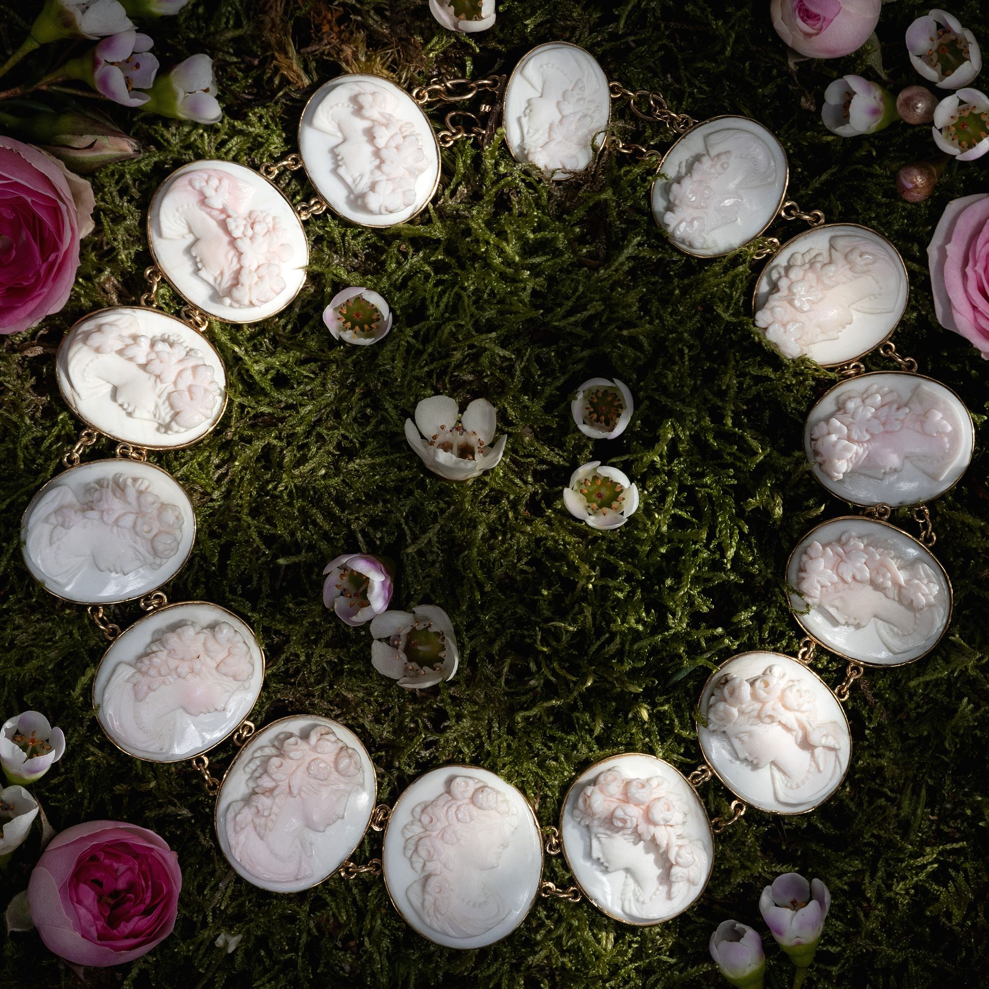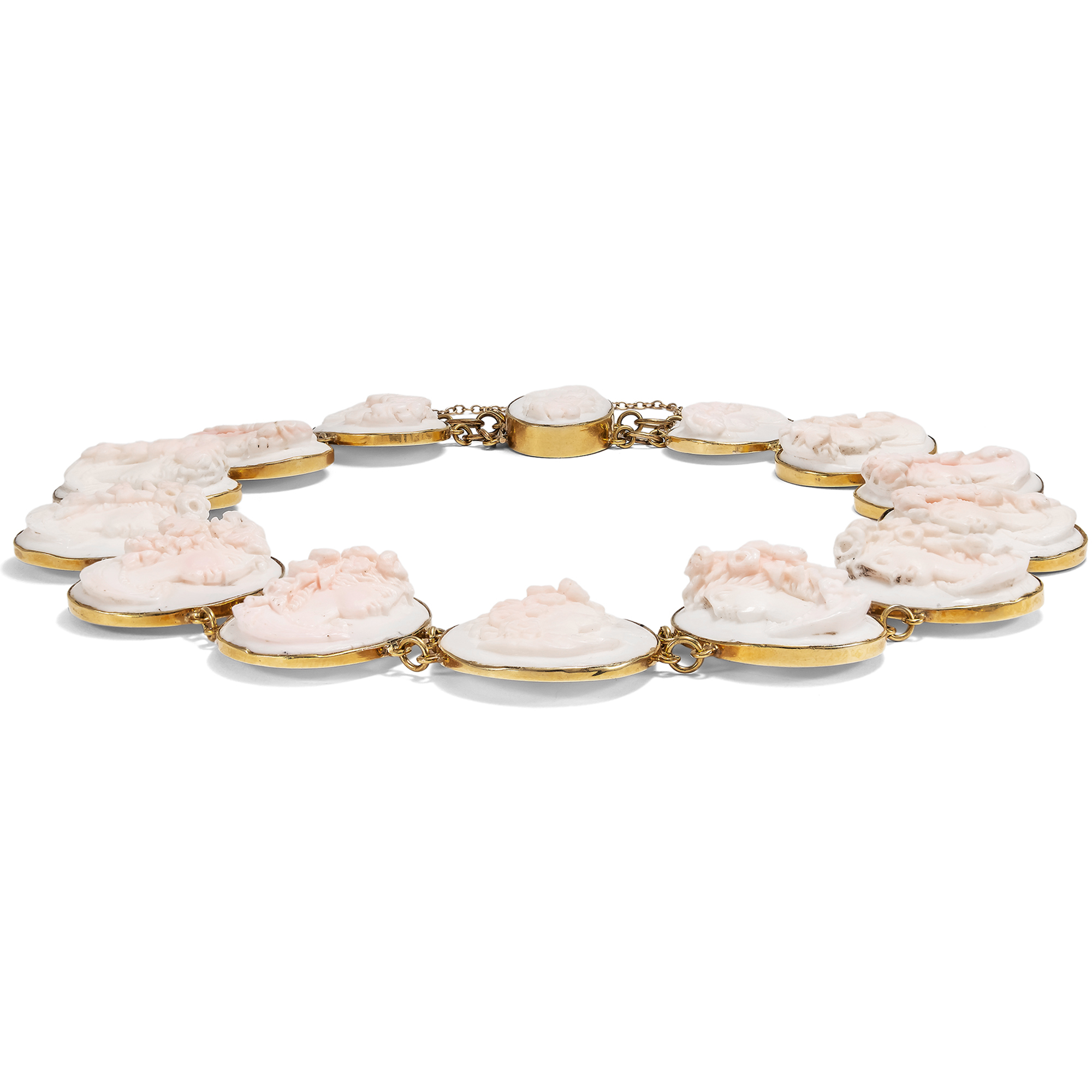 Vierzehn perlengeschmückte Frauen sind hier als Gemmen verewigt. Einige von ihnen tragen üppige Rosen im Haar, andere Weinlaub. Es sind idealisierte Darstellungen der Frühlingsgöttin Flora mit ihrem Attribut des Rosenschmucks sowie weinlaubbekränzte Bacchantinnen aus dem Gefolge des Weingottes Bacchus, die sich hier, von schlichten Goldfassungen gehalten, zu einem prachtvollen Collier aufreihen. Ungewöhnlich und besonders schön ist die Ausführung der Gemmen in rosafarbener Conch-Schale. Die im Ursprung karibische Conch-Schnecke wurde für Gemmen deutlich seltener verwendet als die Rote Helmschnecke oder auch die rote Koralle aus dem Mittelmeer. Conch-Schale wurde von den fernen westindischen Inseln importiert und dann in Italien zu Gemmen verarbeitet. Hier wurden die Schnitzereien dann entweder von Touristen auf der Grand Tour erworben, oder aber exportiert und von europäischen Juwelieren als Schmuck gefasst. Eine Conch-Parure derselben Zeit findet sich beispielsweise im British Museum . Die Höhen der detailreichen Darstellungen erzeugen ein reiches Licht- und Schattenspiel und geben ihnen eine erstaunliche Tiefe. Das wunderbar erhaltene Schmuckstück ist in den Jahren um 1870 entstanden, nur wenige Jahre nachdem Conch-Schalen erstmals nach Europa eingeführt und zu Schmuck verarbeitet worden waren. Mit seinen antikisierenden Darstellungen und Motiven fügt es sich in die Mode jener Jahre, die historische Zitate in Schmuck- und Kleiderentwürfen schätzte.