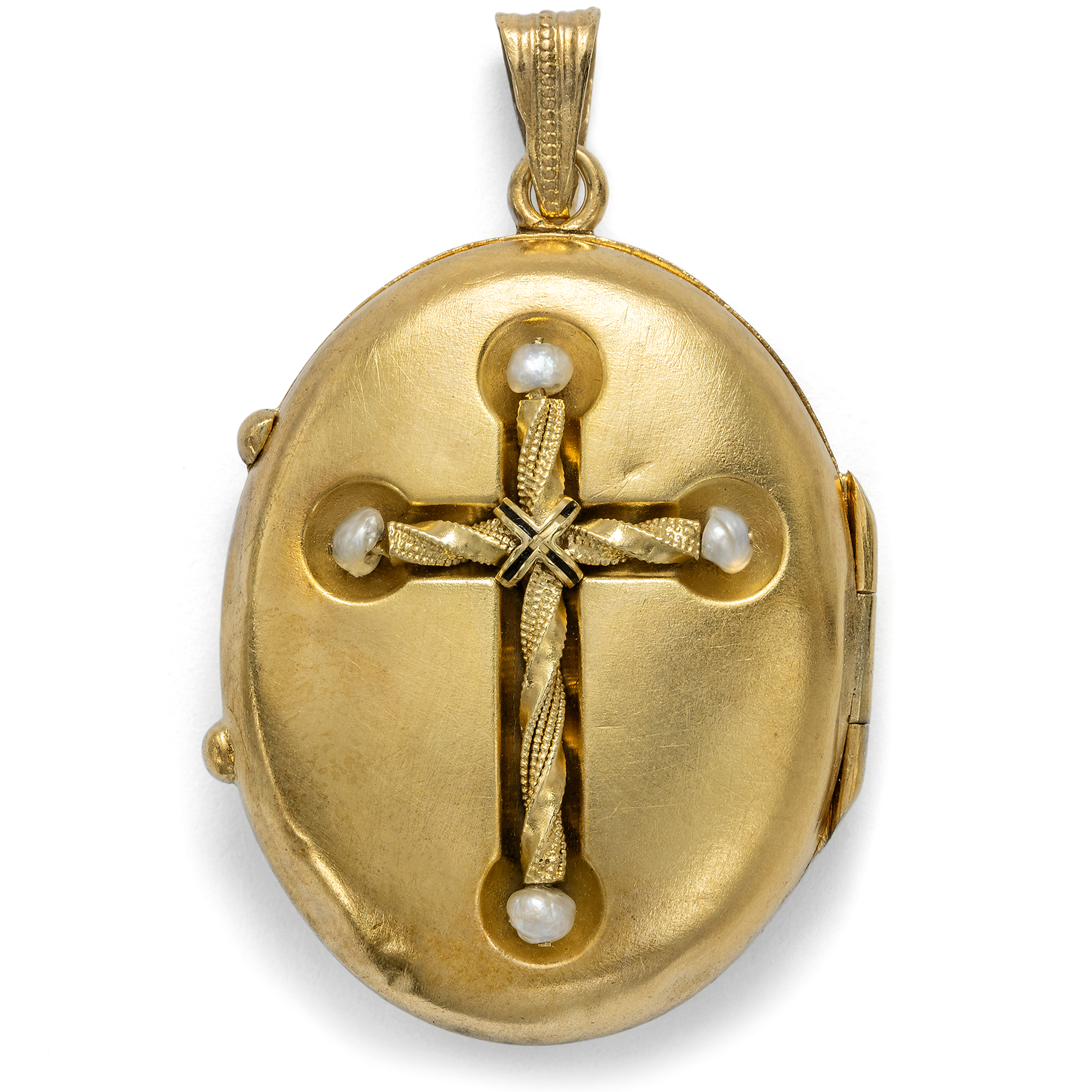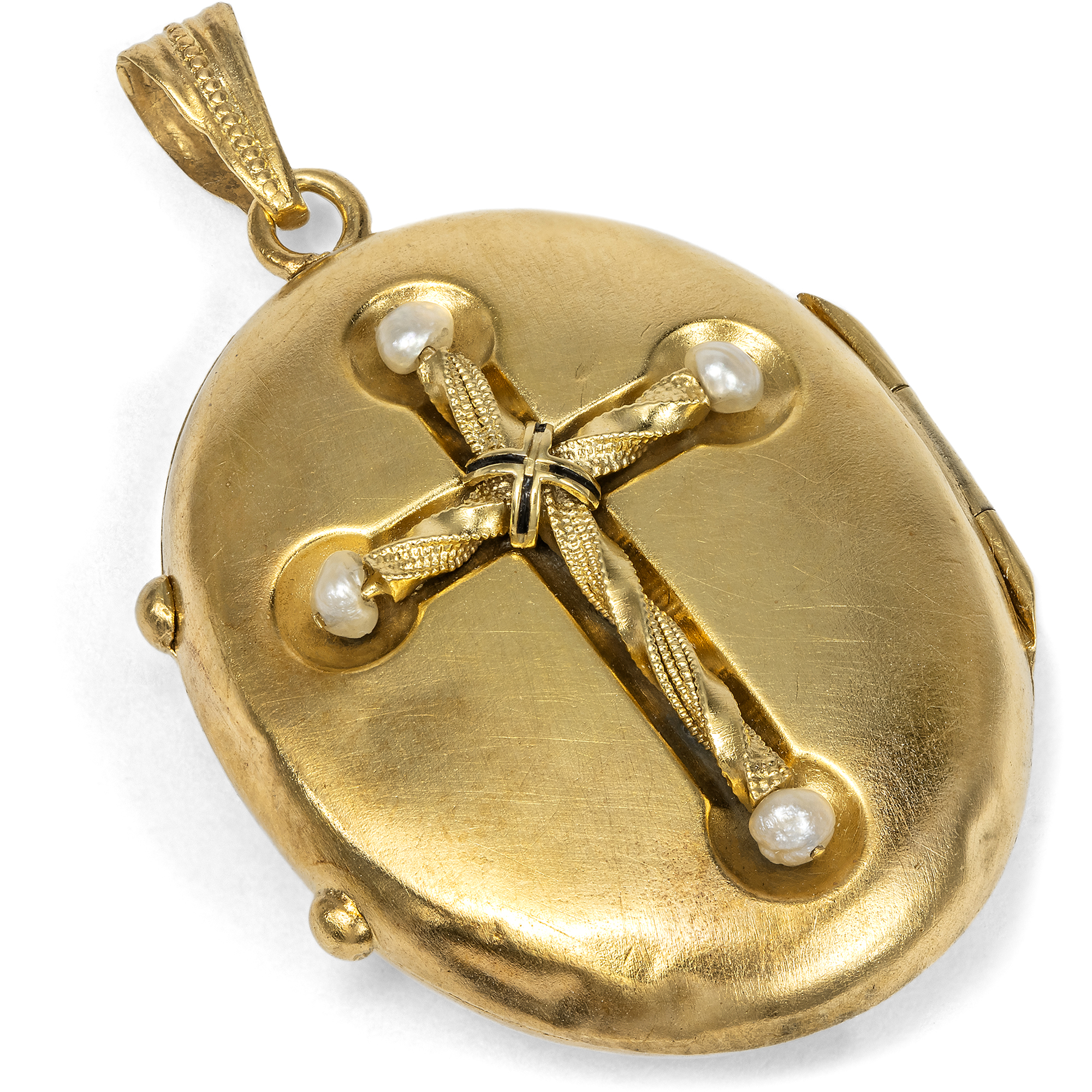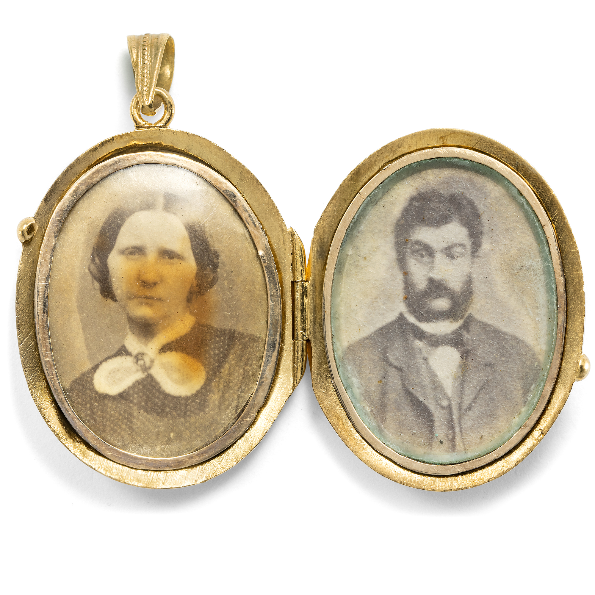 Die Schmuckkultur des 19. Jahrhunderts hielt eine große Vielzahl unterschiedlicher Schmuckstücke bereit, um Freunden, lieben Verwandten, sinhren Kindern oder beklagten Verstorbenen zu gedenken. Gerade Haar als besonders persönliches Material wurde im 18. und 19. Jahrhundert oft verwendet, um Liebesgaben oder Erinnerungsstücke an Freundschaften herzustellen. Medaillons und verschiedenste Amulette zeugen noch heute von dieser Tradition. Das hier vorliegende Medaillon ist so ein Stück. Der ovale Anhänger aus Gold lässt sich aufklappen und gibt dort den Blick frei auf durch Glas geschützte Rähmchen mit zwei historischen Fotografien. Auf dem vorderen Deckel befindet sich ein aufgelegtes Kreuz. An seinen Enden schimmern jeweils eine natürliche Perle, welche die Erinnerung an die im Inneren verwahrten Personen festhält und so die Aufgabe des Schmuckstücks versinnbildlicht. Perlen finden sich häufig auf Trauer- und Erinnerungsschmuckstücken, symbolisieren sie doch vergossenene Tränen. Das Medaillon ist in den Jahren um 1870 herum entstanden. Ovale, etwas bauchige Medaillons aus samtig schimmerndem Gold waren in den 1860er und 1870er Jahren eine große Mode. Ein zeitgenössischer Katalog der Londoner Firma Streeter aus dem Jahr 1870 zeigt, in welcher Vielfalt der Formen solche Stücke damals entstanden, vgl. online auch hier. Das Medaillon fand aus Bonn zu uns. Es kann wunderbar zum Aufbewahren neuer Erinnerungen dienen.