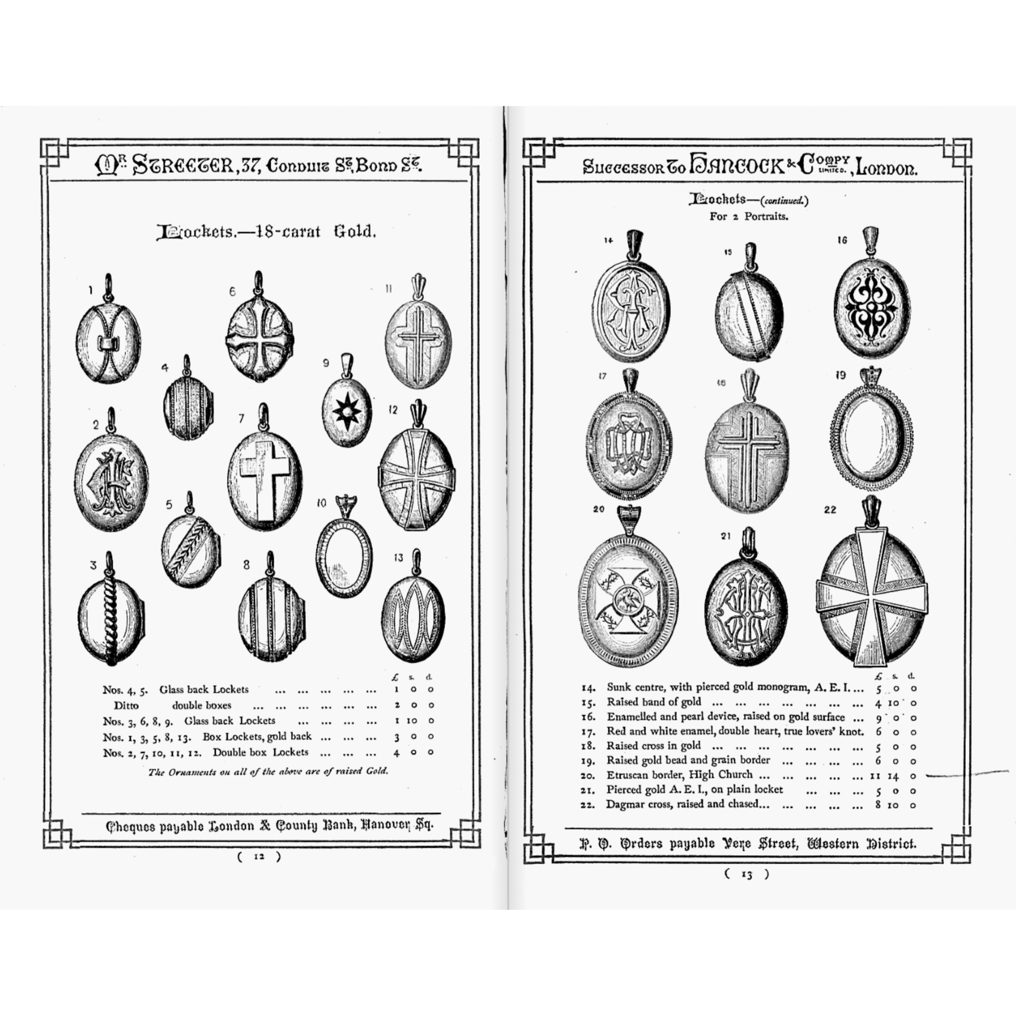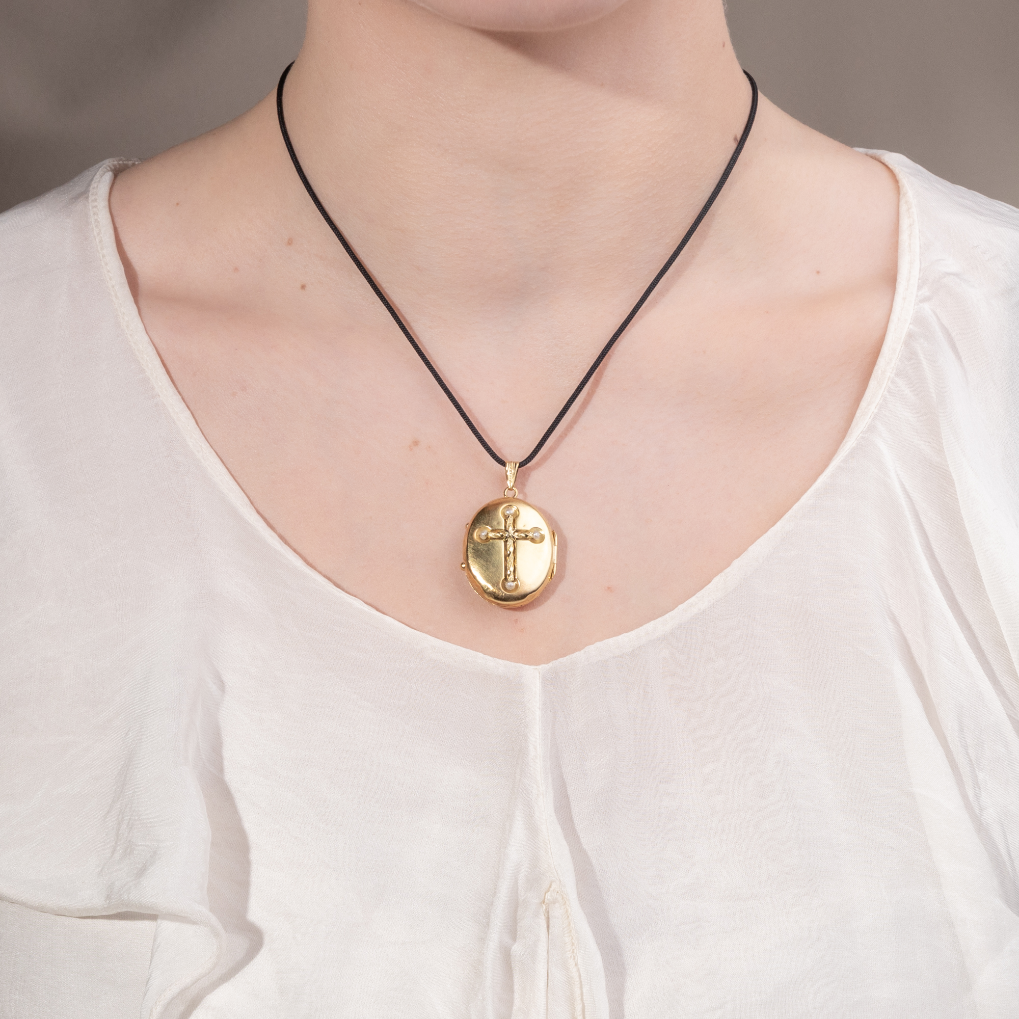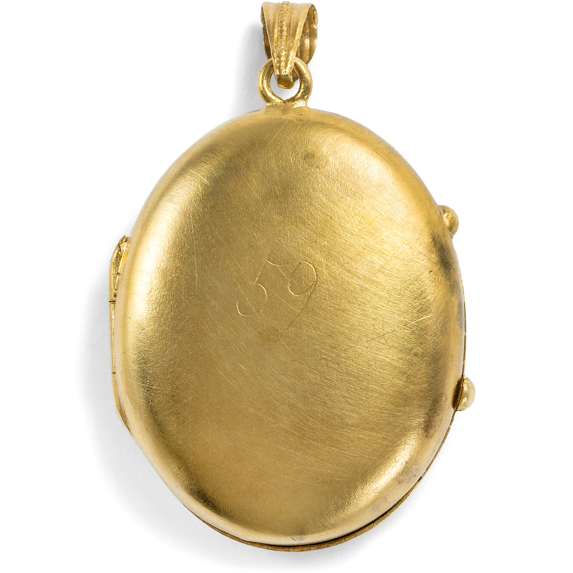 Die Schmuckkultur des 19. Jahrhunderts hielt eine große Vielzahl unterschiedlicher Schmuckstücke bereit, um Freunden, lieben Verwandten, sinhren Kindern oder beklagten Verstorbenen zu gedenken. Gerade Haar als besonders persönliches Material wurde im 18. und 19. Jahrhundert oft verwendet, um Liebesgaben oder Erinnerungsstücke an Freundschaften herzustellen. Medaillons und verschiedenste Amulette zeugen noch heute von dieser Tradition. Das hier vorliegende Medaillon ist so ein Stück. Der ovale Anhänger aus Gold lässt sich aufklappen und gibt dort den Blick frei auf durch Glas geschützte Rähmchen mit zwei historischen Fotografien. Auf dem vorderen Deckel befindet sich ein aufgelegtes Kreuz. An seinen Enden schimmern jeweils eine natürliche Perle, welche die Erinnerung an die im Inneren verwahrten Personen festhält und so die Aufgabe des Schmuckstücks versinnbildlicht. Perlen finden sich häufig auf Trauer- und Erinnerungsschmuckstücken, symbolisieren sie doch vergossenene Tränen. Das Medaillon ist in den Jahren um 1870 herum entstanden. Ovale, etwas bauchige Medaillons aus samtig schimmerndem Gold waren in den 1860er und 1870er Jahren eine große Mode. Ein zeitgenössischer Katalog der Londoner Firma Streeter aus dem Jahr 1870 zeigt, in welcher Vielfalt der Formen solche Stücke damals entstanden, vgl. online auch hier. Das Medaillon fand aus Bonn zu uns. Es kann wunderbar zum Aufbewahren neuer Erinnerungen dienen.