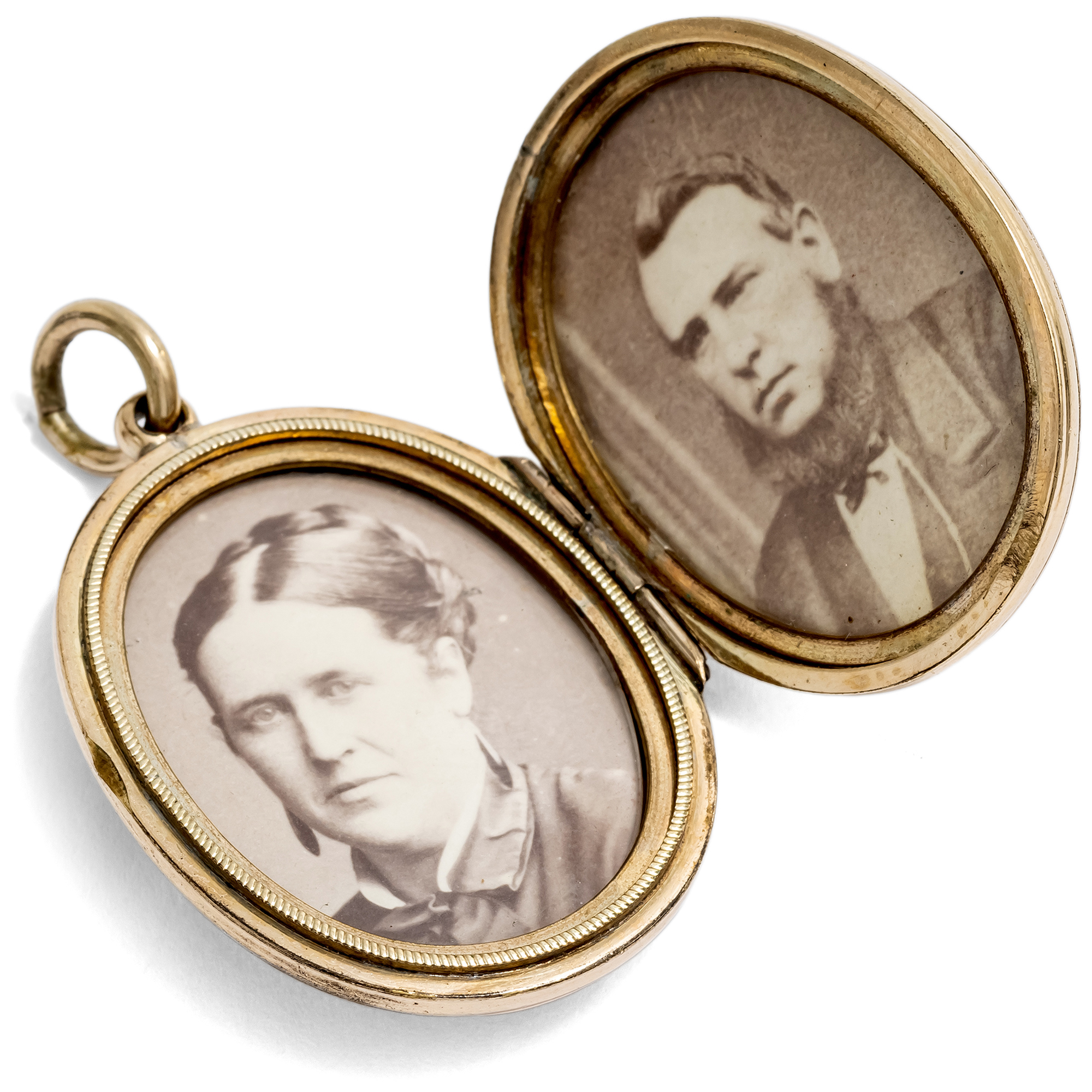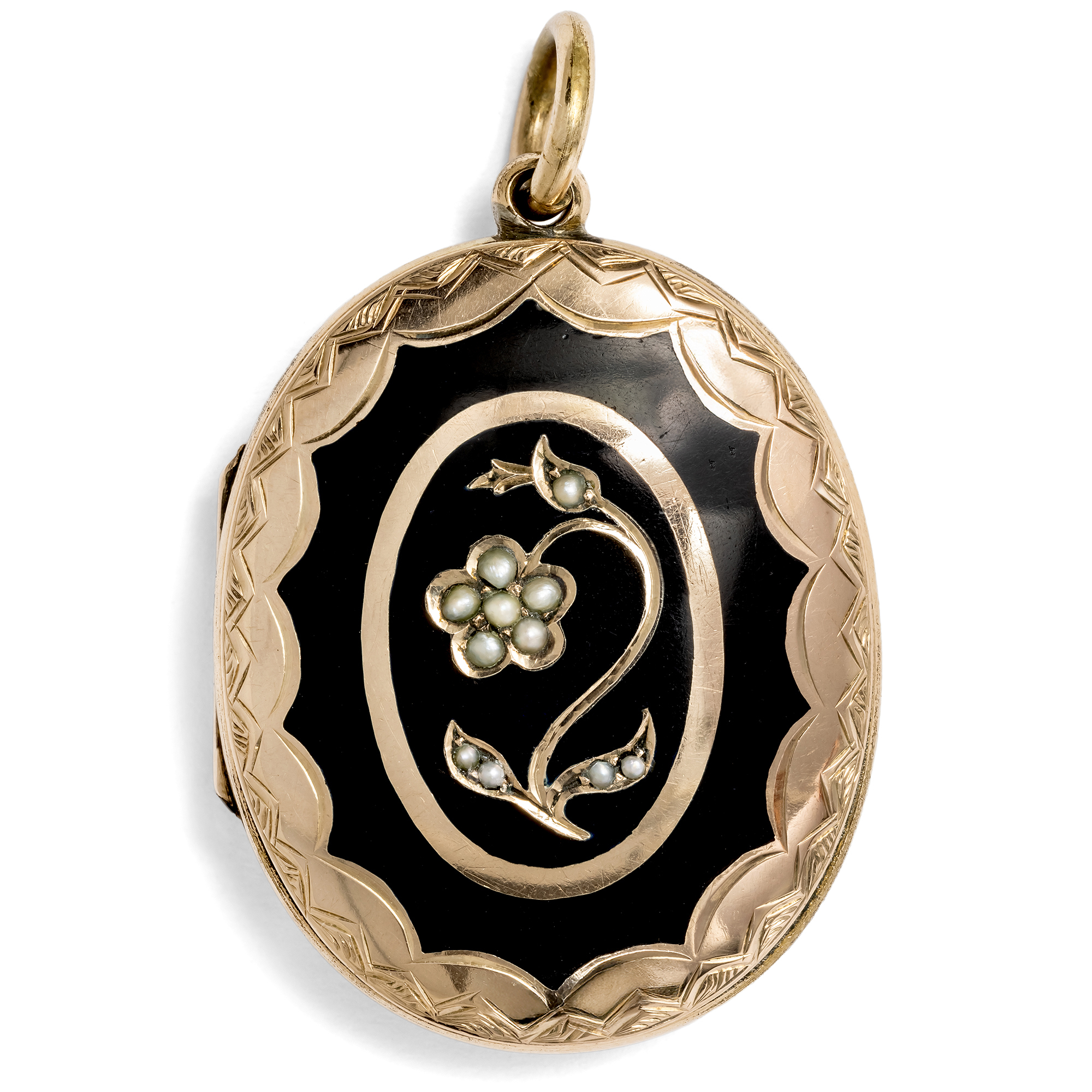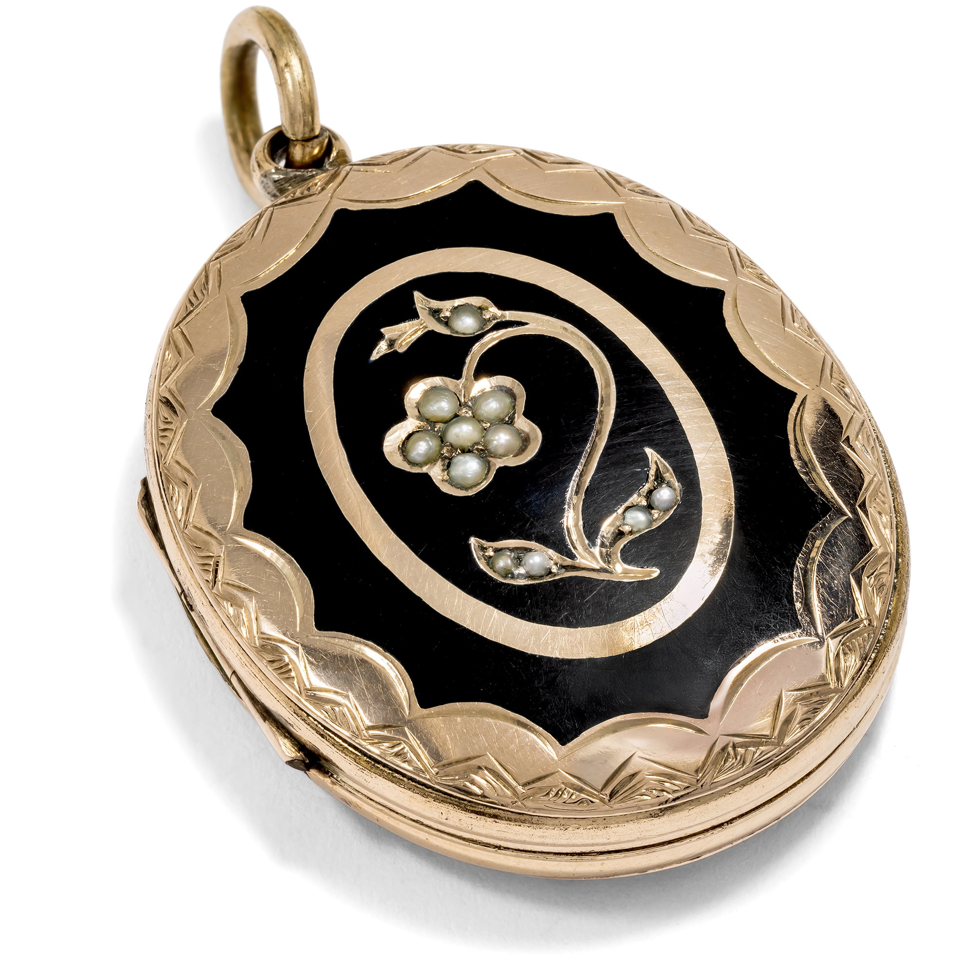 Ein Bild, eine Haarlocke, vielleicht auch ein Briefchen: Oft besitzen wir ganz persönliche und intime Stücke, die uns an eine geliebte Person erinnern. Solche Objekte stets bei sich zu tragen, hat einen besonderen Reiz. In einem Medaillon sind die Erinnerungen vor den Blicken der anderen verborgen, und doch sind sie stets da, ganz nah am Herzen. Das vorliegende schöne Medaillon stammt aus den letzten Jahren des 19. Jahrhunderts. Der Anhänger ist oval entworfen und auf der Vorderseite mit schwarzem Email belegt. Kleine Perlen besetzen hier eine kleine Blume. Auch die Rückseite ist ornamentiert: Kleine Blätter verweisen auf Efeu, das als immergrüne Pflanze Symbol der ewigen Treue galt. Das Medaillon wurde in der sogenannten „Back-and-Front“-Technik gefertigt. Dabei sind die beiden Deckel des Schmuckstücks aus 9-karätigem Gold gearbeitet. Sie werden gehalten und stabilisiert durch einen Rahmen aus unedlem Trägermetall, der im Innern des Medaillons liegt und so, getragen, nicht zu sehen ist. Diese Technik, eine Art besonders stabiles Doublé, war in England im späten 19. Jahrhundert weit verbreitet. Zwei Rähmchen im Inneren des Medaillons erlauben das Einsetzen von passend zugeschnittenen Fotos. Wir haben das sentimentale Schmuckstück in London gefunden.