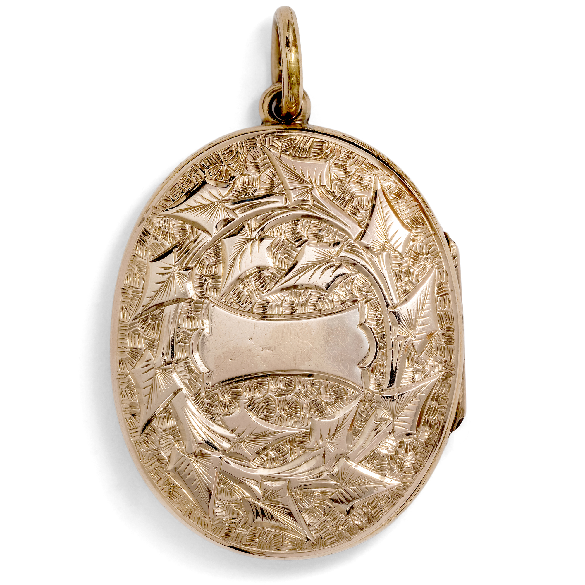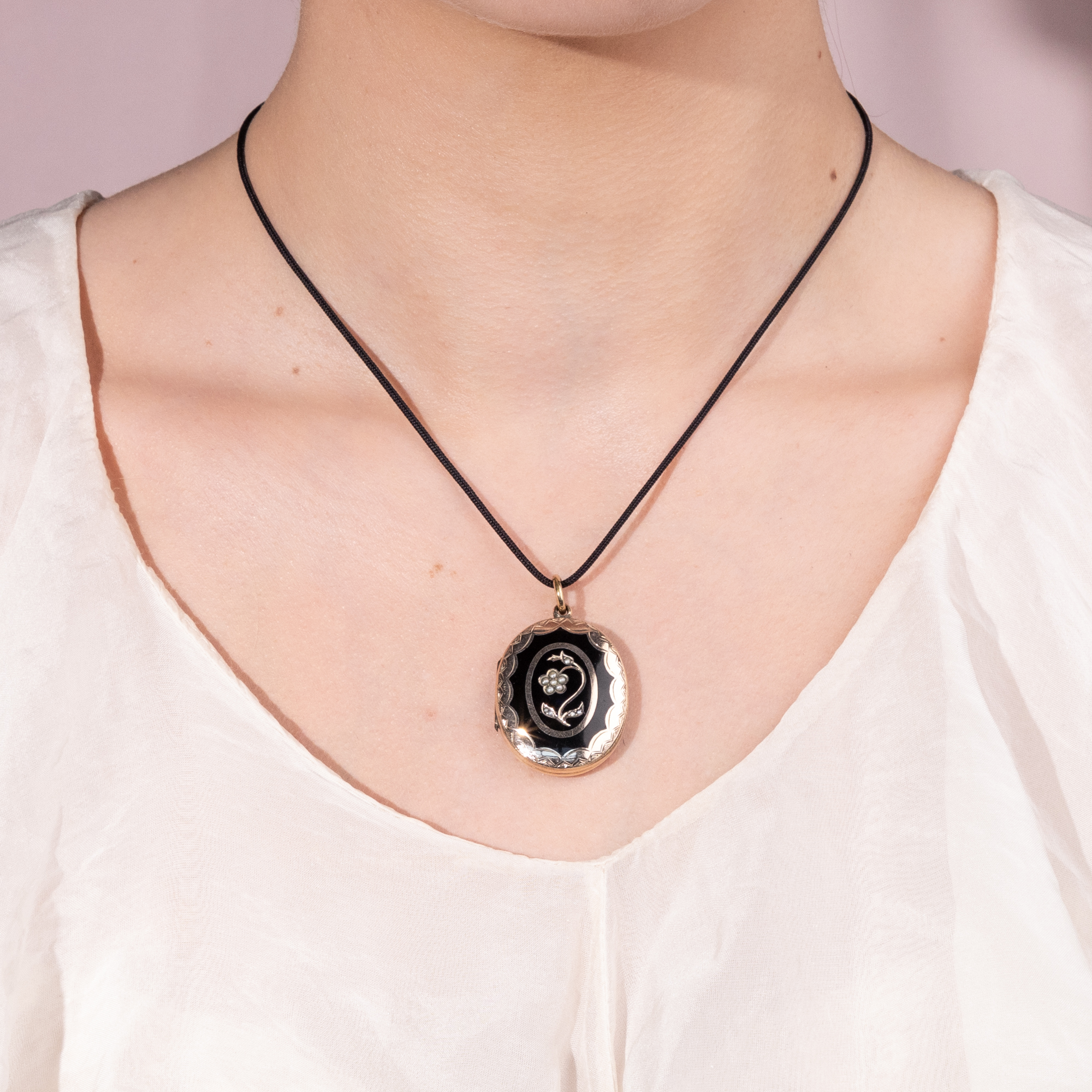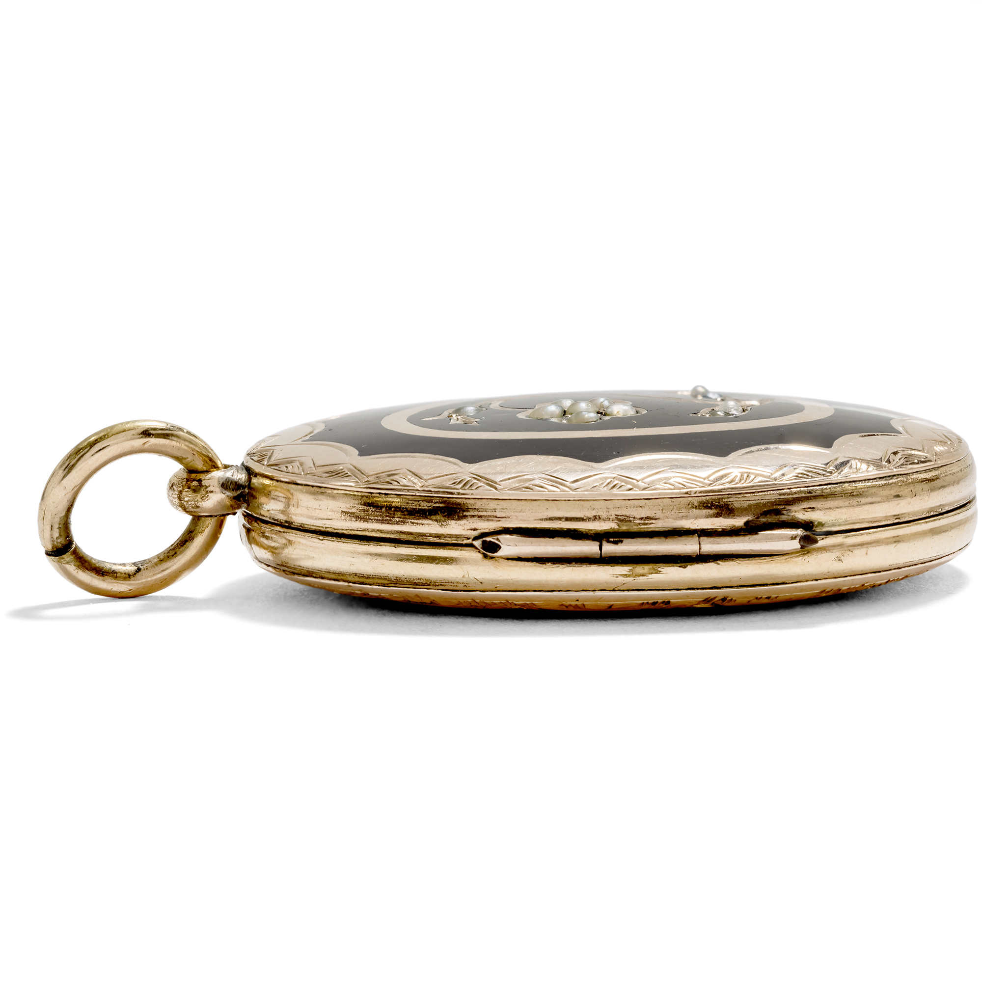 Ein Bild, eine Haarlocke, vielleicht auch ein Briefchen: Oft besitzen wir ganz persönliche und intime Stücke, die uns an eine geliebte Person erinnern. Solche Objekte stets bei sich zu tragen, hat einen besonderen Reiz. In einem Medaillon sind die Erinnerungen vor den Blicken der anderen verborgen, und doch sind sie stets da, ganz nah am Herzen. Das vorliegende schöne Medaillon stammt aus den letzten Jahren des 19. Jahrhunderts. Der Anhänger ist oval entworfen und auf der Vorderseite mit schwarzem Email belegt. Kleine Perlen besetzen hier eine kleine Blume. Auch die Rückseite ist ornamentiert: Kleine Blätter verweisen auf Efeu, das als immergrüne Pflanze Symbol der ewigen Treue galt. Das Medaillon wurde in der sogenannten „Back-and-Front“-Technik gefertigt. Dabei sind die beiden Deckel des Schmuckstücks aus 9-karätigem Gold gearbeitet. Sie werden gehalten und stabilisiert durch einen Rahmen aus unedlem Trägermetall, der im Innern des Medaillons liegt und so, getragen, nicht zu sehen ist. Diese Technik, eine Art besonders stabiles Doublé, war in England im späten 19. Jahrhundert weit verbreitet. Zwei Rähmchen im Inneren des Medaillons erlauben das Einsetzen von passend zugeschnittenen Fotos. Wir haben das sentimentale Schmuckstück in London gefunden.