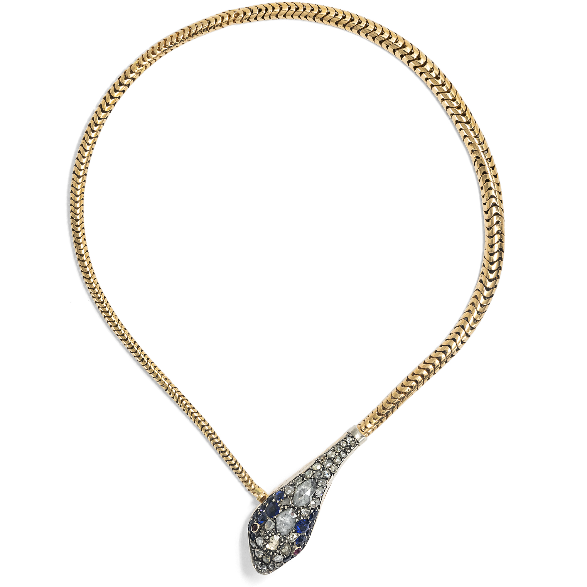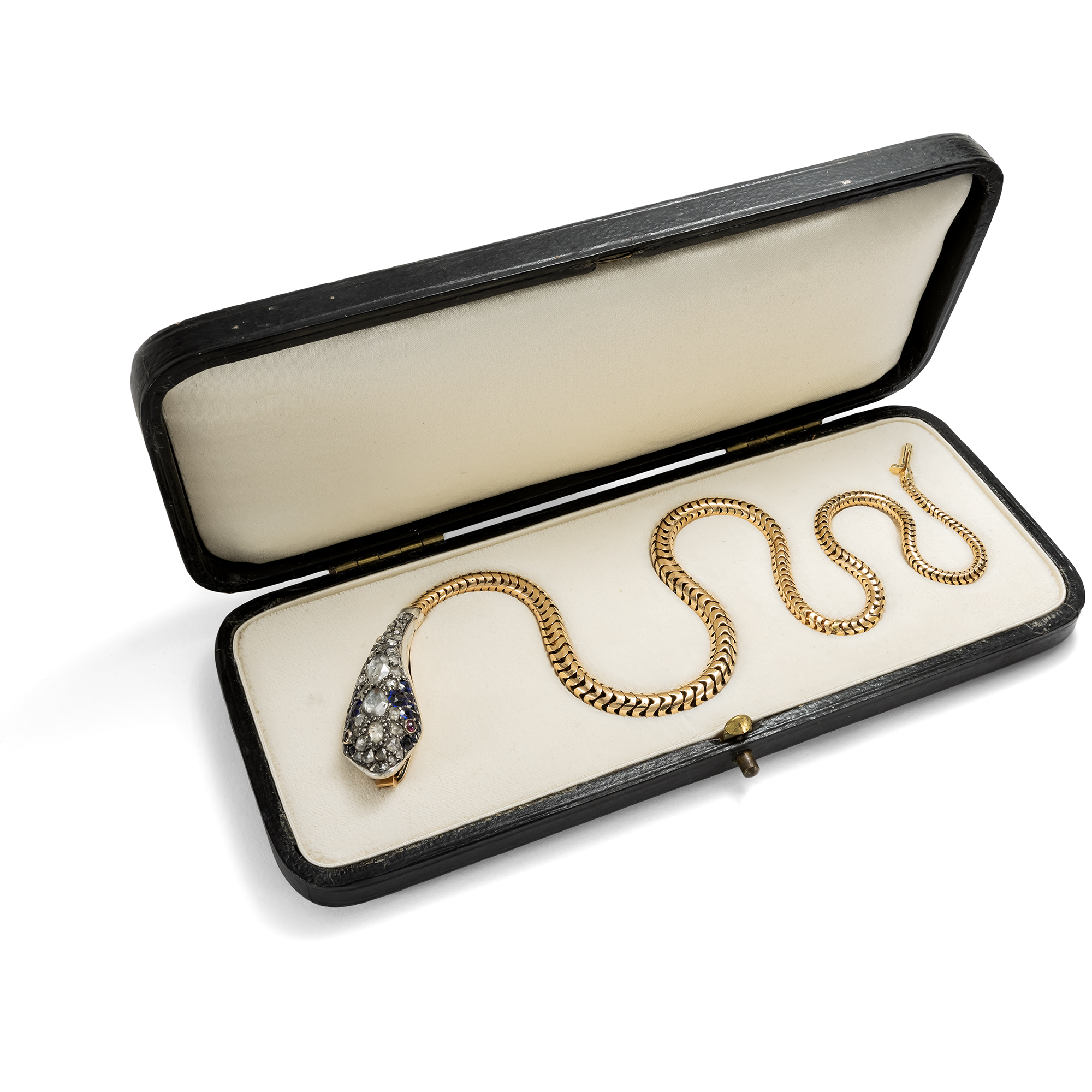Schon seit der Antike fasziniert die Schlange die Menschen. Einerseits wurde sie wegen ihres Gifts und ihrer List gefürchtet und als Verführerin Evas im Paradies gemieden, andererseits bewunderte man sie für zahlreiche ihr zugeschriebene Fähigkeiten: Sie galt sie als Symbol des ewigen Lebens, als das klügste Tier der Erde und zugleich als Sinnbild des Gottes der Heilkunst, Asklepios. Schmuck mit Schlangenmotiven begegnet daher in allen Epochen, doch besonders im frühen 19. Jahrhundert gewannen entsprechende Entwürfe erneut eine große Popularität. Abgeleitet vom antiken Ouroboros, dem Unendlichkeitssymbol einer sich selbst in den Schwanz beißenden Schlange, wurde Schlangenschmuck nun zum Ausweis ewiger Liebe. Selbst Queen Victoria trug einen Verlobungsring in Schlangenform. Und auch das hier vorliegende Collier entstammt dieser Mode. Der Körper der Schlange besteht aus schuppenartig gearbeiteten Goldgliedern, die so miteinander verbunden sind, dass der Eindruck eines lebendigen Tieres entsteht. Der Kopf der Schlange ist mit 36 Diamanten in historischen Rosenschliffen besetzt. Insgesamt sind etwa 7,50 ct Diamanten verarbeitet. Die Diamanten funkeln weich und zurückhaltend. Die Augen der Schlange bestehen aus natürlichen Rubinen. Die Wangen der Schlange schließlich sind mit damals neuartigen, blauen Granat-Glas-Doubletten besetzt. Bei diesen Schmucksteinen wird eine hauchdünne Scheibe aus natürlichem roten Granat auf einen Körper aus blauem Glas gesetzt, und beide Materialien werden gemeinsam facettiert. So entstehen Steine, die durch den Granat eine hohe Lichtbrechung aufweisen und dadurch wesentlich stärker funkeln als Glas allein. Die Verwendung solcher Doubletten fand erst mit der Einführung synthetischer Edelsteine im frühen 20. Jahrhundert ein Ende. Das Schmuckstück lässt sich auf zwei Arten tragen: als Collier, wenn der seitliche Verschluss genutzt wird, oder als Armband, wenn die Schlange doppelt um den Arm geschlungen und mit dem Verschluss im Maul geschlossen wird. Wir haben die Schlange hier in Berlin entdeckt und für sie das beiliegende, antike Etui passend einrichten lassen.