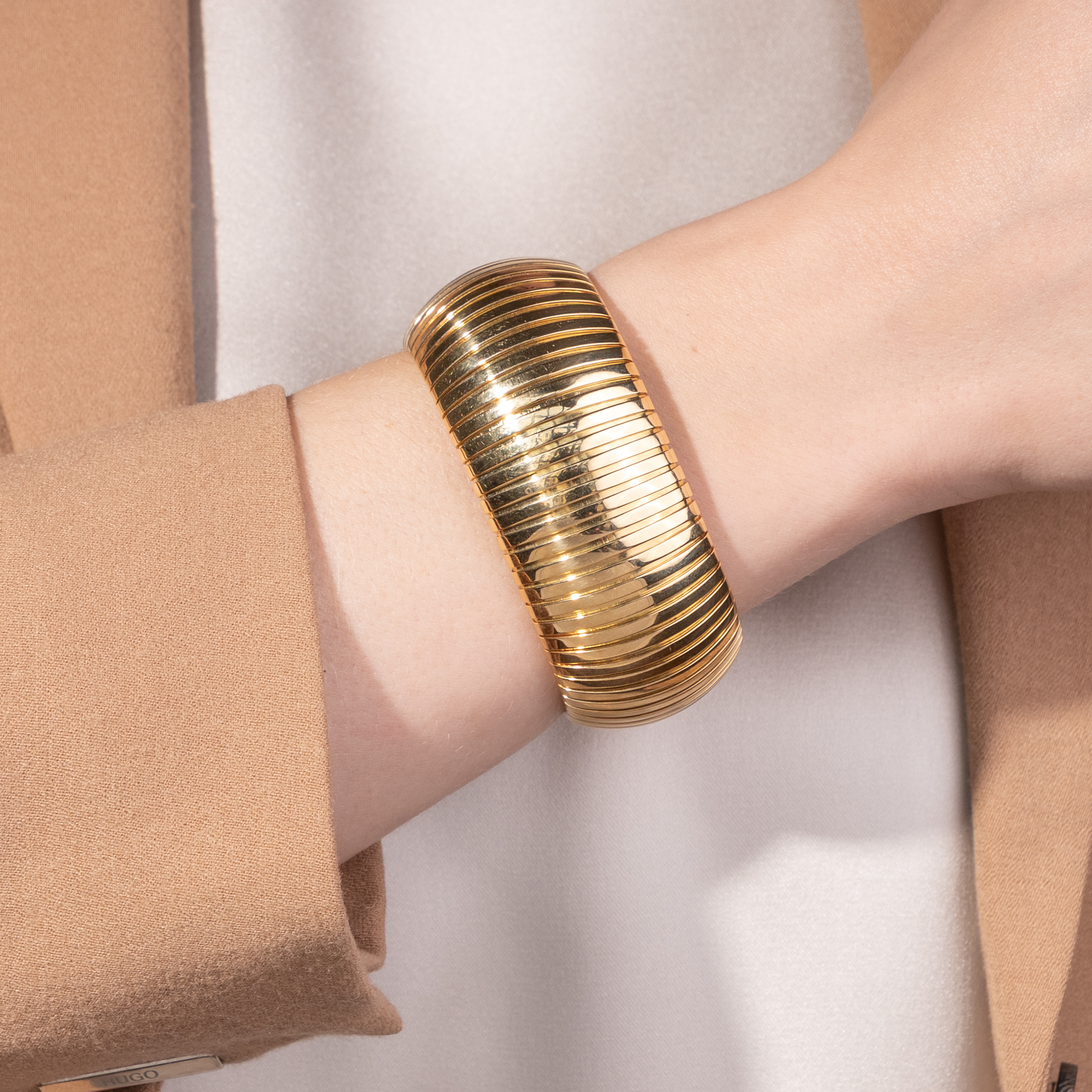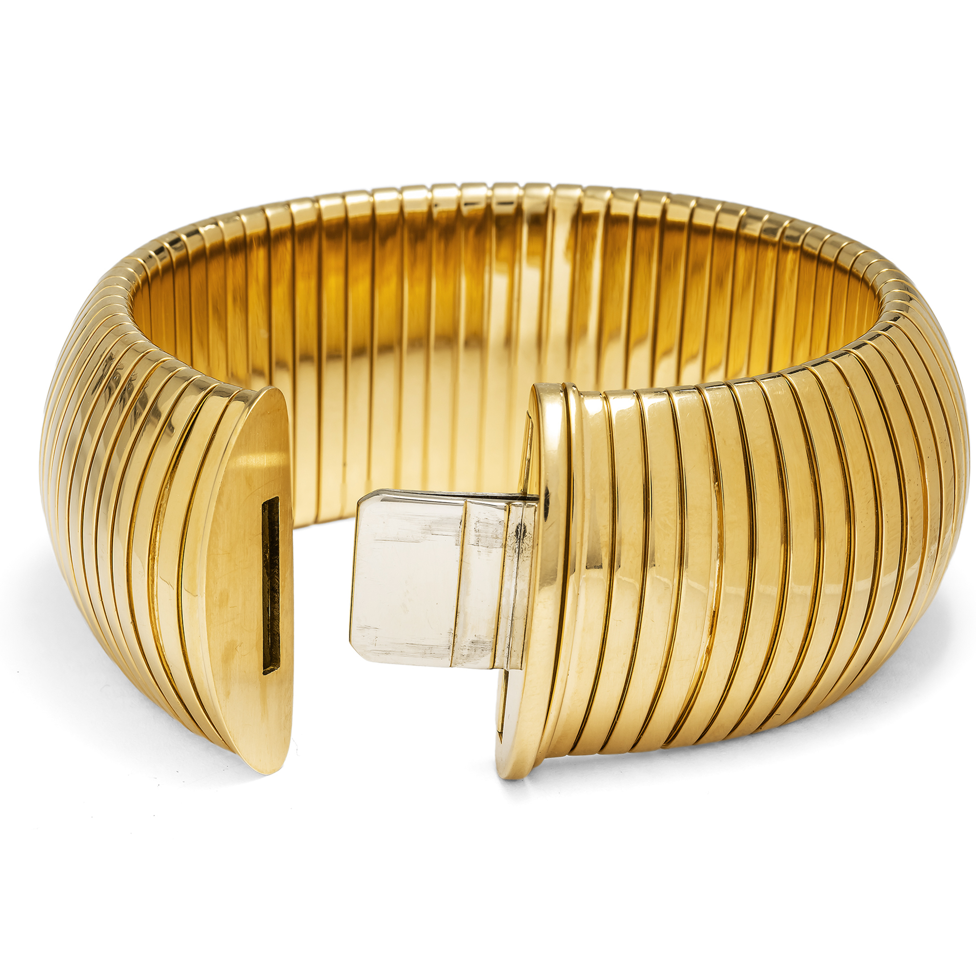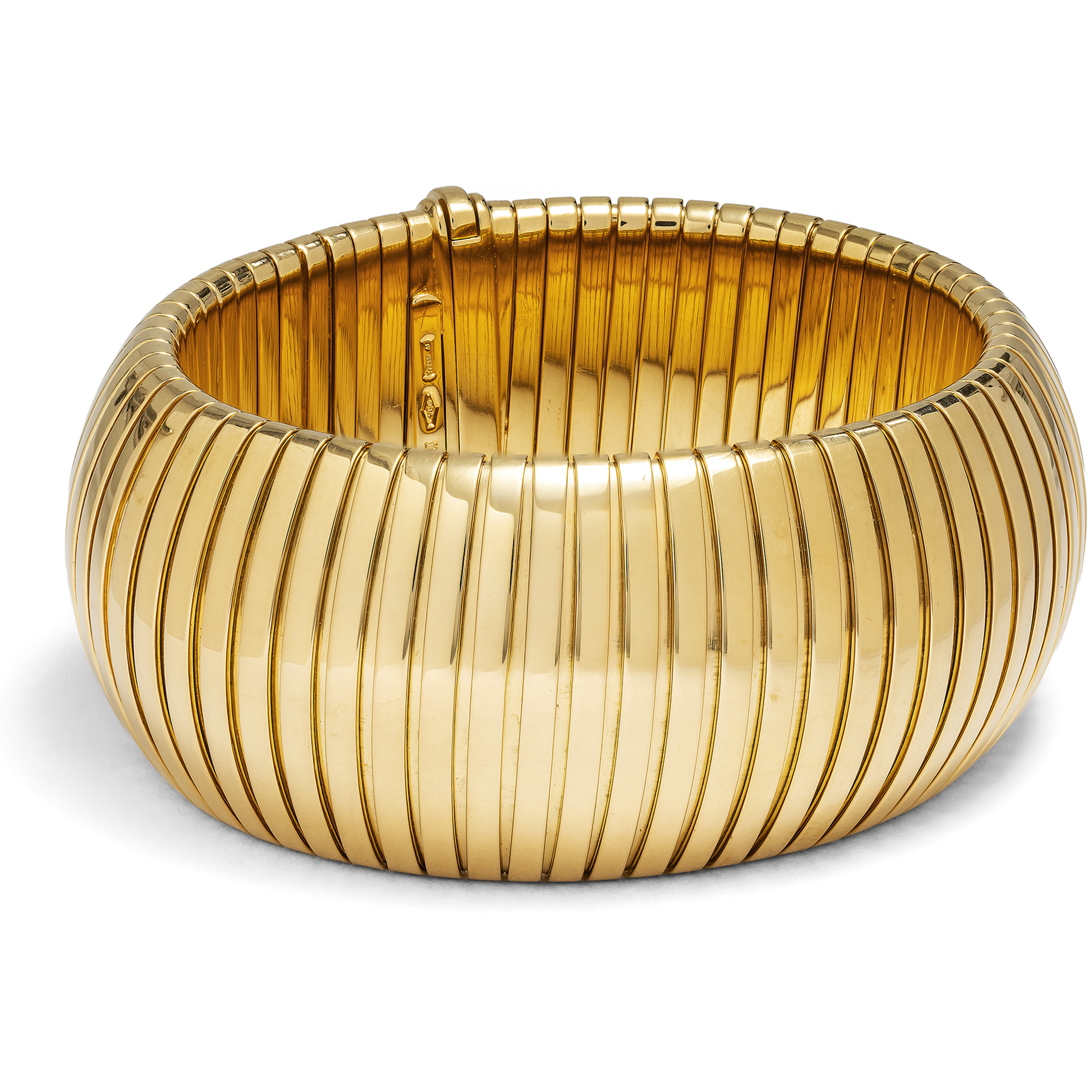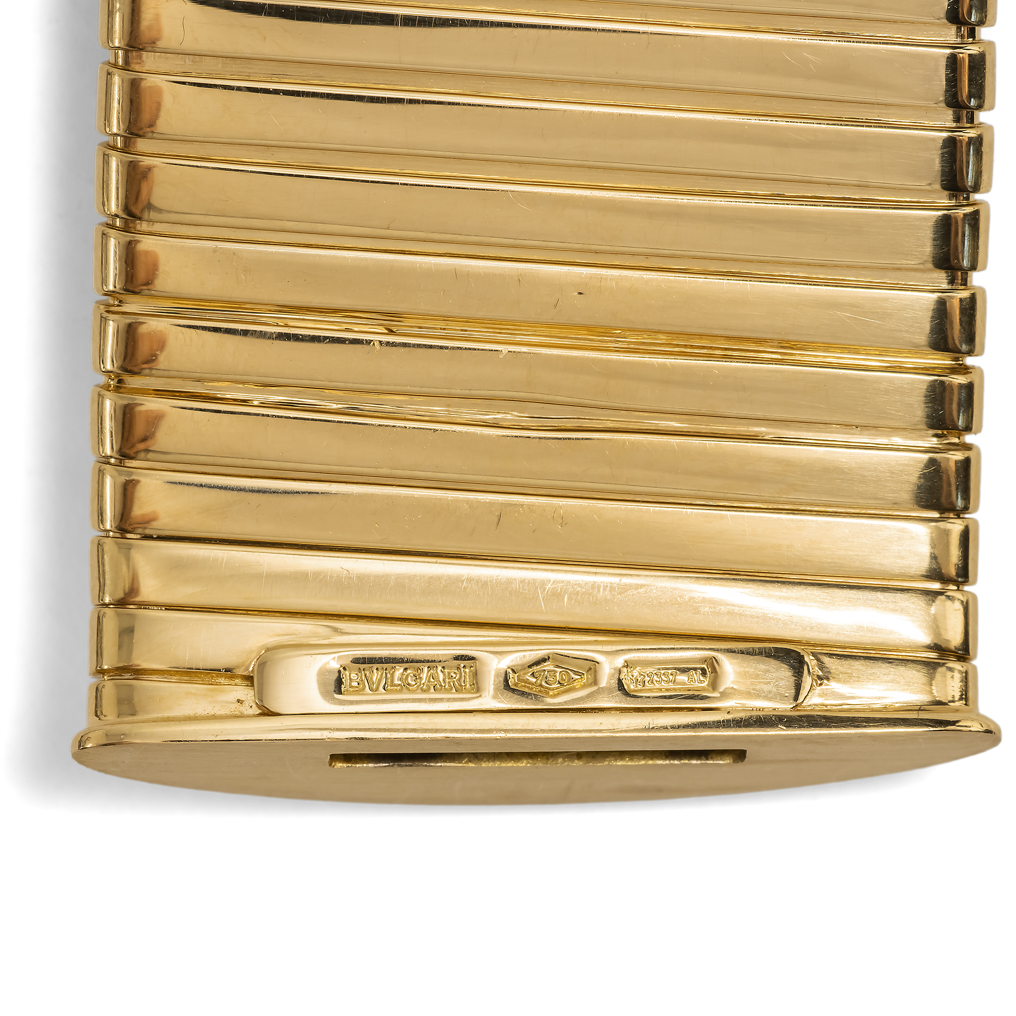 Einen eindrucksvollen Anblick bietet das vorliegende Armband aus dem Hause BVLGARI. Mit einer Breite von drei Zentimetern und einem Gewicht von mehr als 124 Gramm ist es ein opulenter Blickfang und legt sich dennoch überraschend weich und geschmeidig um das Handgelenk. Das luxuriöse Stück zeigt sich in der charakteristischen Tubogas-Technik, die untrennbar mit dem Namen Bulgari verbunden ist. Gefertigt aus hochkarätigem Gelbgold, verkörpert es jene kraftvolle und zugleich fließende Formensprache, für die das Haus seit der zweiten Hälfte des 20. Jahrhunderts geschätzt wird. Der Begriff Tubogas leitet sich vom italienischen Wort für Gasrohr ab und beschreibt eine besondere Wickeltechnik, bei der Goldbänder ohne sichtbare Lötstellen ineinandergreifen. So entsteht ein flexibles Geflecht von großer Stabilität, das sich elegant an das Handgelenk anschmiegt und durch seine gleichmäßige, spannungsvolle Oberfläche besticht. Die Wurzeln dieser Technik reichen bis ins 19. Jahrhundert zurück, doch ihre eigentliche Blüte erlebte sie bei Bulgari ab den späten 1940er Jahren und vor allem in den 1970er und 1980er Jahren. In dieser Zeit wurde der Tubogas-Stil zu einem prägenden Merkmal des Hauses. Breite Armbänder wie das vorliegende sind vergleichsweise selten und zeugen von einem hohen technischen Anspruch sowie einem feinen Gespür für Proportion und Tragekomfort. Die Punzierung „BVLGARI 2337 AL“ verweist auf die Marke und ihre italienische Herkunft und führt zugleich in die Provinz Alessandria. Sie steht für die seit 1968 geltenden gesetzlichen Vorgaben, die eine klare Zuordnung von Hersteller und Material gewährleisten. Bulgari wurde 1884 von dem aus Griechenland stammenden Silberschmied Sotirios Voulgaris in Rom gegründet und entwickelte sich im Laufe des 20. Jahrhunderts zu einem der bedeutendsten internationalen Häuser für Schmuck. Die Verbindung von antiken Vorbildern, italienischer Sinnlichkeit und einer klaren, modernen Gestaltung prägt den Stil bis heute. Besonders in der Nachkriegszeit gelang es Bulgari, mit Entwürfen wie dem Tubogas-Schmuck eine unverwechselbare Handschrift zu entwickeln. Das vorliegende Armband steht für diese Phase auf eindrucksvolle Weise. Es vereint technische Raffinesse, materiellen Wert und eine klare Form zu einem Schmuckstück von großer Präsenz, das seine Wirkung ganz aus sich selbst heraus entfaltet.