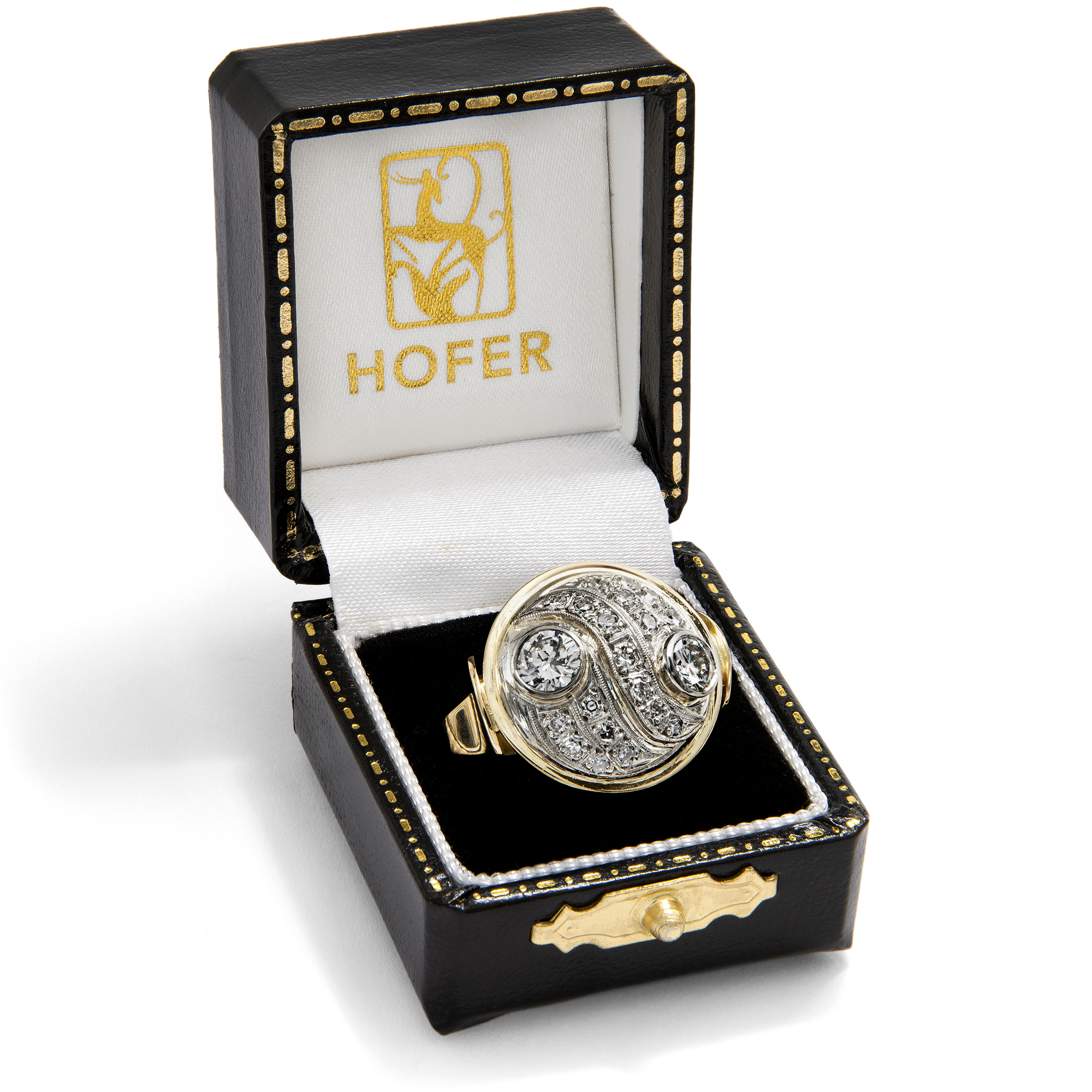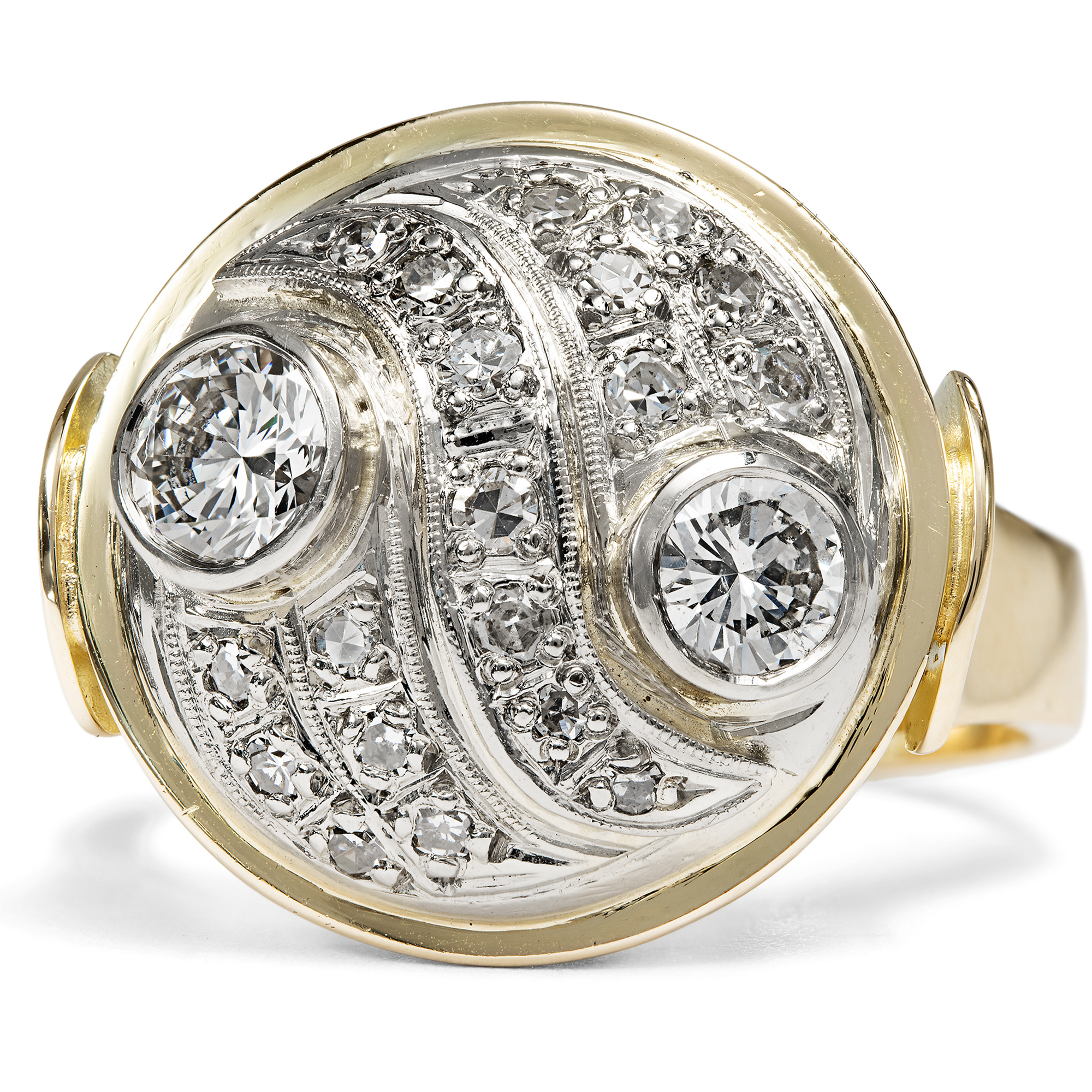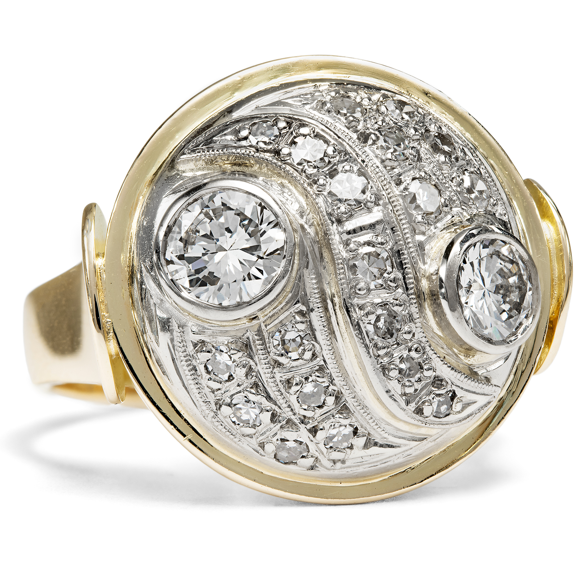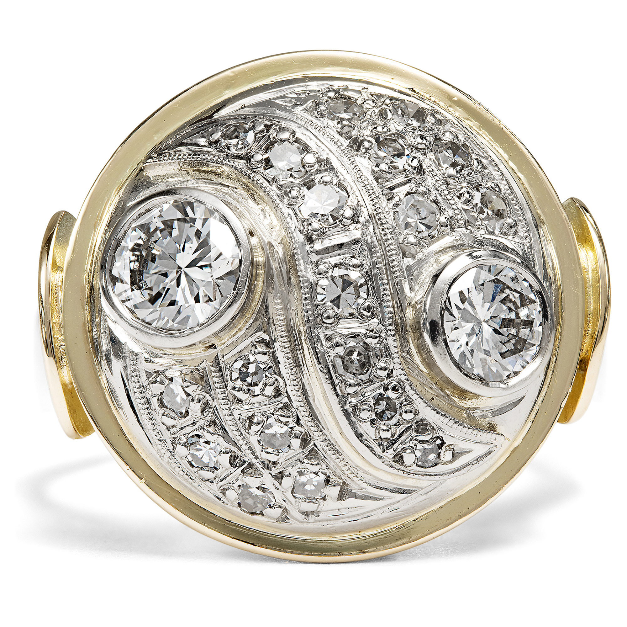 Auf dem gewölbten, runden Kopf des hier vorliegenden Ringes aus Gelb- und Weißgold haben sich Diamanten zu einem ausdrucksstarken Motiv zusammengefunden. Ein im Verschnitt ausgefasstes, geschweiftes Band aus Diamanten teilt den Ring optisch in zwei gleiche Hälften. Ähnlich einem fernöstlichen Yin-und-Yang-Symbol bildet deren jeweiliger Mittelpunkt ein einzeln gefasster großer Brillant. Diese beiden Steine von jeweils etwa 0,36 ct sind in Zargen gesetzt und leicht erhaben gefasst. Jede erdenkliche Stelle der aus Weißgold geschmiedeten Kuppel des Ringes ist mit Diamanten im Achtkantschliff ausgefasst. Insgesamt zählen wir 21 Diamanten mit einem Gesamtgewicht von etwa einem Karat. Der handgeschmiedete Ring, entstanden in den Jahren um 1955, steht durch die Gegenüberstellung zweier gleich großer Brillanten in der Tradition der sog. „Toi-et-Moi“-Ringe, welche in zwei gleichermaßen als Protagonisten inszenierten Edelsteinen die beiden Liebenden veranschaulichen sollen. Hier nun kleidet der Ring die alte Idee in das Gewand des Midcentury. Mit seiner mondänen Präsenz und der harmonischen, spiegelsymmetrisch angelegten Gestaltung, bei der jedes Teil im Einklang mit dem anderen steht, entspricht der Ring dem Anspruch der Goldschmiedekunst der 1950er Jahre an Perfektion in Entwurf und Ausführung. Eine wunderbare Goldschmiedearbeit, die hier in Berlin zu uns fand.