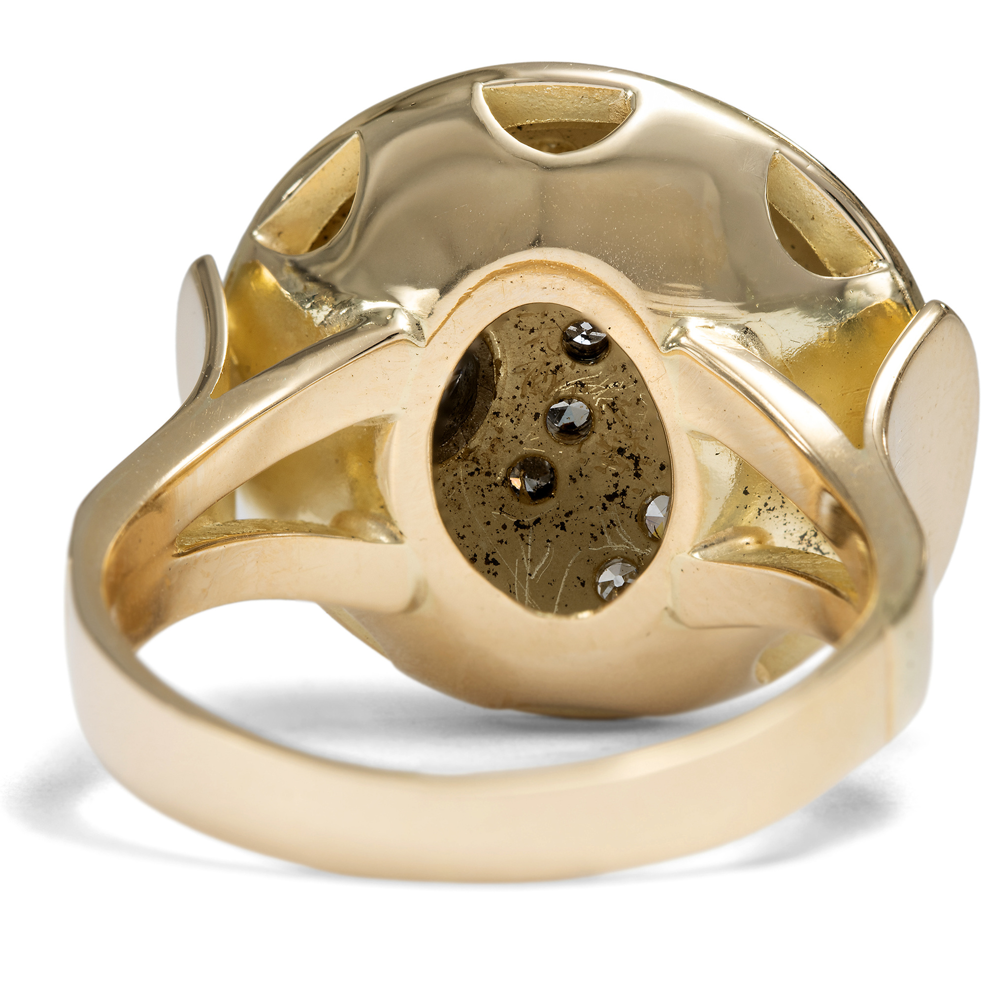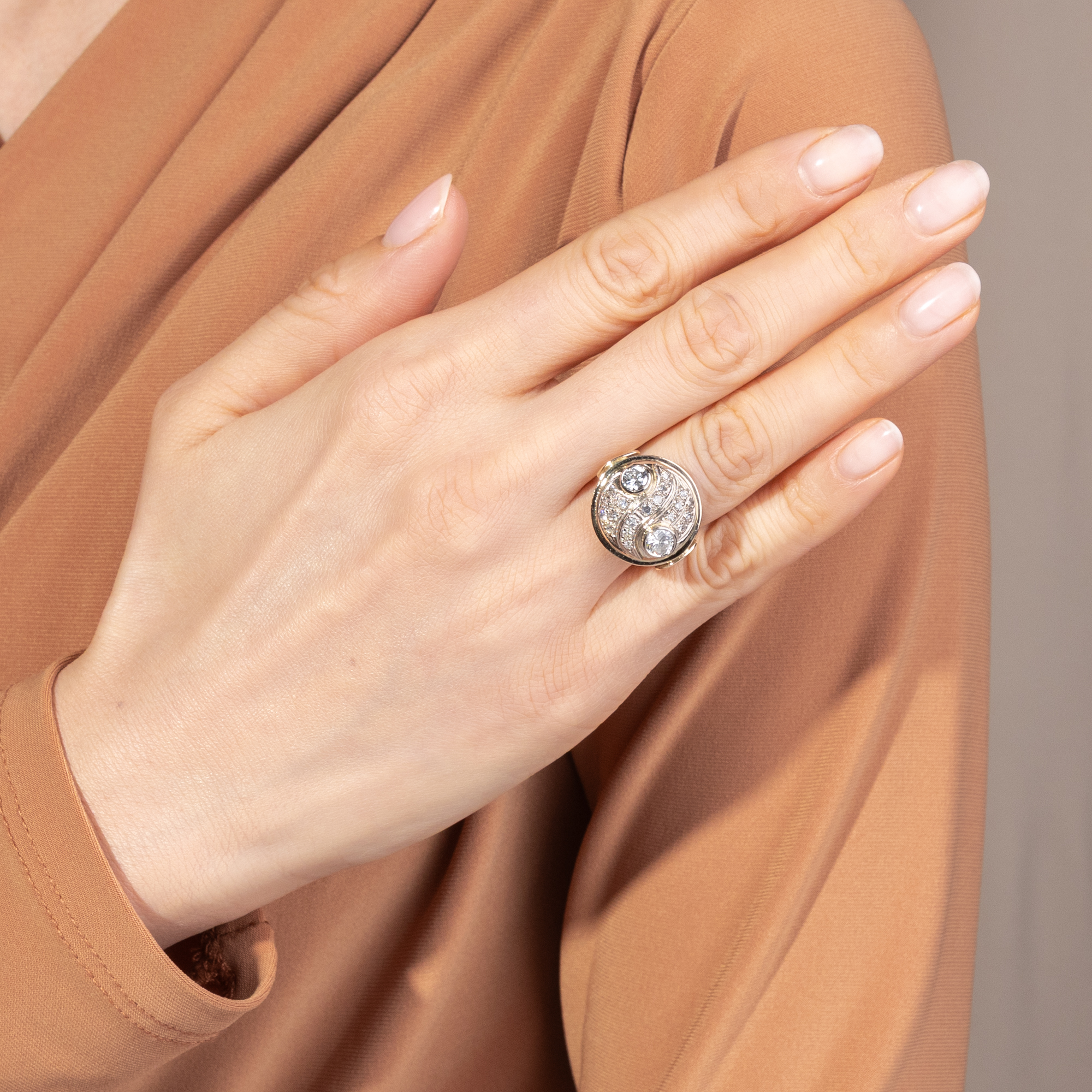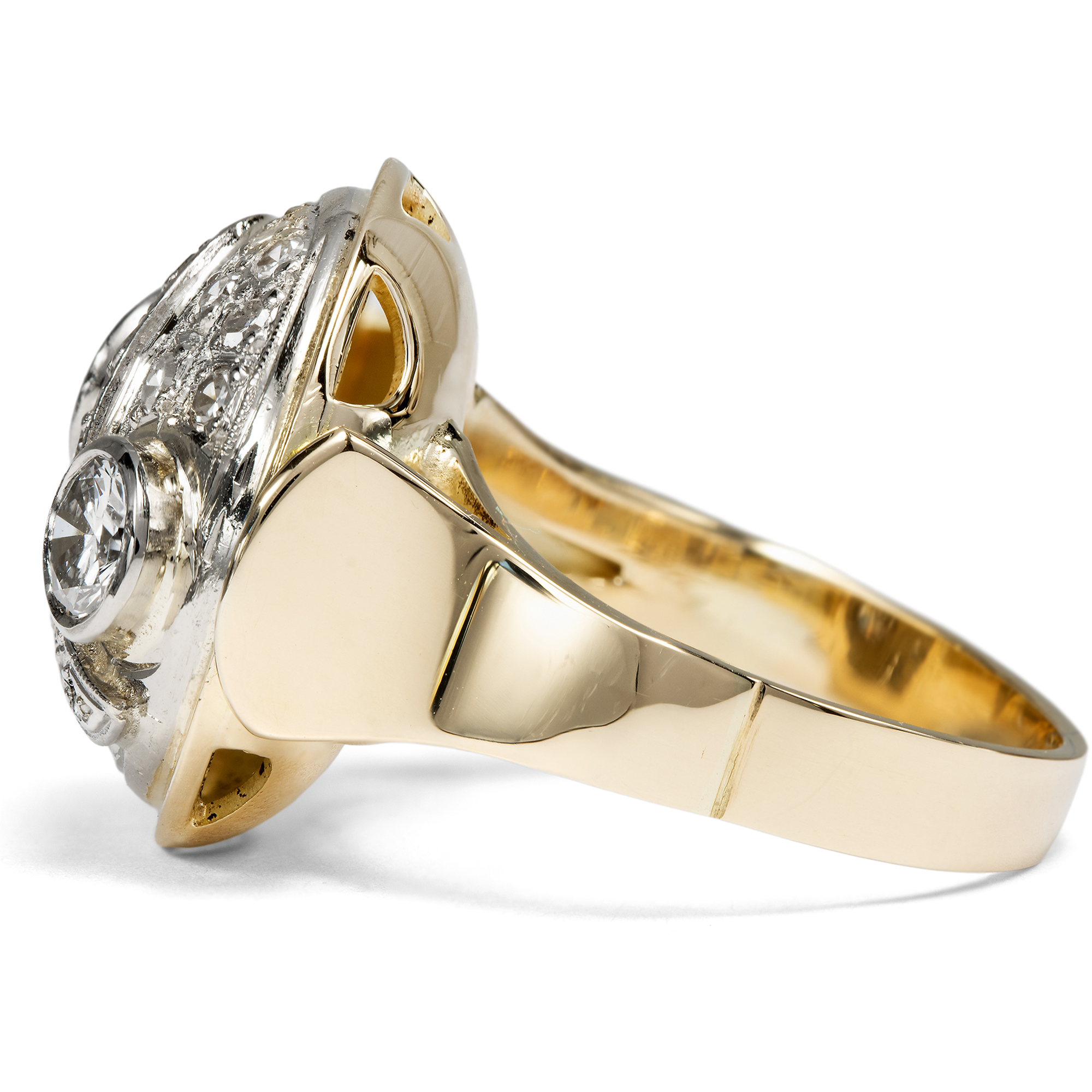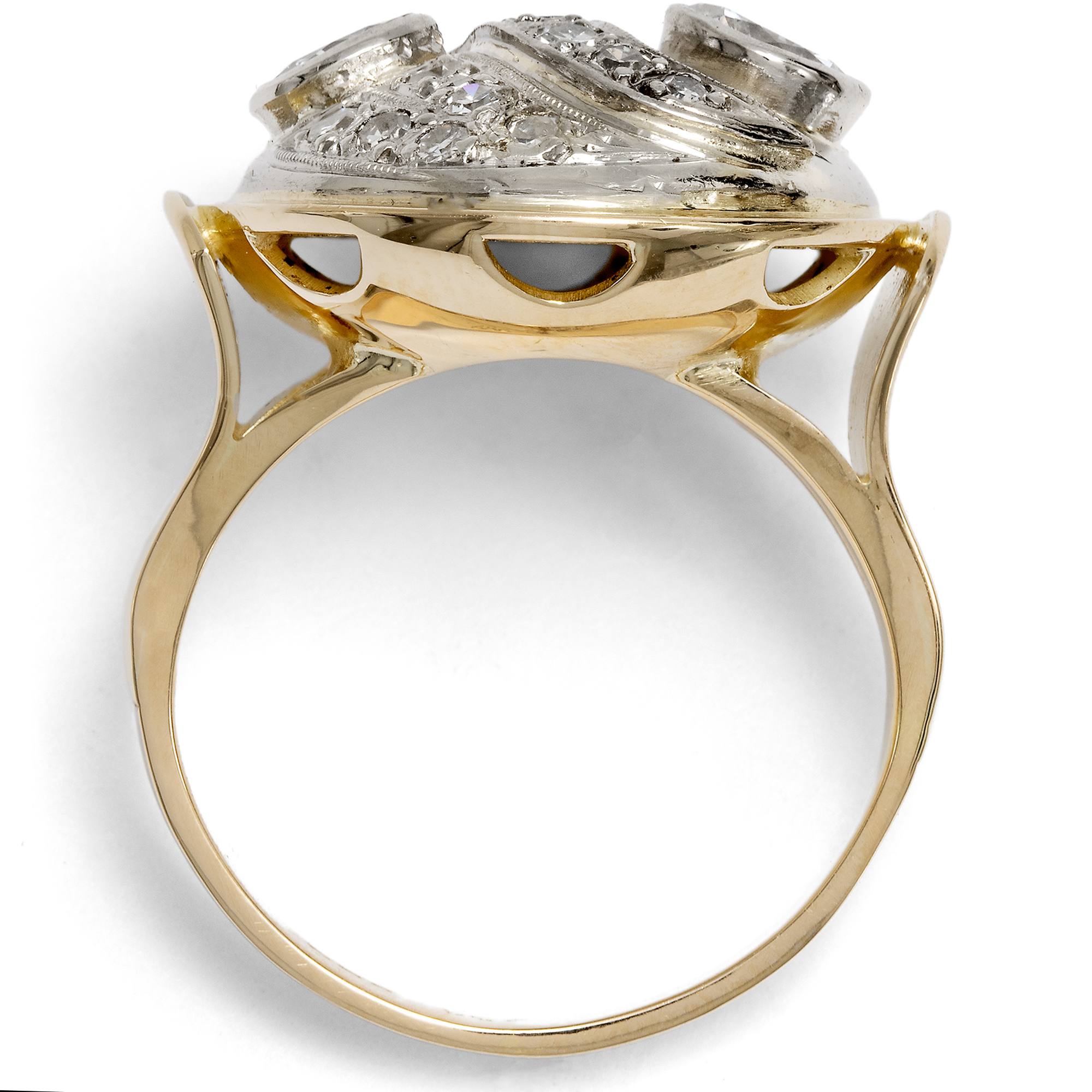 Auf dem gewölbten, runden Kopf des hier vorliegenden Ringes aus Gelb- und Weißgold haben sich Diamanten zu einem ausdrucksstarken Motiv zusammengefunden. Ein im Verschnitt ausgefasstes, geschweiftes Band aus Diamanten teilt den Ring optisch in zwei gleiche Hälften. Ähnlich einem fernöstlichen Yin-und-Yang-Symbol bildet deren jeweiliger Mittelpunkt ein einzeln gefasster großer Brillant. Diese beiden Steine von jeweils etwa 0,36 ct sind in Zargen gesetzt und leicht erhaben gefasst. Jede erdenkliche Stelle der aus Weißgold geschmiedeten Kuppel des Ringes ist mit Diamanten im Achtkantschliff ausgefasst. Insgesamt zählen wir 21 Diamanten mit einem Gesamtgewicht von etwa einem Karat. Der handgeschmiedete Ring, entstanden in den Jahren um 1955, steht durch die Gegenüberstellung zweier gleich großer Brillanten in der Tradition der sog. „Toi-et-Moi“-Ringe, welche in zwei gleichermaßen als Protagonisten inszenierten Edelsteinen die beiden Liebenden veranschaulichen sollen. Hier nun kleidet der Ring die alte Idee in das Gewand des Midcentury. Mit seiner mondänen Präsenz und der harmonischen, spiegelsymmetrisch angelegten Gestaltung, bei der jedes Teil im Einklang mit dem anderen steht, entspricht der Ring dem Anspruch der Goldschmiedekunst der 1950er Jahre an Perfektion in Entwurf und Ausführung. Eine wunderbare Goldschmiedearbeit, die hier in Berlin zu uns fand.