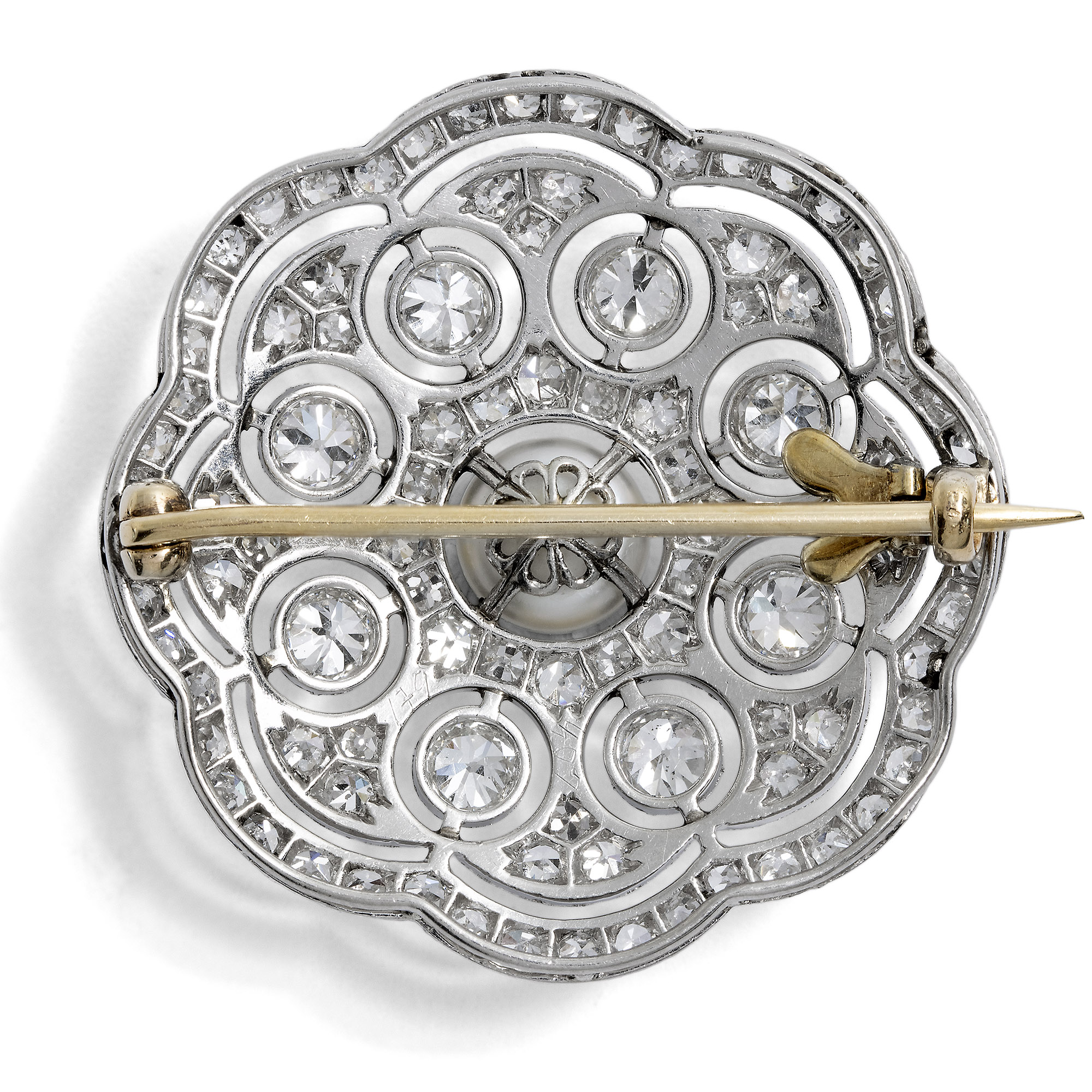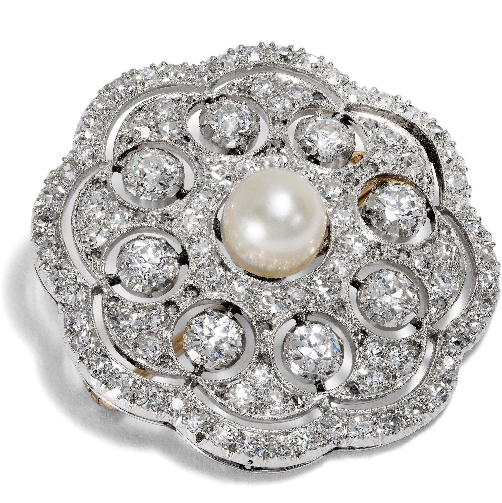 Weiß war die Modefarbe des Schmucks in den ersten Dekaden des 20. Jahrhunderts. Kaum hell genug konnte der Diamantschmuck für den Abend funkeln. Die hier vorliegende Brosche erstrahlt ganz in Weiß und stellt drei verschiedene Nuancen nebeneinander: Der warme Lüster einer feinen Naturperle, der festliche Glanz der Diamanten und die metallische Oberfläche des Platins bilden einen Dreiklang aus weißen Reflexionen. Eine natürliche Orientperle steht im Zentrum dieser Brosche, die an eine stilisierte Blüte erinnert. Ein Kranz aus großen Altschliff-Diamanten umrahmt das schimmernde Zentrum. Nur von filigranen Stäben gehalten, scheinen die Steine in den umgebenden Schattenfugen beinahe zu schweben. Die Oberfläche des Schmuckstücks ist vollständig mit kleinen Diamanten im 8/8-Schliff und im Rosenschliff ausgefasst. Präzise gesägte Schattenfugen sowie feine Millegriffes strukturieren die geometrische Grundform und stellen ihrer Strenge weiches Ornament zur Seite. Überirdisch leicht und betörend erscheint der in Platin ausgeführte, konzentrische Entwurf. In ihrer präzisen Ausführung, die an Feinheit kaum zu überbieten ist, führt die Brosche vor Augen, weshalb Juwelen der Belle Époque heute so begehrt sind. Ein unabhängiges Gutachten hat die Qualität der Materialien bestätigt und wird mit der Brosche mitgeliefert. Wir haben sie hier in Berlin entdeckt.