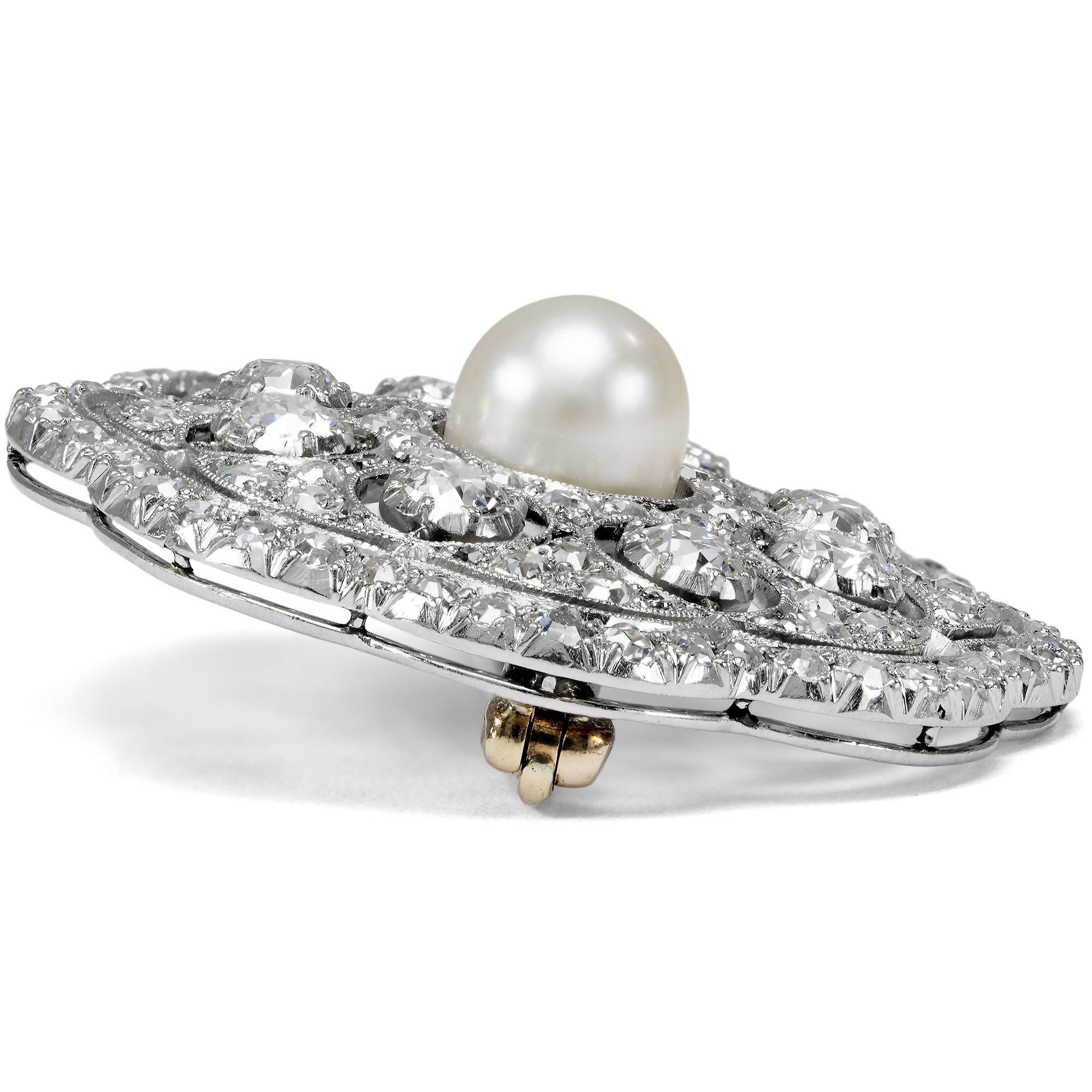 Antike Brosche mit Naturperle & Diamanten in Platin & Weißgold, um 1910