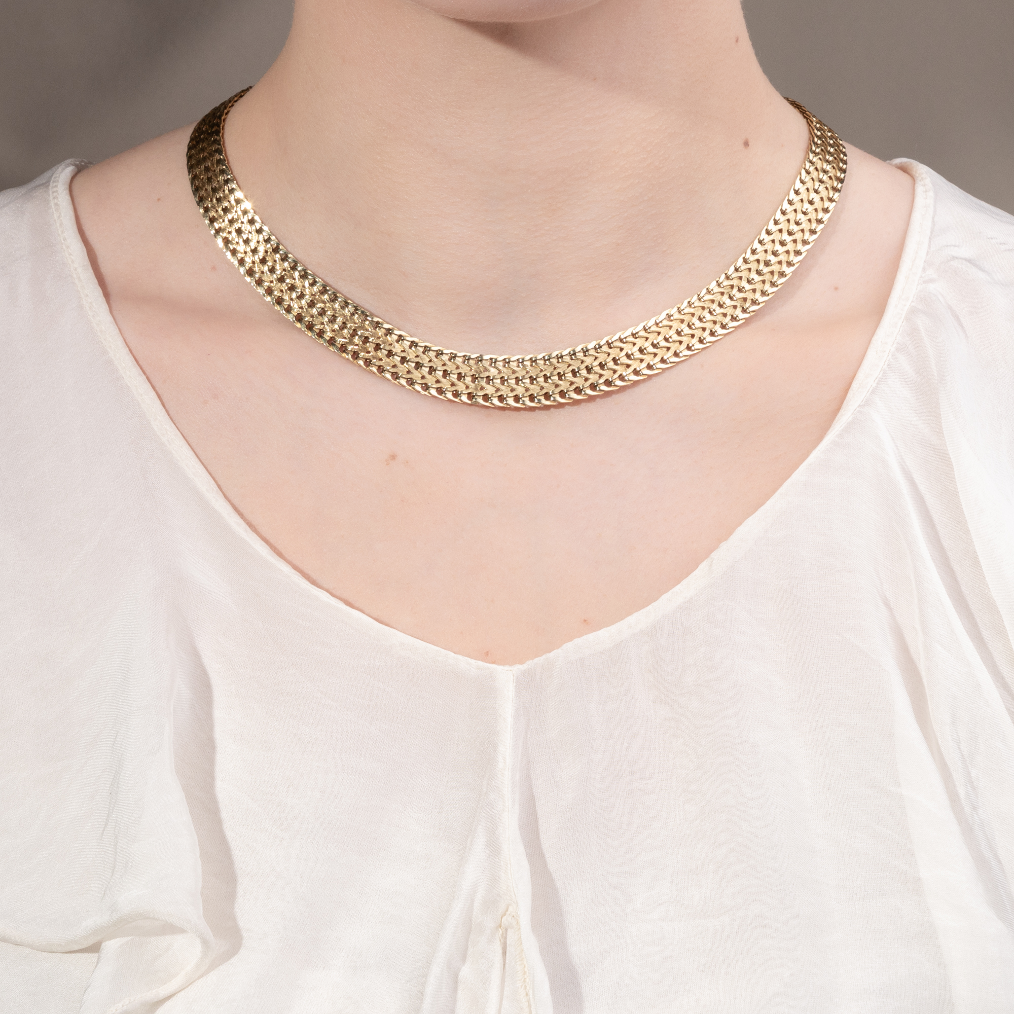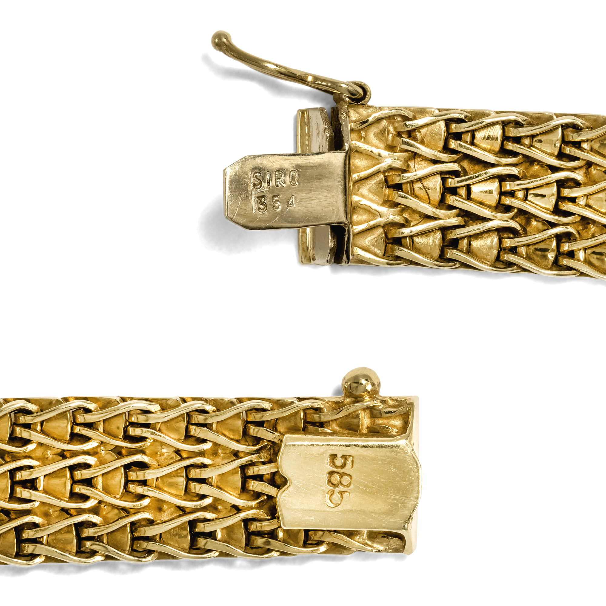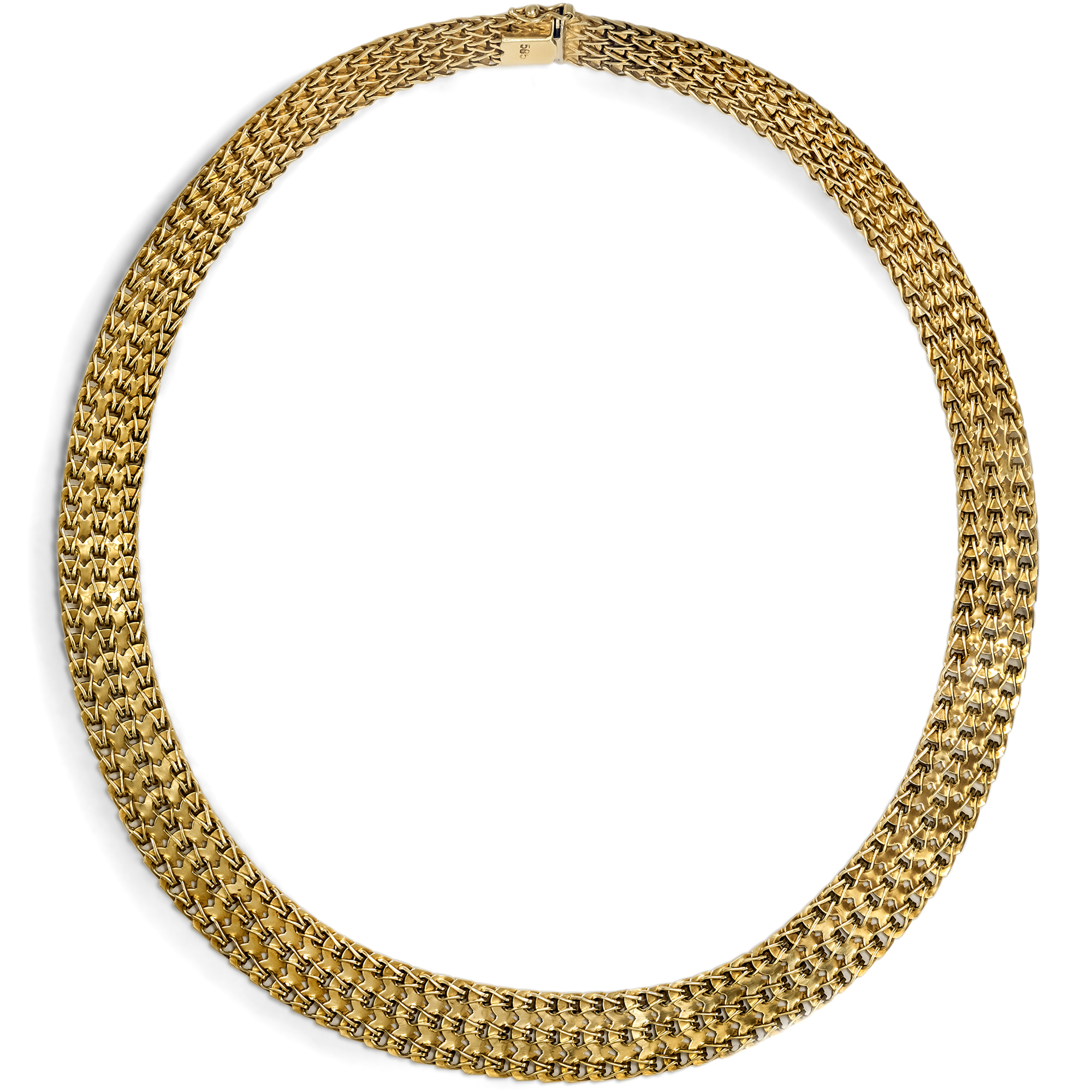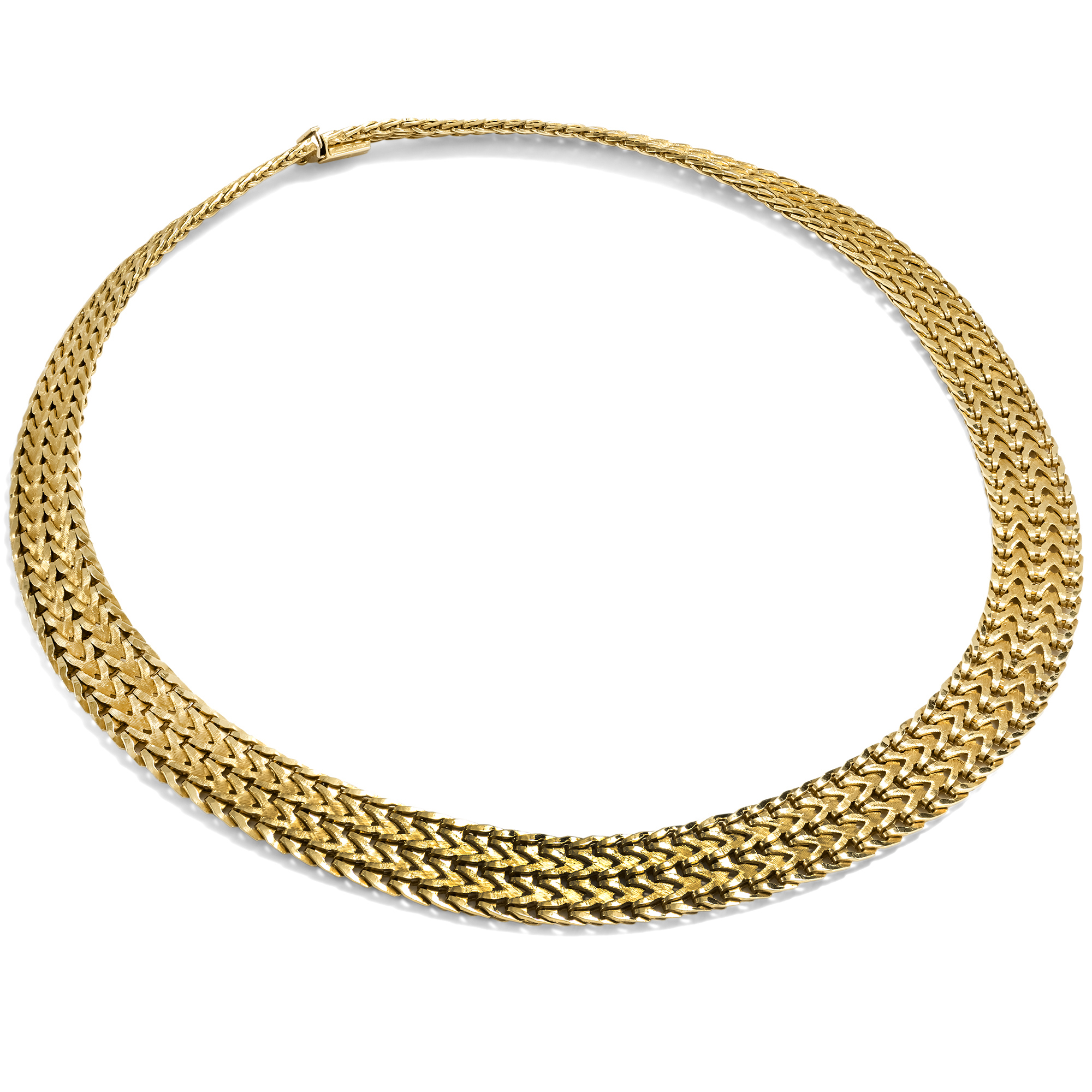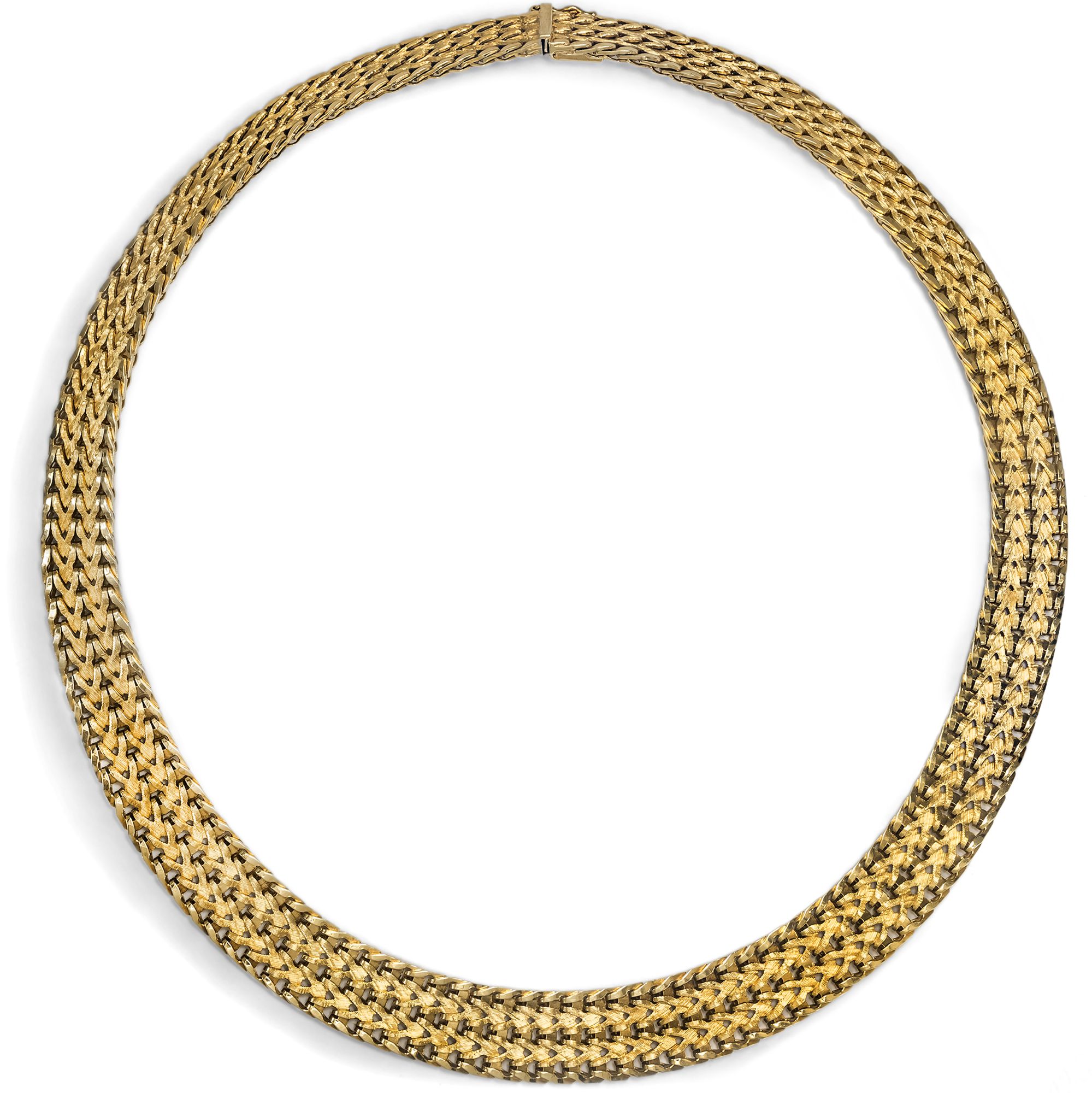 Glänzender Goldschmuck in üppiger Ausführung war der Traum jeder Frau in den Dekaden nach dem 2. Weltkrieg. Ketten und Armbänder aus Gelbgold wurden als Statussymbol getragen, aus Freude über den wiedergewonnenen Wohlstand und auch als Erinnerungen an den Urlaub im sonnigen Süden. Juweliere dieser Zeit führten stets eine Auswahl von Ketten und Armbändern in den verschiedensten Mustern. Gestrickt oder gewirkt, aus Ösen oder Kugeln zusammengesetzt, der Formenvielfalt galt keine Grenze. Das vorliegende breite Collier ist ein solches Stück und zeigt sich in besonders prachtvoller Ausführung. Die flachen Glieder sind aus 14-karätigem Gelbgold gefertigt und legen sich angenehm weich um den Hals. Dabei weitet sich der Entwurf leicht zur Mitte hin. Die Oberflächen der Glieder sind dabei zu den Rändern hin glänzend poliert, während die mittleren Partien seidig mattiert sind. So entsteht ein reiches Spiel der Lichtreflexionen. Ausweislich der Punzen entstand die schöne Kette in Handarbeit für die Pforzheimer Schmuckgroßhandlung Siebler & Rothfuß. Wir datieren das wohlerhaltene Stück in die Jahre um 1970.